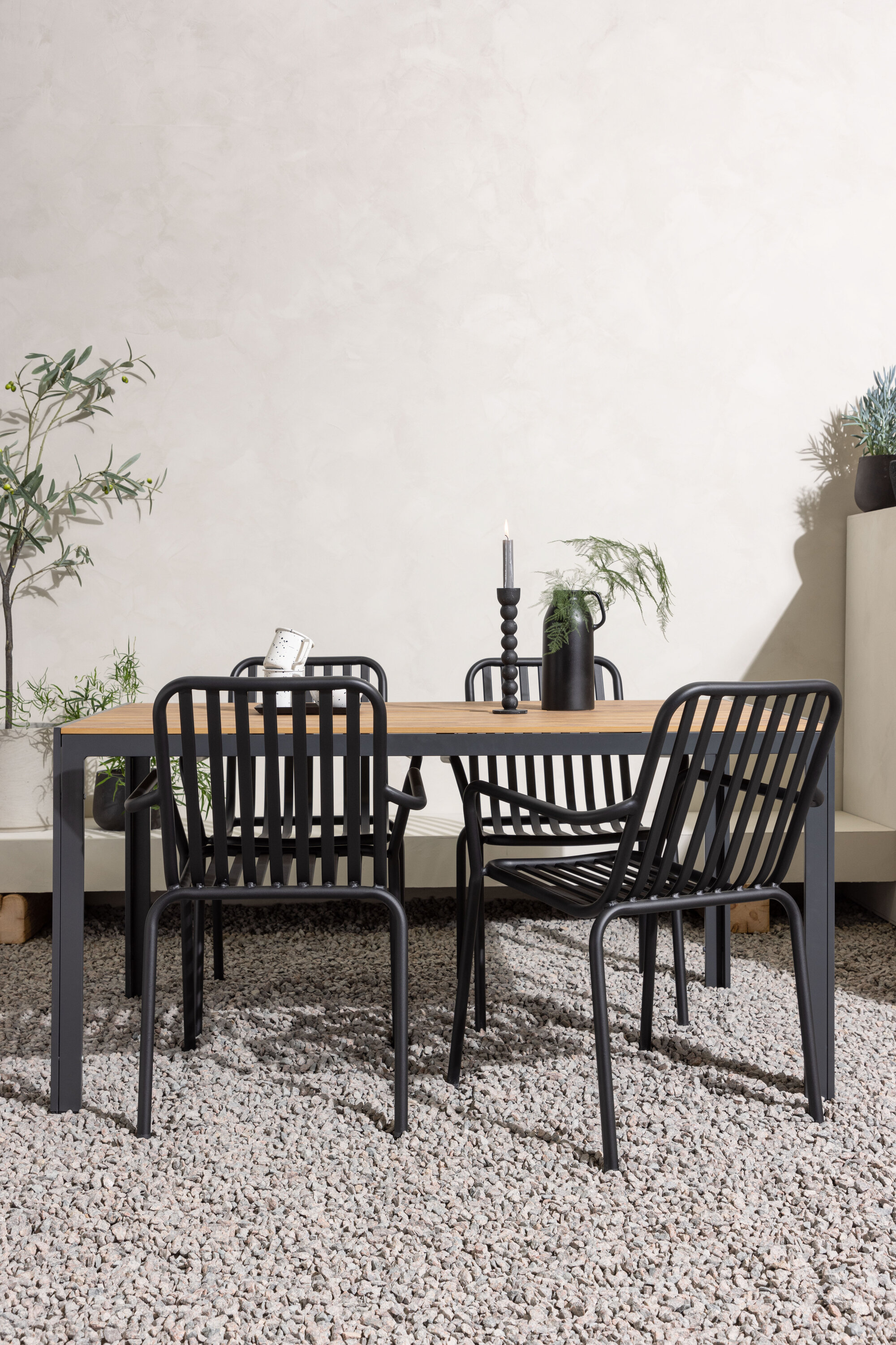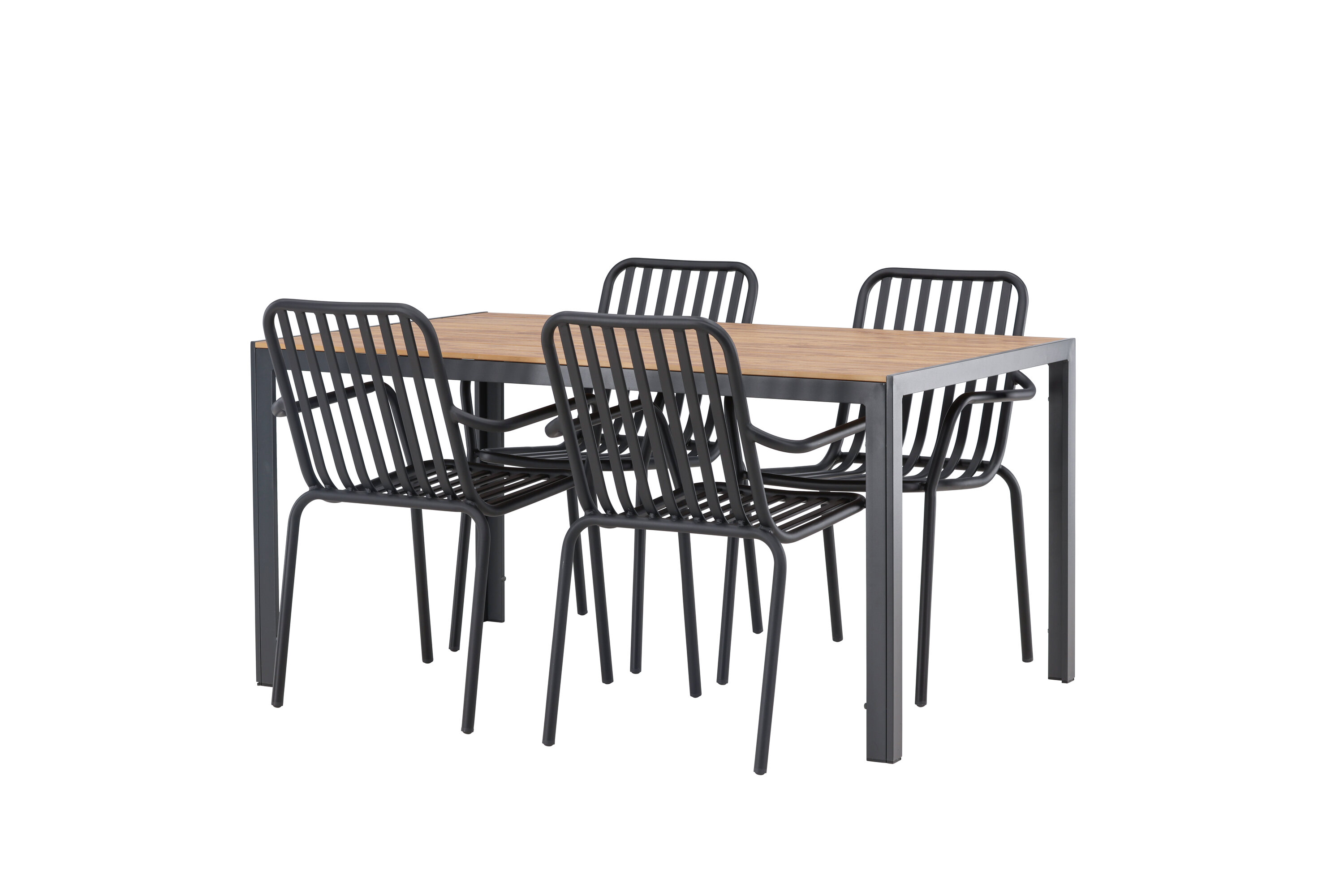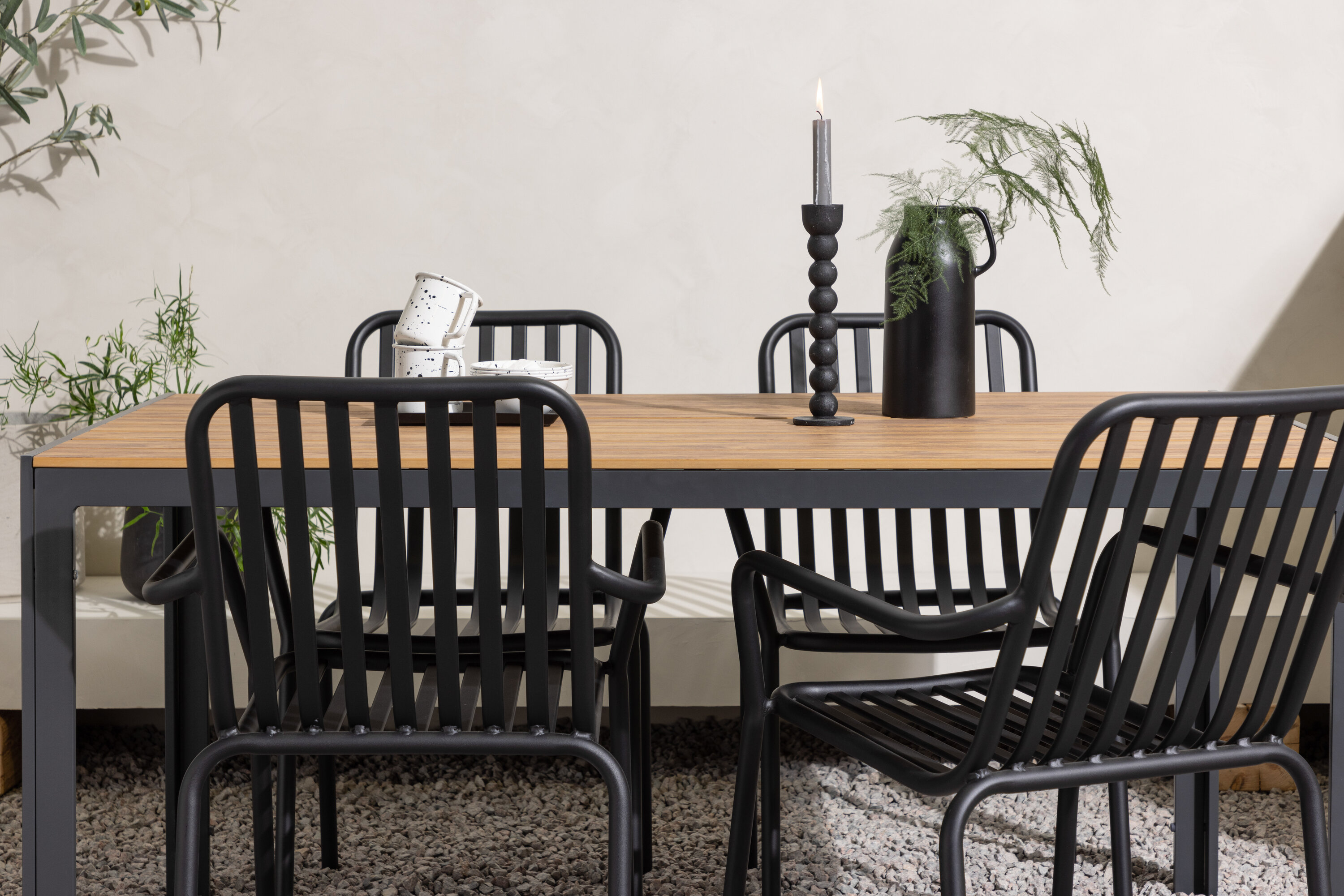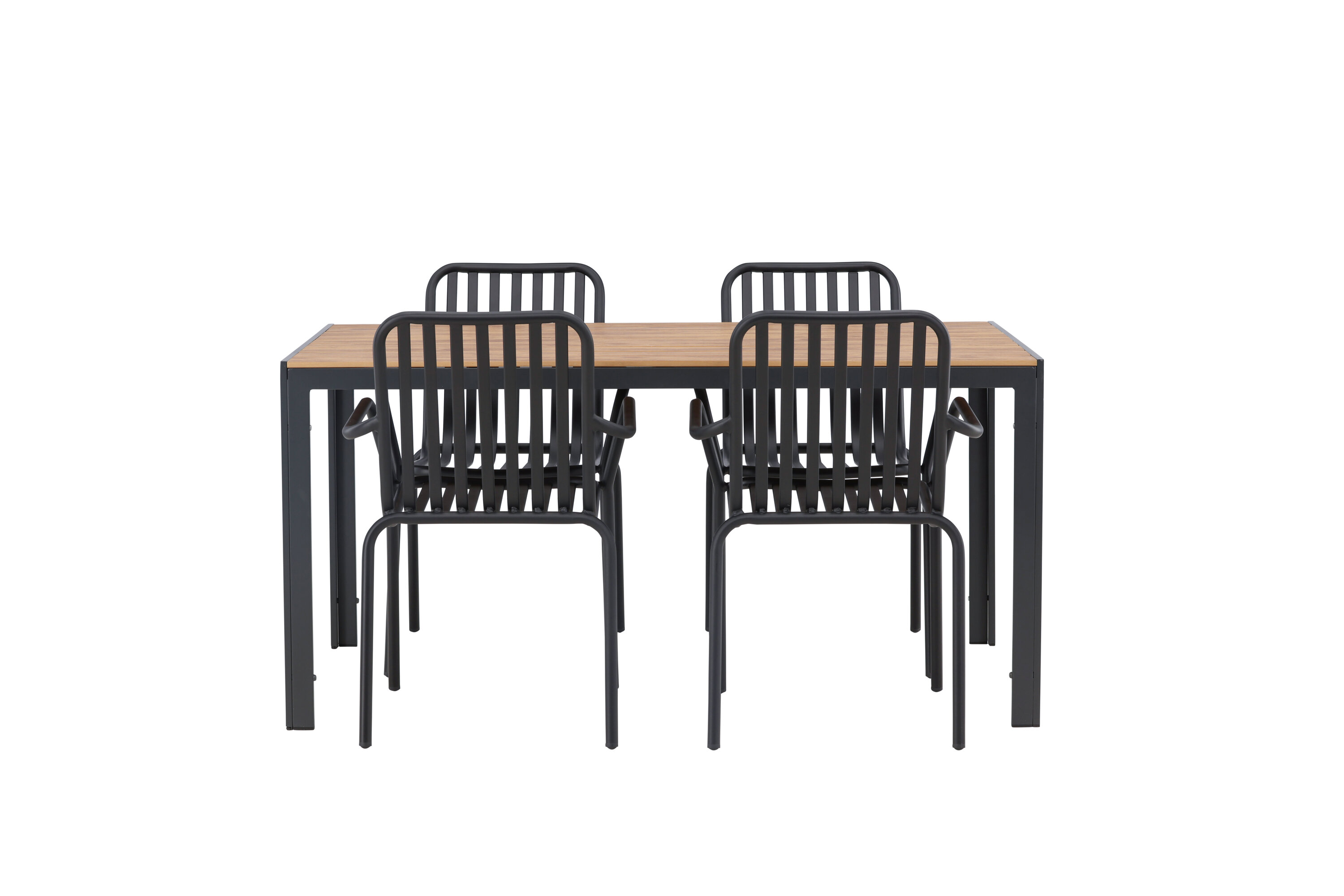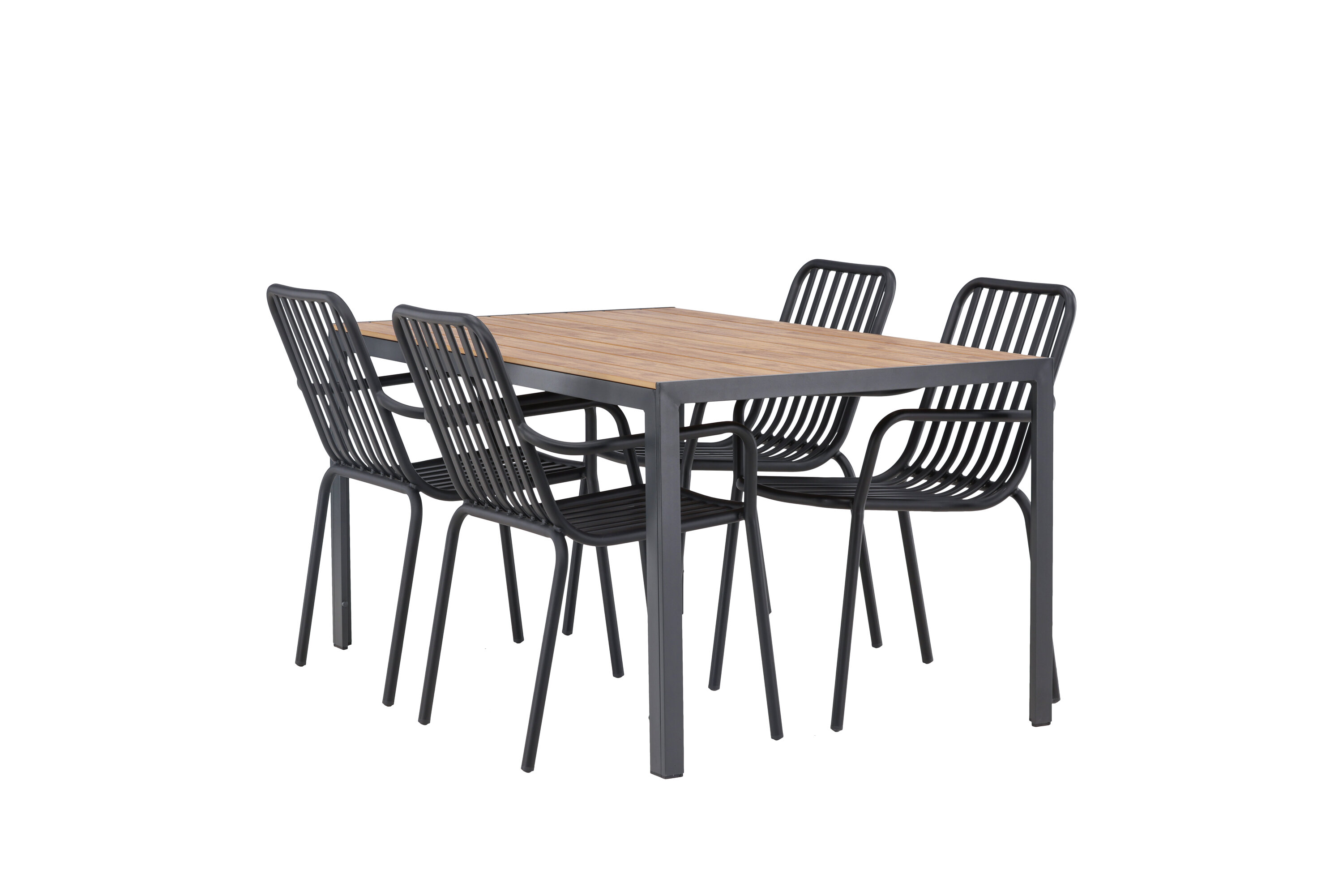 Looge oma terrassil trendikas tunne tõeliselt sobiva söögigrupiga! Meie ristkülikukujuline söögilaud Break on klassikalise põhjamaise disainiga sirge kujuga, vineerist lauaplaadi ja mustast alumiiniumist lauajalad. Siin on stiilne kombinatsioon 4 Pekingi seeria söögitooliga. Tooli soonik disain ja tahmane must värv muudavad selle nii modernseks kui ka ajatuks. Valmistatud alumiiniumist, mis muudab selle hõlpsaks liikumiseks ja lisaks on integreeritud käetoed lisamugavuse tagamiseks. Siin saate pikka aega maha istuda ja oma terrassi nautida! Laua mõõdud: 150x90cm.