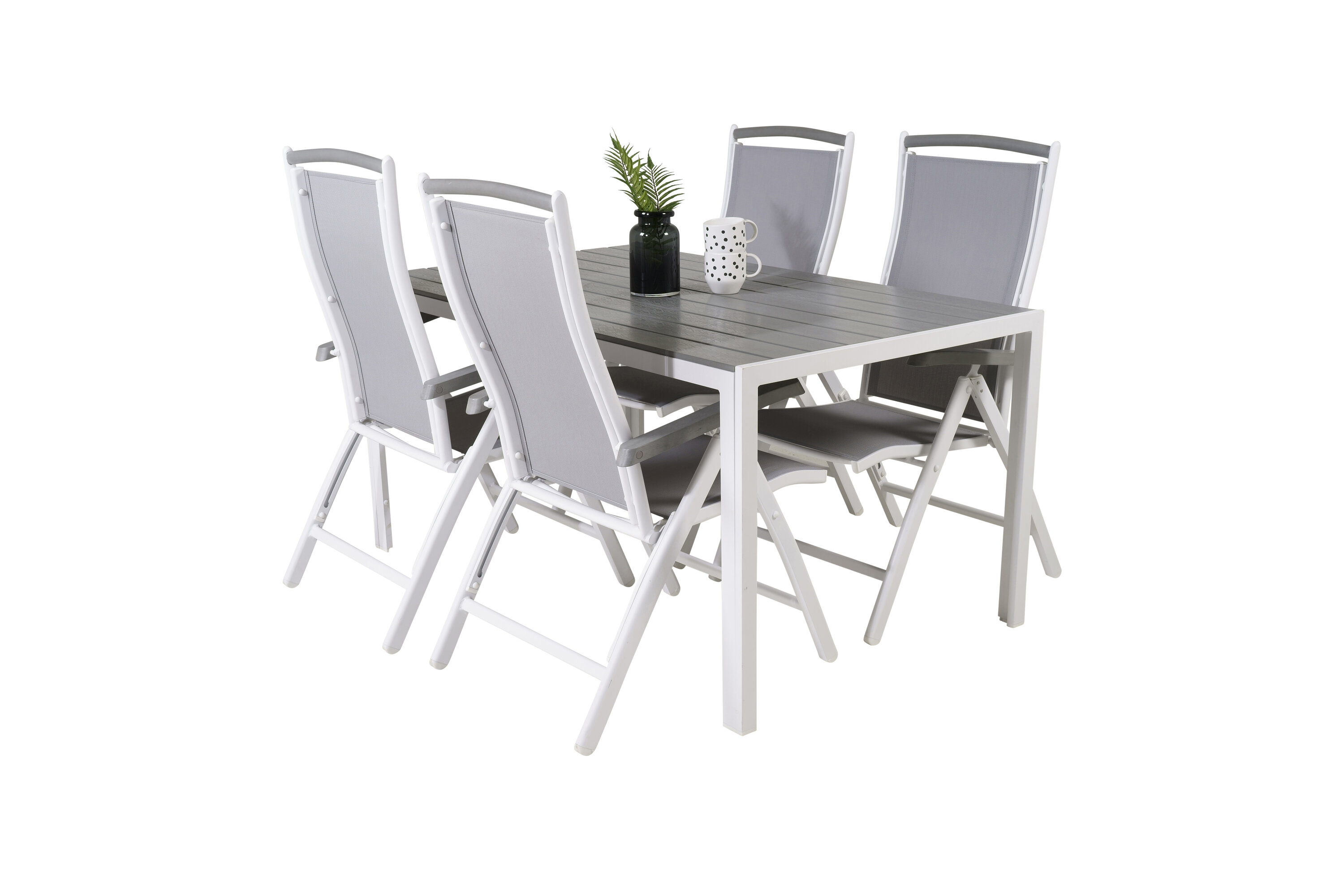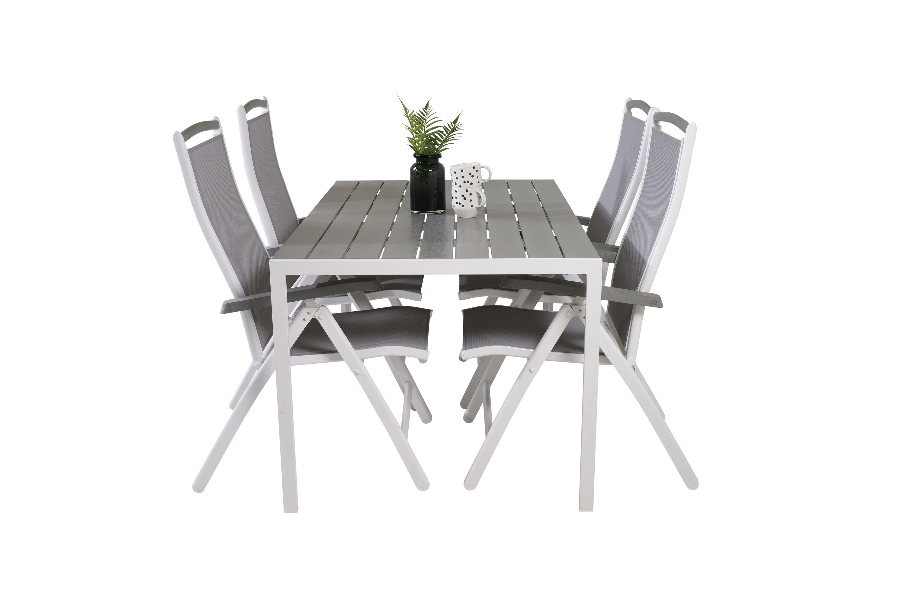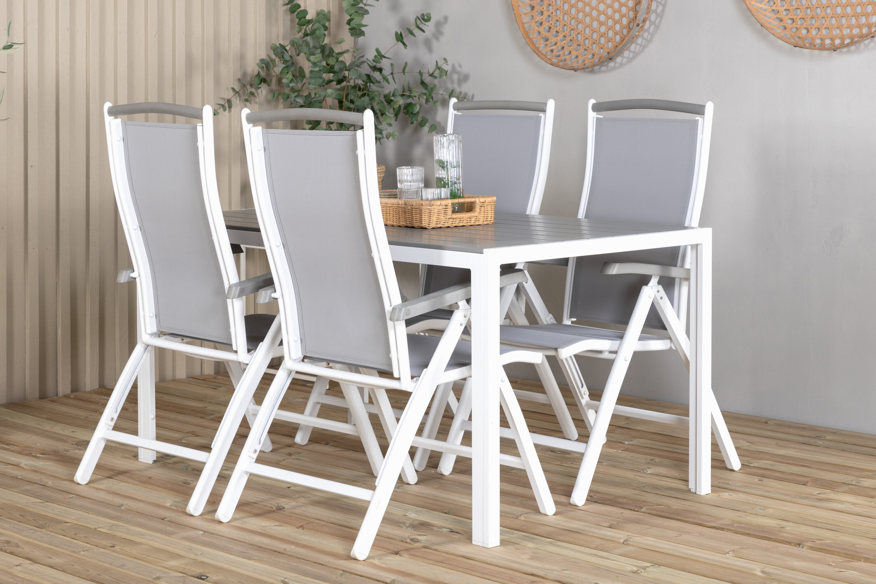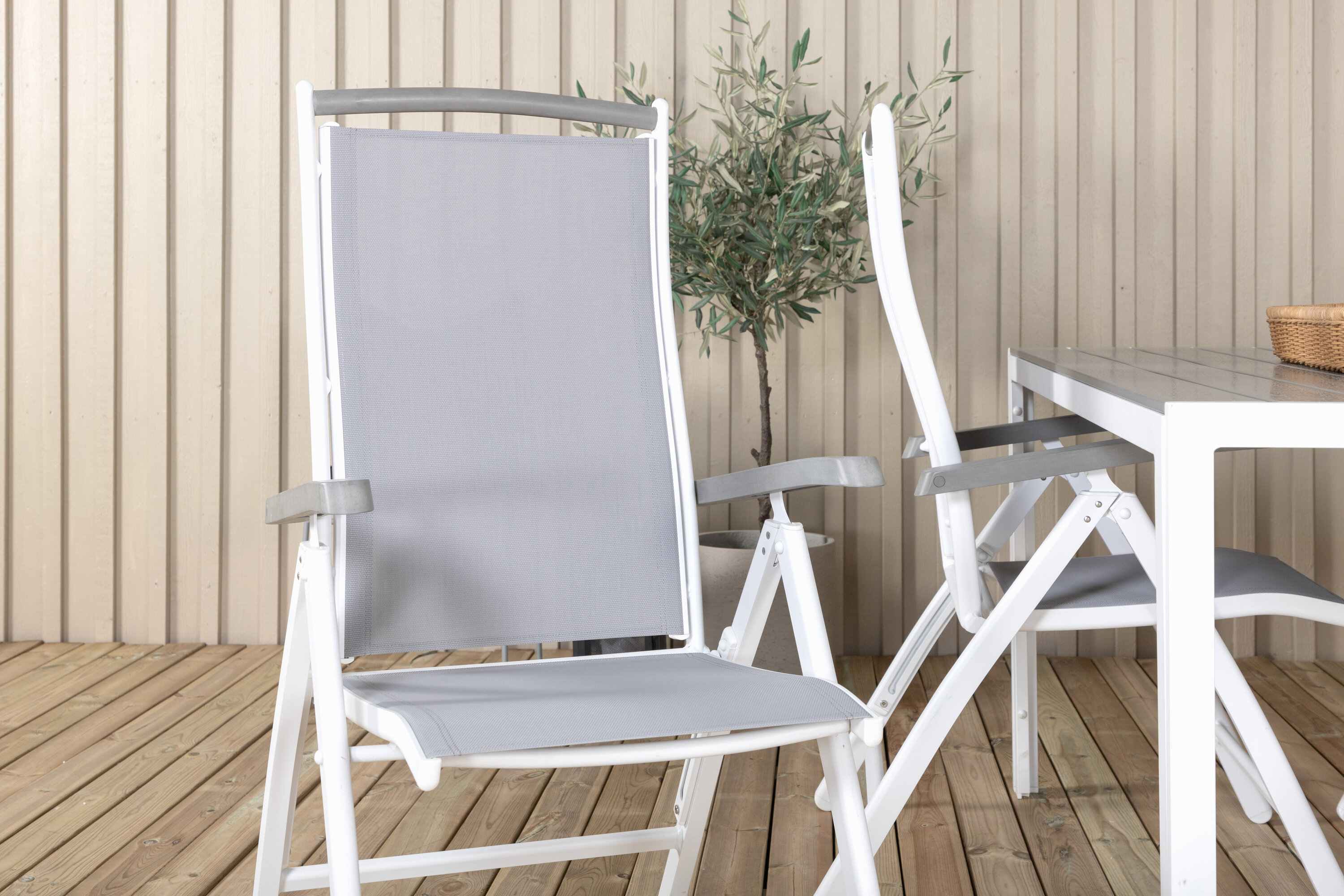 Moodne toidugrupp maitsvates halltoonides! Klassikalises stiilis söögilaud on ühtaegu trendikindel ja praktiline. Siin koos kokkupandava seljatoega Albany seeria sõbralike söögitoolidega. Koguge pere ja sõbrad ning nautige sooje suveõhtuid terrassil!