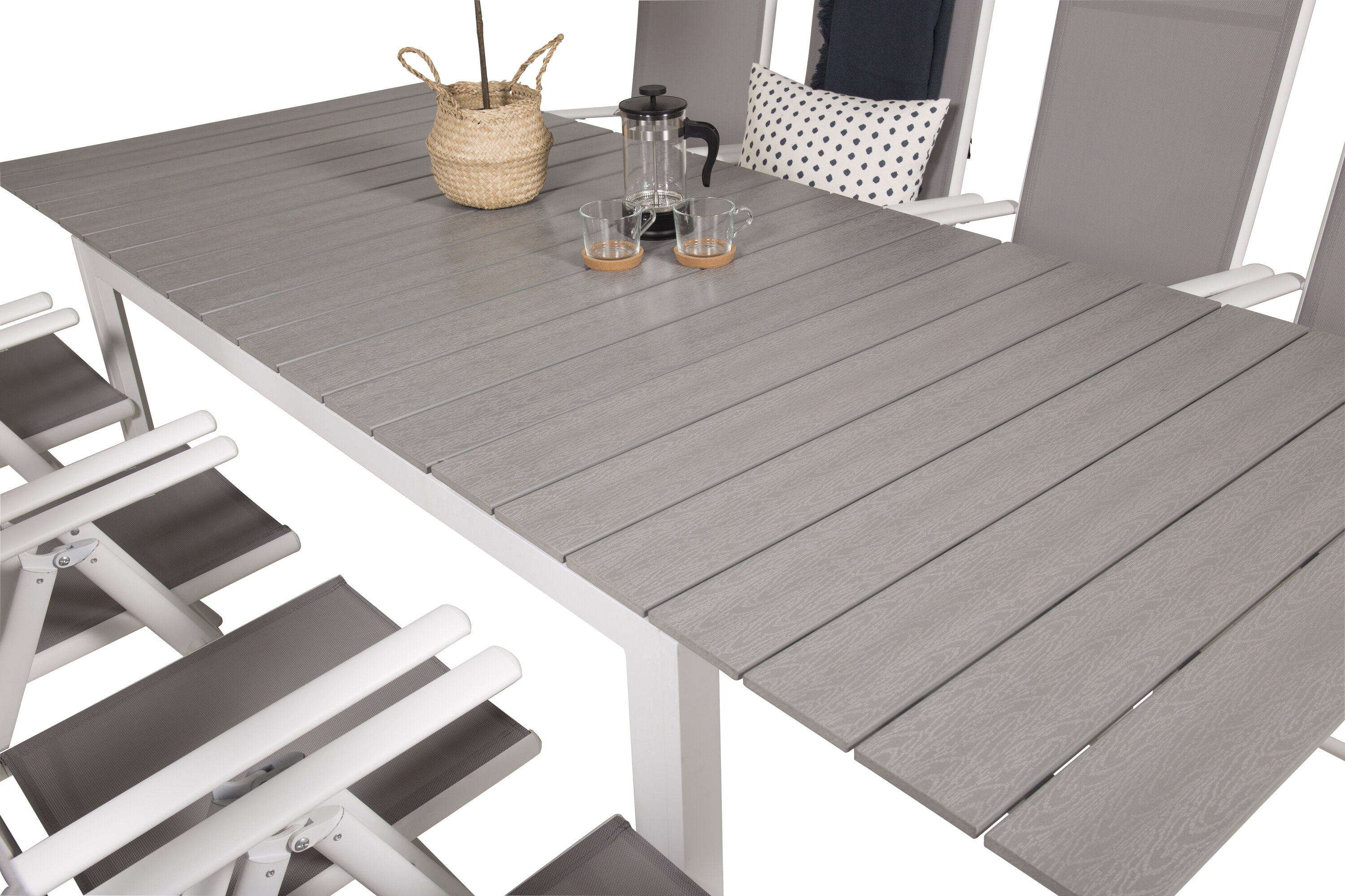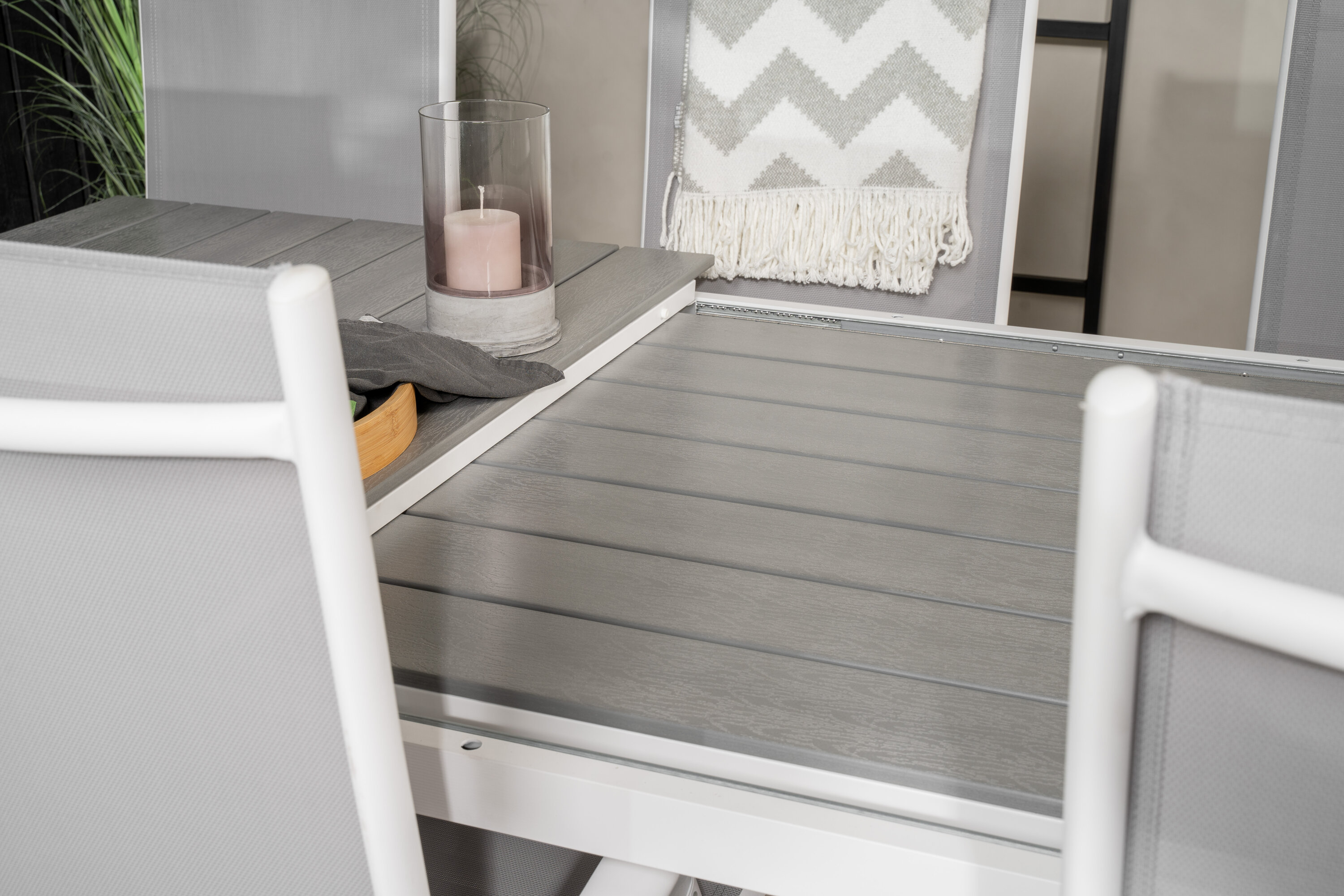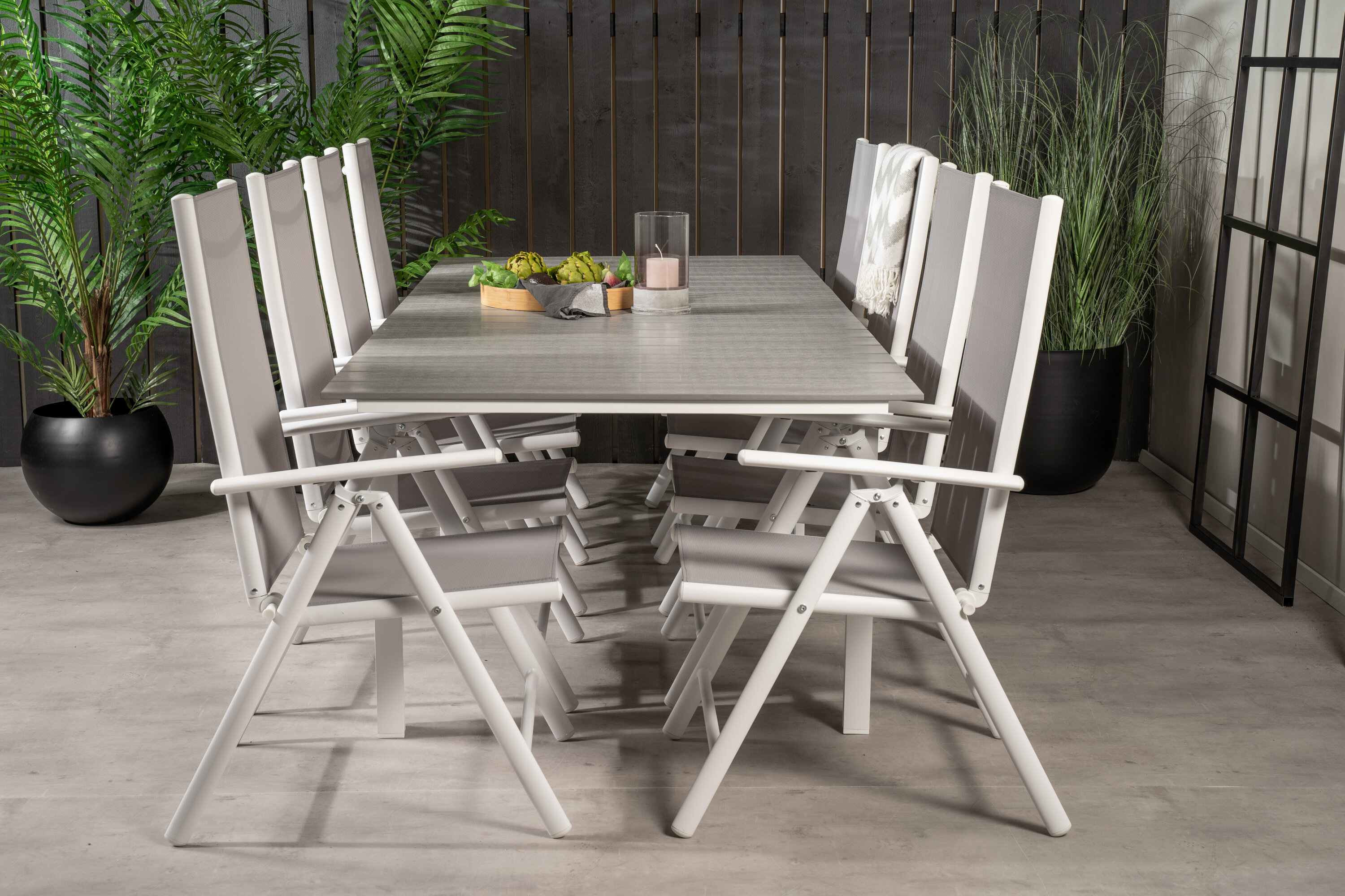 Trendikas toidugrupp, mis sobib suurepäraselt terrassile! Söögilaud Klassikalises stiilis tasapinnad, siin koos meie moodsate söögitoolidega purunevad kokkupandava seljatoega. Laske oma siseõue kaunistada see pilkupüüdev toidugrupp ja nautige hilissuveõhtuid!