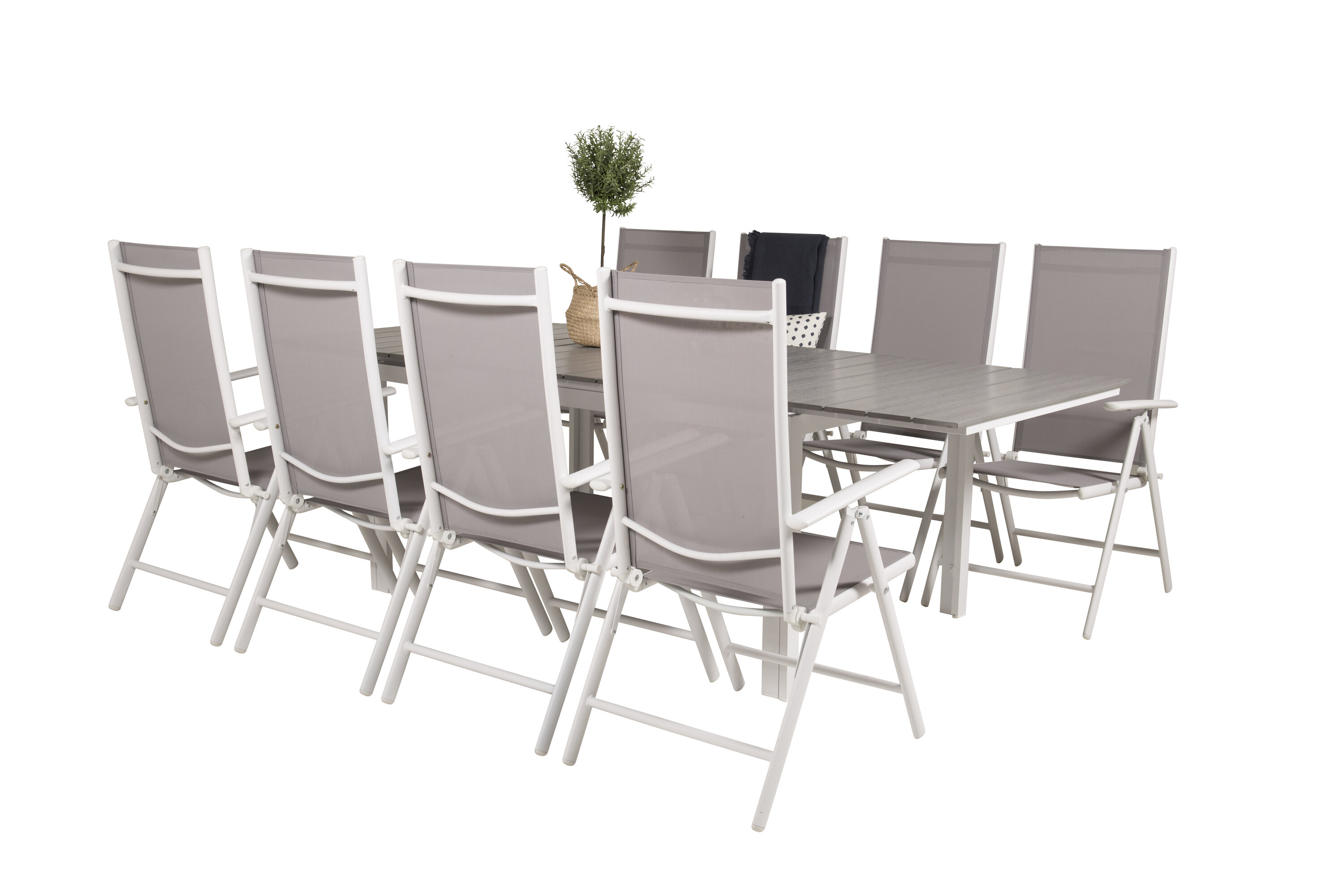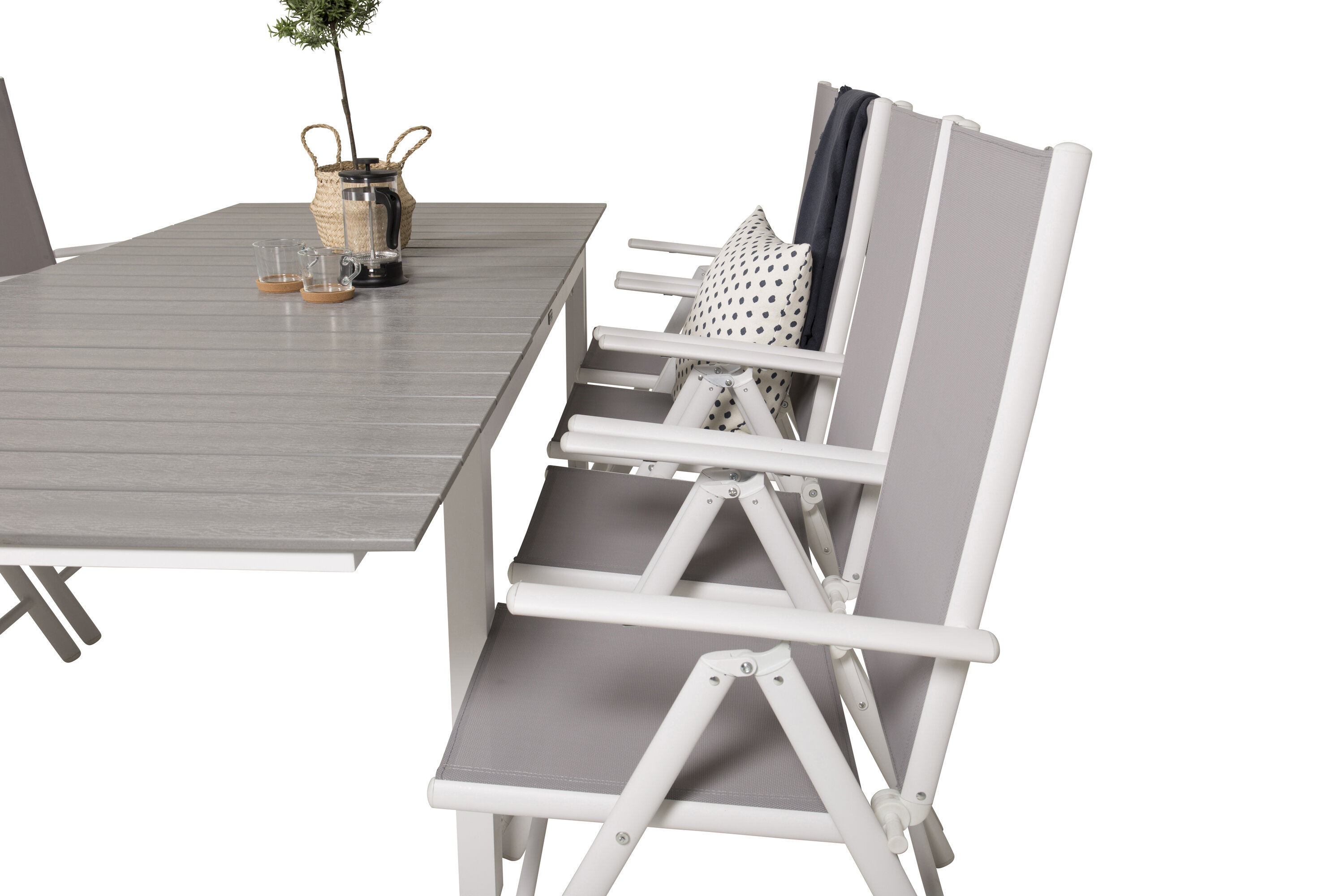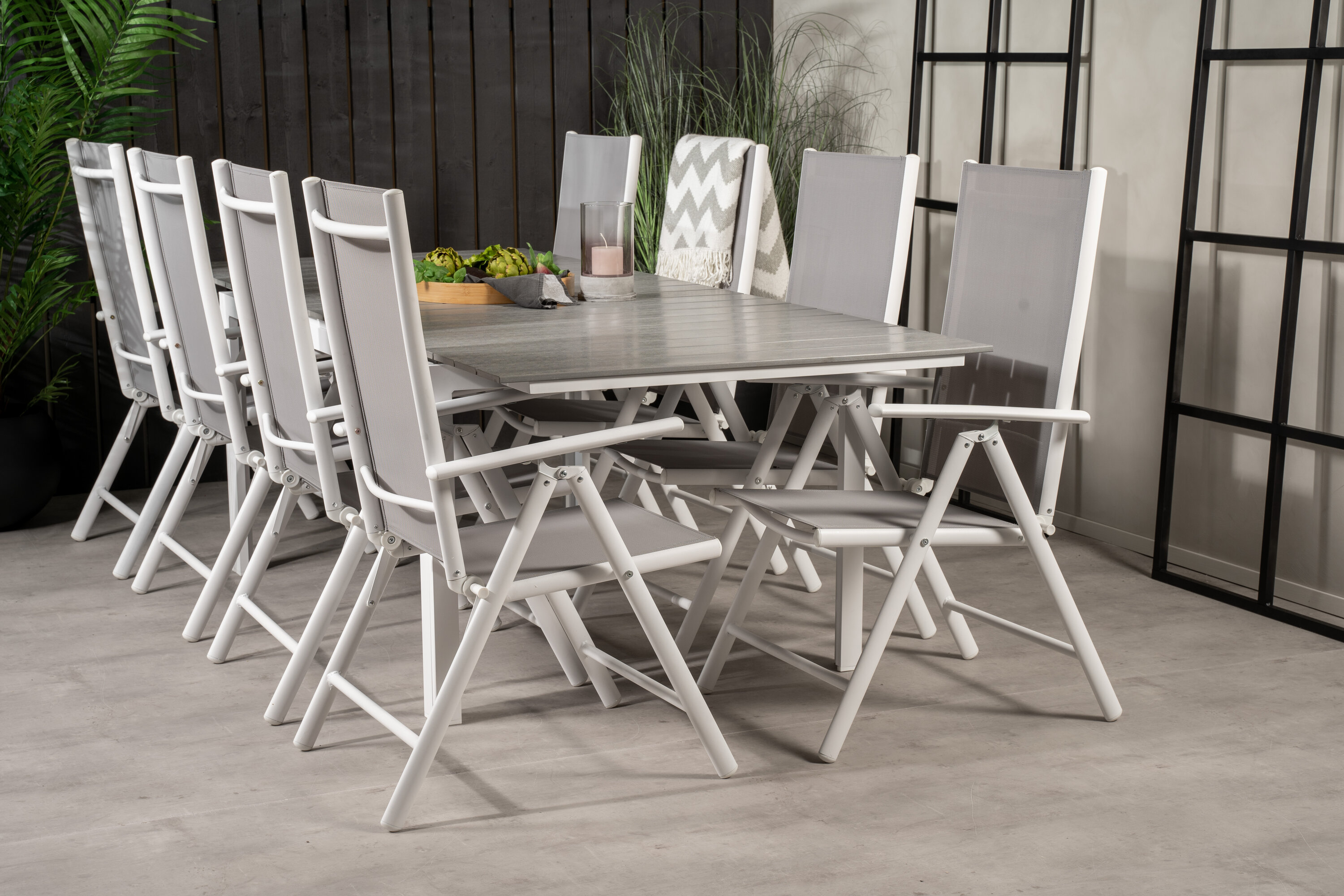 Trendikas toidugrupp, mis sobib suurepäraselt terrassile! Söögilaud Klassikalises stiilis tasapinnad, siin koos meie moodsate söögitoolidega purunevad kokkupandava seljatoega. Laske oma siseõue kaunistada see pilkupüüdev toidugrupp ja nautige hilissuveõhtuid!