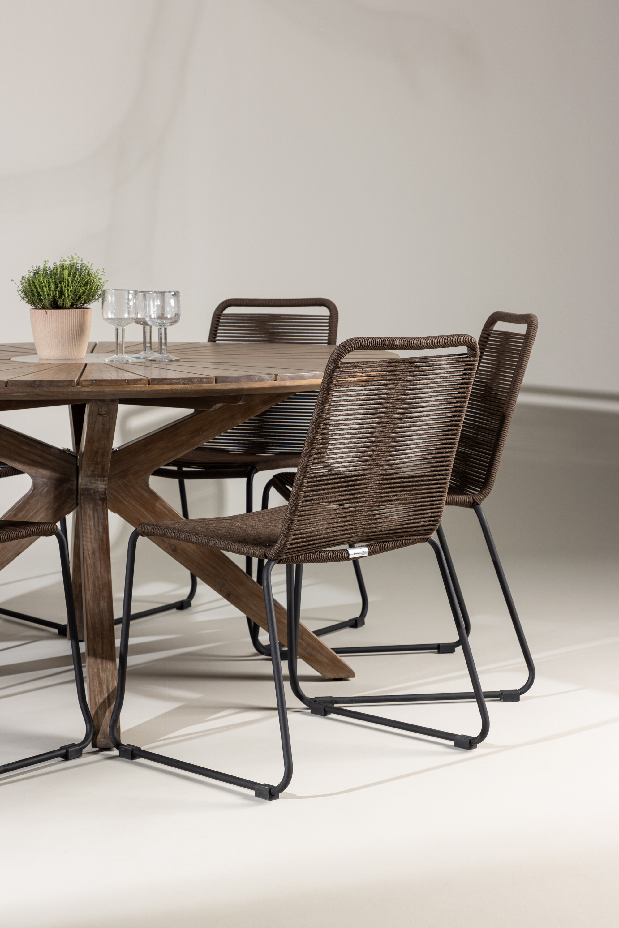 Pruunide polüpropüleenist istmete ja musta terasraamiga Lindose toolid sulanduvad sujuvalt ümbritsevaga, luues neutraalse aluse teie väljas einestamiseks.