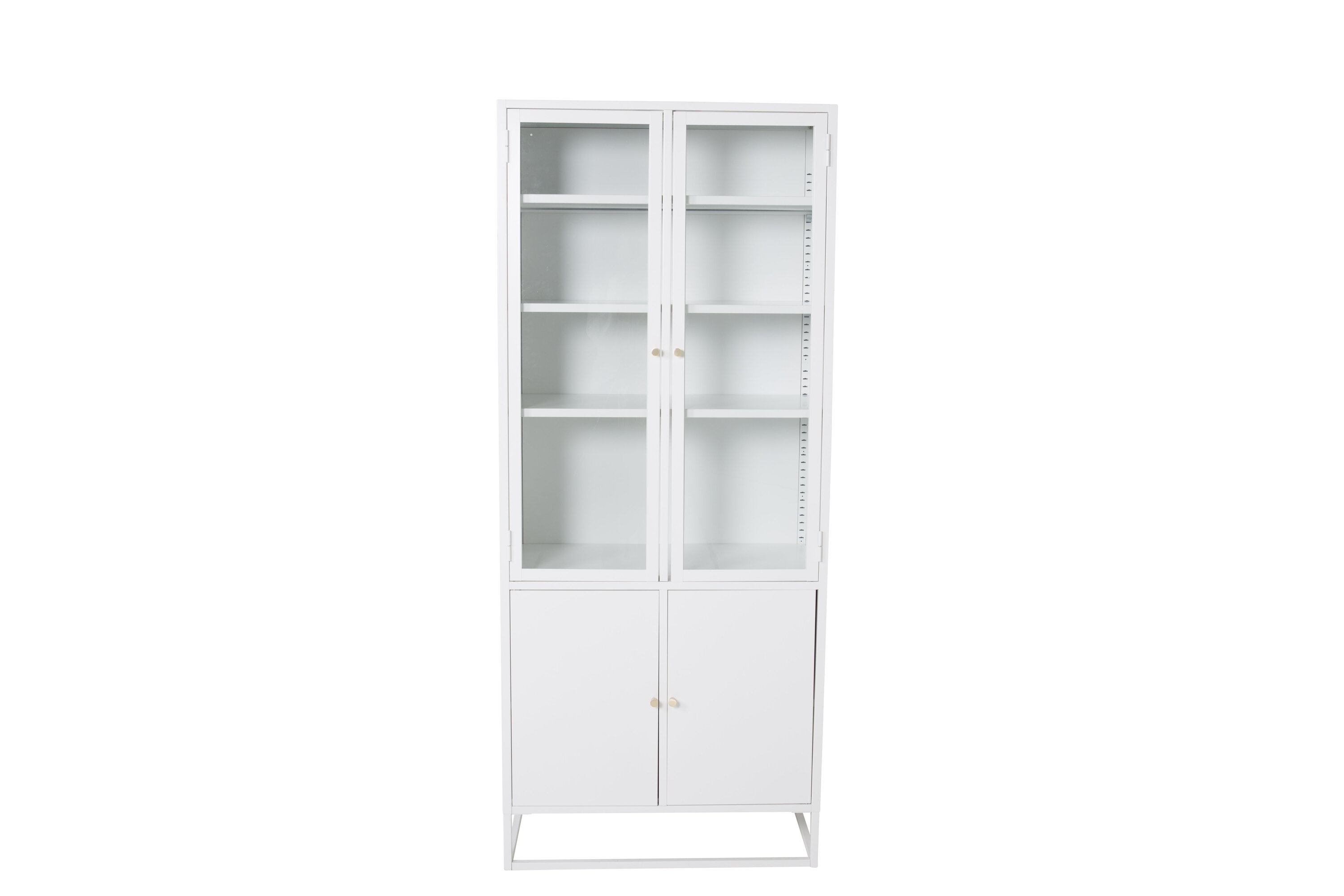 Vitriinkapp on populaarne interjööri täiendus elegantsete panipaikadega! Bakval sarja kapp on modernse disainiga sirgete konstruktsioonidega, valmistatud pulbervärvitud valgest terasest. Peal on kaks kõrget klaasust, mis pakuvad kappi armsat valgust ja neli reljeefset pinda teie peene portselani või kaunite sisustusdetailide jaoks. Põhjas on kaks pulbervärvitud valgest terasest ust kahe reljeefse pinnaga varjatud hoiustamiseks. Vitriinkapp, mis pakub kahest maailmast parimat lihtsalt – valige, mida soovite näidata ja mis vajab nutikat salvestusruumi. Vajalik on kergem montaaž.