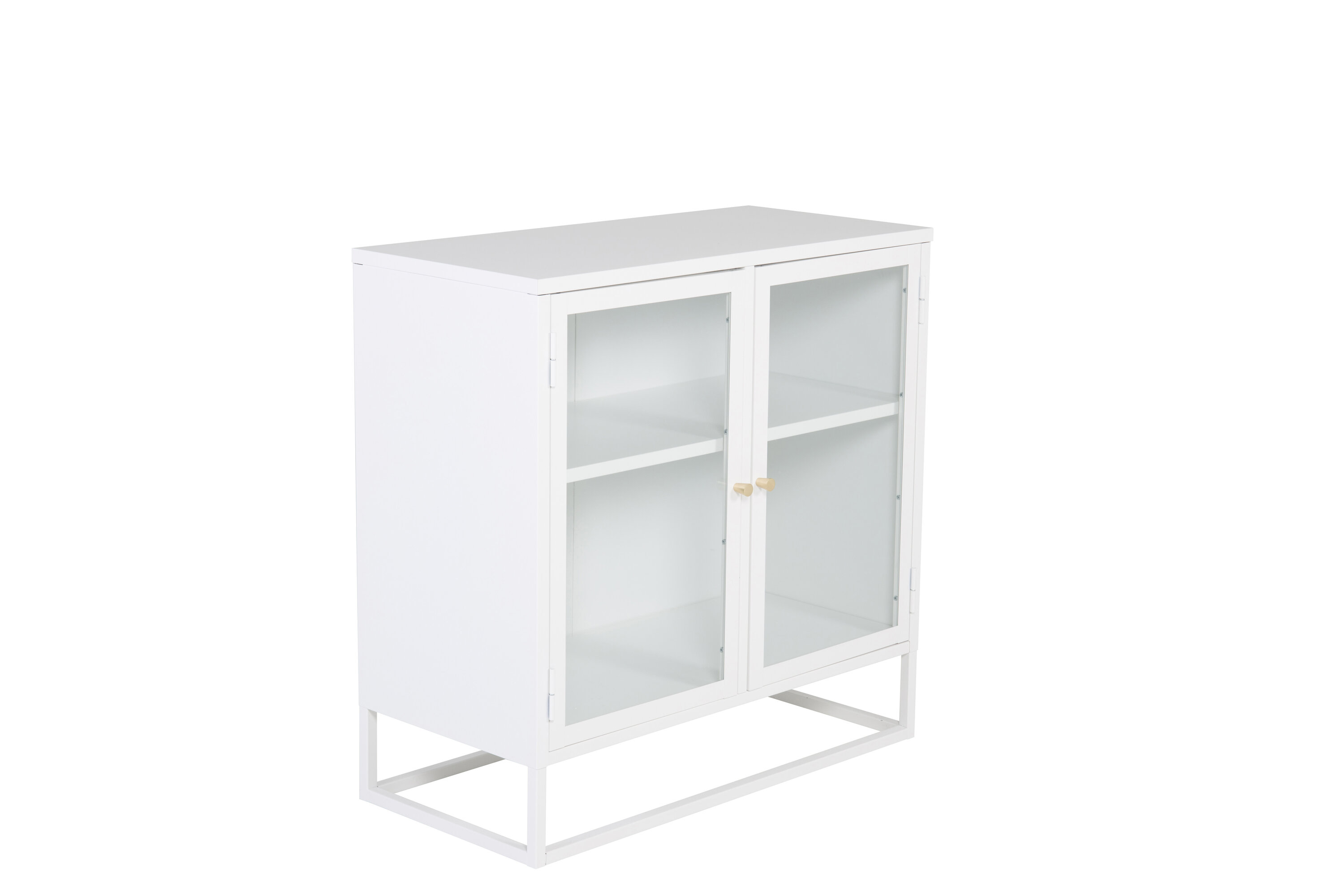 Baktal, moodsa tööstusliku disainiga pulbervärvitud valgest terasest kahe klaasist uksega. Pulbervärvitud valgest terasest raam ja kaks reljeefset pinda. Ustel on messingvärvi pungad. Kogu kapp toetub valge pulbervärvitud terasest avatud raamile. Mõõdud: pikkus: 85 cm, laius: 40 cm, kõrgus: 85 cm. Vajalik on kergem montaaž.