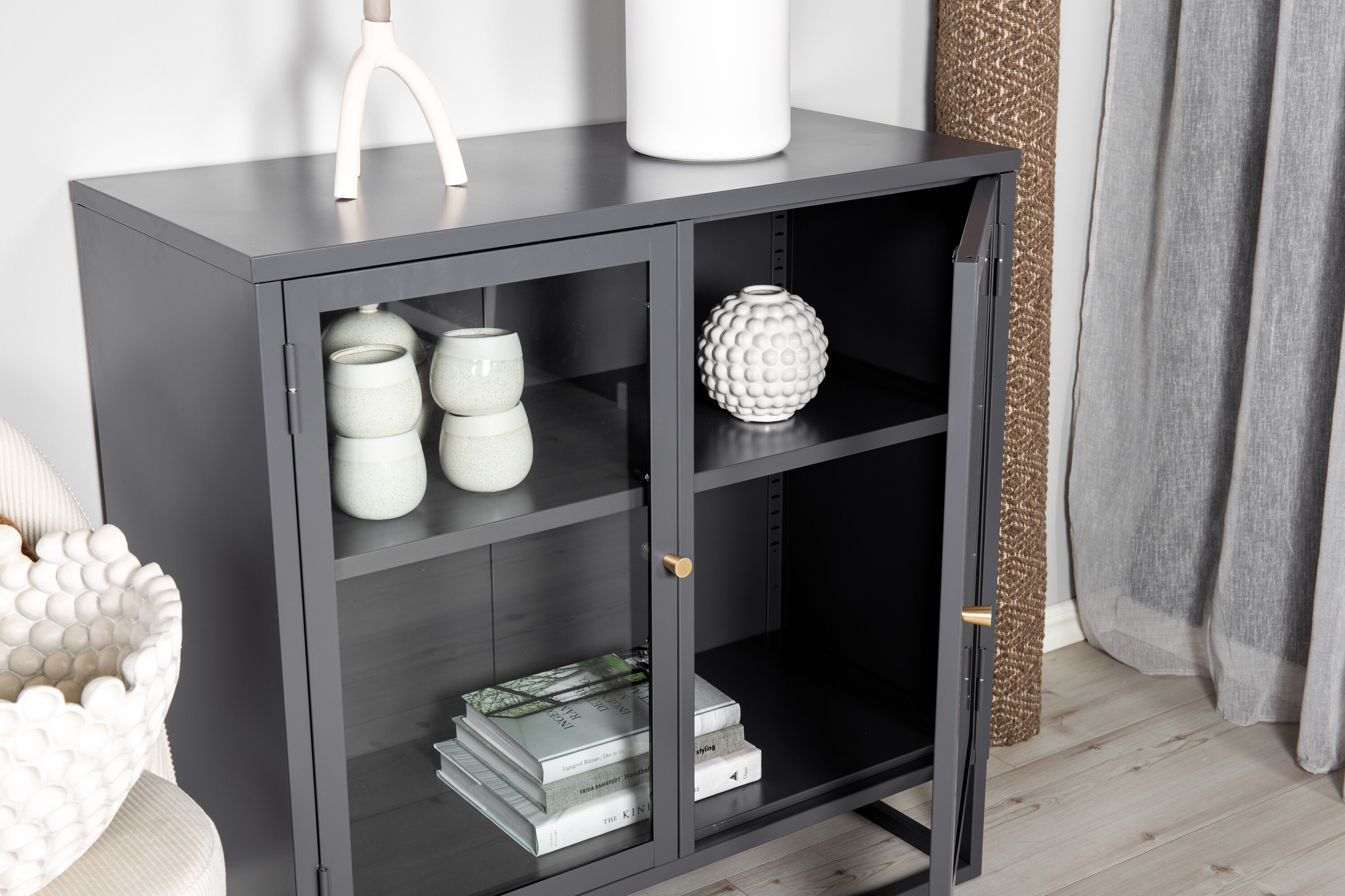 Baktal, moodsa tööstusliku disainiga pulbervärvitud helehallist terasest kahe klaasist uksega. Pulbervärvitud helehallist terasest raam ja kaks reljeefset pinda. Ustel on messingvärvi pungad. Kogu kapp toetub helehalli pulbervärvitud terasest avatud raamile. Mõõdud: pikkus: 85 cm, laius: 40 cm, kõrgus: 85 cm. Vajalik on kergem montaaž.