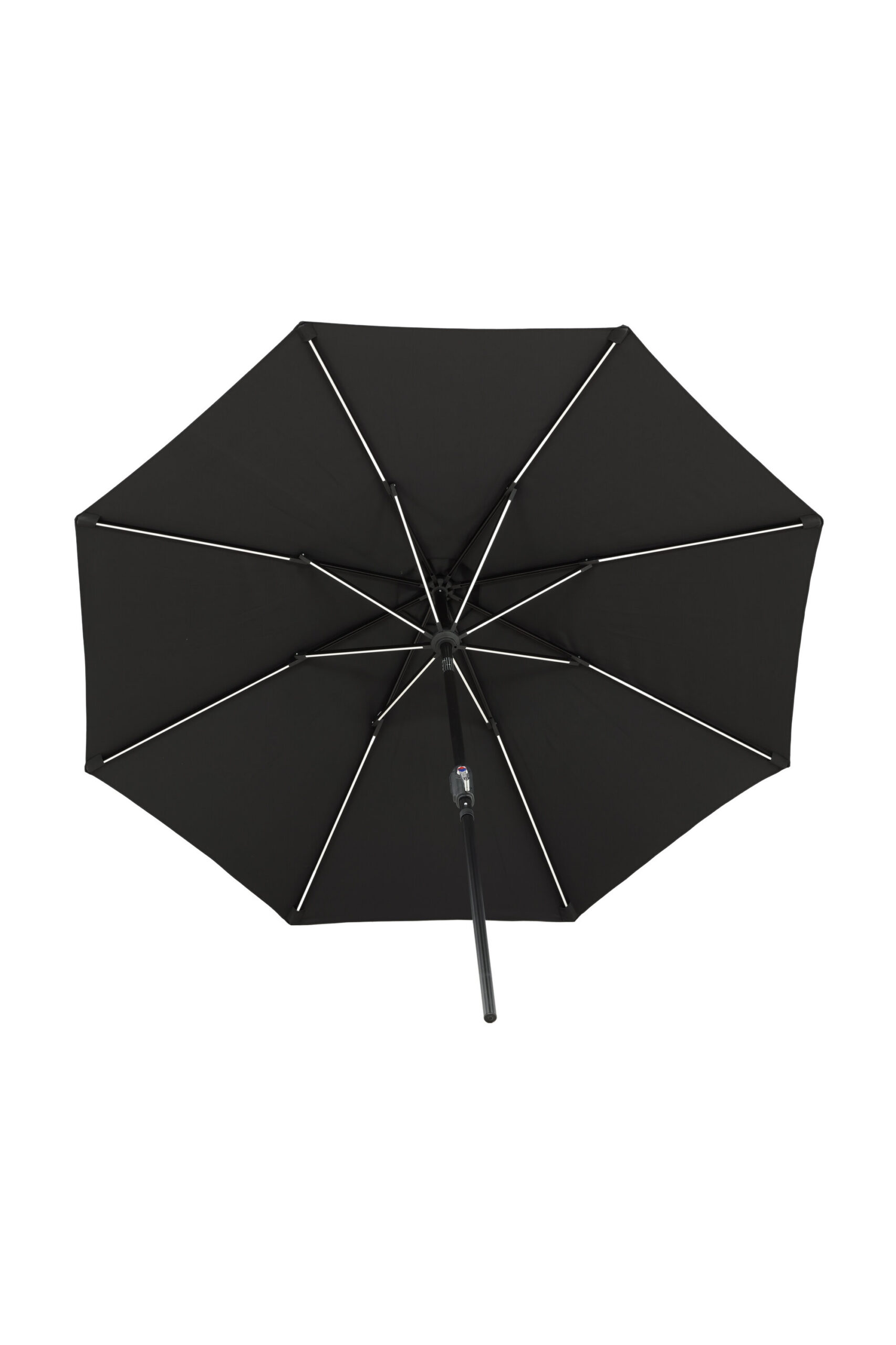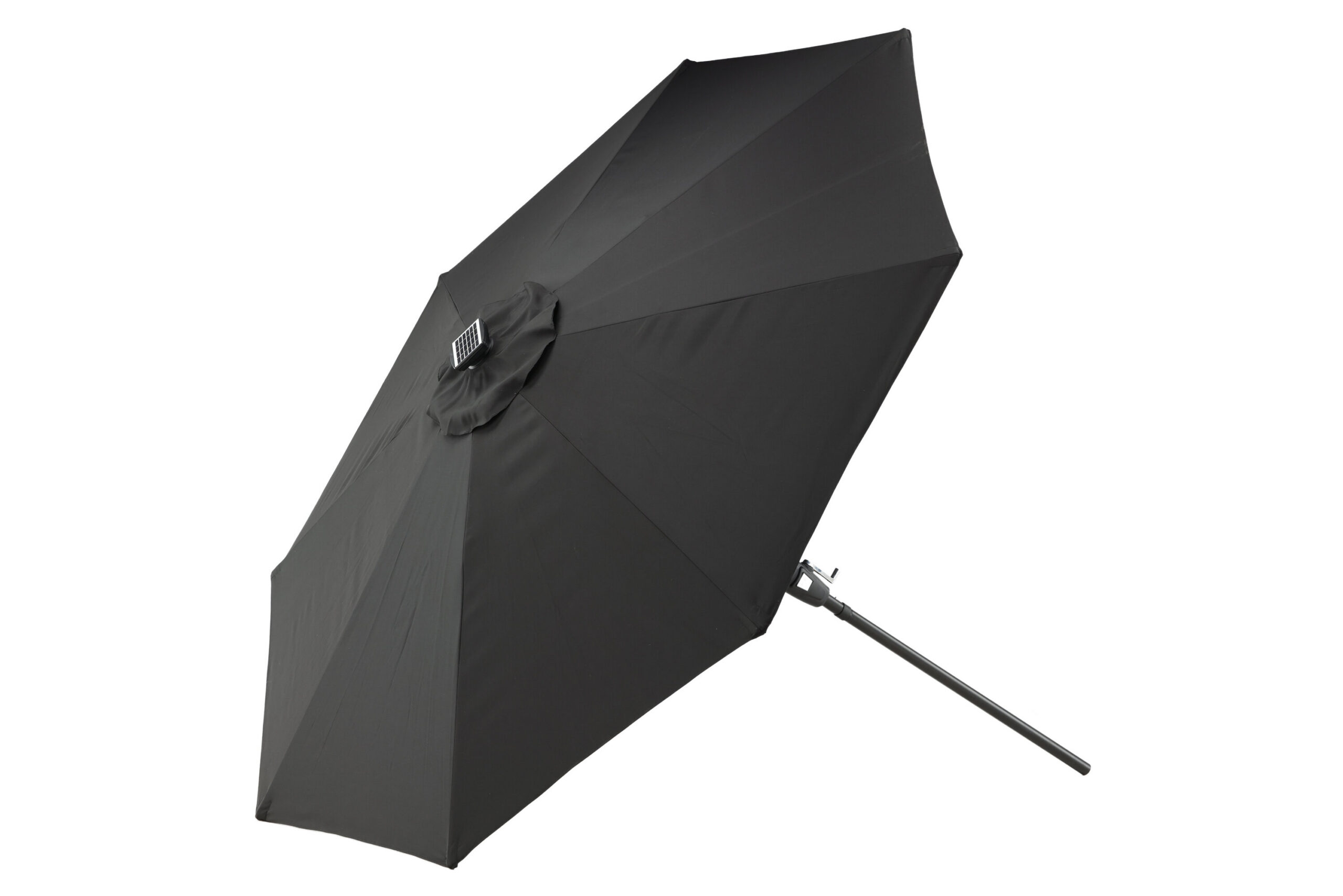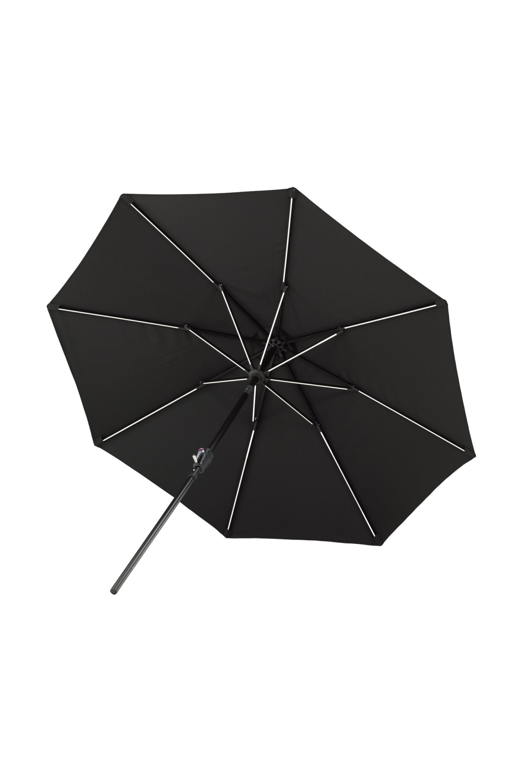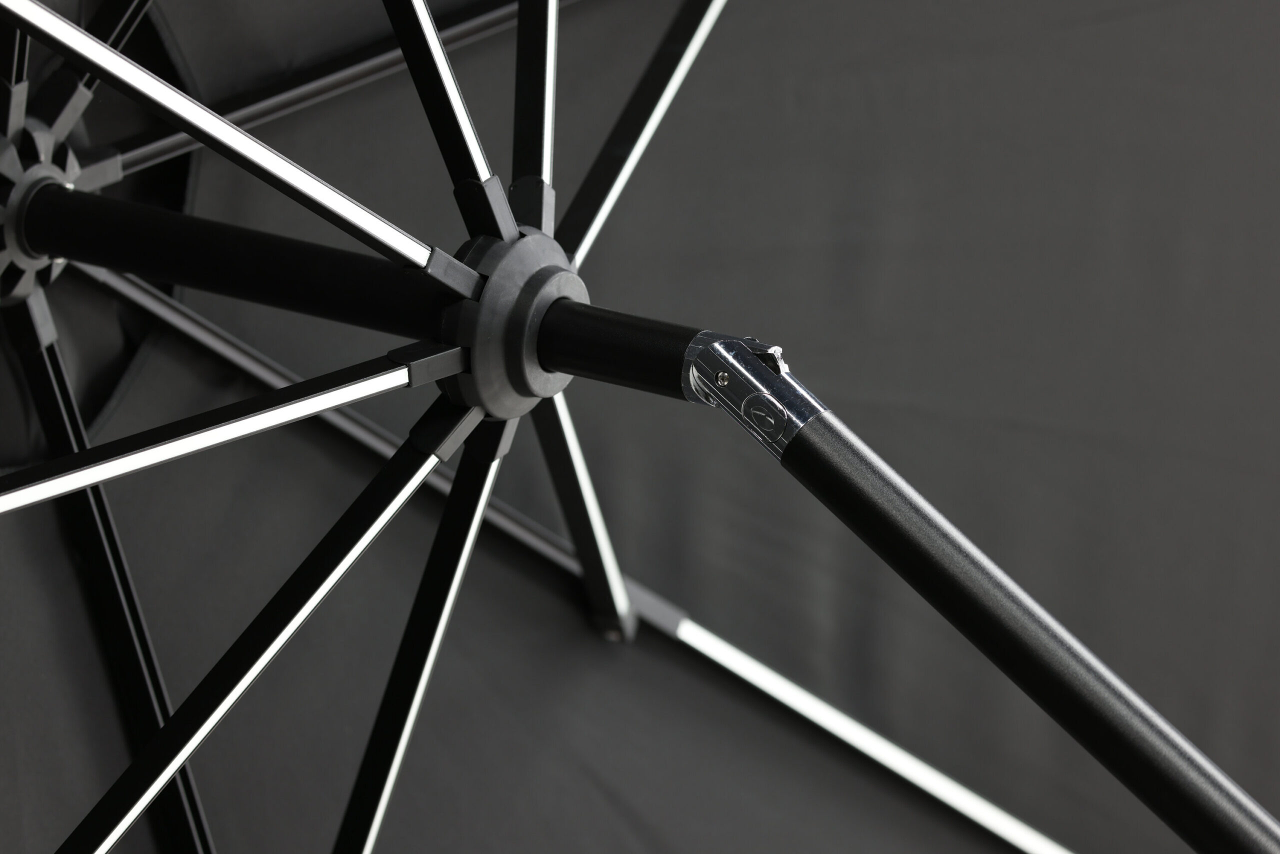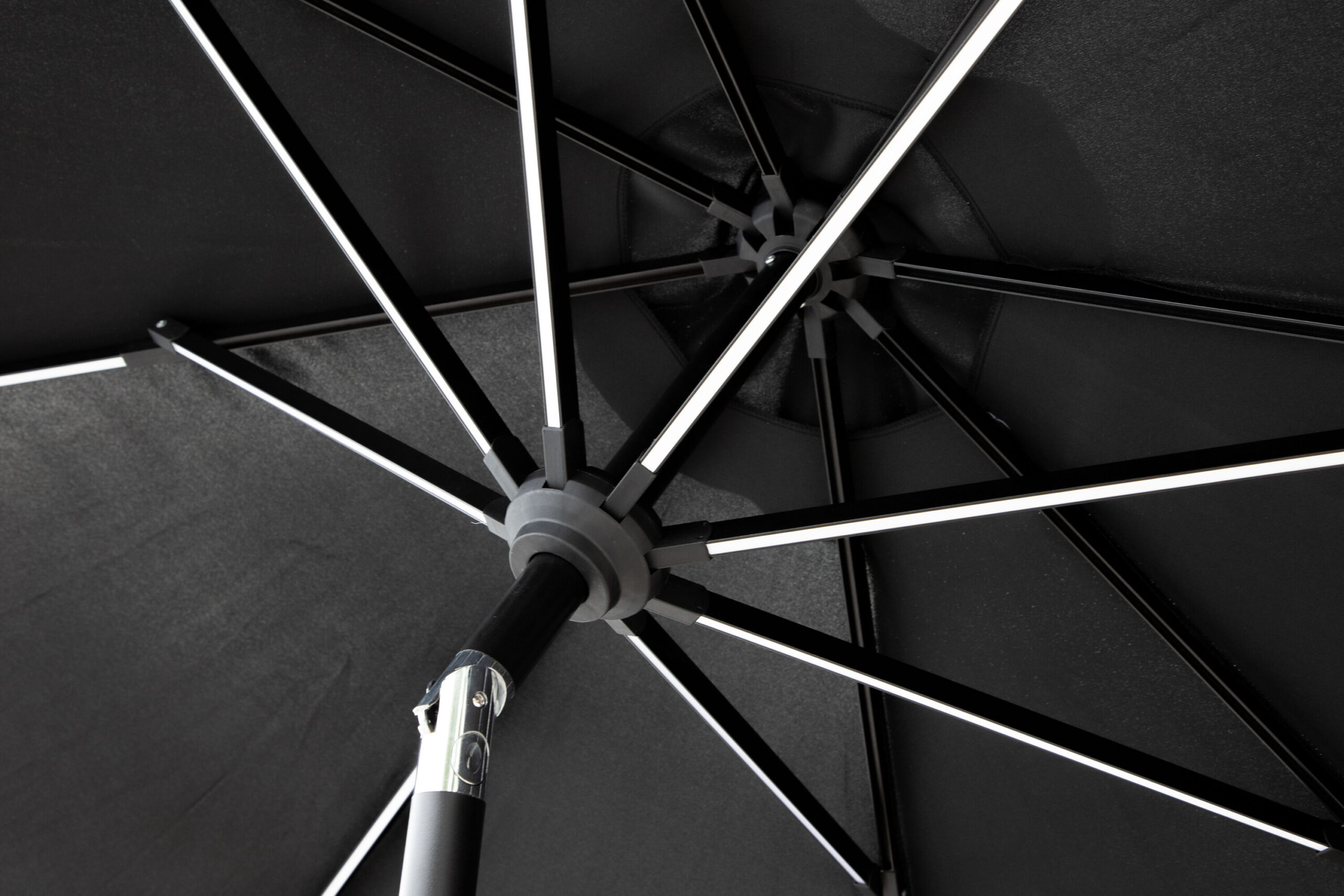 Musta kangaga eraldiseisev päikesevari, ideaalne laiskadeks päevadeks varjus! Liigutage seda oma siseõuel vastavalt oma vajadustele. LED-valgustus annab õhtuti hubase valguse.
