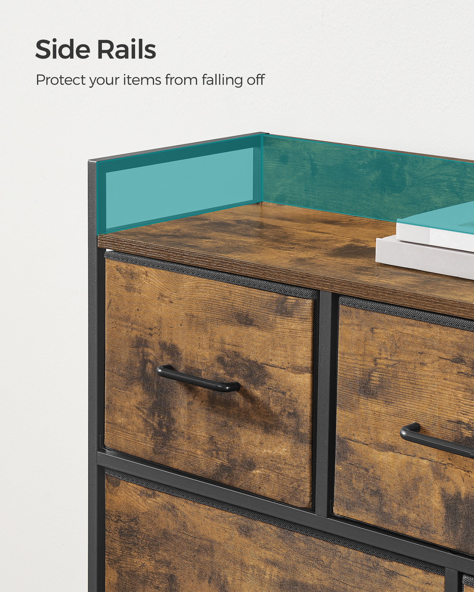 Spetsifikatsioonid: – Värv: Rustikaalne pruun, tindimust – Materjal: Puitlaastplaat, teras, kangast sahtli esiosa – Kogumõõtmed: 28,5 x 98 x 85 cm – Iga väikese sahtli mõõtmed: 27,4 x 29,5 x 21,6 cm – Iga suure sahtli mõõtmed: 27,4 x 46 x 21,6 cm – Toote kaal: 12,8 kg – Maksimaalne staatiline kandevõime sahtli kohta: 3 kg – Lauaplaadi maksimaalne staatiline kandevõime: 50 kg – Maksimaalne staatiline kogukandevõime: 71 kg Pakisisu: – 1 x Kummut – 1 x tarvikute komplekt – 1 x ümberkukkumisvastane komplekt – 1 x juhend