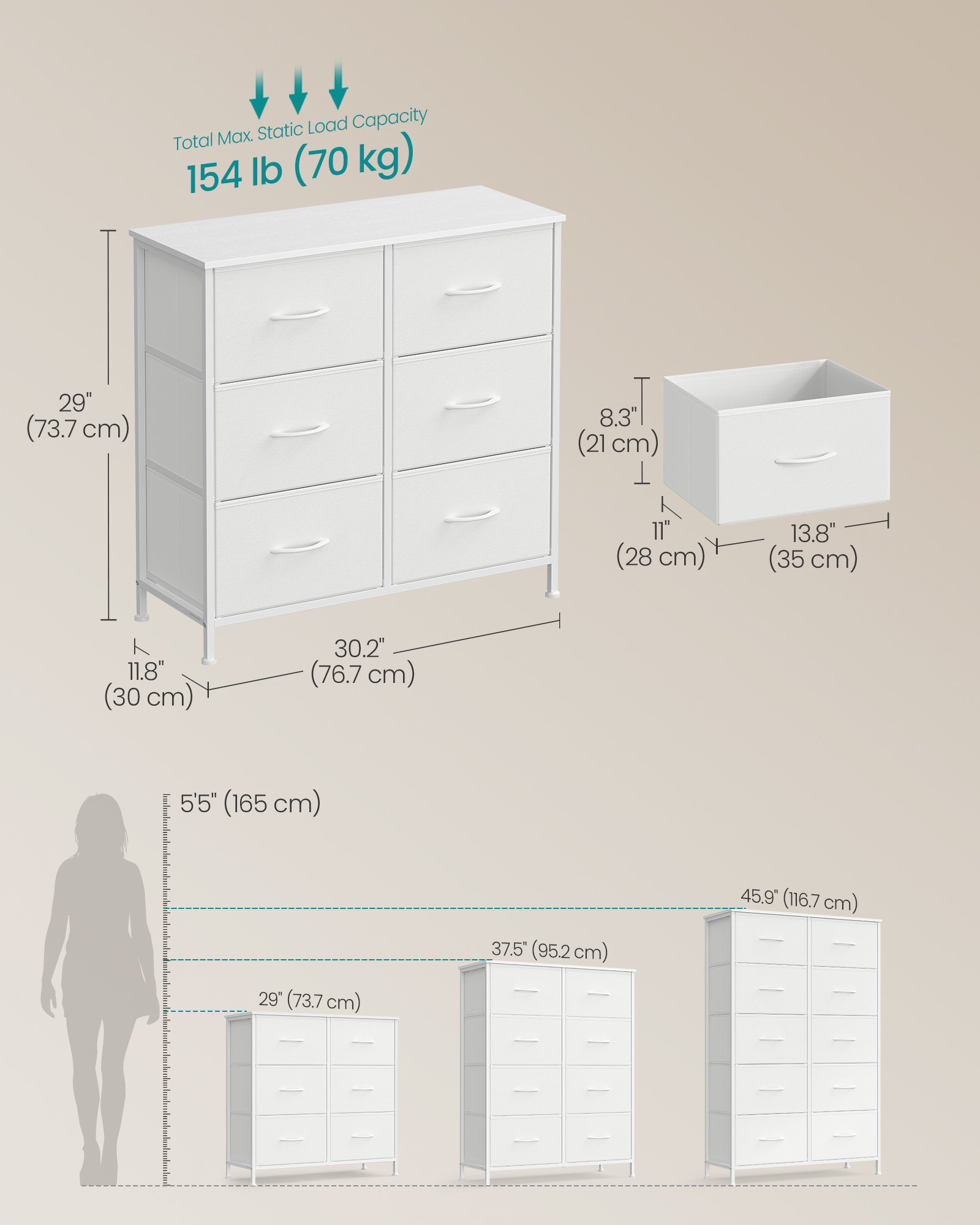 Spetsifikatsioonid: – Värvus: Pilvevalge, Lumivalge – Materjal: MDF (keskmise tihedusega puitkiudplaat), puitlaastplaat, teras, lausriie – Toote mõõdud: 11,8″S x 30,2″L x 29″K (30 x 76,7 x 73,7 cm) – Toote kaal: 18,7 naela (8,5 kg) – Pealispinna maksimaalne staatiline kandevõime: 88 naela (40 kg) – Sahtli maksimaalne staatiline kandevõime: 11 naela (5 kg) Pakisisu: – 1 x kummut – 1 x tarvikute komplekt – 1 x ümberkukkumisvastane komplekt – 1 x juhend SONGMICS Märkused: – Paki esmakordsel avamisel võib olla “uue” lõhn; palun tuulutage seadet hästi ventileeritavas kohas paar tundi. – Ärge kasutage õues ega asetage pikka aega niiskesse keskkonda. – Ärge peske sahtleid; puhastage neid niiske lapiga. – Ohutu kasutamise tagamiseks kinnitage seade seinale kaasasoleva ümberkukkumisvastase komplekti abil.