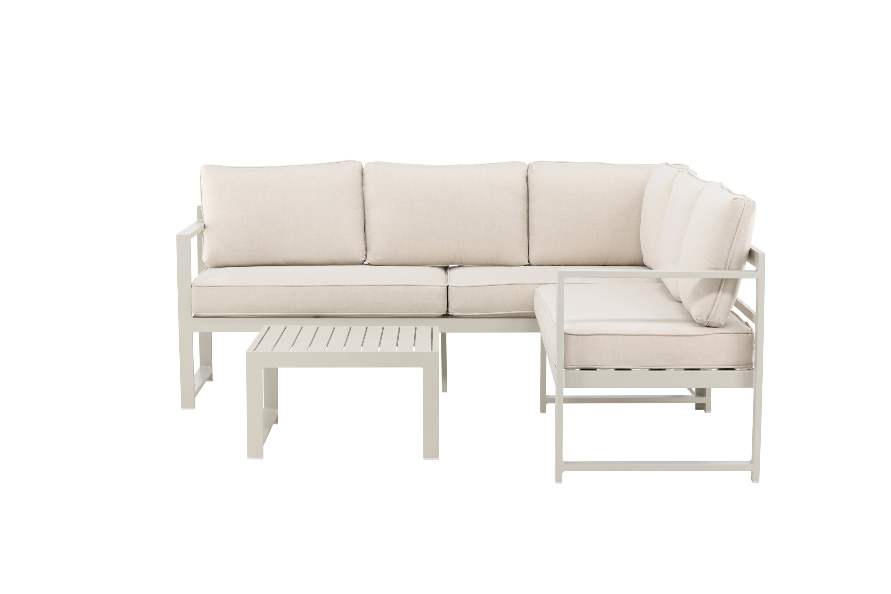 Salvador on stiilne nurgadiivan, mis ühendab kaasaegse disaini funktsionaalsusega. Kvaliteetsest alumiiniumist valmistatud välimööbel pakub nii vastupidavust kui ka kerget tunnet. Beež raam harmoneerub ideaalselt pehmete beežist polüestrist patjadega, luues kutsuva ja pingevaba õhkkonna.