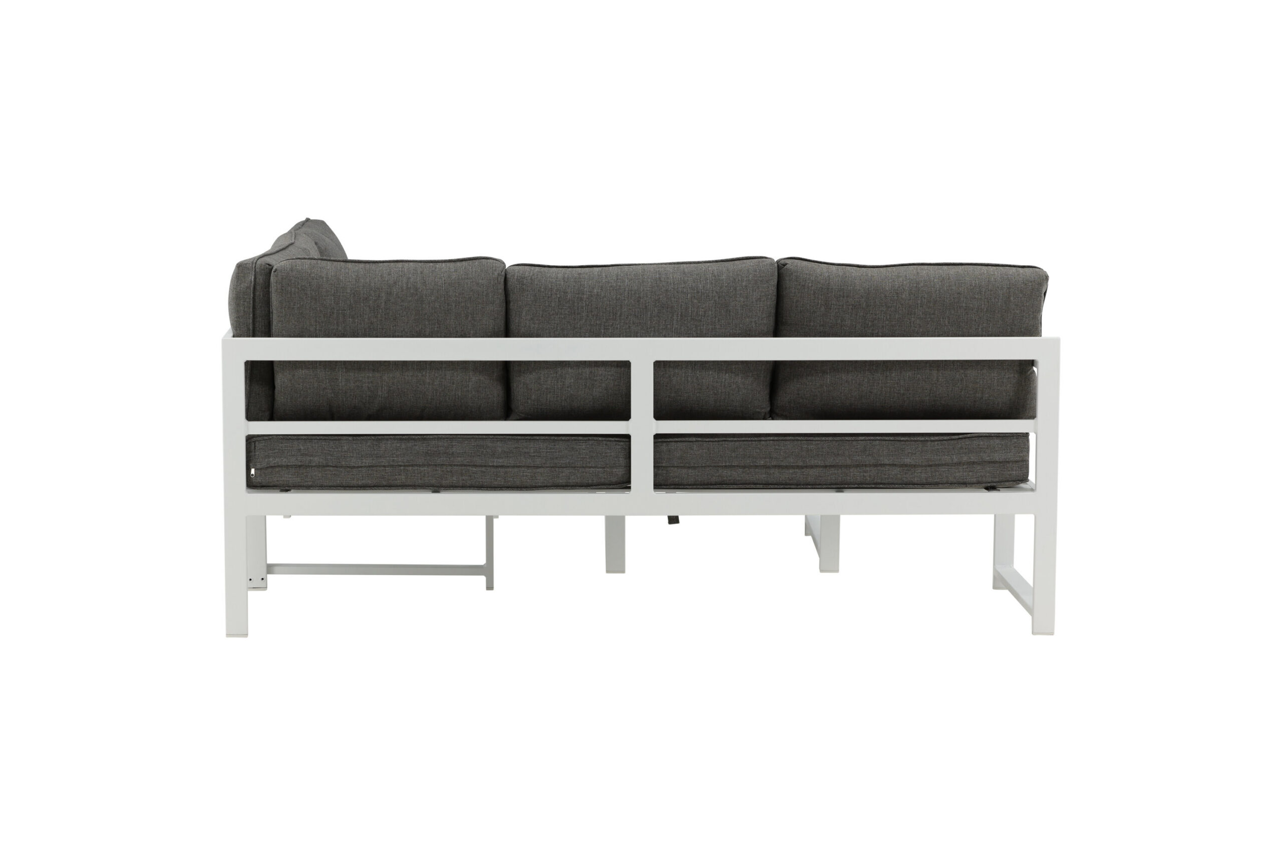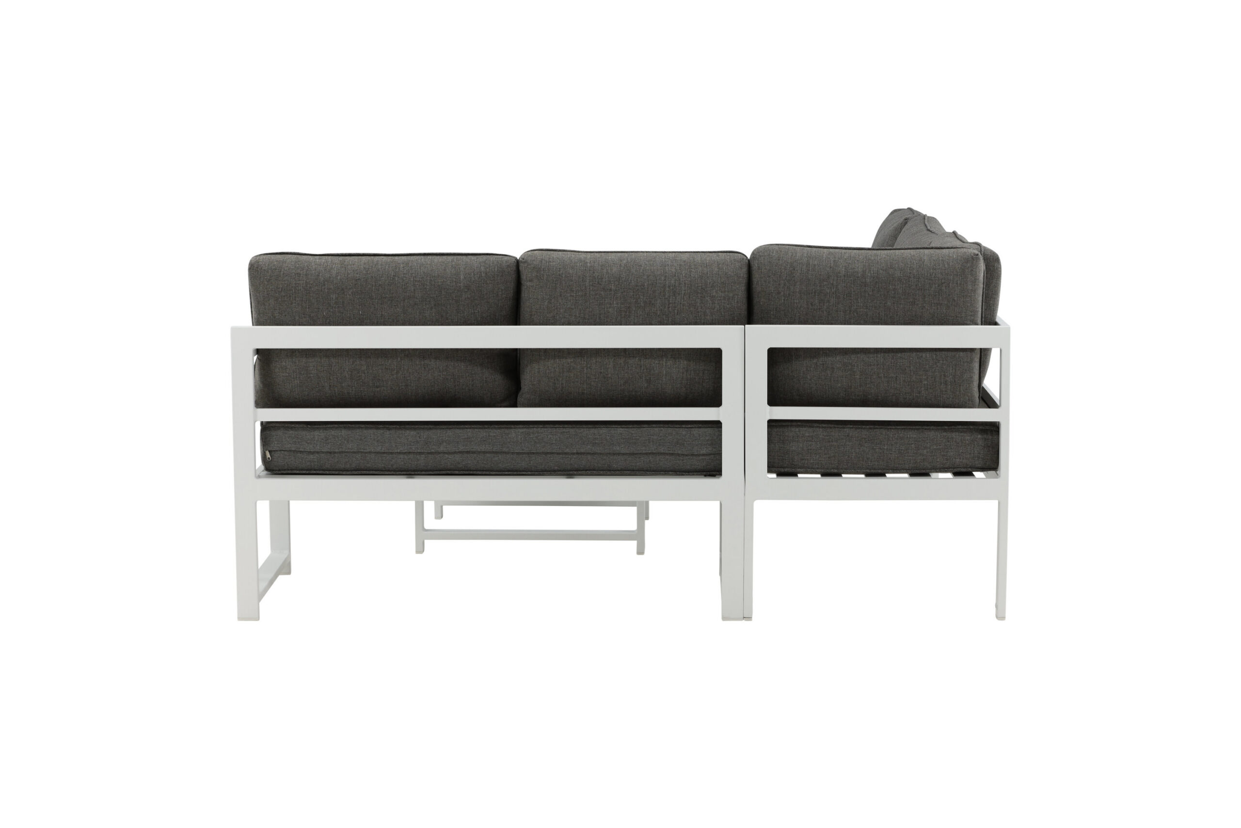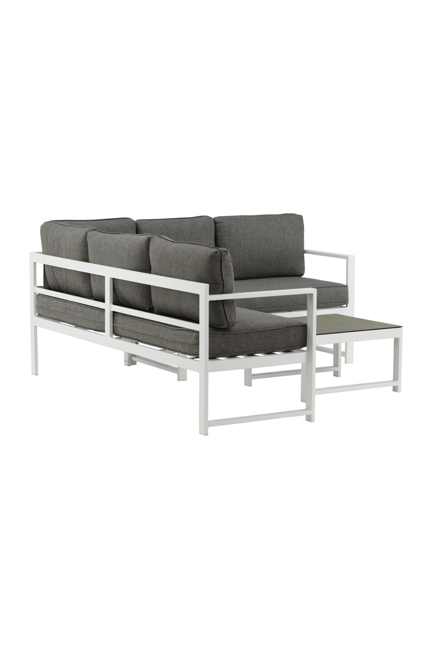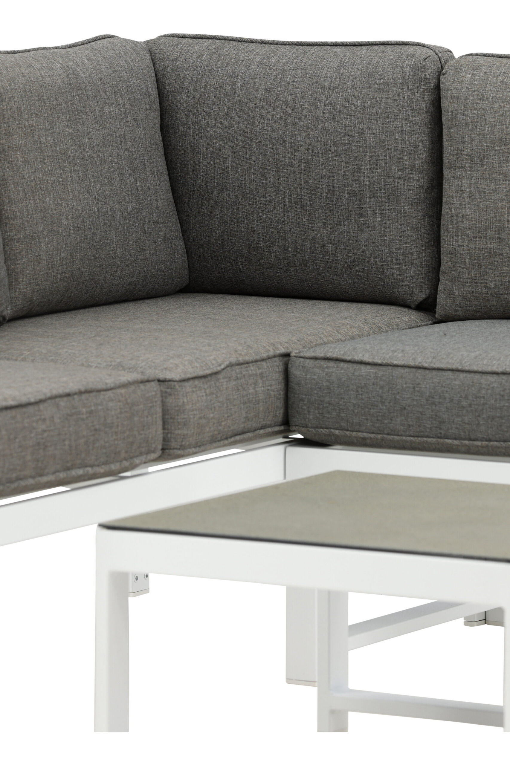 Moodne stiilne diivanigrupp koos nurgadiivaniga terrassile või rõdule. Valmistatud valge pulbervärvitud metallraamist integreeritud käetugedega. Sealhulgas pehmed hallid padjad ja madal klaasist kohvilaud kuusekõnega. Vajalik on kergem montaaž.