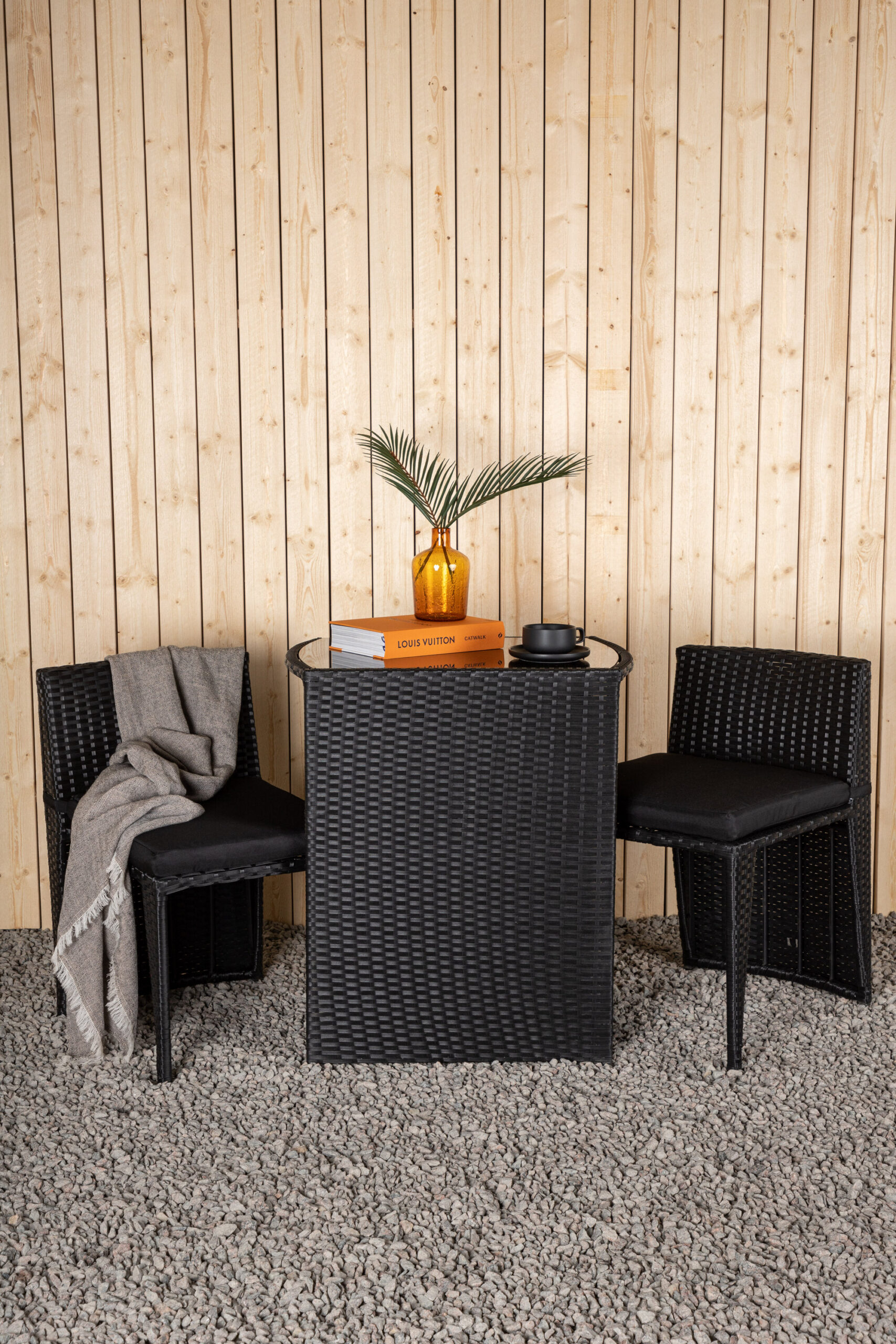 Kauni disainiga hubane must kohvikukomplekt, mis on valmistatud vastupidavast kunstrotangist, mis sobib ideaalselt väiksemale terrassile. Kohvikukomplekt koosneb kahest toolist ja lauast koos juurdekuuluva klaasplaadiga, mis seisab nii ilma kui tuule eest, korralikud toolid on varustatud pehmete istmepatjadega ning toolid saab hõlpsalt laua alla lükata, et neid oleks lihtne hoida ja ruumi kokku hoida.