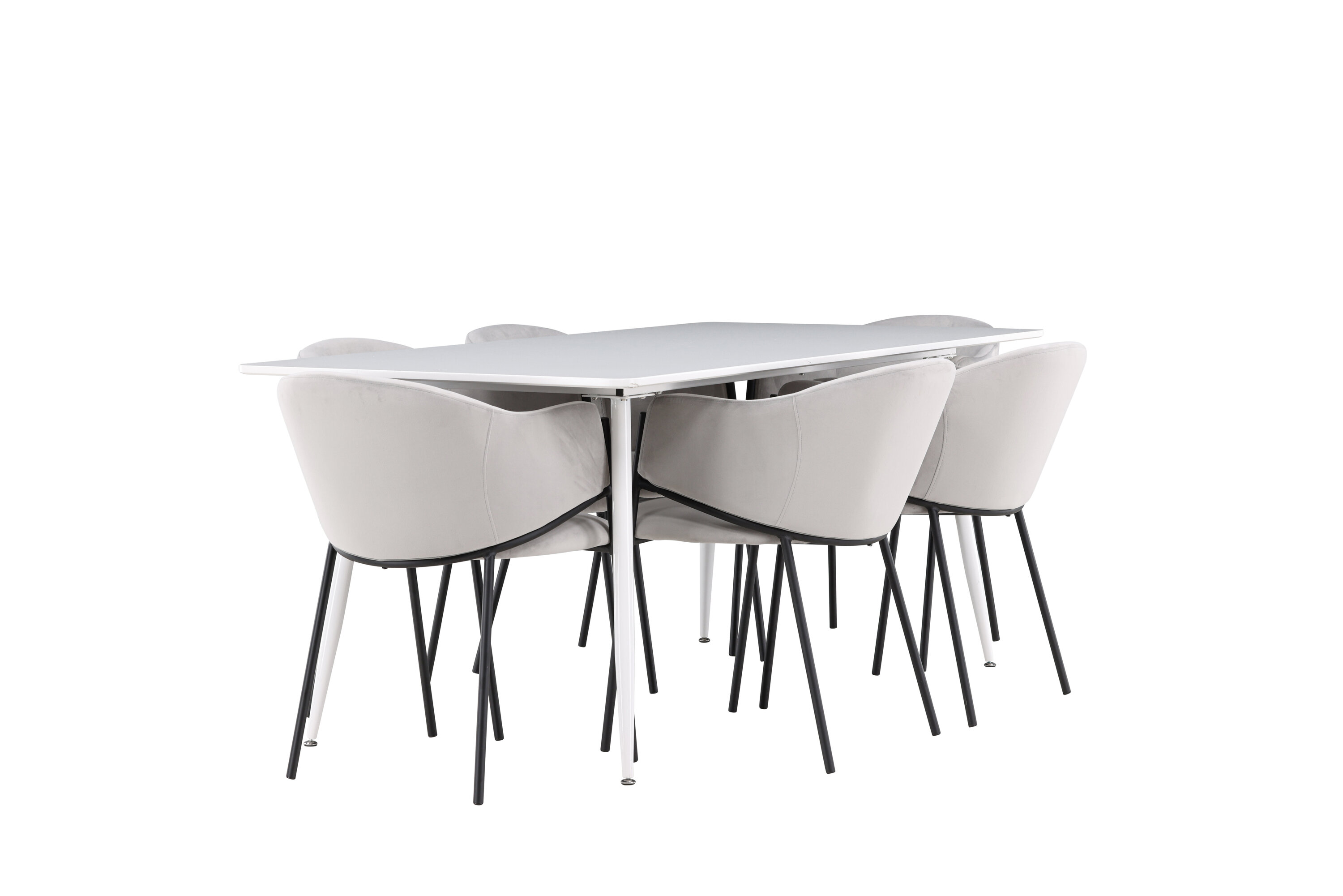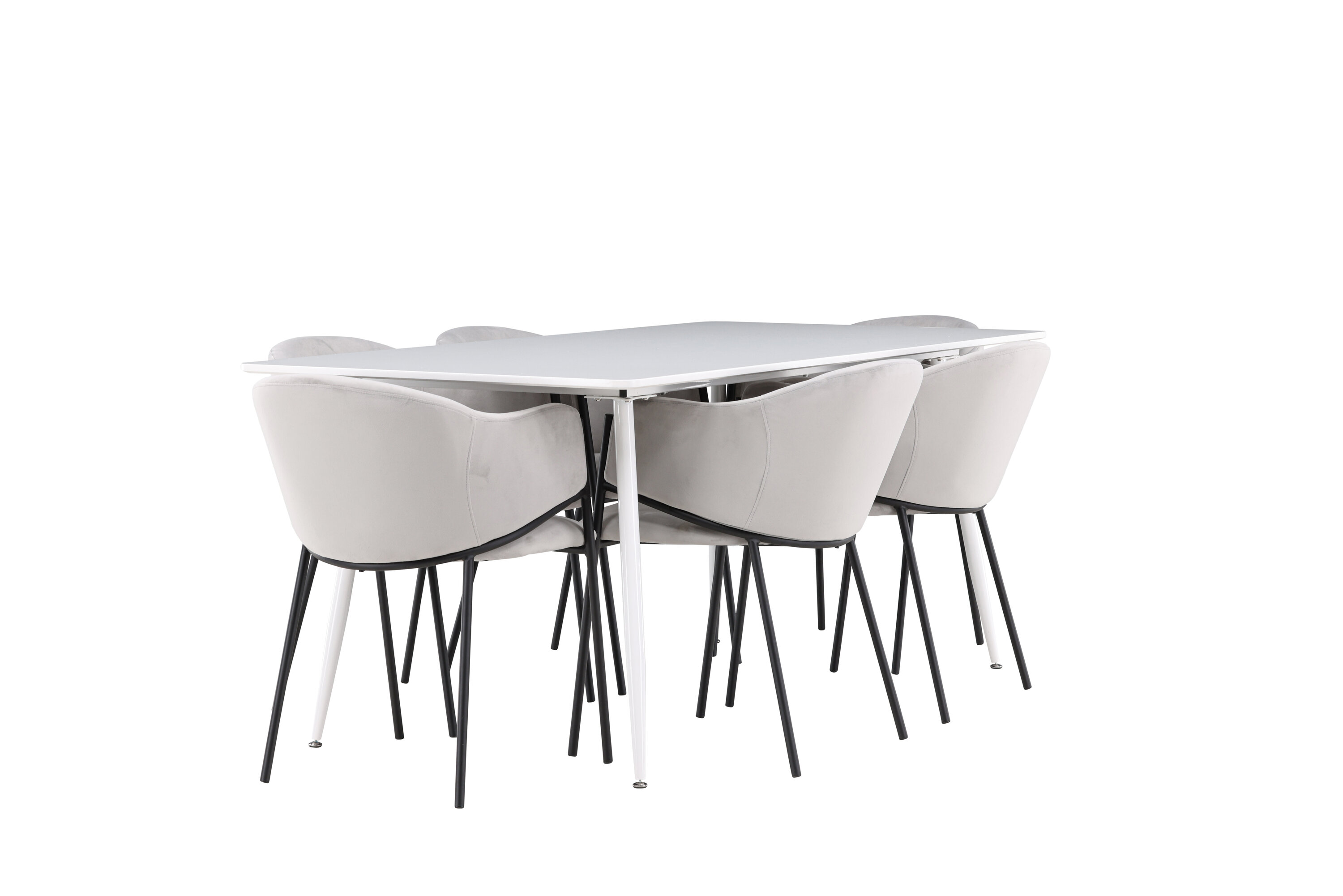 Evelina söögitool on nostalgilise ilmega, nii stiilne kui mugav ning loob teie söögilaua ümber luksusliku fookuspunkti! Toolil on täielikult polsterdatud iste, millel on helehallist sametkangast ümar seljatugi ja dekoratiivne, minimalistlik mustast terasest raam. Trendikas disain avaldab muljet ja on täiuslikult kooskõlas viimaste trendidega. Istuge mugavalt ja nautige oma sööki nendes elegantsetes söögitoolides. Avastage söögilaud Silar – elegantne ja mitmekülgne mööbliese sõpradele ja perele. Suurte mõõtmetega 180×90 cm pakub Silar palju ruumi teie lähedaste tervitamiseks. Valge laud annab ruumile kerge ja õhulise tunde, luues kutsuva õhkkonna söögikordadeks ja koosviibimisteks. Söögilaud Silar pole mitte ainult praktiline, vaid ka trendikas ning sobib suurepäraselt kaasaegsesse interjööri. Looge mälestusi ja jagage häid hetki sõprade ja perega selle söögikomplekti juures. Olenemata sellest, kas tegemist on igapäevaste einete või pidulike sündmustega, sellest söögikomplektist saab teie kodu keskne punkt, kus kogukond ja rõõm õitsevad.