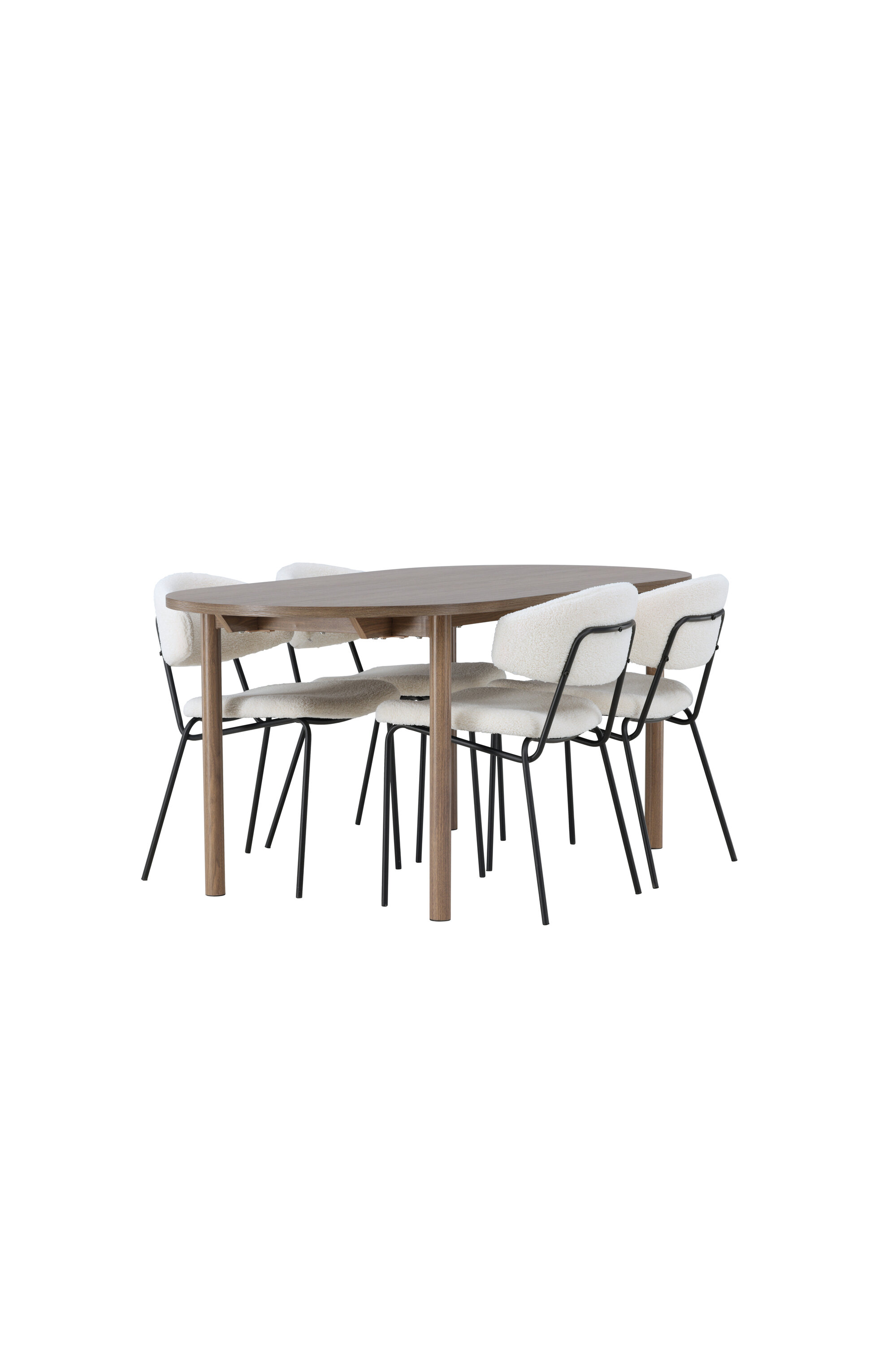 Siin oleme täiusliku harmoonia loomiseks täiendanud seda ovaalset söögilauda Chico sarja valgete toolidega. Chico toolid avaldavad muljet oma elegantse minimalismi ja ümara disainiga, mis täiustab üldist välimust. Õhuke kauni beeži värvi kangas lisab teie elutoale elegantsi.