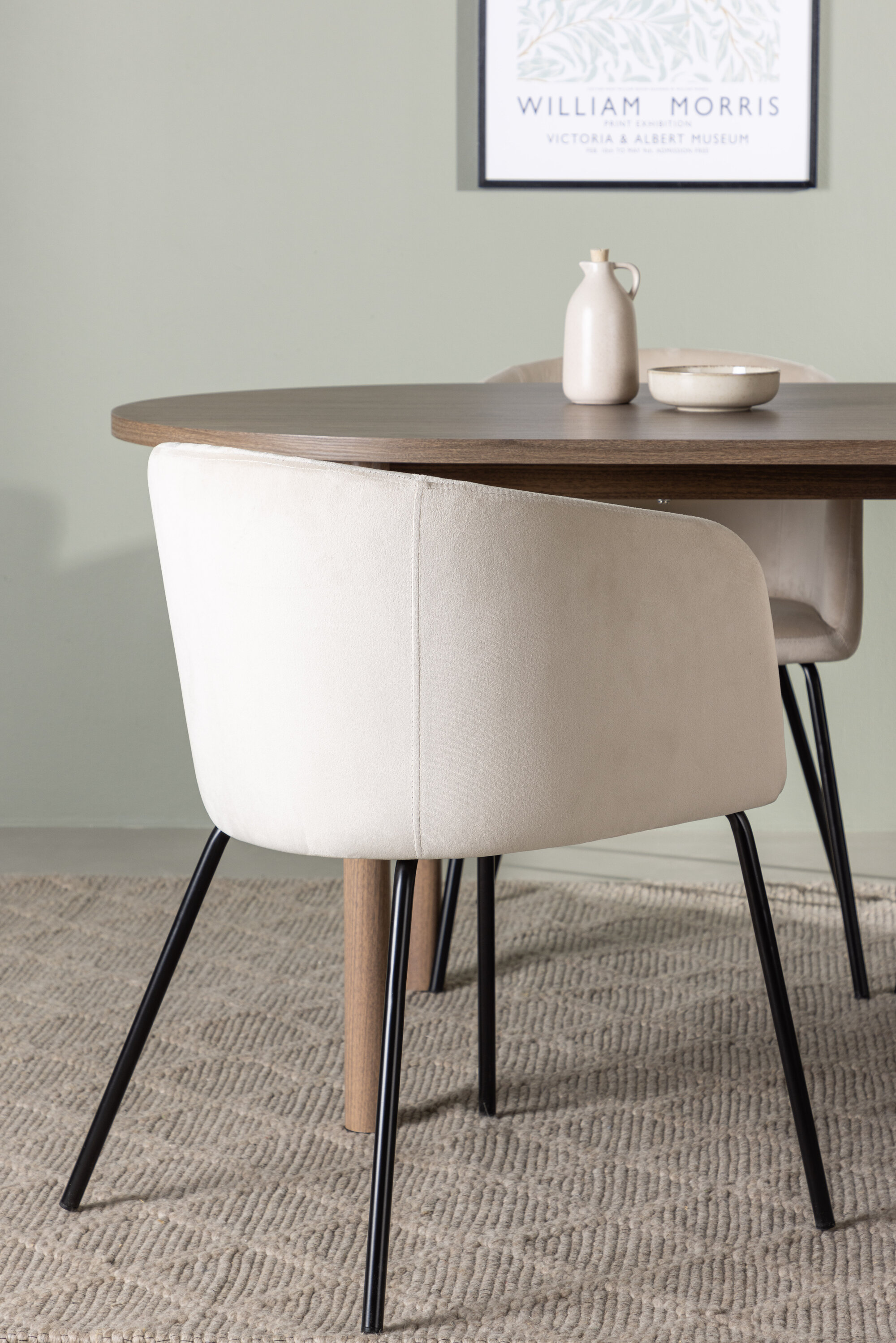 Koos tumepruuni söögilauaga on meil Beriti sarja mugavad söögitoolid. See tool on täiuslik kombinatsioon mugavusest ja elegantsusest. Sellel on täielikult polsterdatud disain, millel on sametkangast ja polüesterlinast kergelt ümar seljatugi ja iste ning õhukesed mustad rauast toolijalad lisavad üldilmele elegantse lihvi.