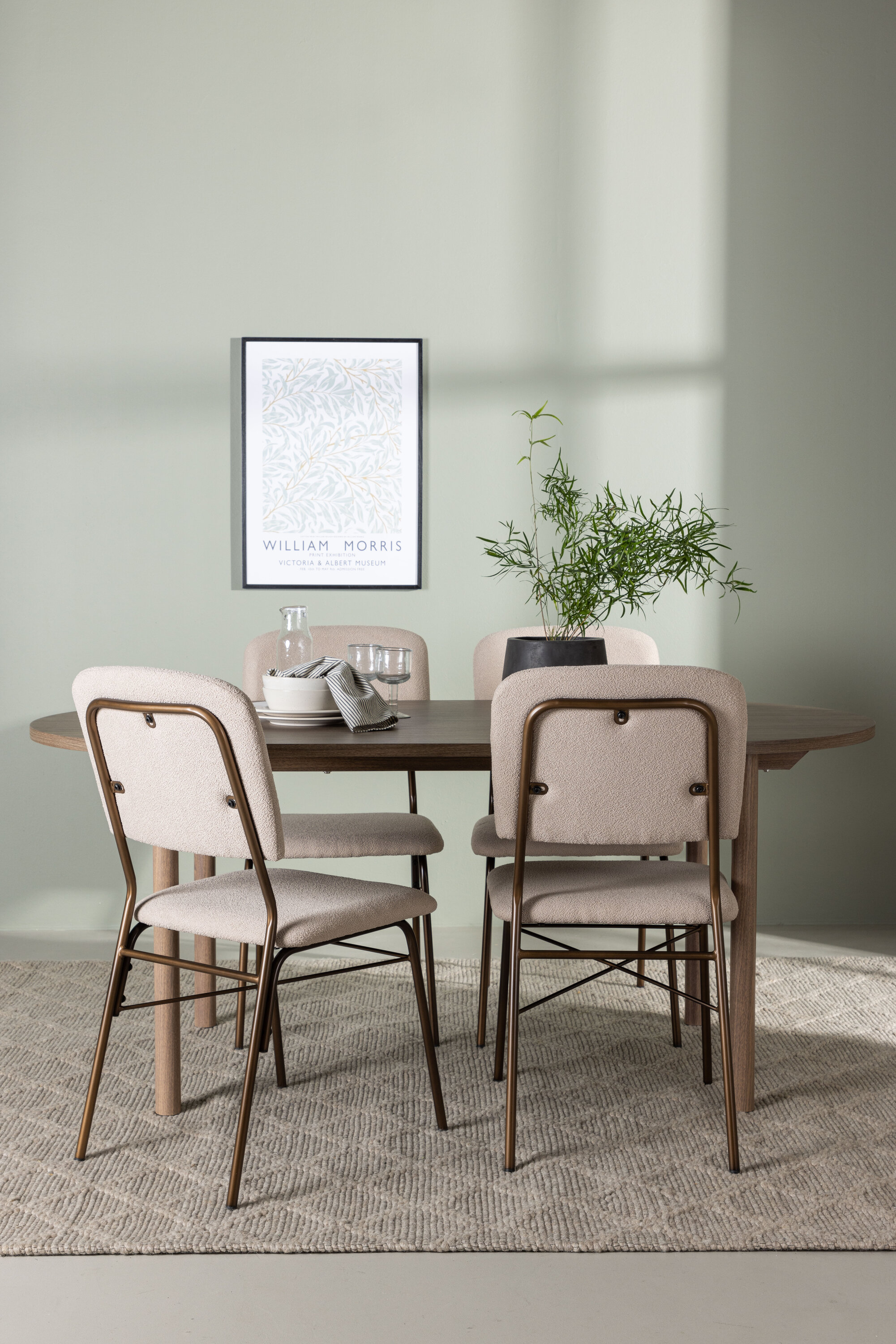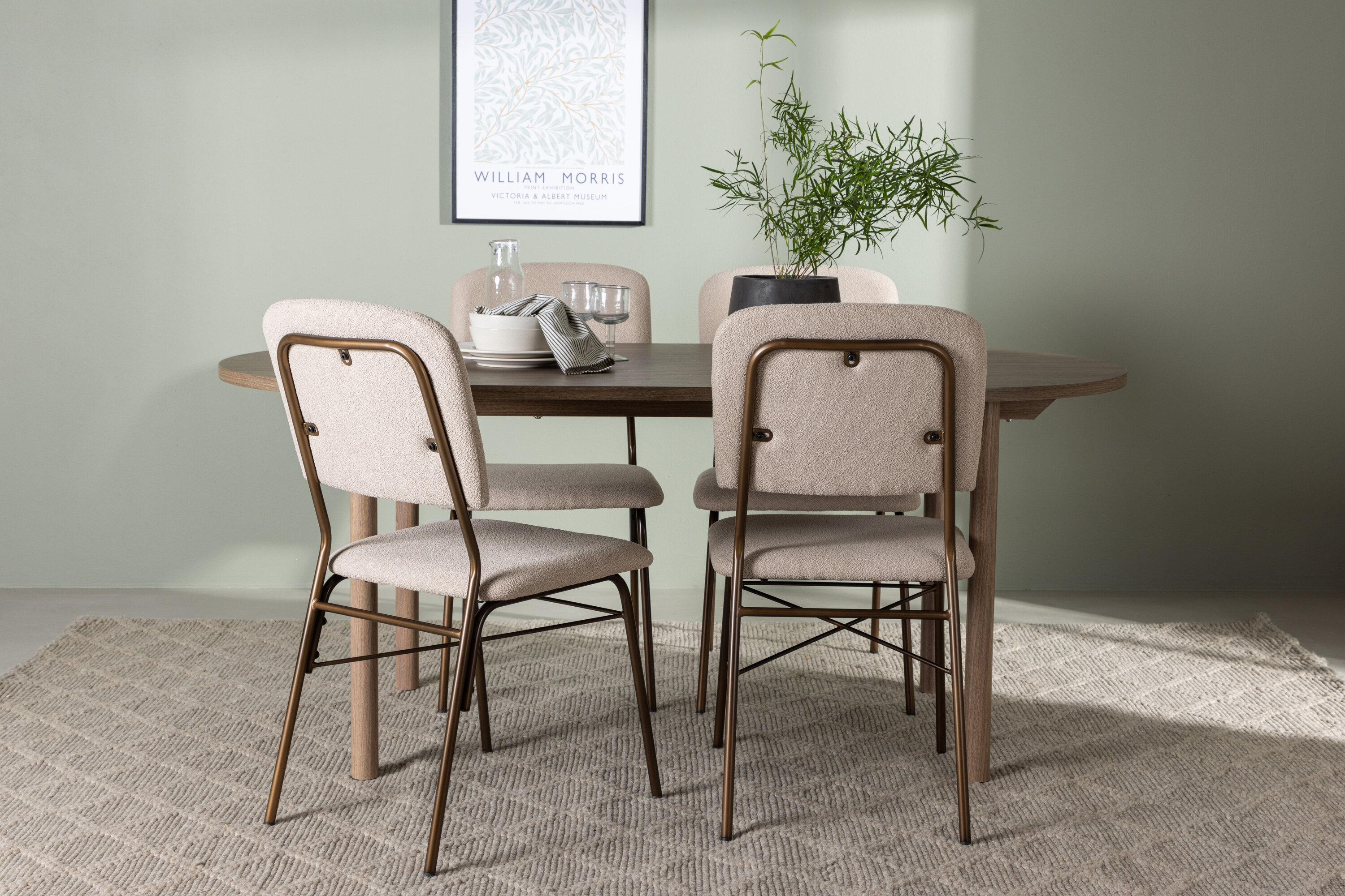 Siin oleme pruuni laua sobitanud seda sarja beežide söögitoolidega. See tool on loodud kooskõlas uusimate trendidega ning ei tee kompromisse stiili ja mugavuse vahel. Kaunis tekstuuriga beež polüesterkangas annab luksusliku tunde ja loob kutsuva atmosfääri. Tumepruunid terasest toolijalad annavad tugeva ja tugeva aluse, täiendades suurepäraselt söögilauda.
