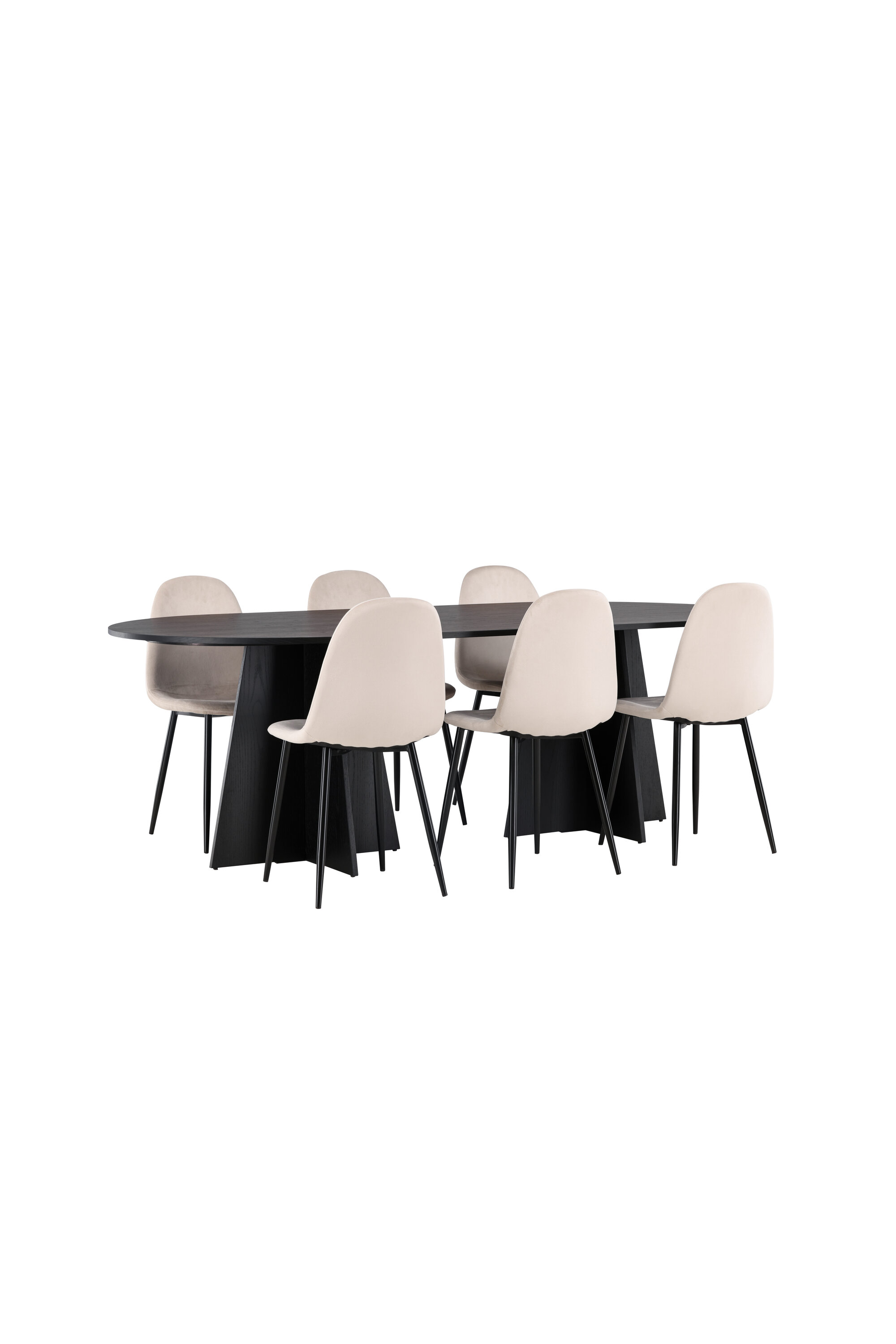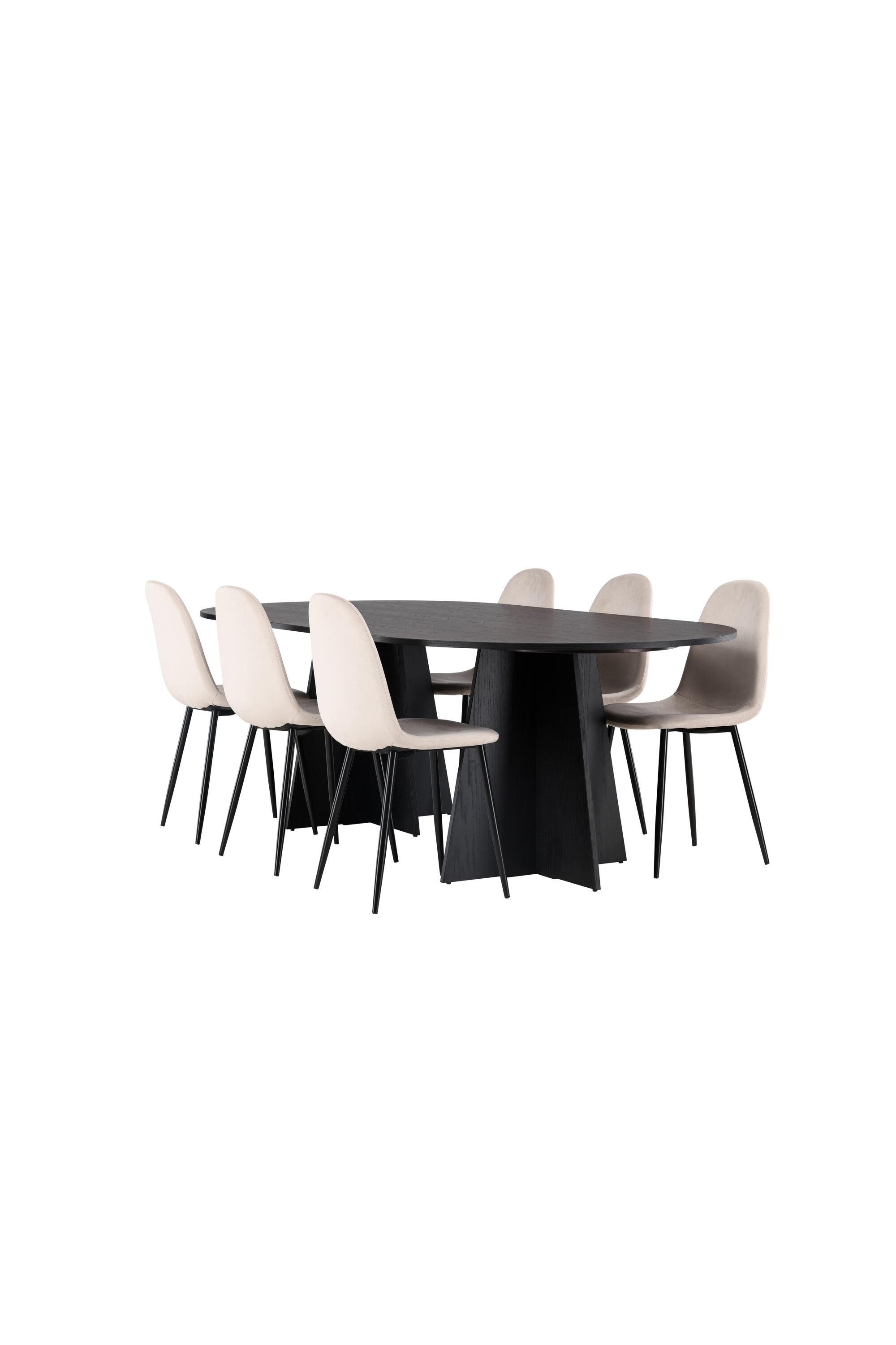 Helendav ja tahmane ühtaegu! Meie ovaalsel söögilaual Bootcut on ainulaadne disain, millel on spooniga mustast MDF-plaadist ovaalne lauaplaat ja omanäoline raam, millel on kaks avatud disainiga koonusekujulist jalga. Siin koos meie suurepäraste söögitoolidega Polar. See täielikult polsterdatud disainiga söögitool, millel on kergelt ümar seljatugi ja sametkangast iste ja musta pulbervärvitud metallist jalad, on sama mugav kui ka pilkupüüdev. Sisusta elutuba nutikalt ja ajatult! Laua mõõdud: 230x115cm.