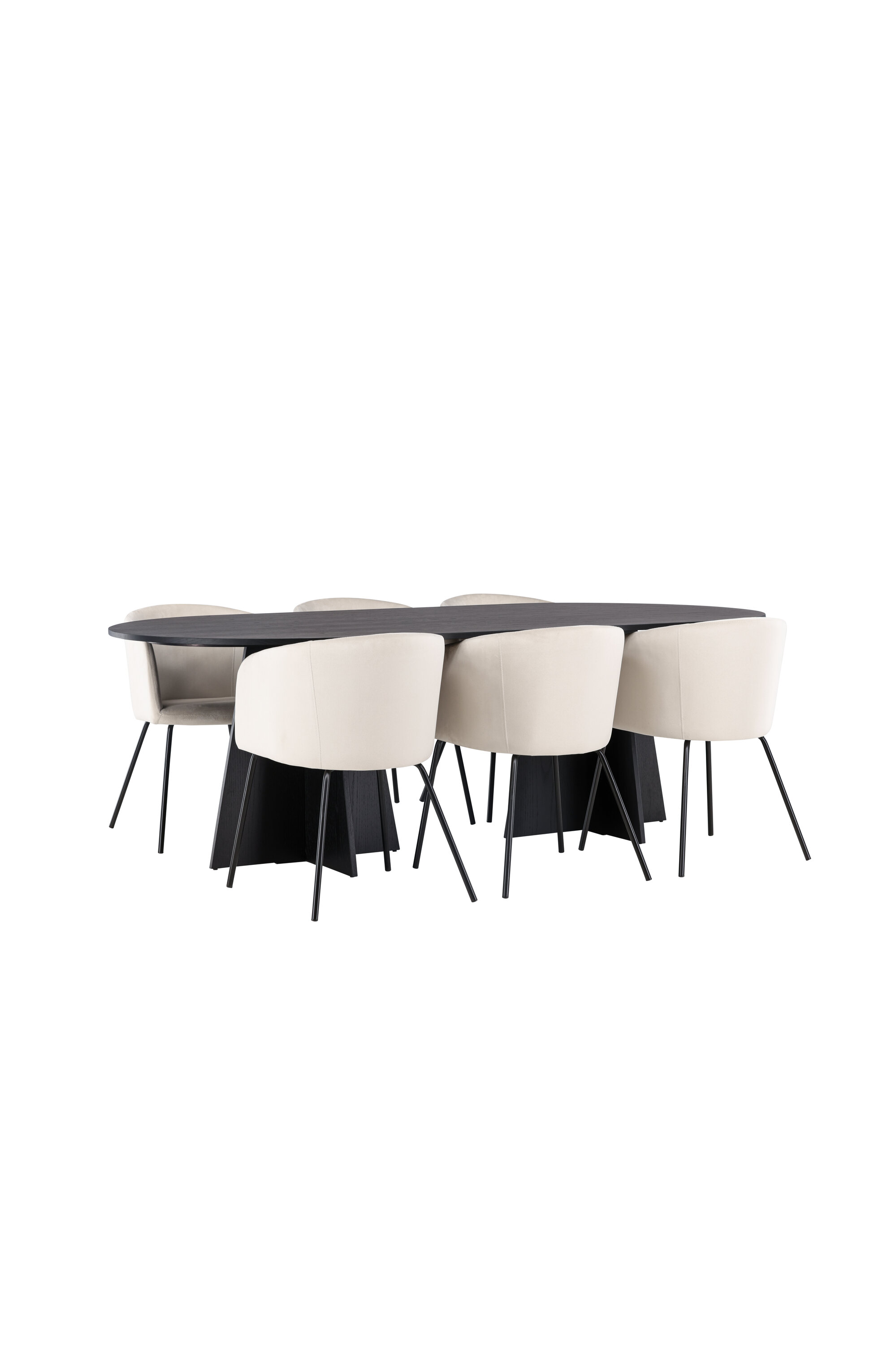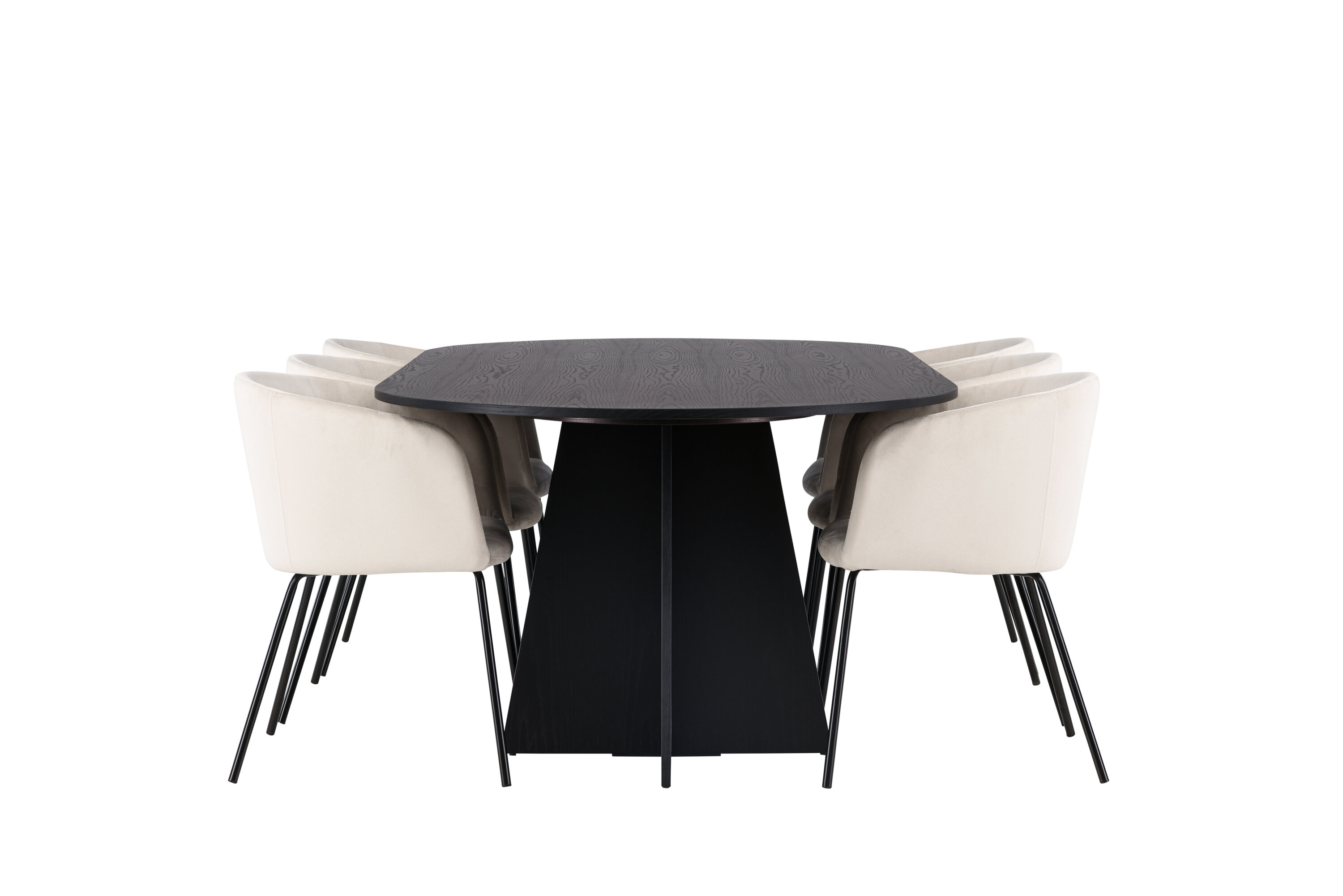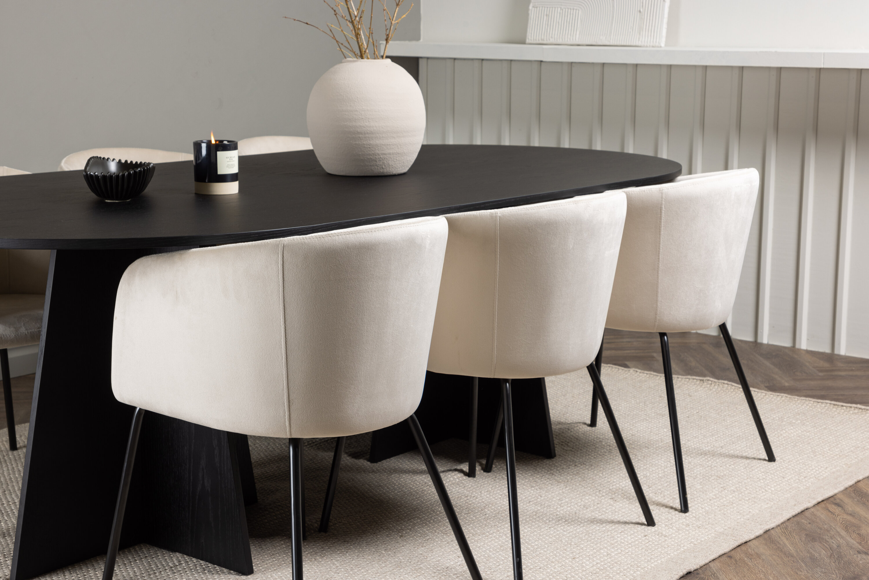 Lisage oma interjööri sära! Meie ovaalsel söögilaual Bootcut on ainulaadne disain, millel on spooniga mustast MDF-plaadist ovaalne lauaplaat ja omanäoline raam, millel on kaks avatud disainiga koonusekujulist jalga. Siin koos meie suurepäraste söögitoolidega Berit. Toolil on täielikult polsterdatud disain, mille seljatugi ja iste on sametkangast ning kitsad mustast rauast jalad. Sametine pilgupüüdja on siin kirsiks tordil! Laua mõõdud: 230x115cm.
