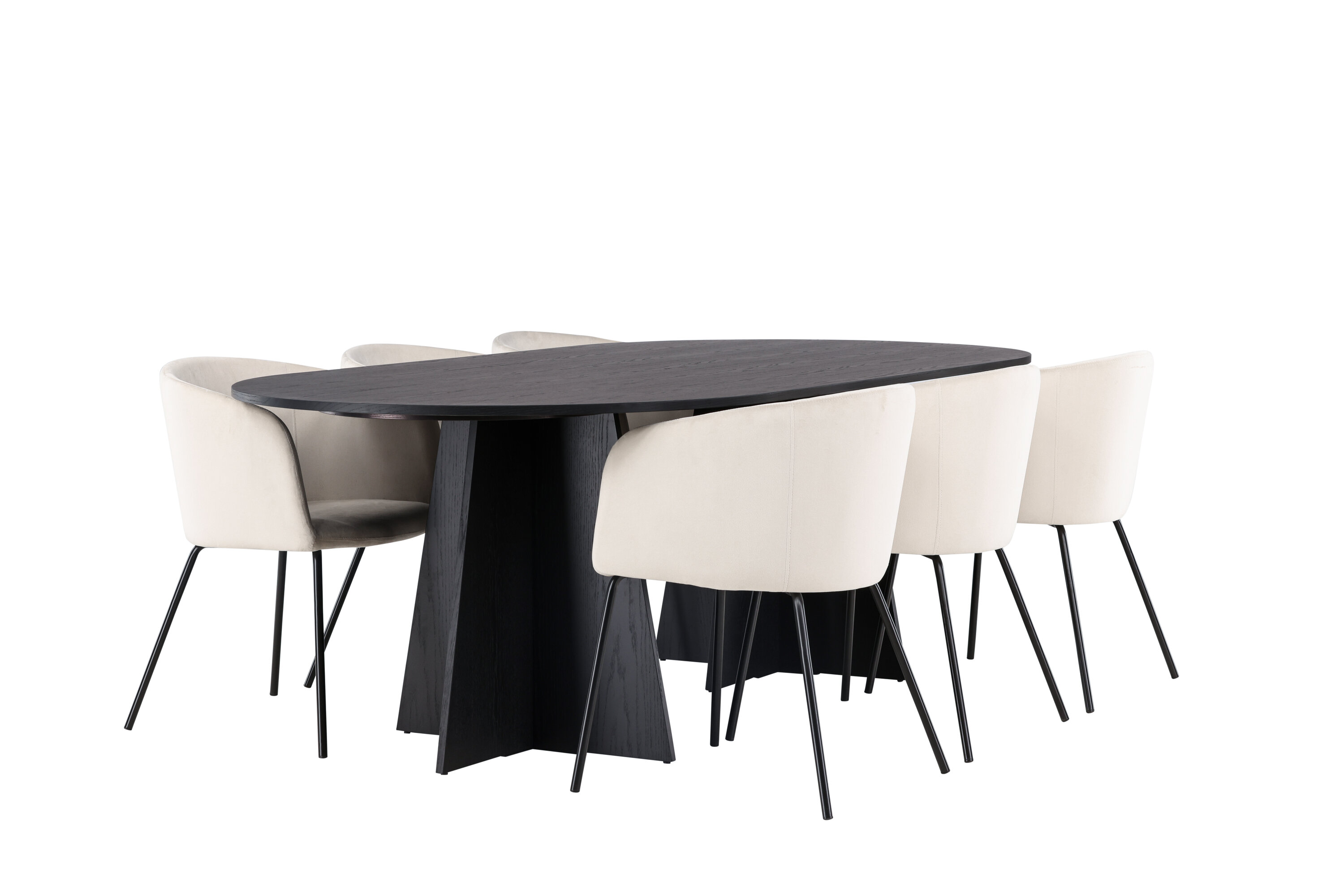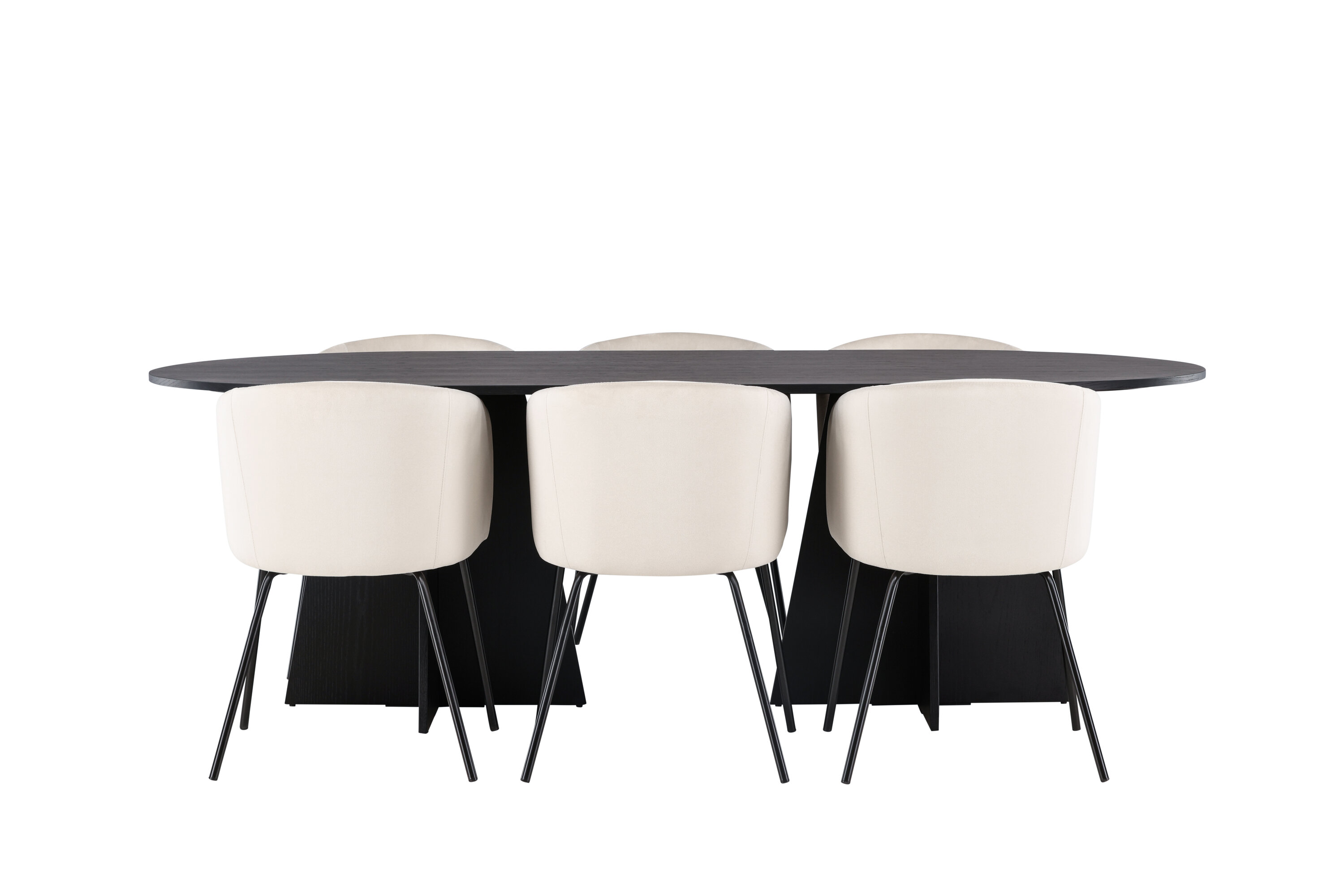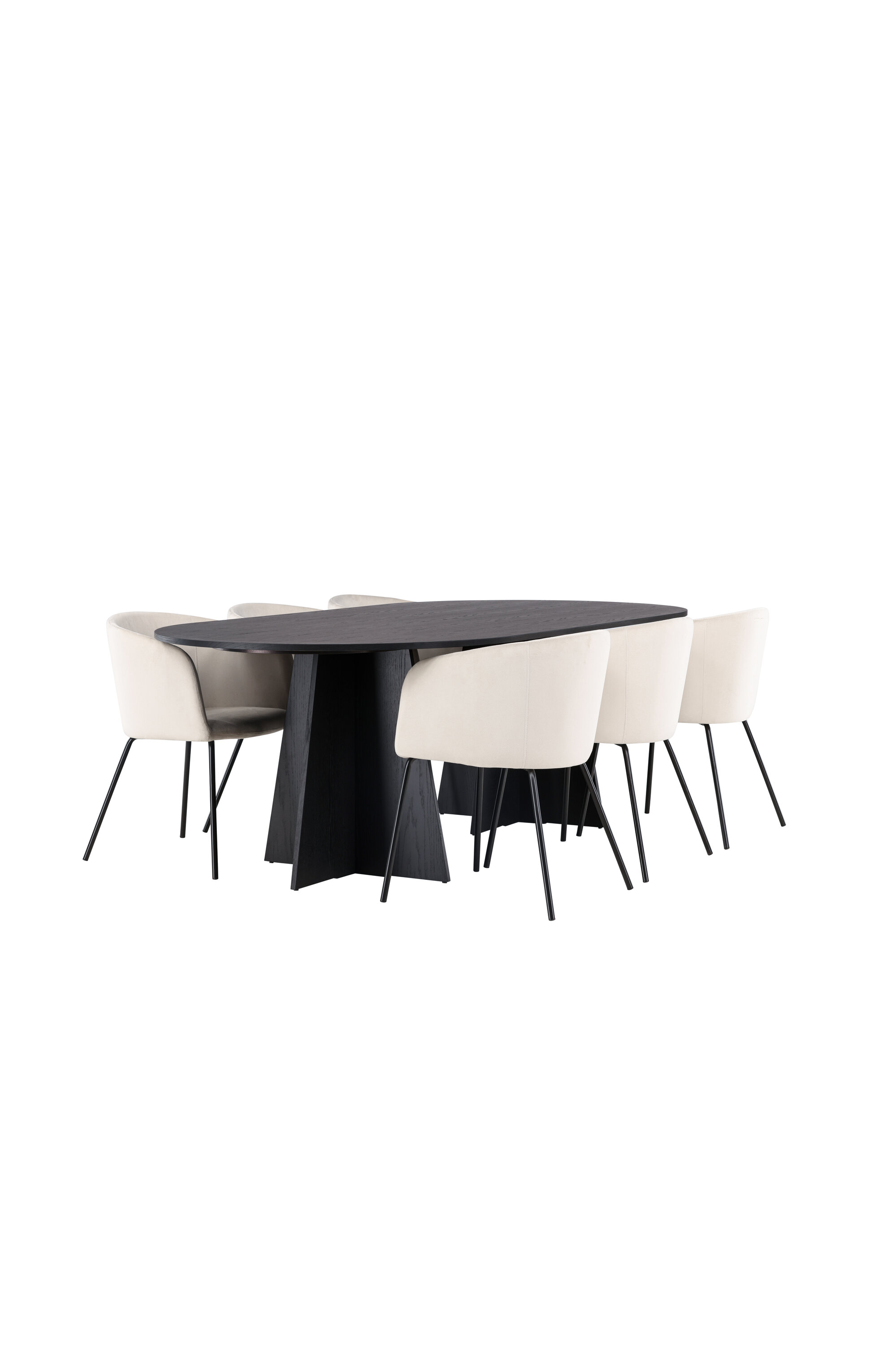 Lisage oma interjööri sära! Meie ovaalsel söögilaual Bootcut on ainulaadne disain, millel on spooniga mustast MDF-plaadist ovaalne lauaplaat ja omanäoline raam, millel on kaks avatud disainiga koonusekujulist jalga. Siin koos meie suurepäraste söögitoolidega Berit. Toolil on täielikult polsterdatud disain, mille seljatugi ja iste on sametkangast ning kitsad mustast rauast jalad. Sametine pilgupüüdja on siin kirsiks tordil! Laua mõõdud: 230x115cm.
