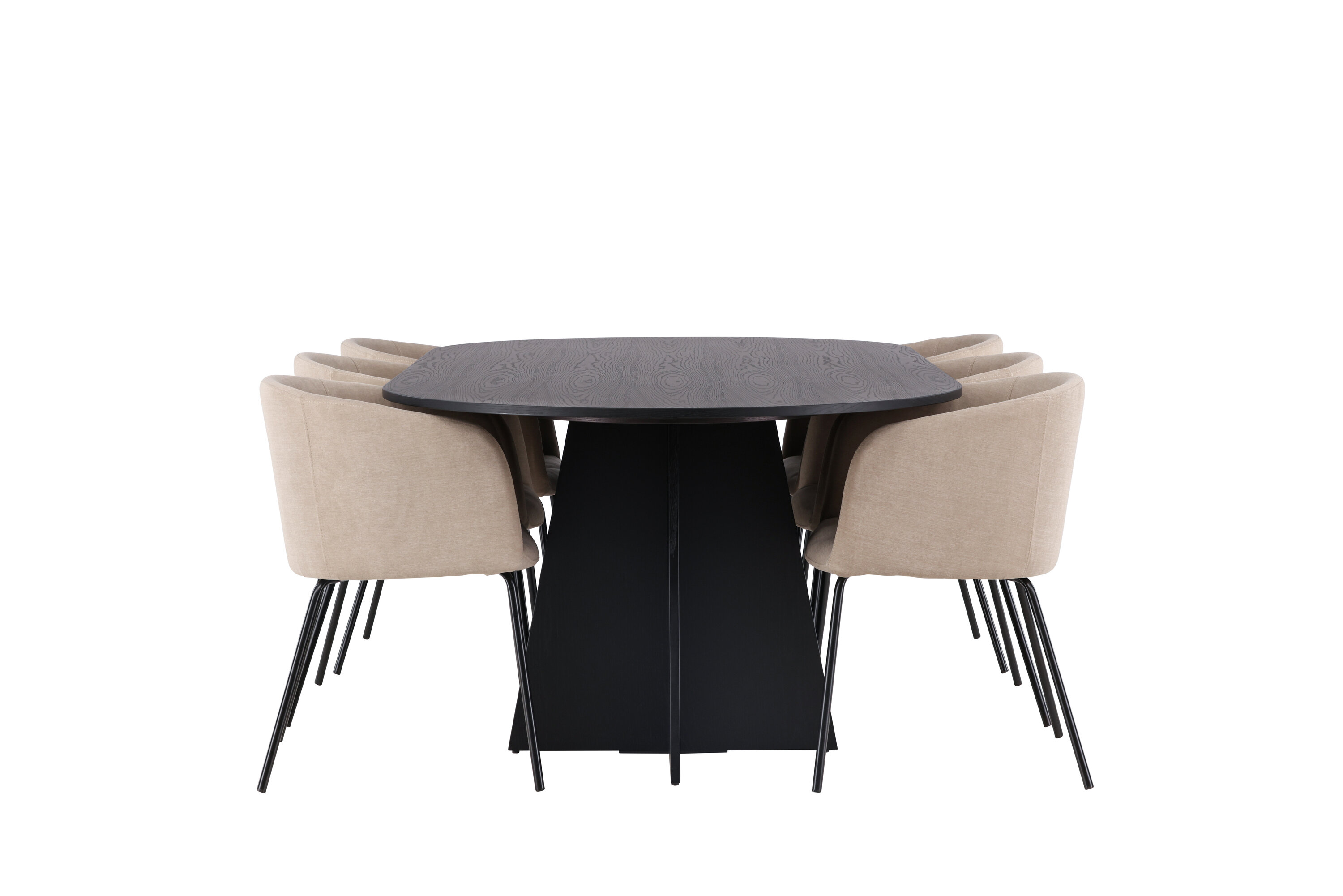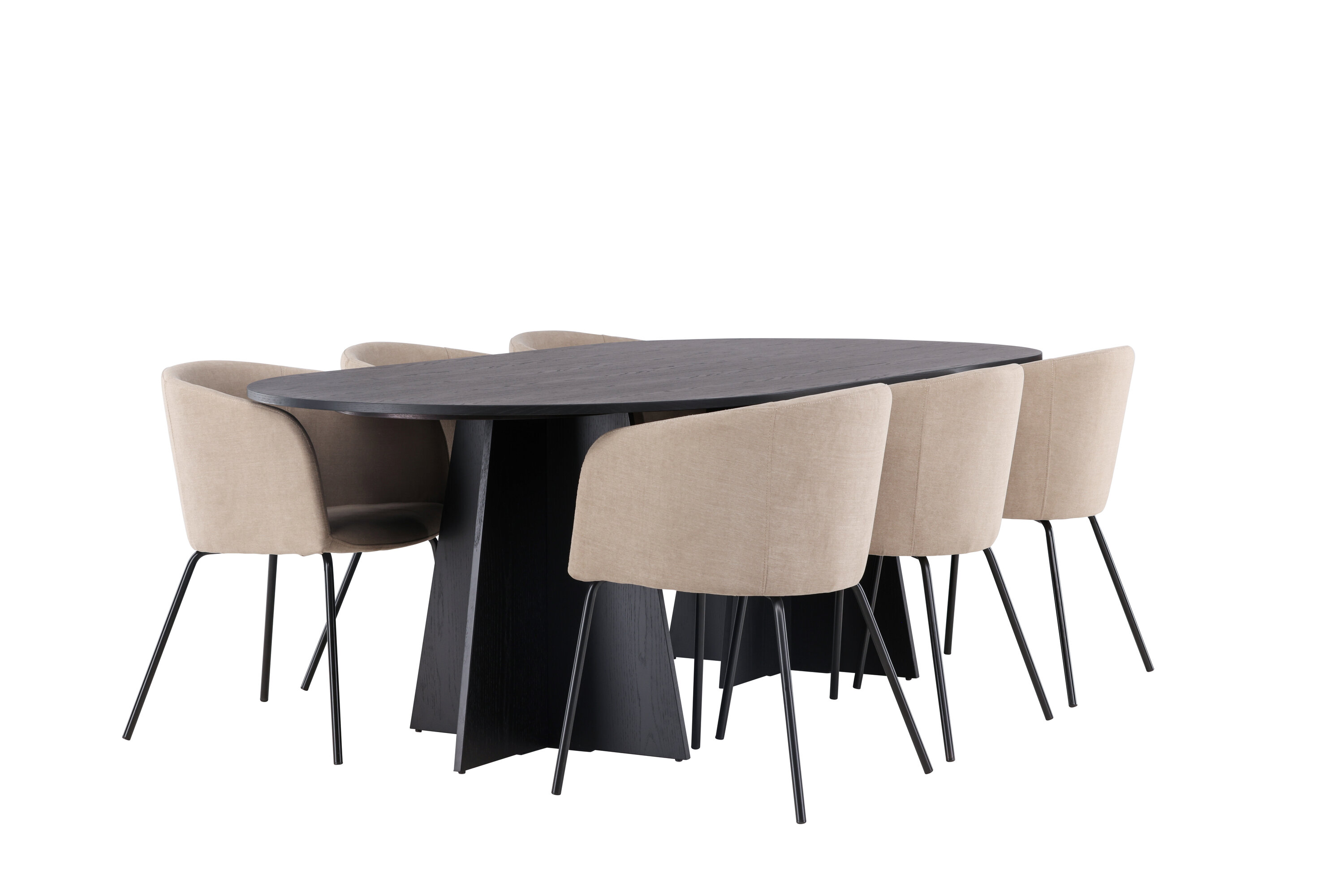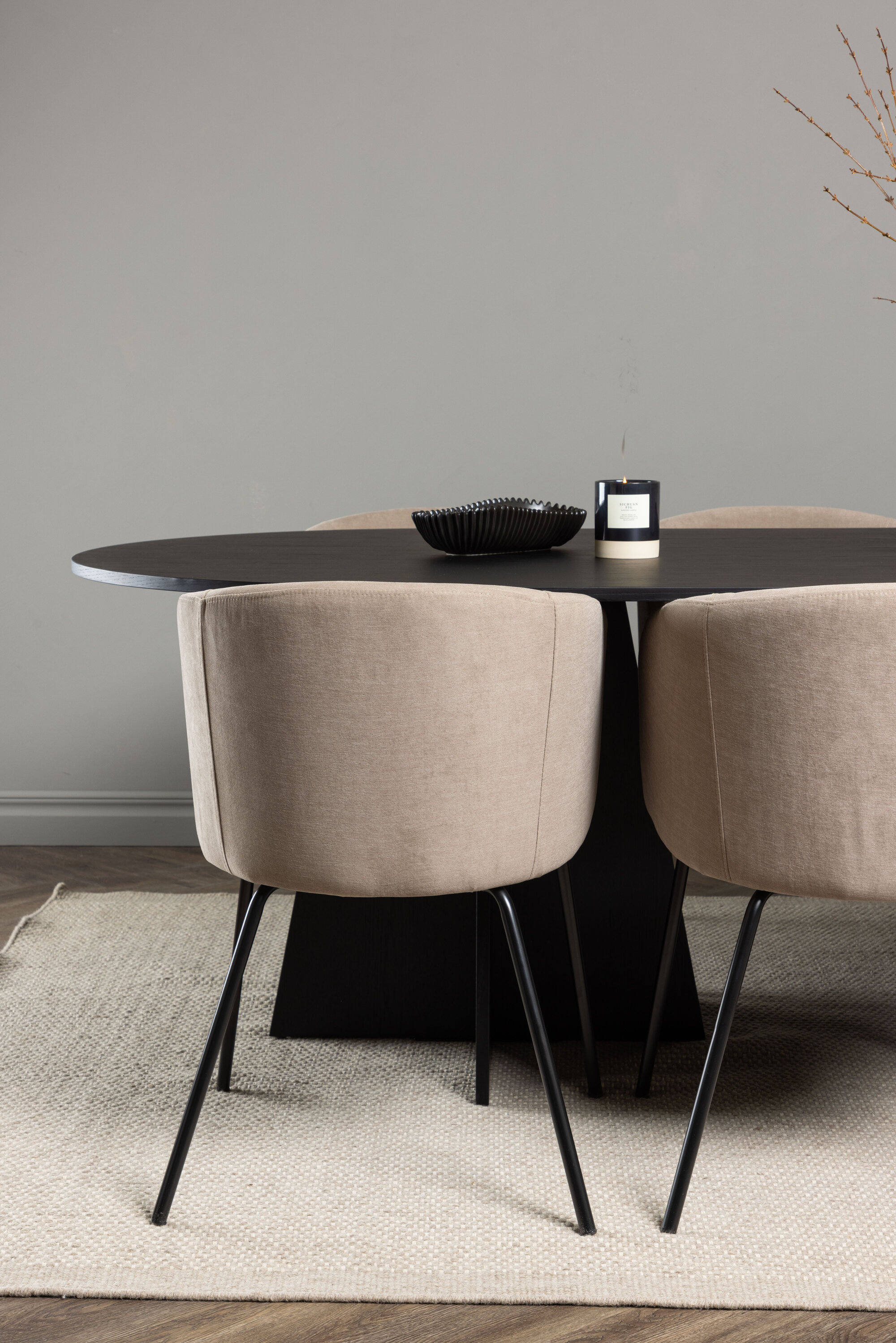Sellest paremaks ei lähe! Meie ovaalsel söögilaual Bootcut on ainulaadne disain, millel on spooniga mustast MDF-plaadist ovaalne lauaplaat ja omanäoline raam, millel on kaks avatud disainiga koonusekujulist jalga. Siin koos meie mugavate söögitoolidega Berit. Toolil on täielikult polsterdatud disain, mille seljatugi ja iste on kergelt ümardatud sametkangast ja polüesterlinasest ning kitsad mustast rauast toolijalad. Lihtsalt uskumatult kutsuv ja luksuslik söögigrupp! Laua mõõdud: 230x115cm.