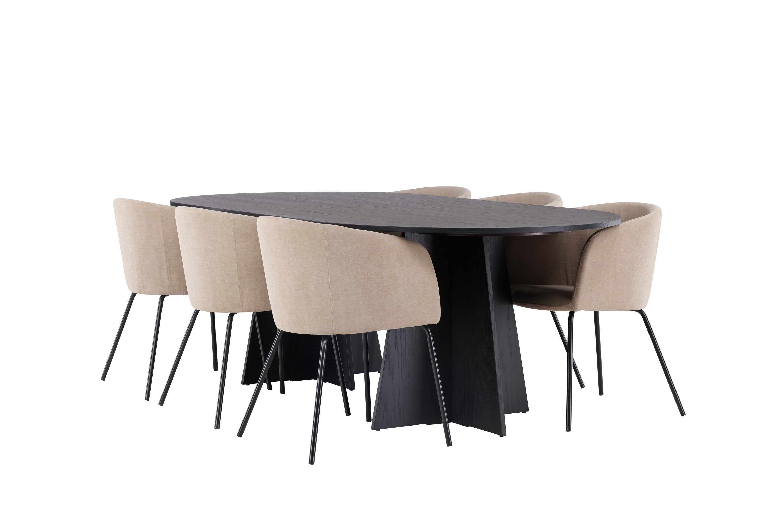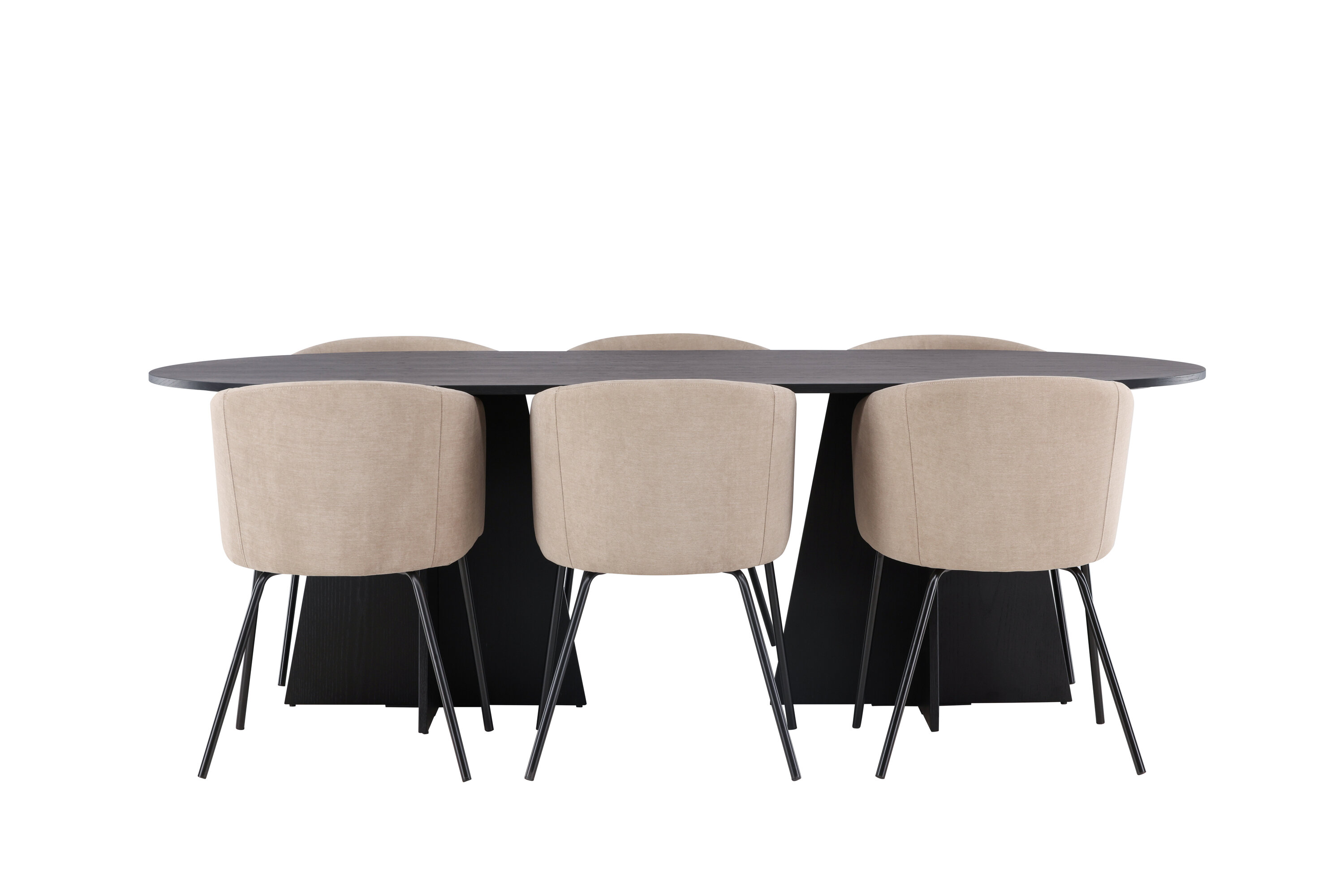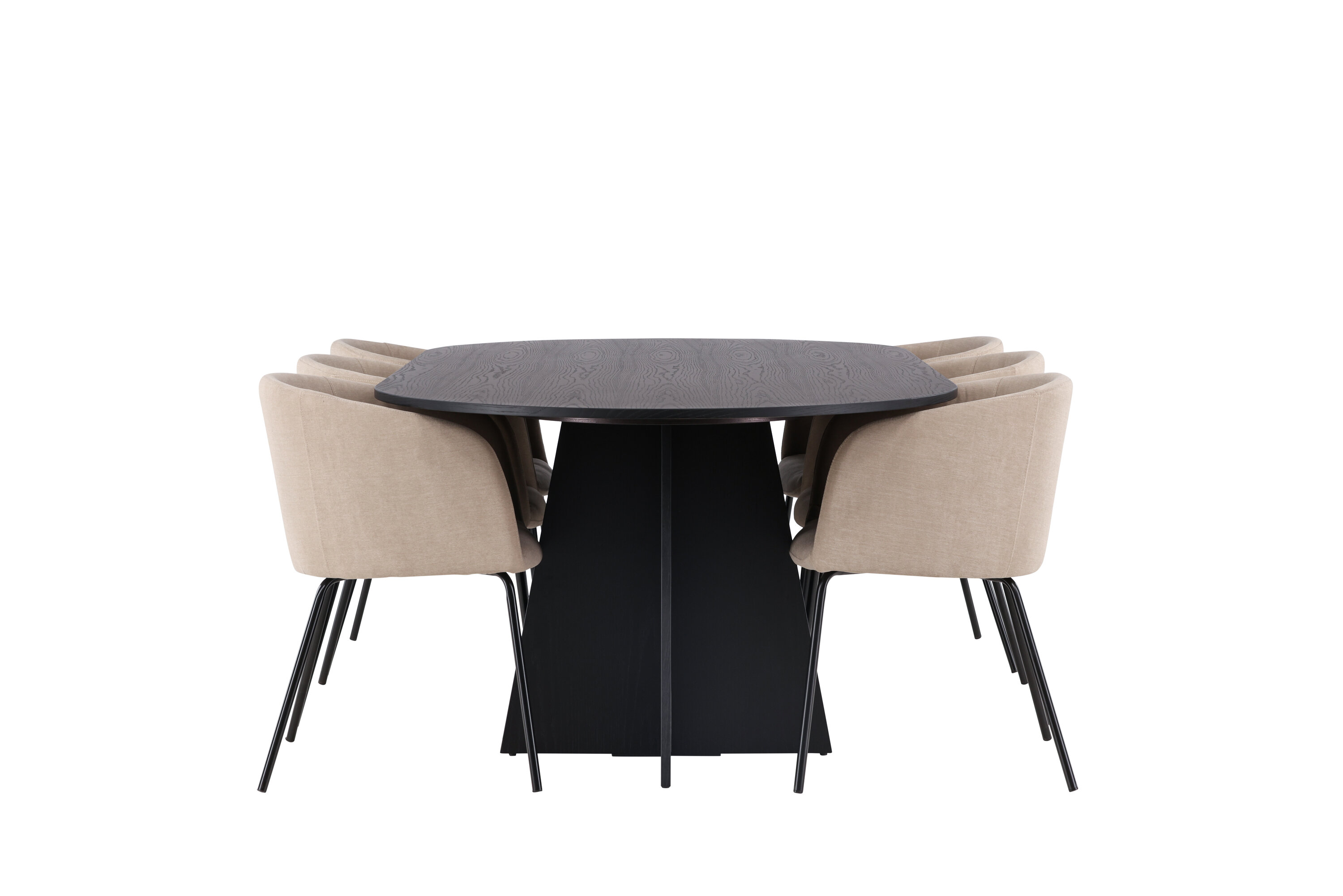 Sellest paremaks ei lähe! Meie ovaalsel söögilaual Bootcut on ainulaadne disain, millel on spooniga mustast MDF-plaadist ovaalne lauaplaat ja omanäoline raam, millel on kaks avatud disainiga koonusekujulist jalga. Siin koos meie mugavate söögitoolidega Berit. Toolil on täielikult polsterdatud disain, mille seljatugi ja iste on kergelt ümardatud sametkangast ja polüesterlinasest ning kitsad mustast rauast toolijalad. Lihtsalt uskumatult kutsuv ja luksuslik söögigrupp! Laua mõõdud: 230x115cm.
