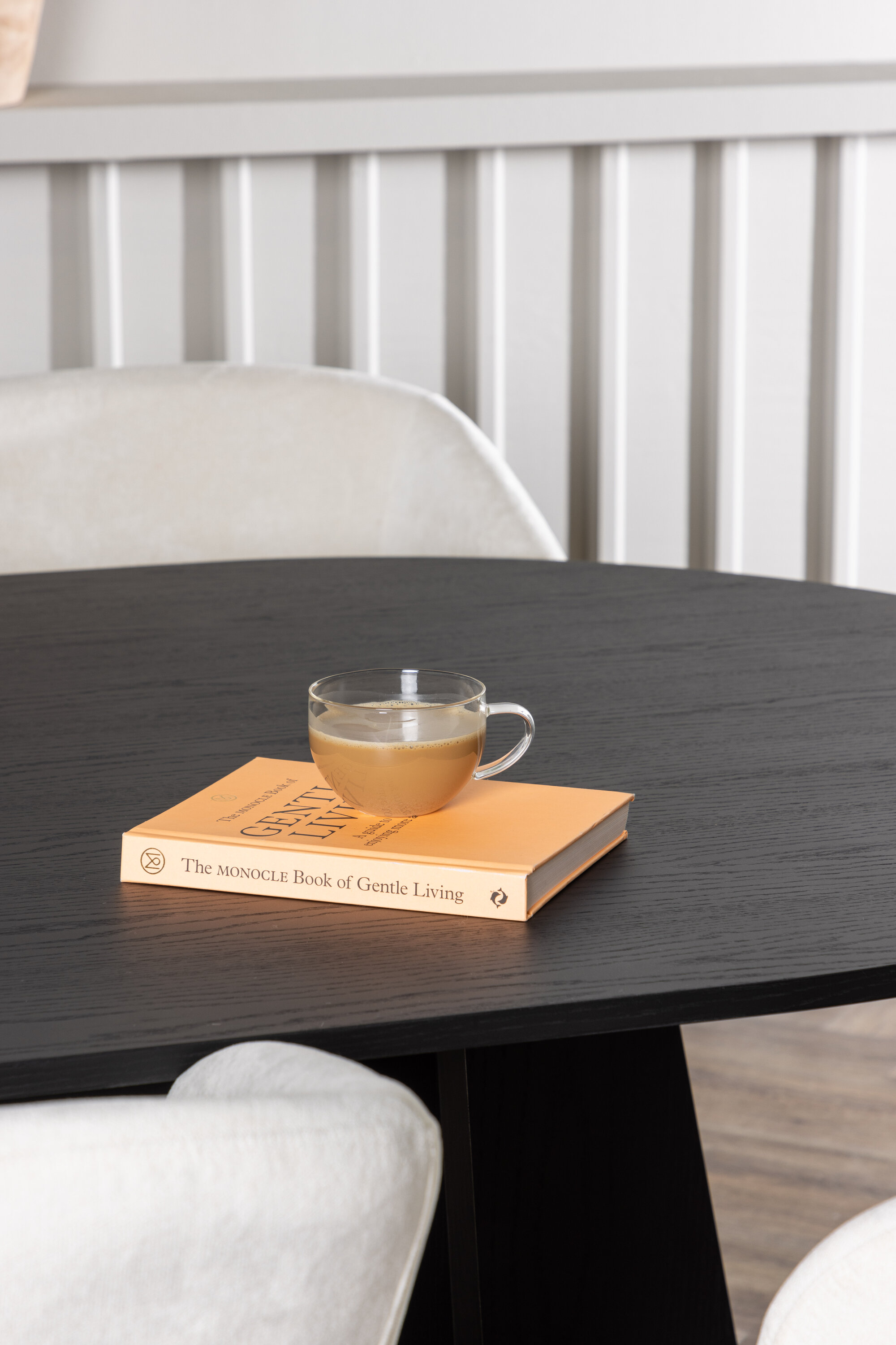 Meie ovaalsel söögilaual Bootcut on must spoonidega MDF lauaplaat, mis lisab teie interjöörile moodsat hõngu. See loob täiusliku kontrasti tugeva ja pilkupüüdva raami vastu, millel on kaks vormitud jalga. Ideaalne söögilaud nii igapäevaseks kasutamiseks kui ka pidulikeks sündmusteks. Laua mõõdud: 115x230cm.