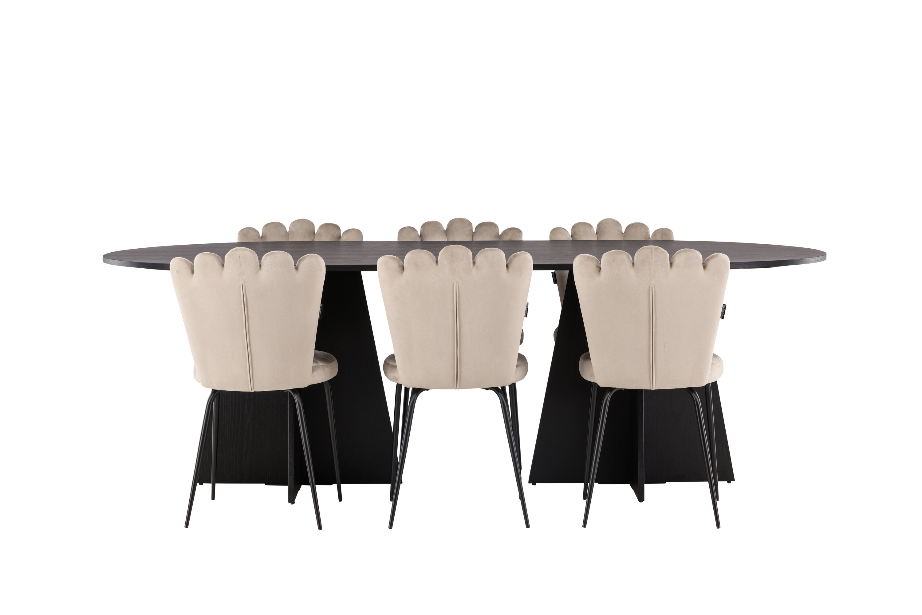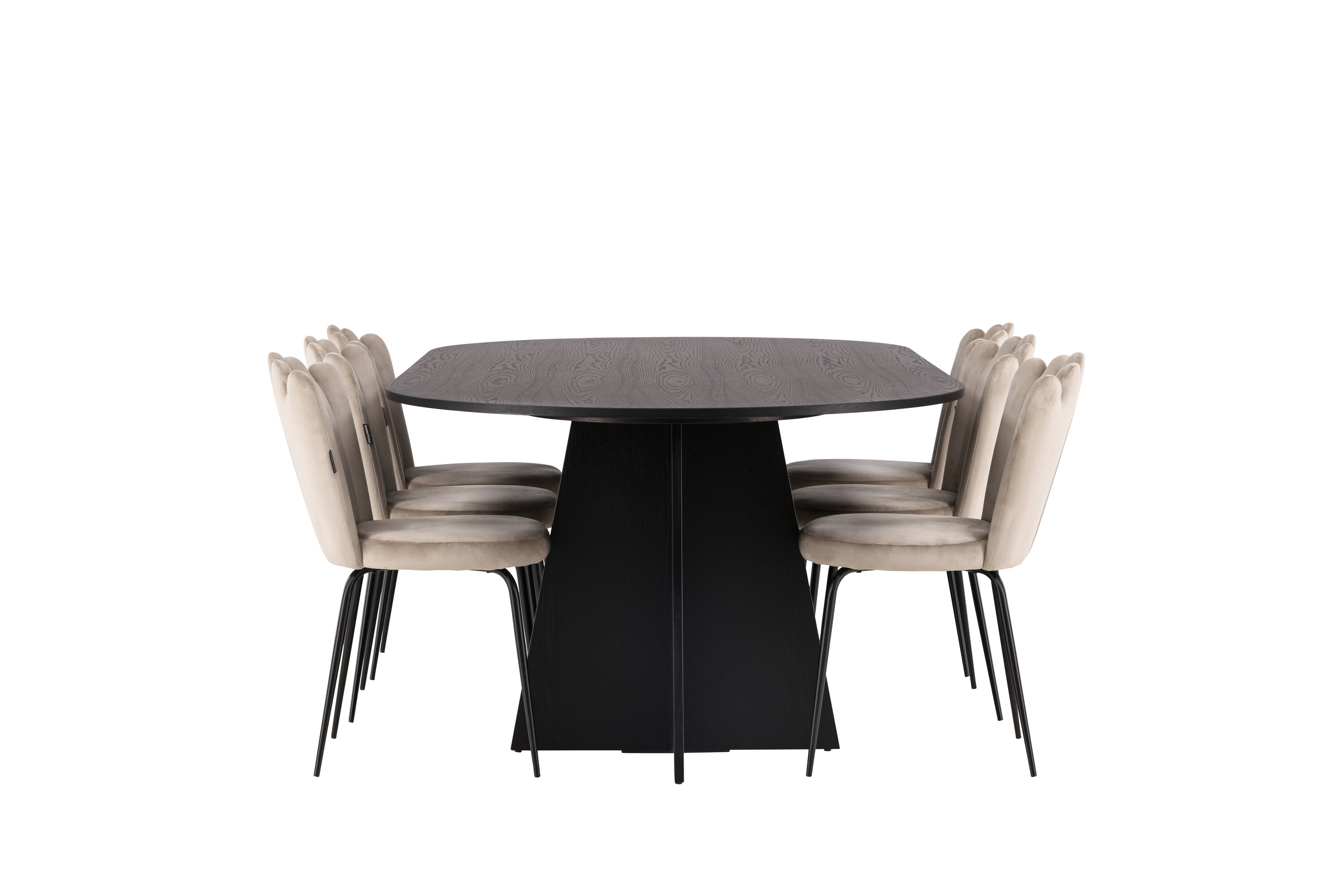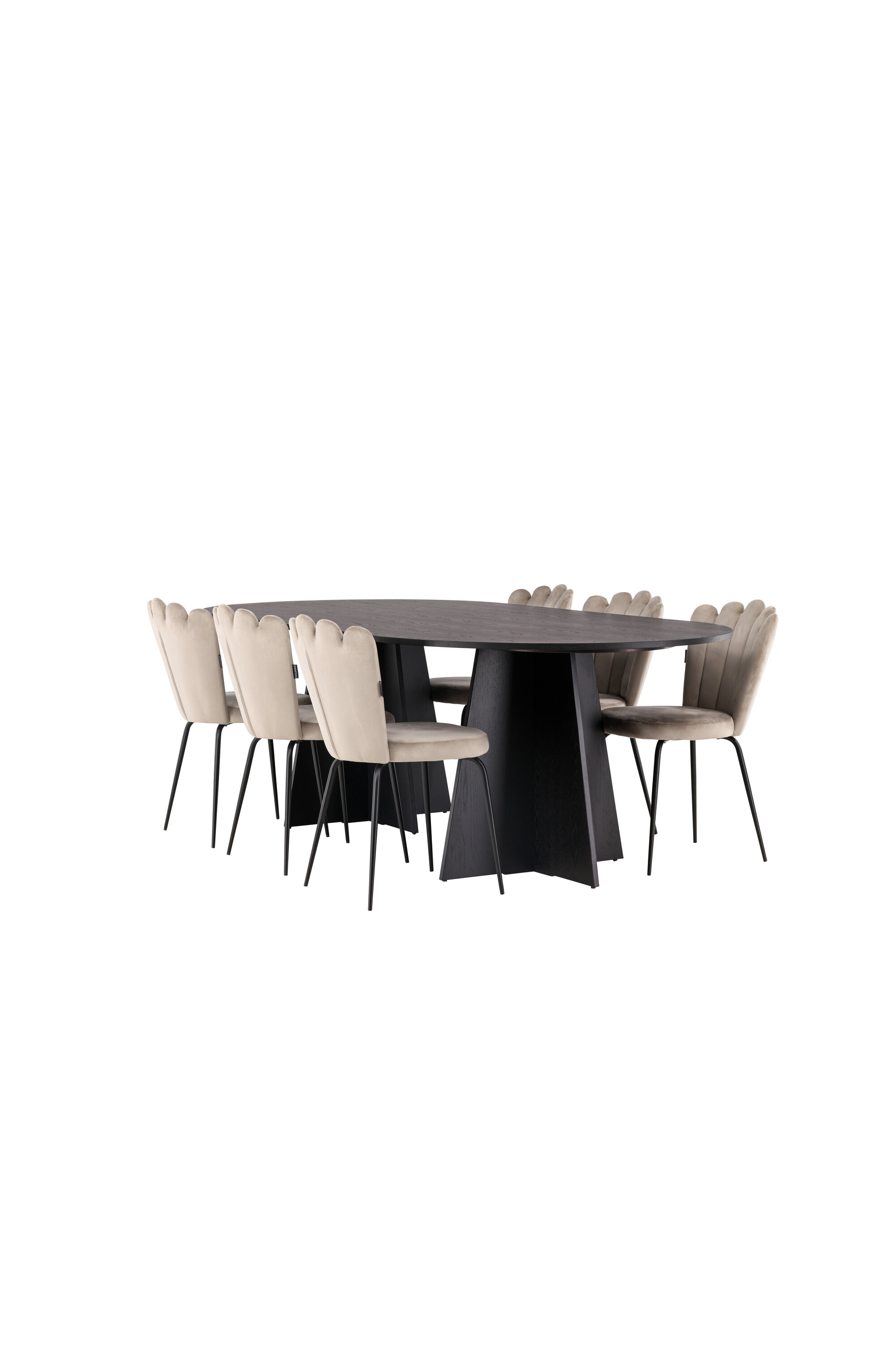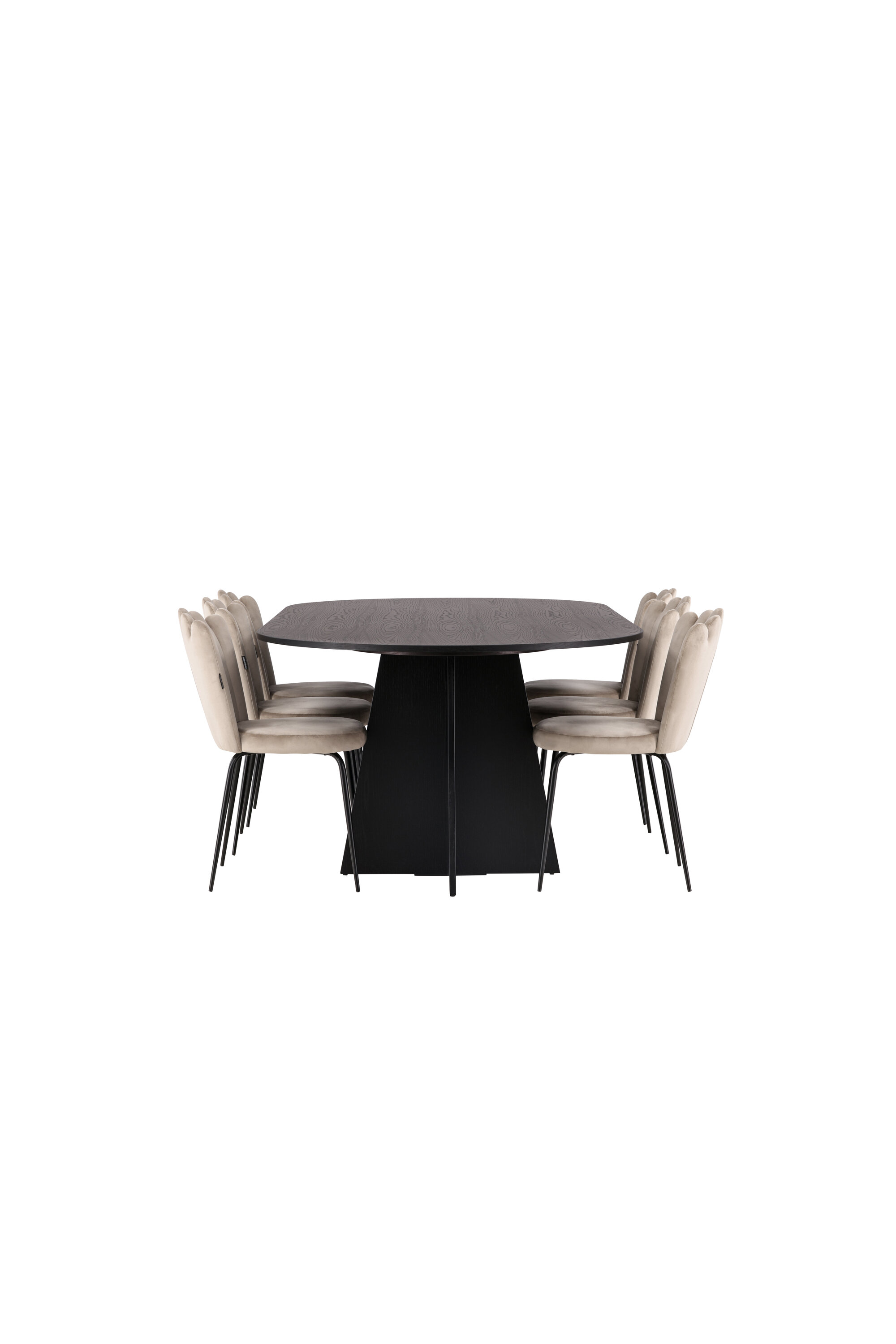 Sooja ja kutsuva tundega söögigrupp! Meie ovaalsel söögilaual Bootcut on ainulaadne disain, millel on spooniga mustast MDF-plaadist ovaalne lauaplaat ja omanäoline raam, millel on kaks avatud disainiga koonusekujulist jalga. Siin moodsas kombinatsioonis Limhamni sarja beežide söögitoolidega. Toolil on kutsuv disain dekoratiivse merekarbikujulise dekoratiivse dekoratiivse õmblusega seljatoega ja ümmargune iste, mis on valmistatud maitsekast beežist sametkangast. Jalad on musta pulbervärvitud metallist. Istuge edaspidi mugavalt ja kaasaegselt! Laua mõõdud: 230x115cm.