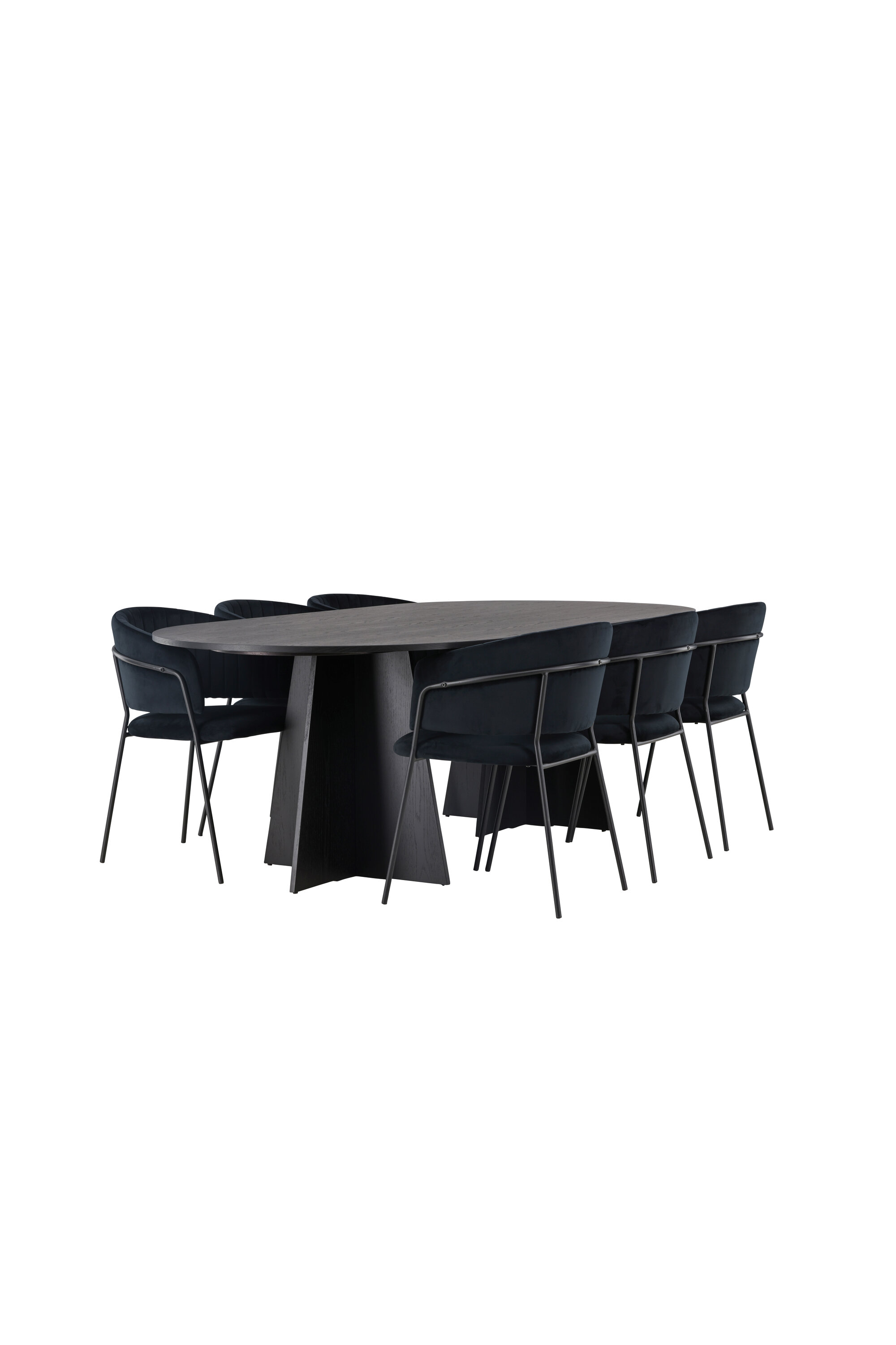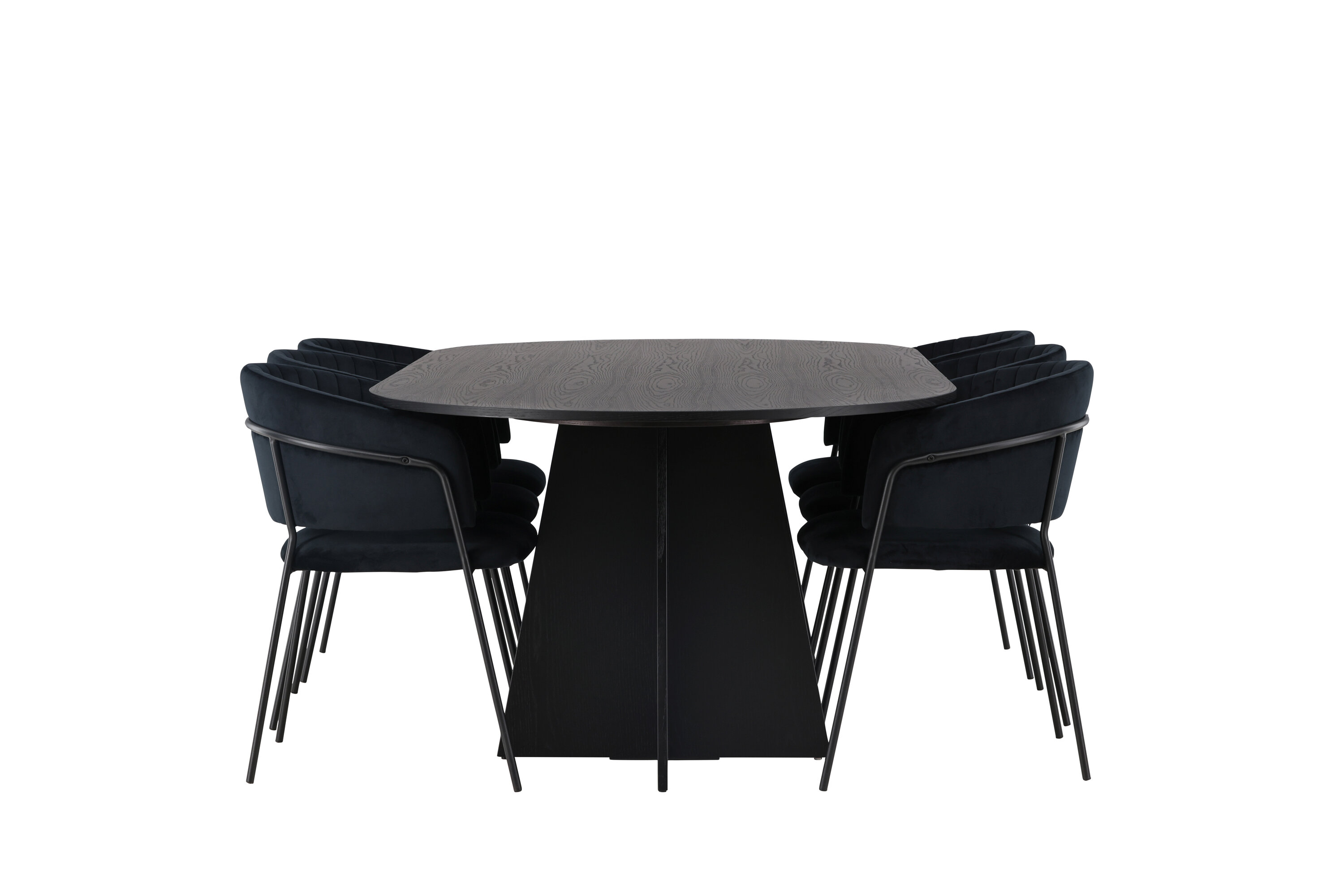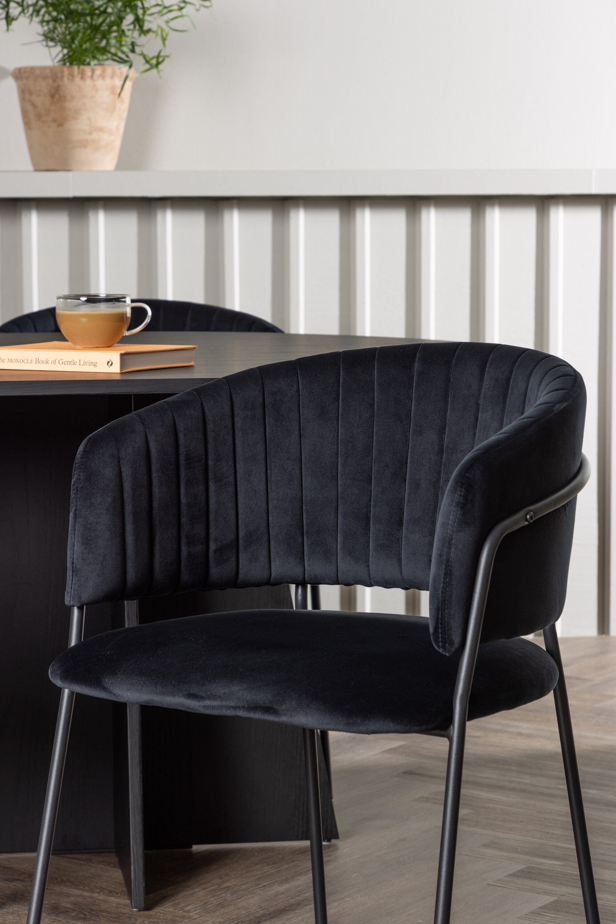 Selle tugeva laua täiendamiseks ühendame selle Selma sarja mustade söögitoolidega. Täielikult polsterdatud disaini ning kergelt ümara selja ja istmega Selma tool pakub erakordset mugavust ja tuge. Tooli dekoratiivsete õmblustega sametkangas lisab elegantsi ning õhukesed mustad terasjalad annavad üldmuljele modernse tunde.
