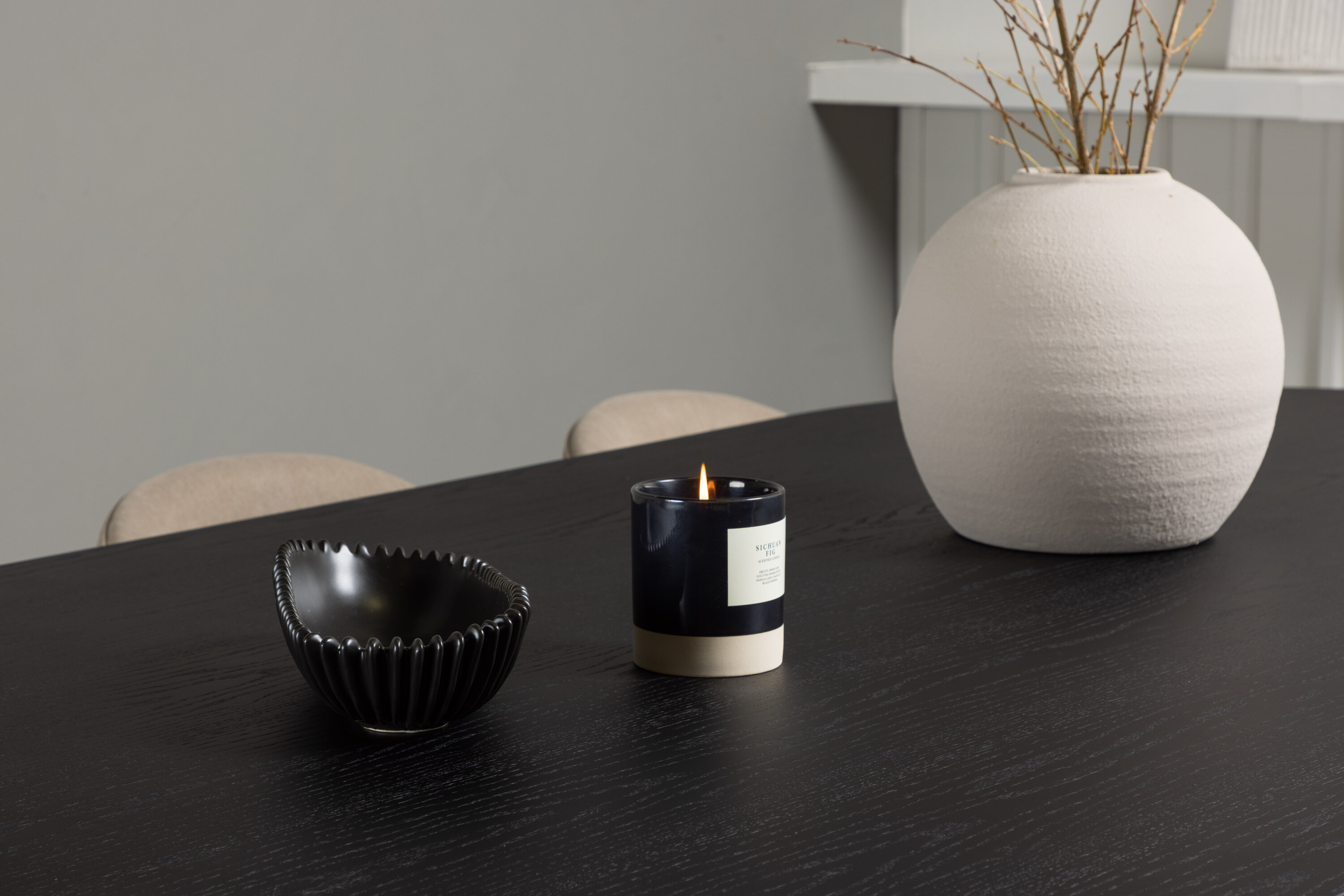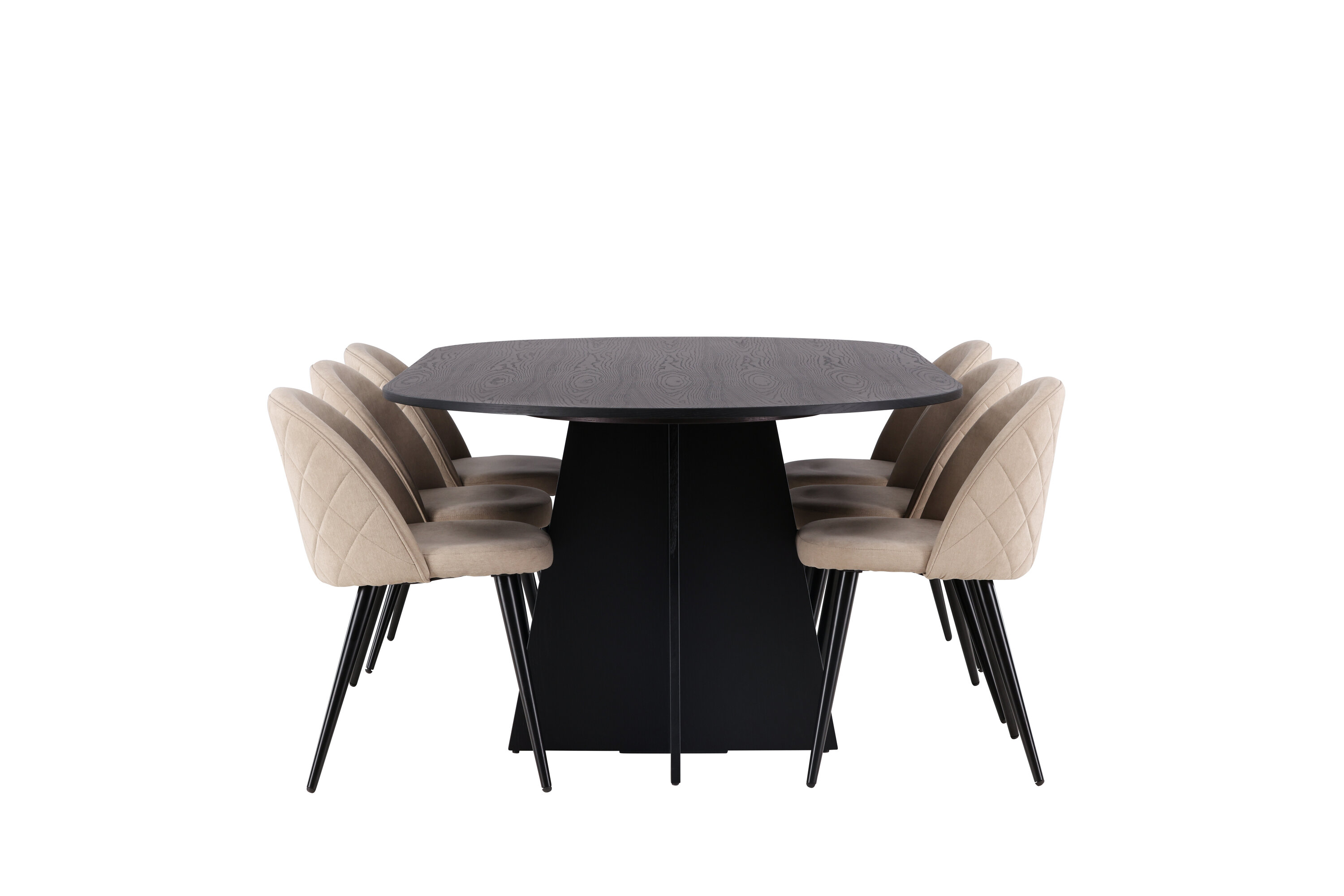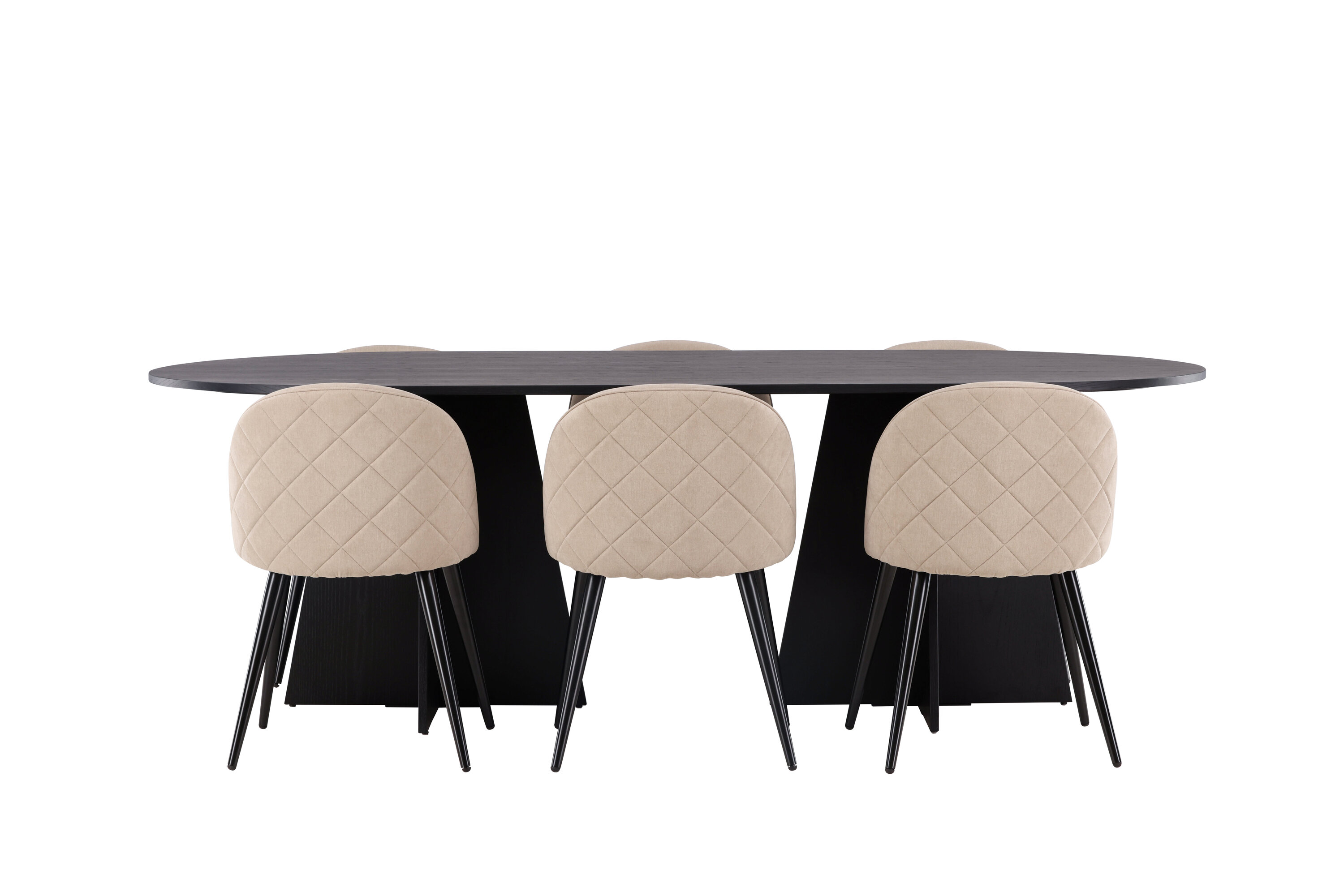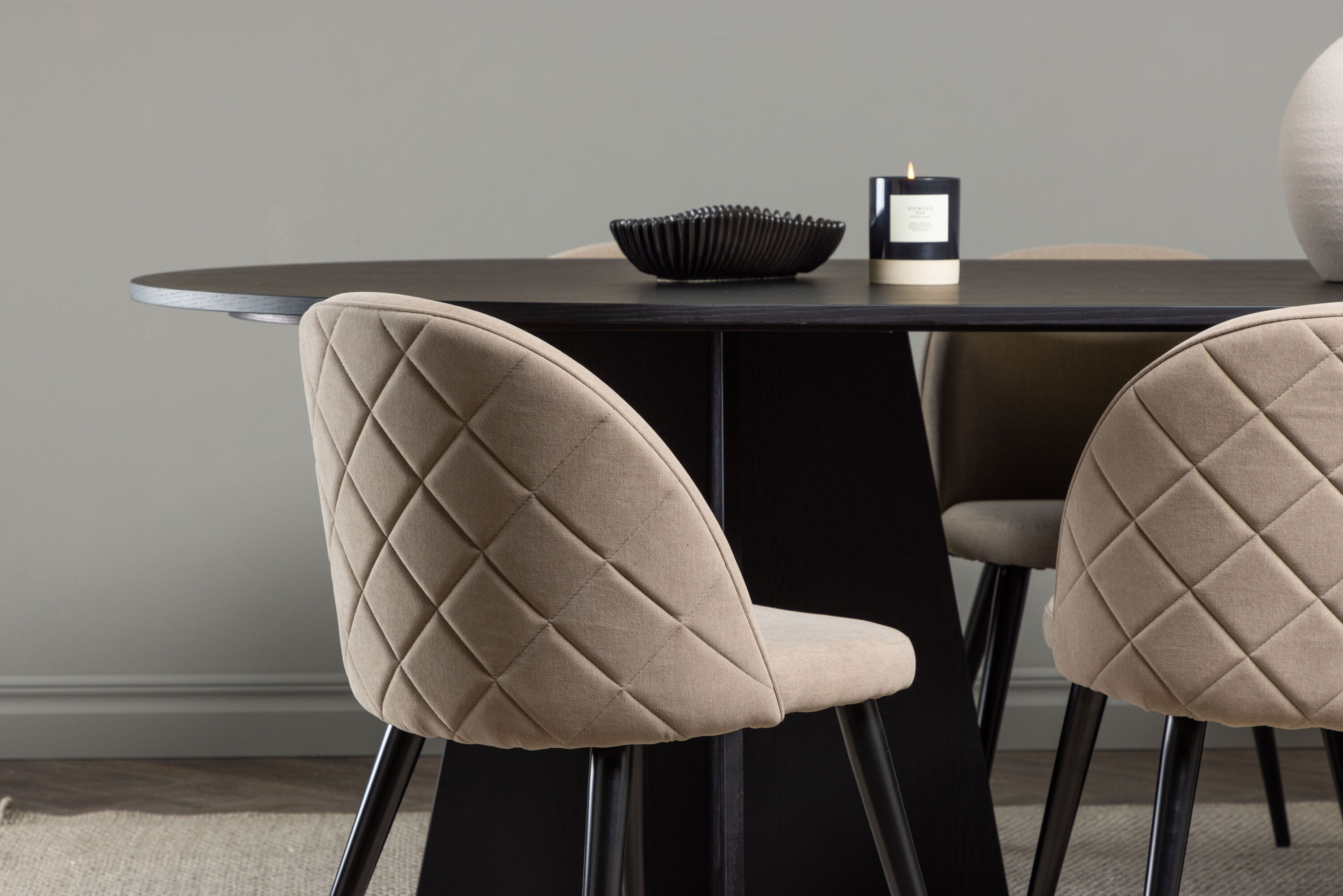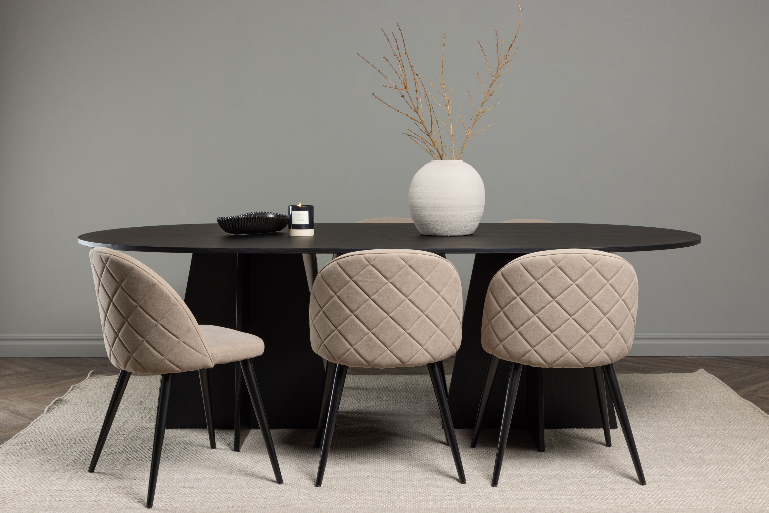 Moodne ja kutsuv! Meie ovaalsel söögilaual Bootcut on ainulaadne disain, millel on spooniga mustast MDF-plaadist ovaalne lauaplaat ja omanäoline raam, millel on kaks avatud disainiga koonusekujulist jalga. Siin trendikas kombinatsioonis Velvet Stitches sarja söögitoolidega. Tooli seljatugi on ümar ja nagu iste, on see pehmelt polsterdatud beeži polüsterlinaga, millel on dekoratiivsed dekoratiivsed õmblused ja malelaua muster seljatoel. Jalad on mustast rauast veidi laienenud. Õhtusöögi ajal maha istudes peaks olema mugav olla! Laua mõõdud: 230x115cm.