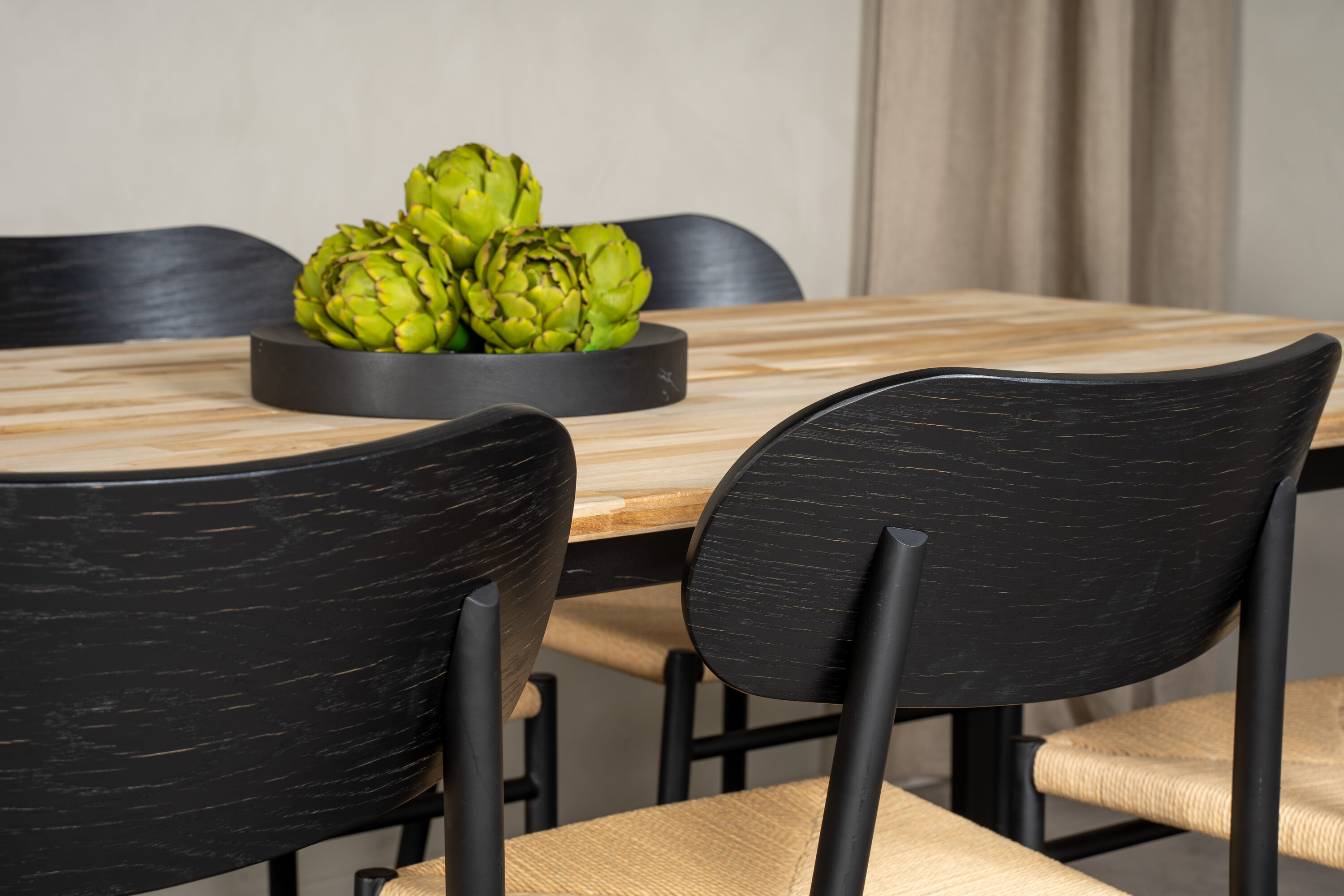 Moodne toidugrupp, kus puidust ilme on segatud mustade detailidega. Söögilaud Cirebon koos söögitoolidega lahkub Polly enamikust kodudest.