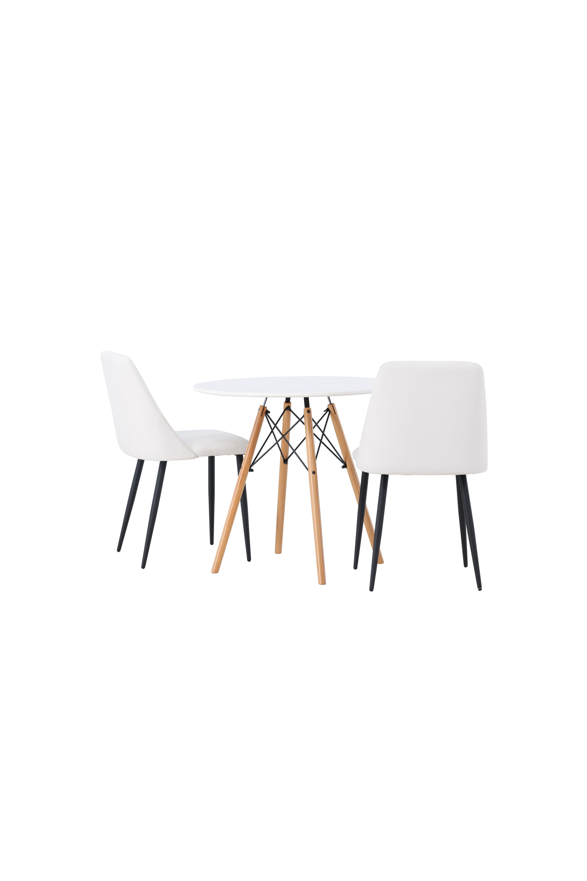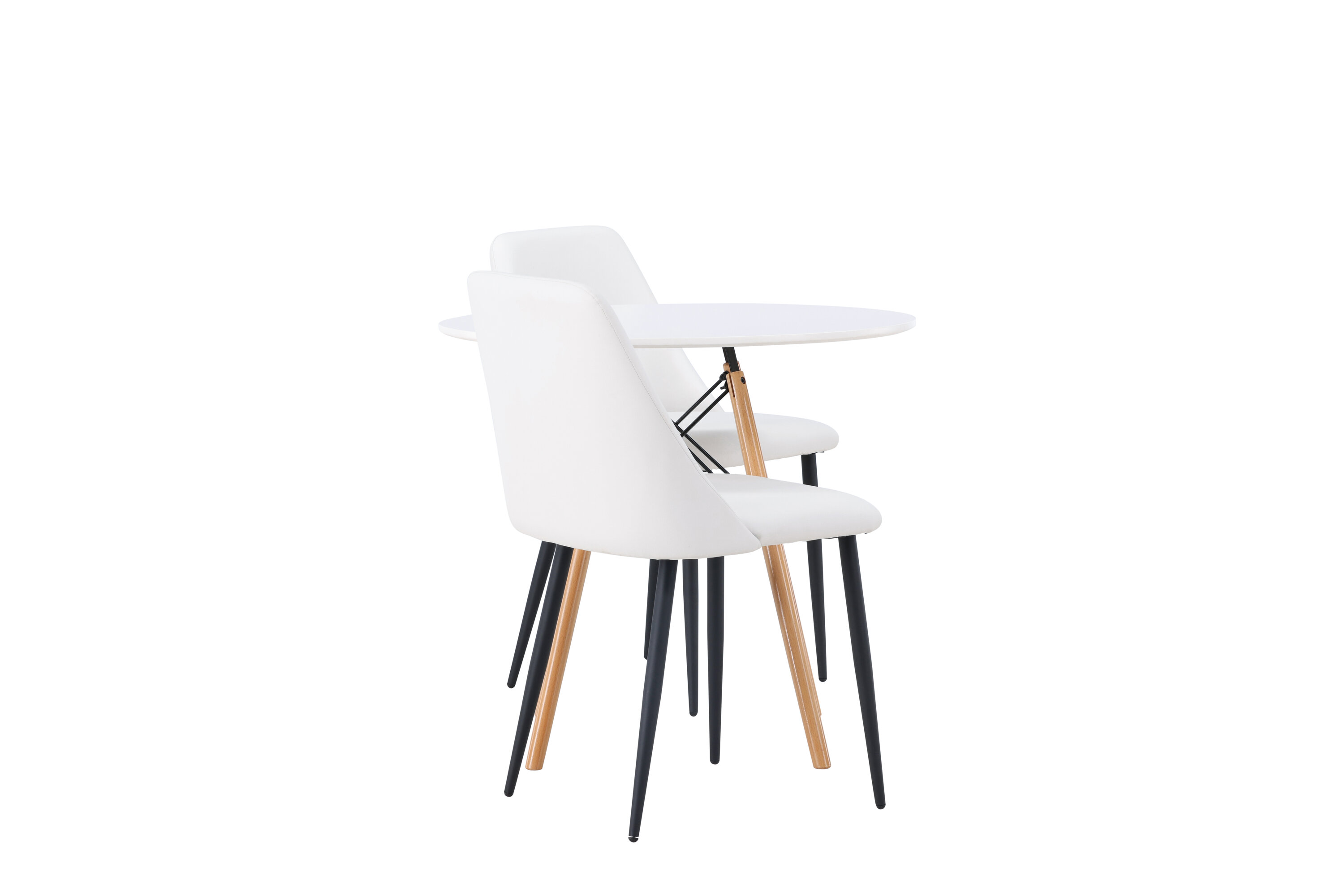 Pehmed ja kutsuvad vormid! Ümmargune söögilaud Danburi on klassikalise disainiga, millel on valgest MDF-st ümmargune lauaplaat ja pöökpuidust kergelt laienevad jalad mustast terasest dekoratiivsete detailidega. Siin stiilses kombinatsioonis valgete söögitoolidega sarjast Night. Toolil on täielikult polsterdatud valge PU-polsteriga iste, mis tundub sama luksuslik kui elegantne, ja jalad on mustast terasest. Iste on täiendava mugavuse tagamiseks polsterdatud. Sellest söögigrupist õhkub luksust ja mugavust! Laua läbimõõt: 60 cm.