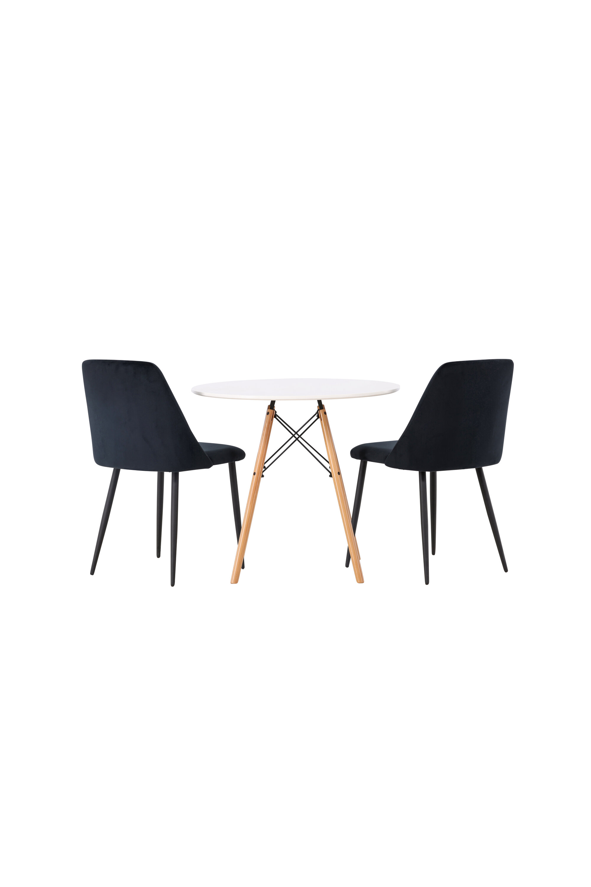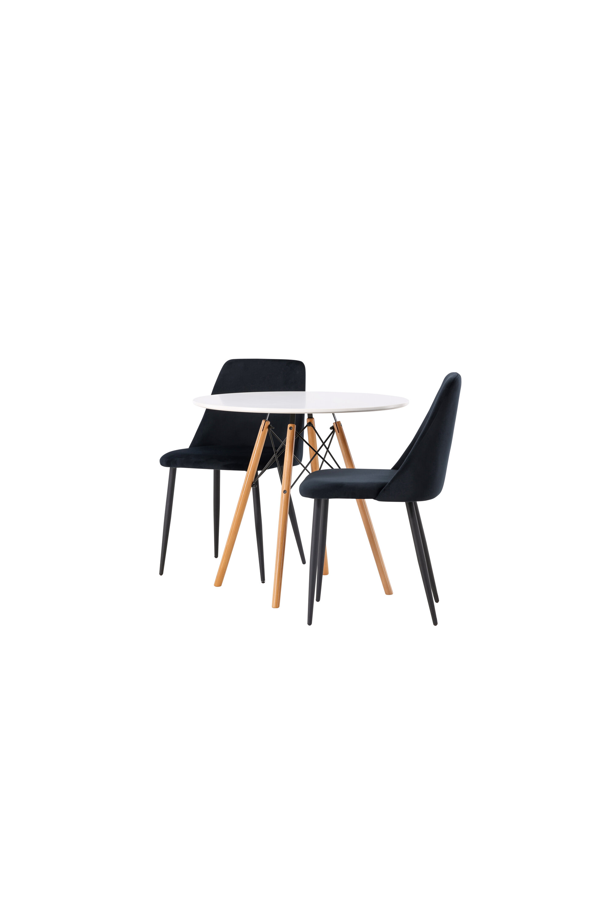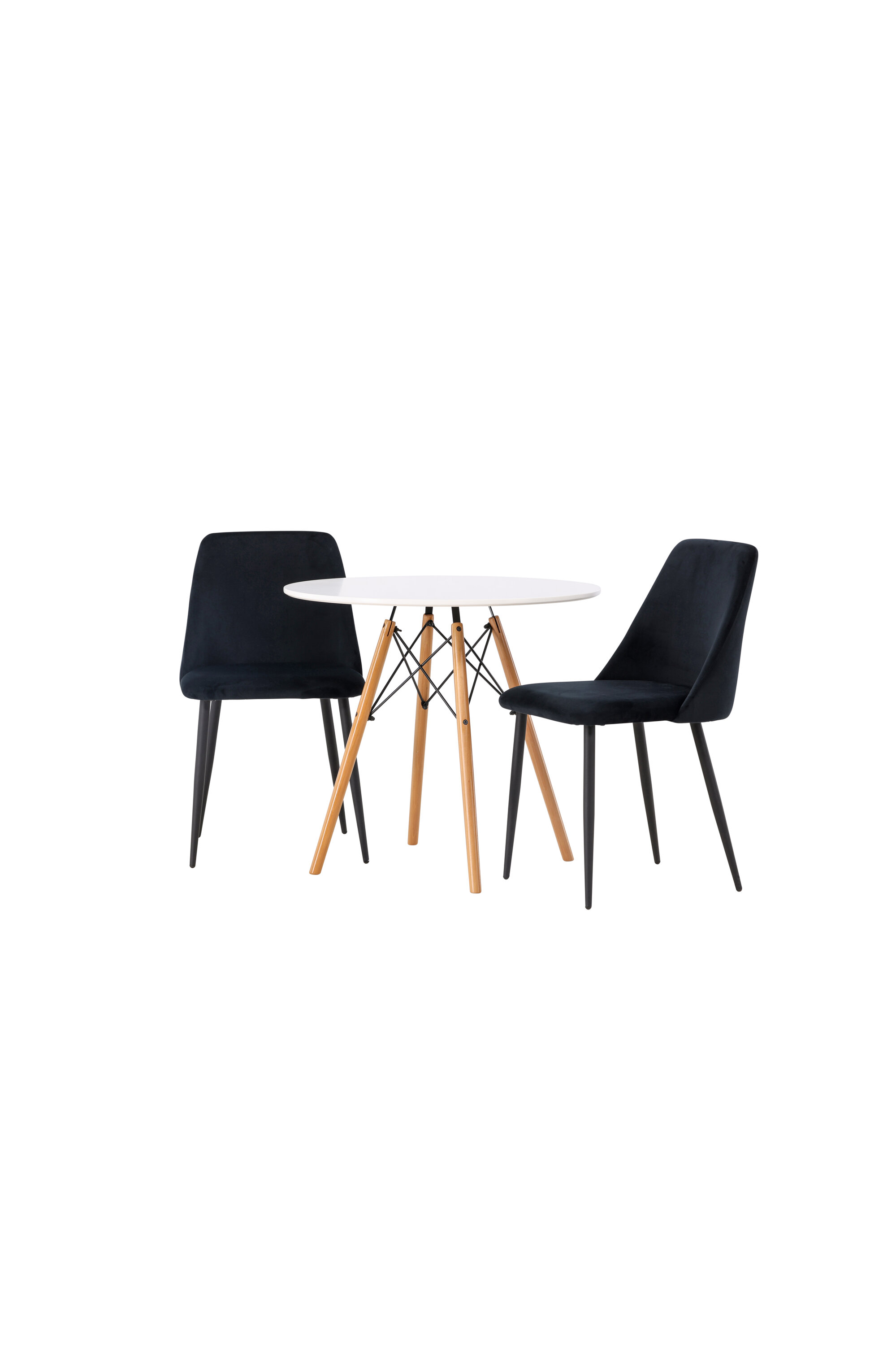 Sametine ja looduslähedane! Ümmargune söögilaud Danburi on klassikalise disainiga, millel on valgest MDF-st ümmargune lauaplaat ja pöökpuidust kergelt laienevad jalad mustast terasest dekoratiivsete detailidega. Siin täiuslik kombinatsioon mustade söögitoolidega sarjast Night. Toolil on täielikult polsterdatud mustast sametkangast iste ja sobivas mustas toonis jalad. Siit saate söögigrupi, mis loob tuppa luksusliku sära ja aitab kaasa kutsuvale ja moeteadlikule õhkkonnale! Laua läbimõõt: 60 cm.