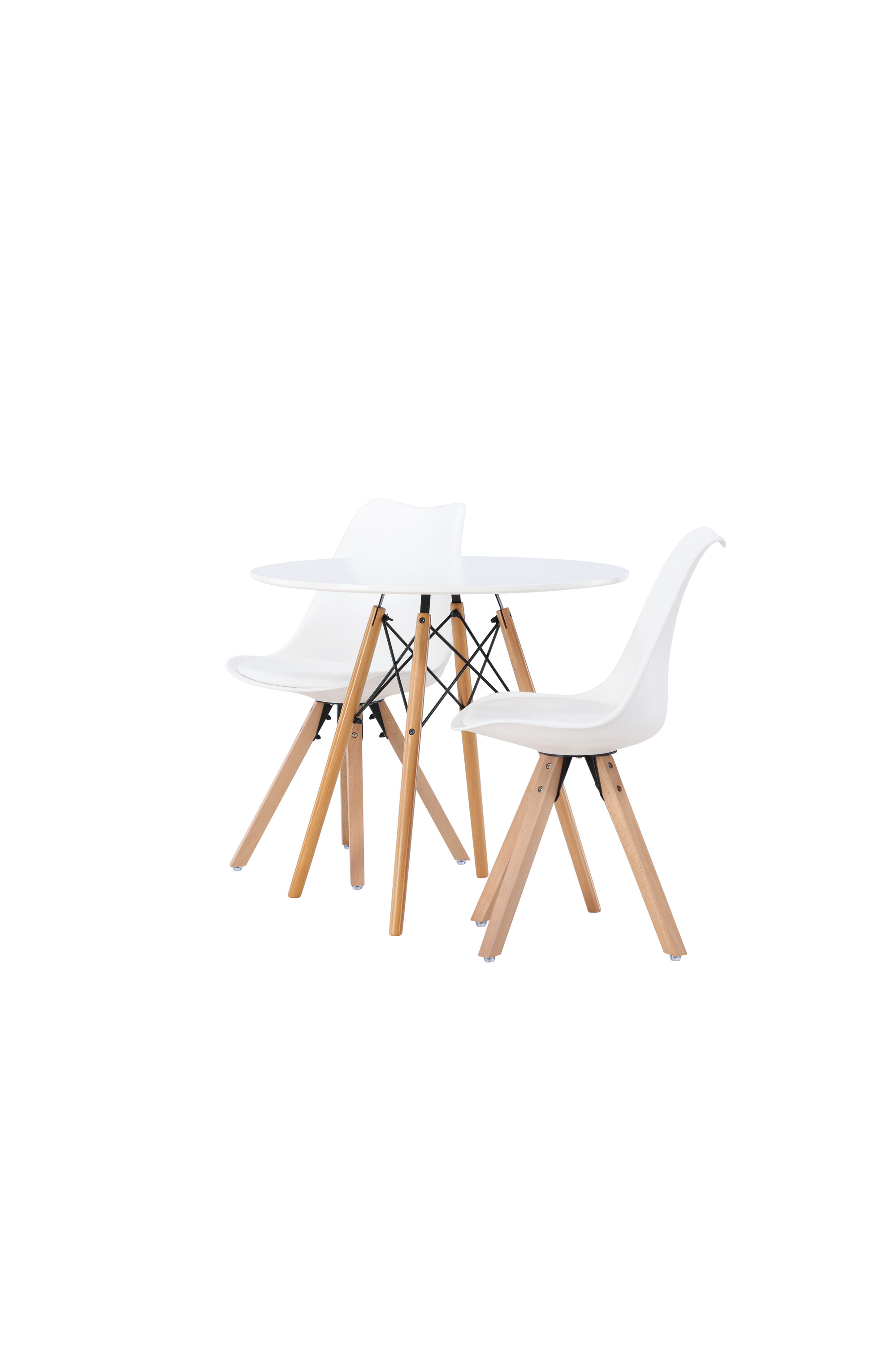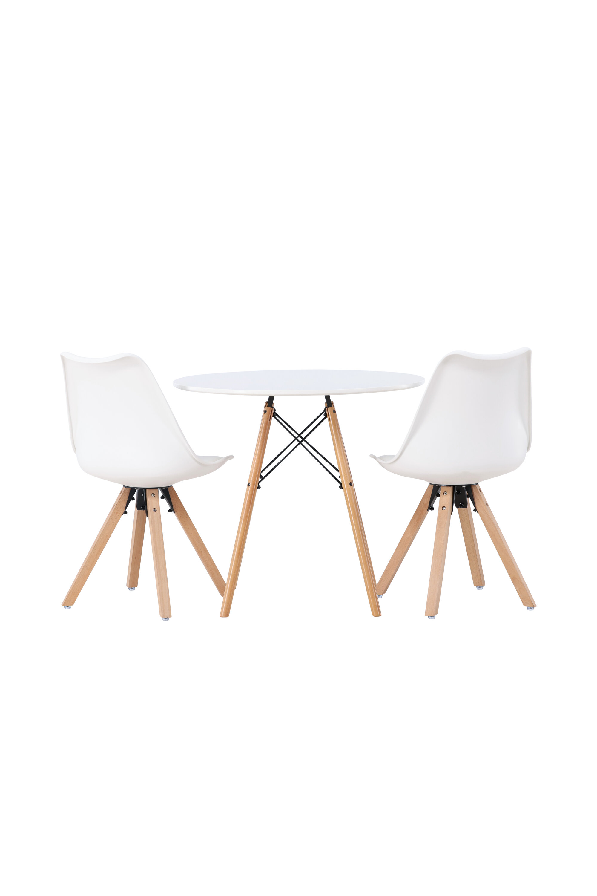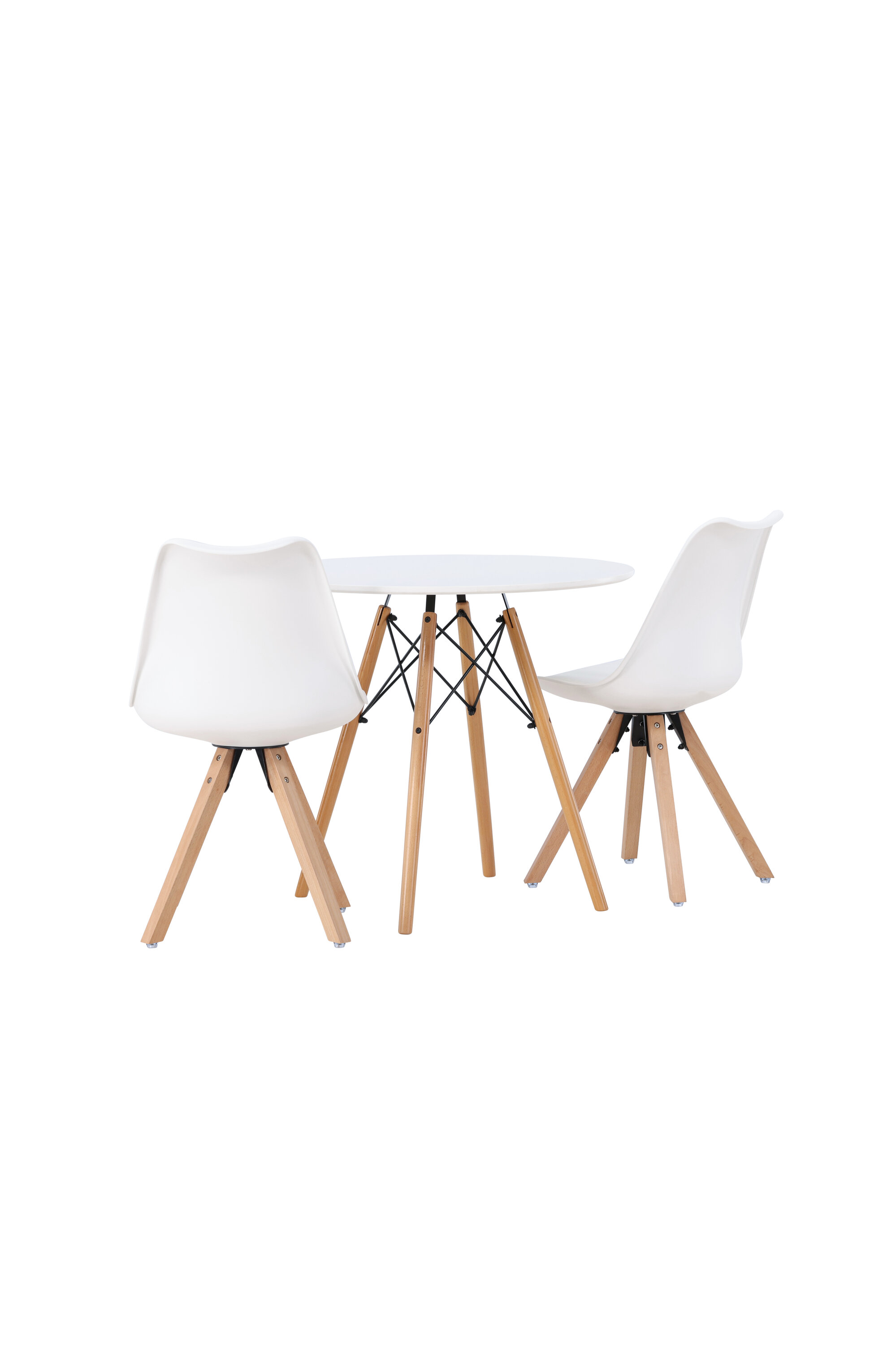 Suurepärane söögigrupp väikeses mahus! Ümmargune söögilaud Danburi on klassikalise disainiga, millel on valgest MDF-st ümmargune lauaplaat ja pöökpuidust kergelt laienevad jalad mustast terasest dekoratiivsete detailidega. Siin koos meie fantastiliste valgete söögitoolidega seeriast Zeno. Toolil on kutsuv disain, valgest plastikust seljatugi ja iste, sisseehitatud kõrge mugavusega istmepadi ja neli puidust laienevat jalga. Sellest paremaks ei lähe! Laua läbimõõt: 60 cm.