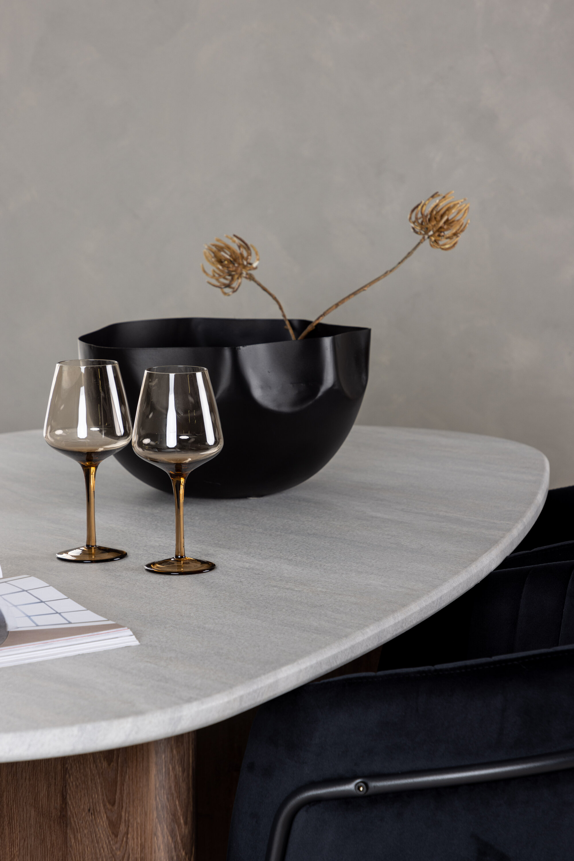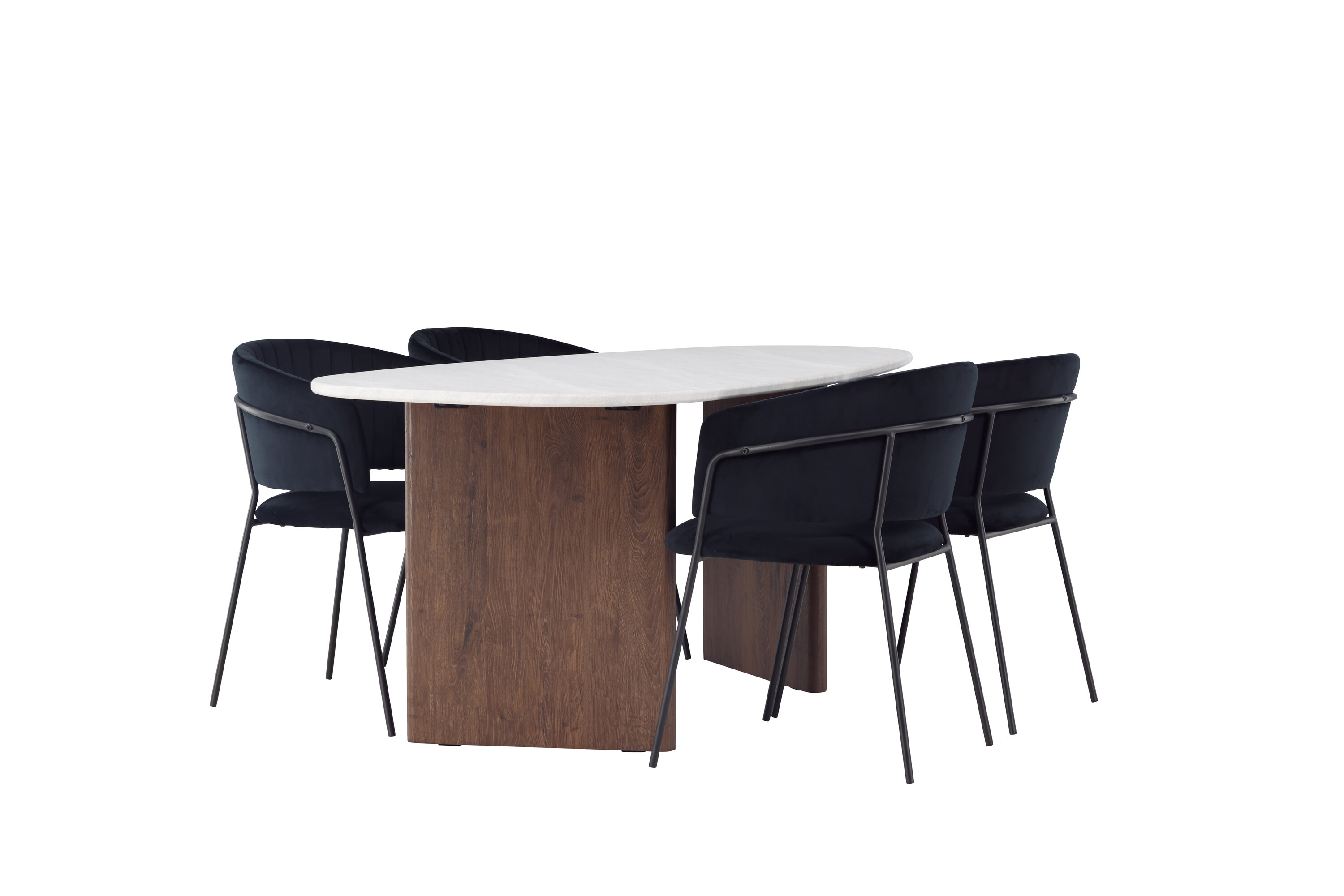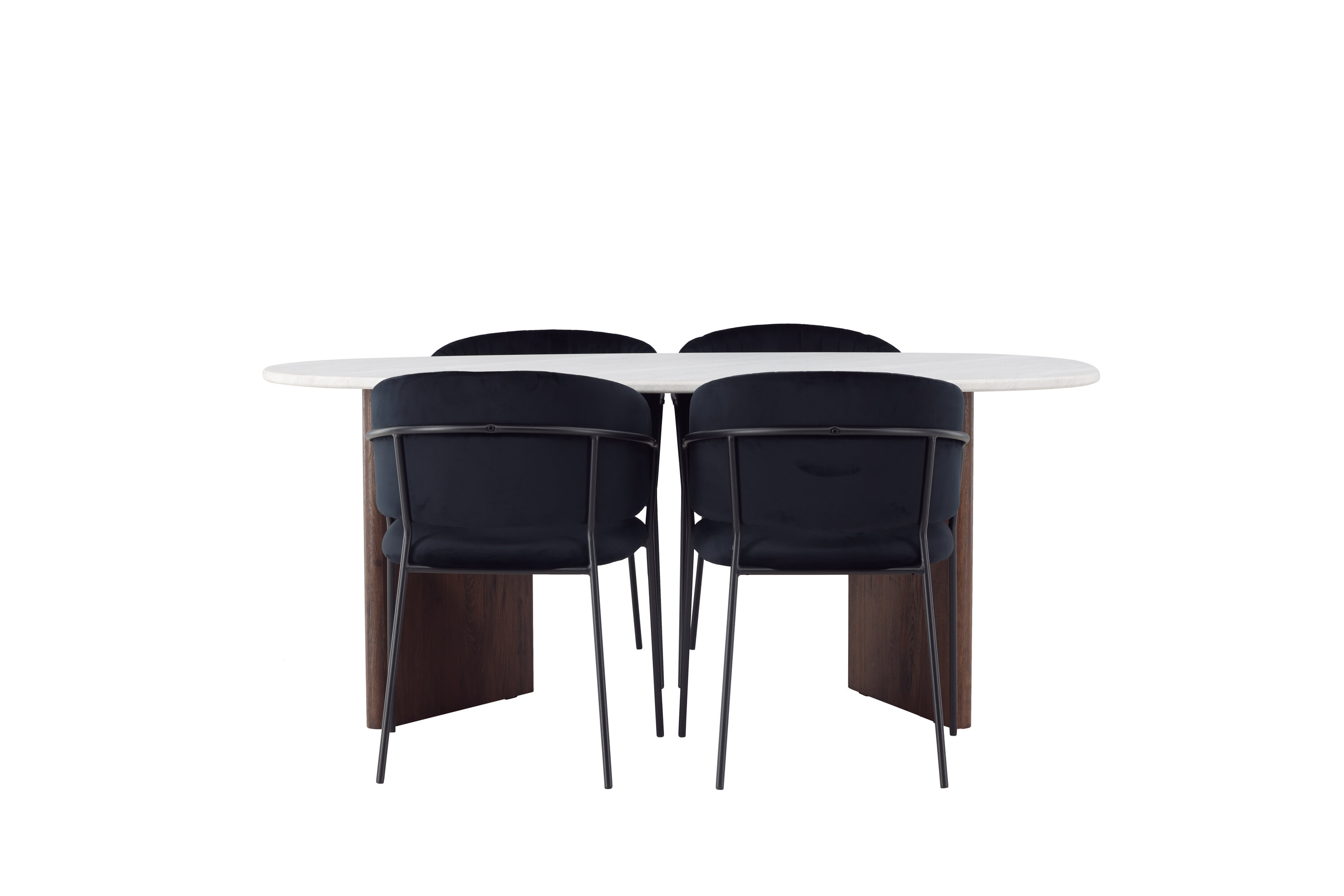 Söögigrupi täiendamiseks oleme selle sidunud Selma sarja mustade toolidega. Seljatugi on optimaalse mugavuse tagamiseks õrnalt ümardatud ja iste on polsterdatud luksusliku sametiga, millel on dekoratiivsed õmblused, mis lisavad elegantsi. Toolijalad on õhukesed ja valmistatud mustast terasest, pakkudes moodsat ja stiilset kontrasti pehme sametpolstriga. See ei muutu mugavamaks kui see! Andke oma kodule luksust ja elegantsi selle söögigrupiga ning kutsuge sõpru ja perekonda tulevikus hubasele einele!