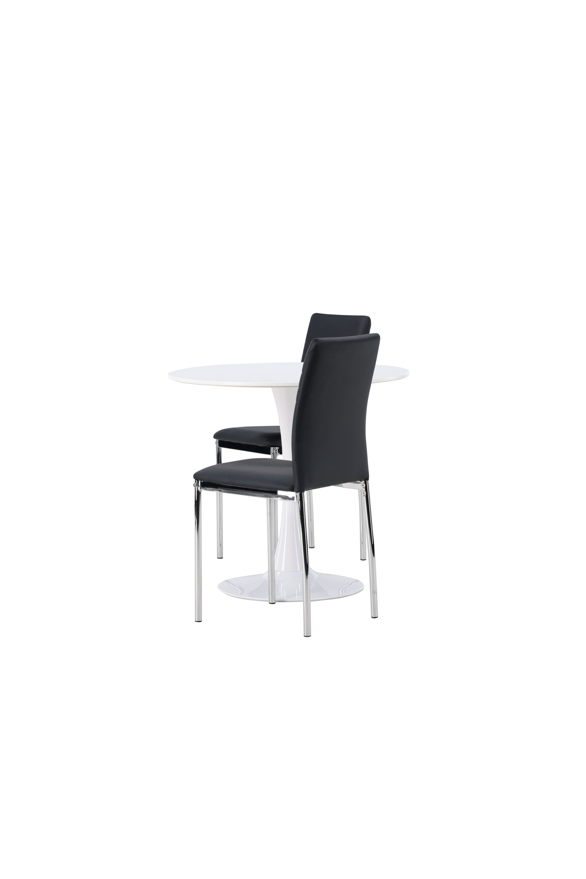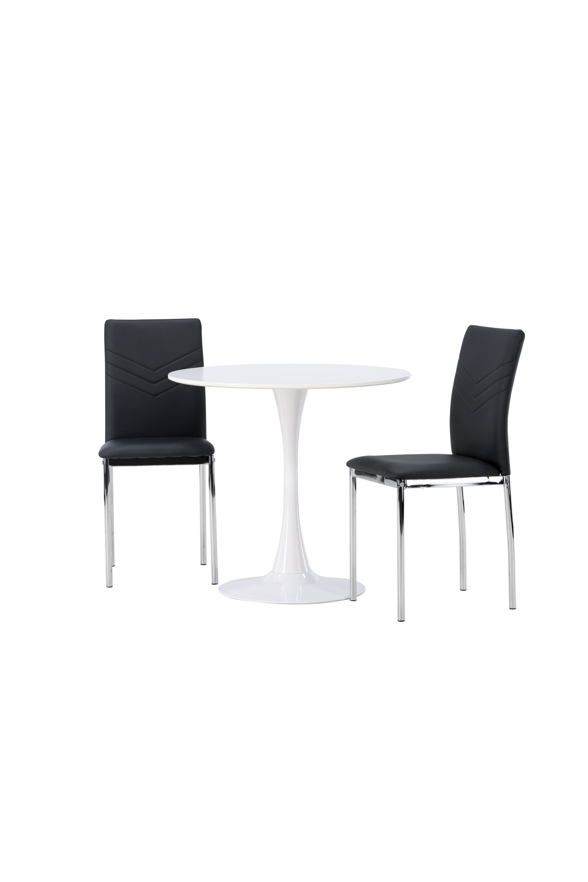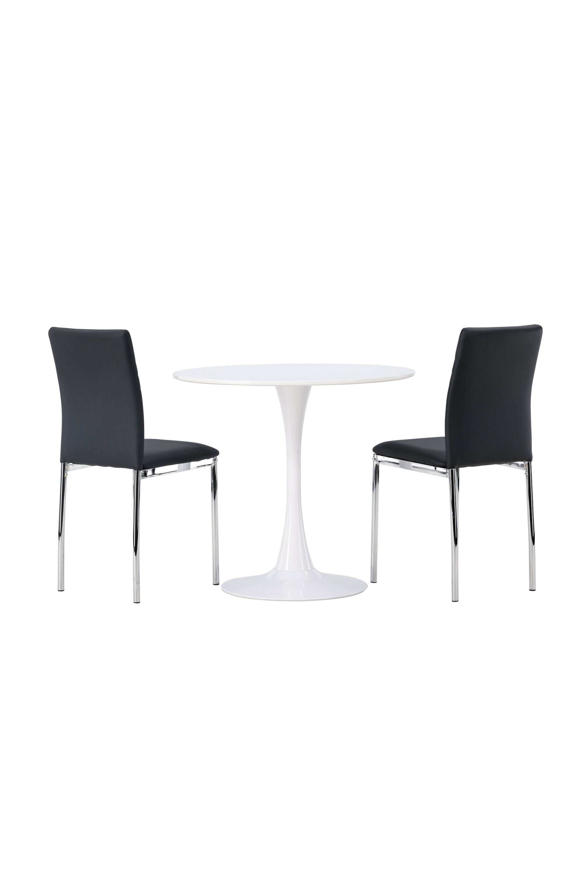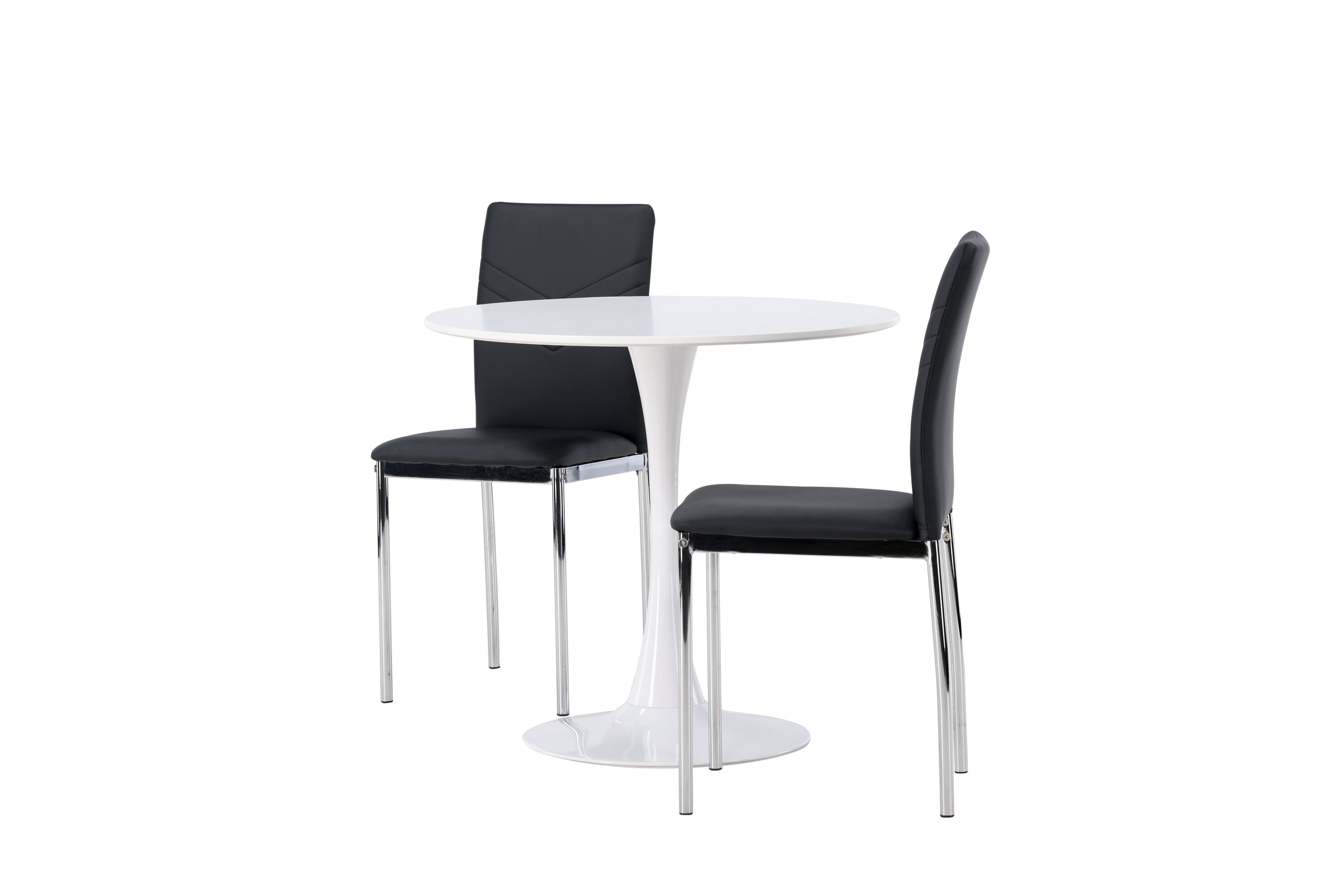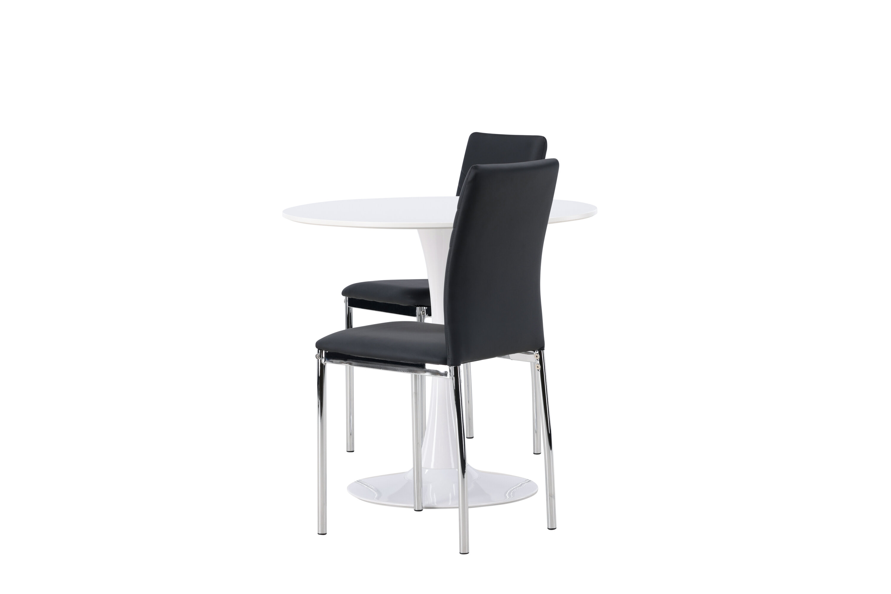 See grupp sobib ideaalselt väikesesse kööki! Ümmargusel söögilaual Hamden on õhuke valgest MDF-plaadist lauaplaat ja stiilne valgest terasest trompetijalg. Siin koos dekoratiivsete mustade Lily sarja söögitoolidega. Tool on täielikult polsterdatud musta kunstnahaga ja seljatoel on dekoratiivsed õmblused, millest saab stiilne detail. Toolijalad on kroomitud terasest ja annavad pilgupüüdjale stiilse tööstusliku välimuse. Loo oma kodus võluv keskpunkt! Laua läbimõõt: 60 cm.