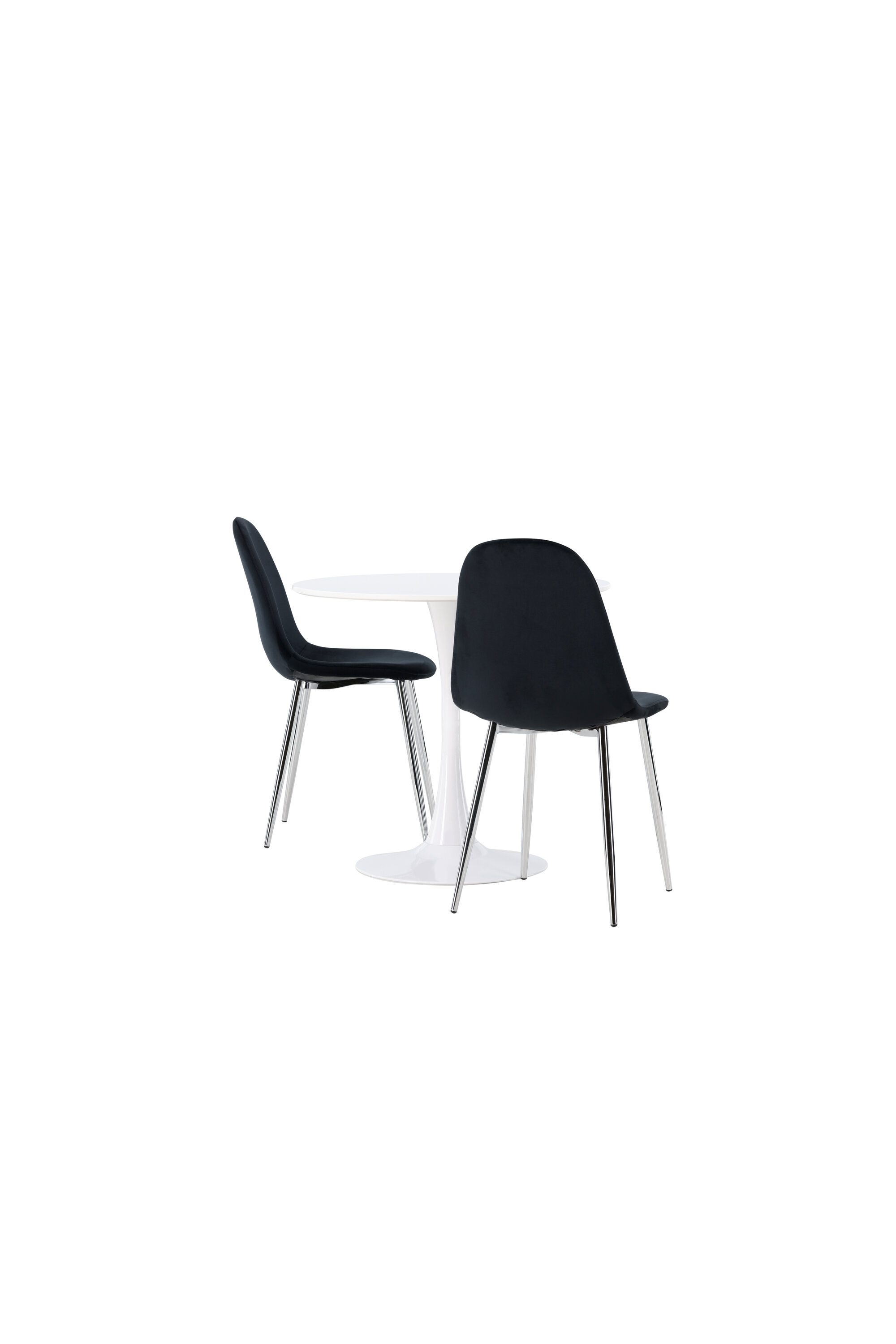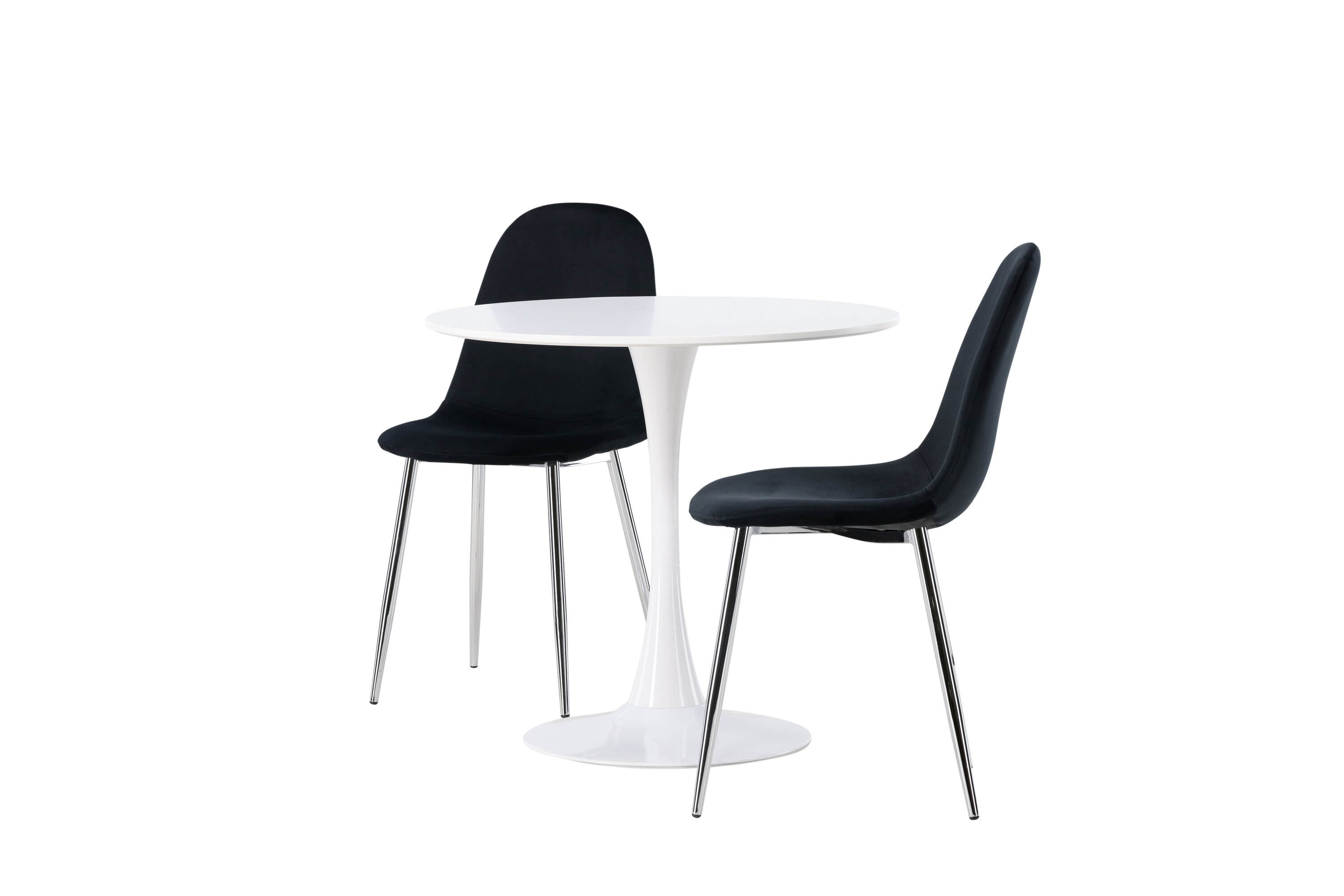 Ideaalne söögigrupp väiksemasse kööki! Ümmargusel söögilaual Hamden on õhuke valgest MDF-plaadist lauaplaat ja stiilne valgest terasest trompetijalg. Siin moodsas kombinatsioonis Polari sarja mustade söögitoolidega. Toolil on täielikult polsterdatud disain, mille jalad on kroomitud metallist, seljatugi ja iste on pehmest pehmest pehmest pehmest kangast, kergelt ümardatud seljatoega. Kodu sisustamiseks peaks olema nii mugav kui stiilne! Laua läbimõõt: 60 cm.