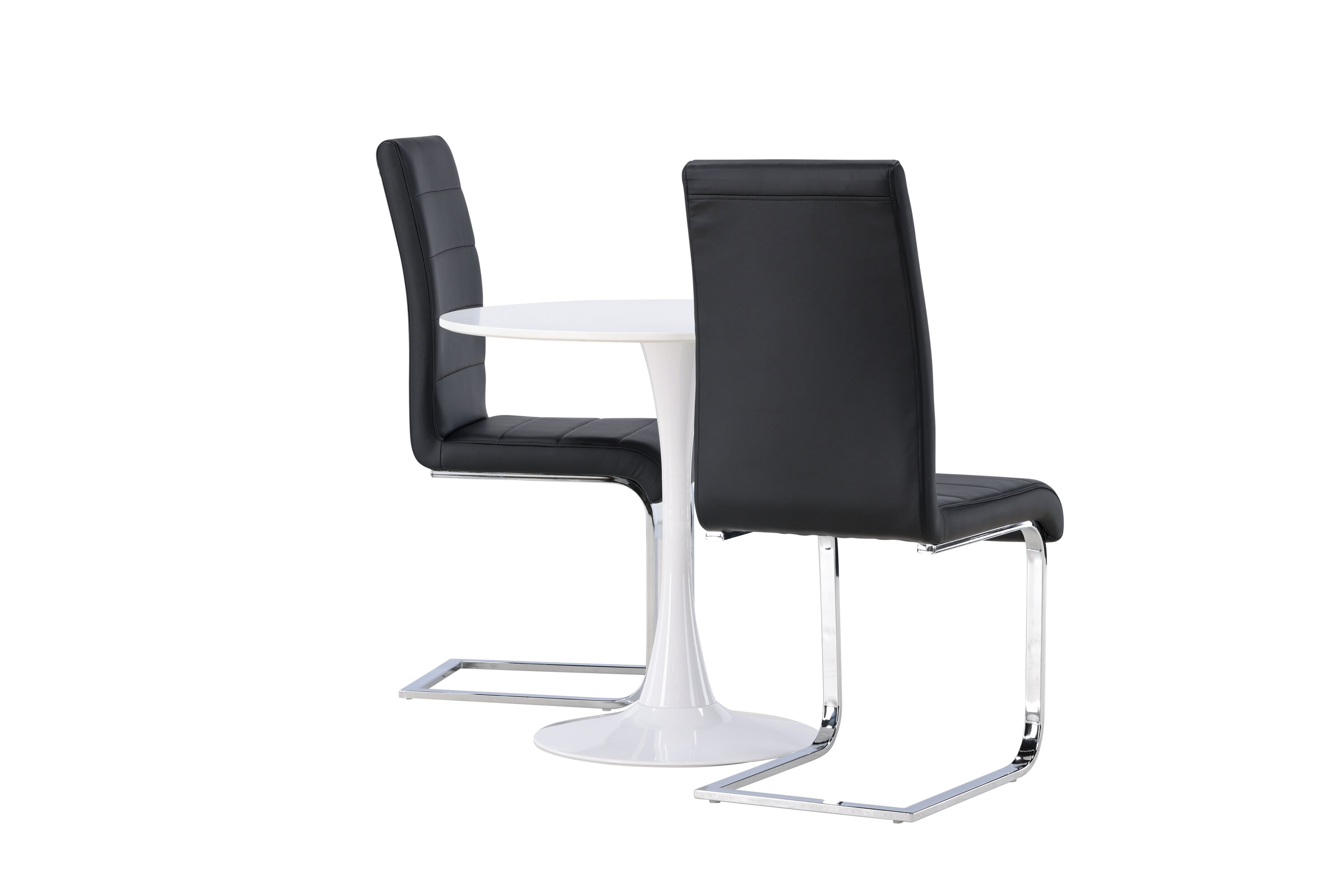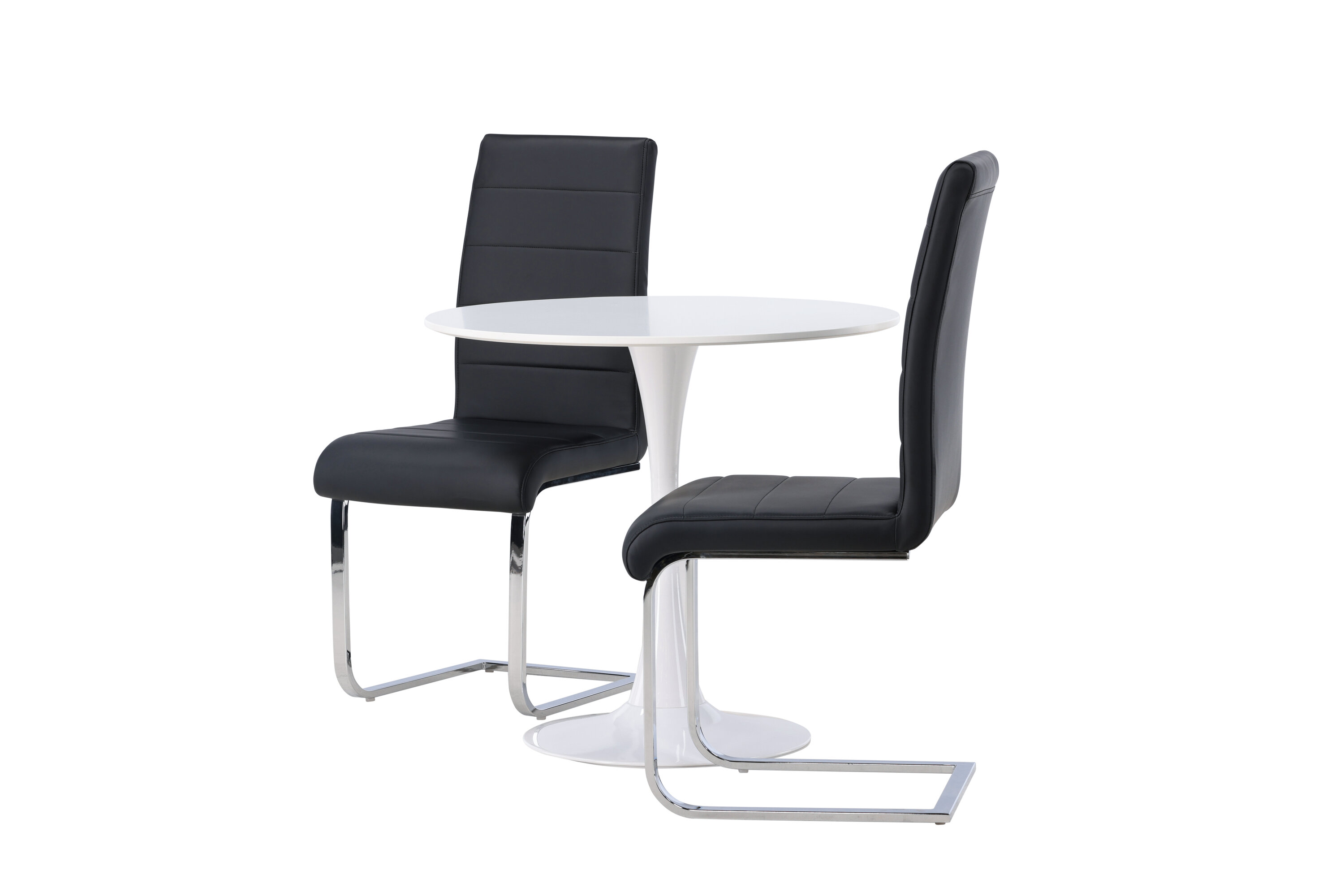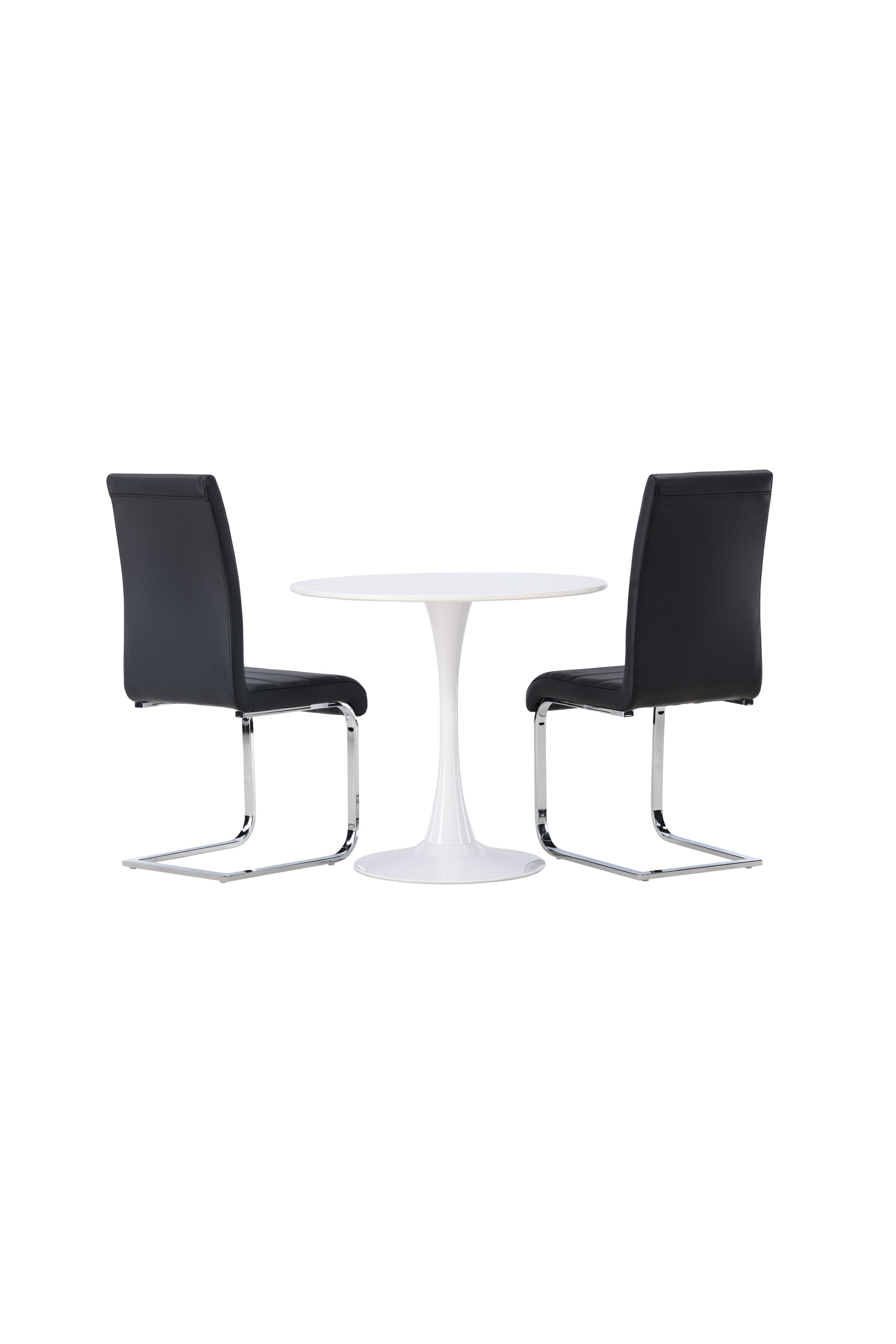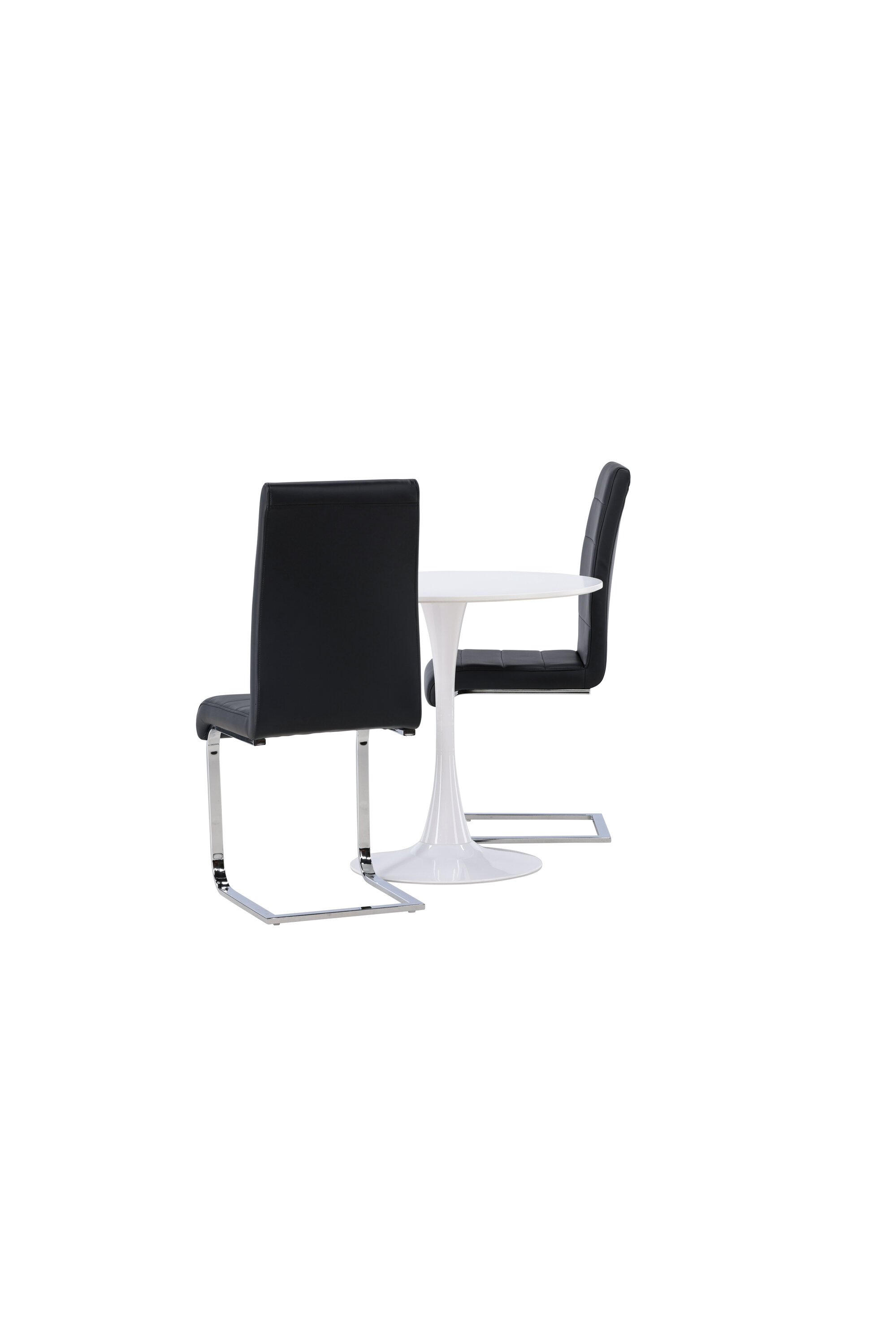 Kena kombinatsioon tööstusdisainist ja kõrgest mugavusest! Ümmargusel söögilaual Hamden on õhuke valgest MDF-plaadist lauaplaat ja stiilne valgest terasest trompetijalg. Siin koos meie suurejooneliste mustade söögitoolidega Tempo sarjast. Toolil on sirge mustast PU-st dekoratiivõmblustega seljatugi ja jalad on kroomitud metallist. Ideaalne seltskond väiksemasse kööki! Laua läbimõõt: 60 cm.
