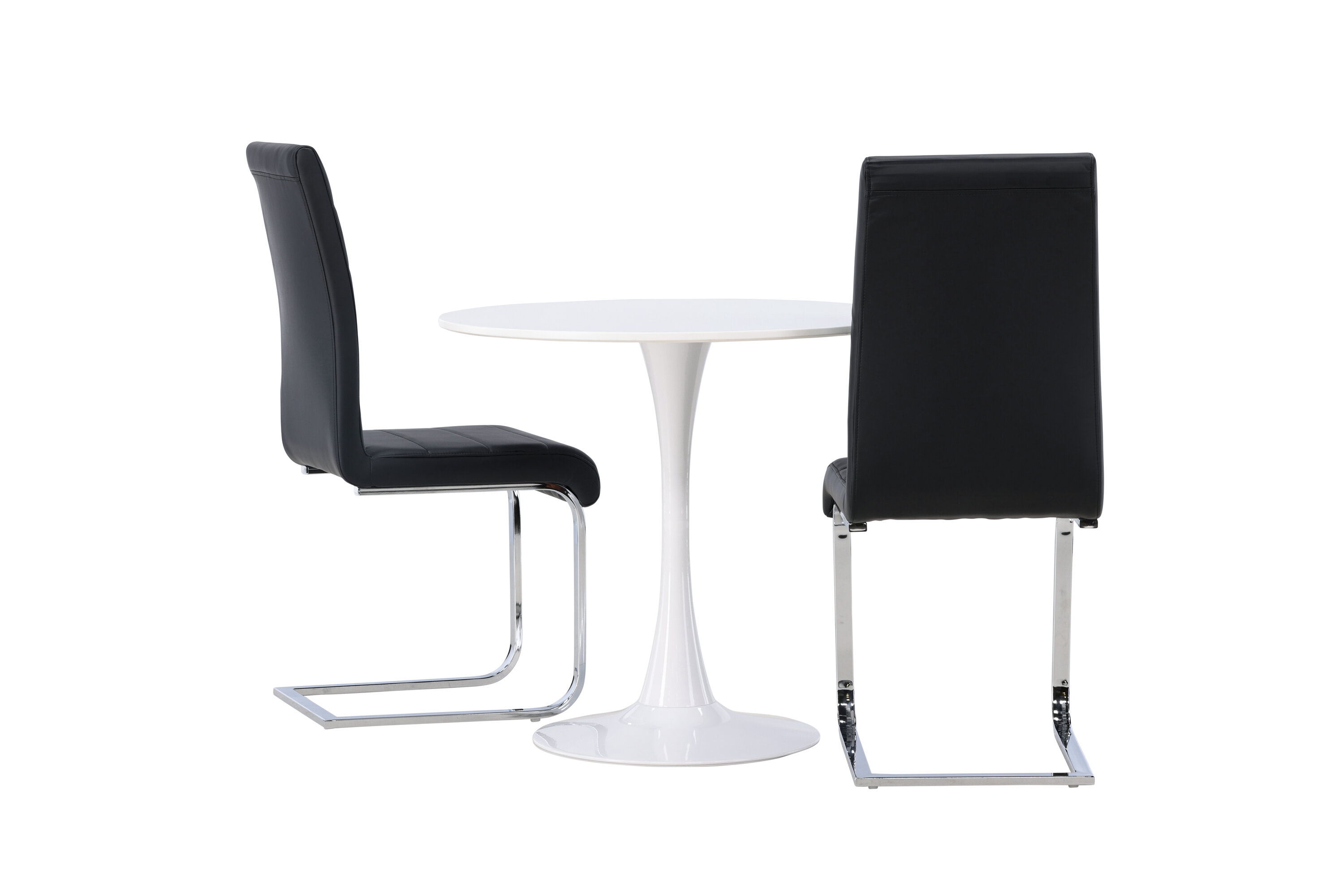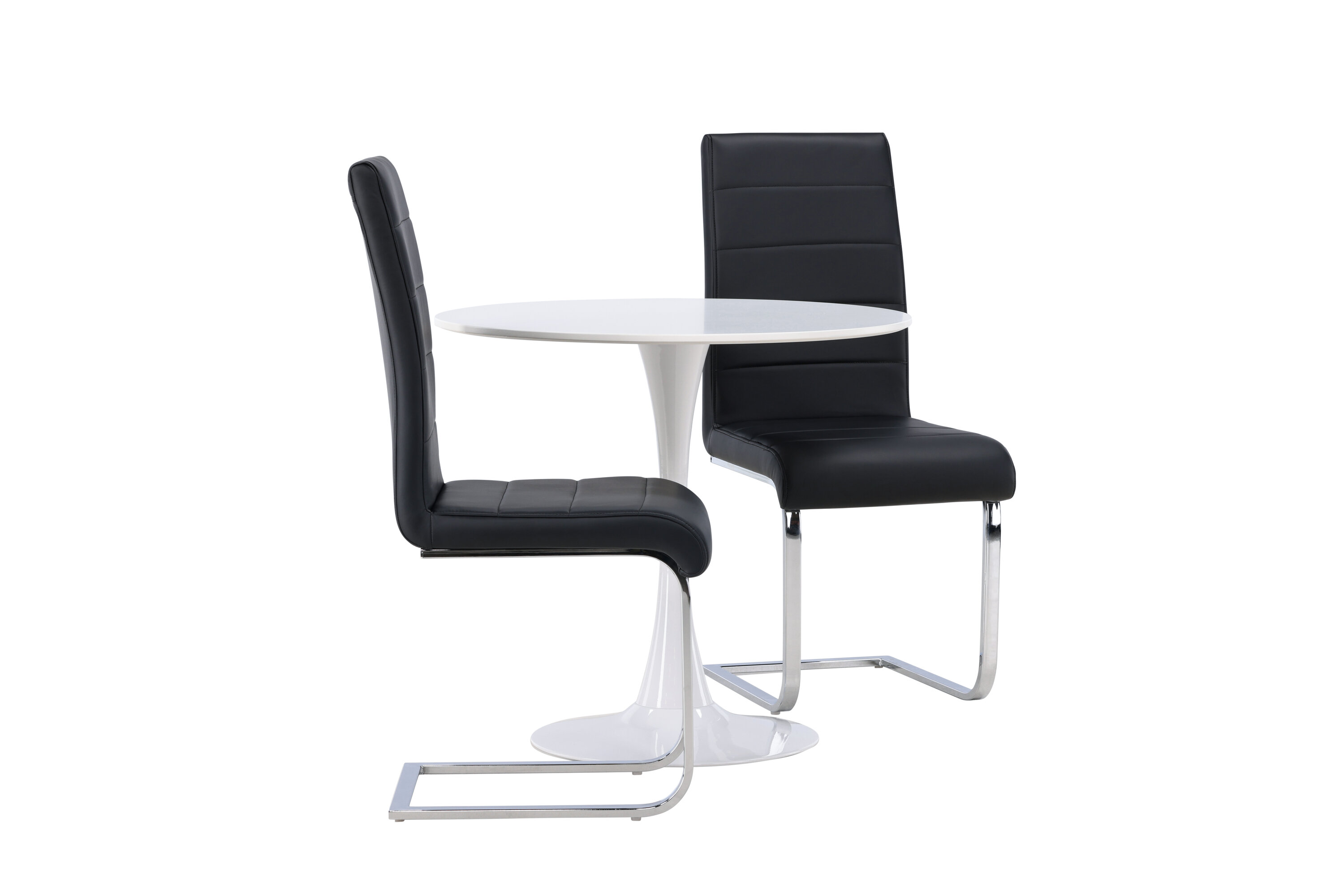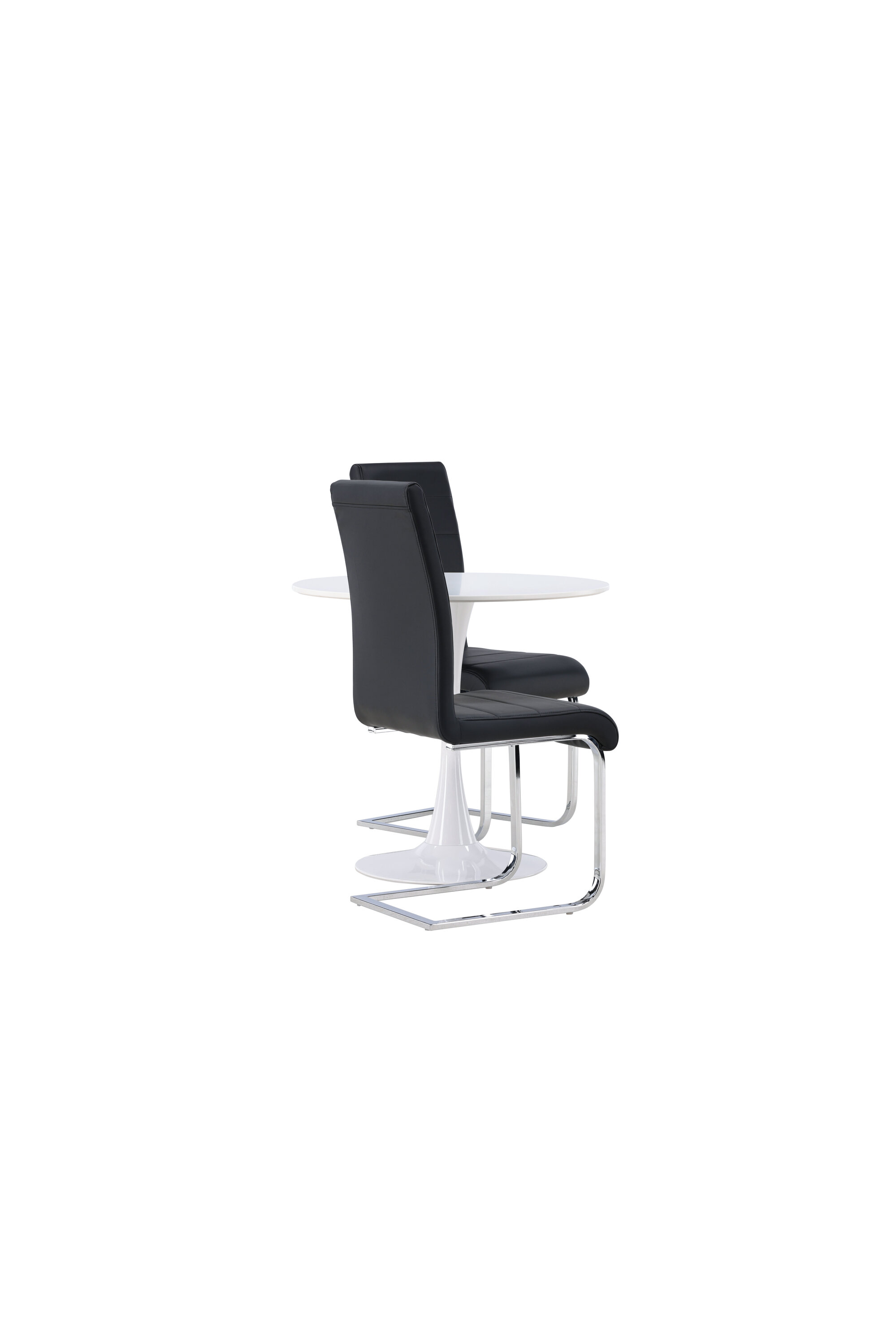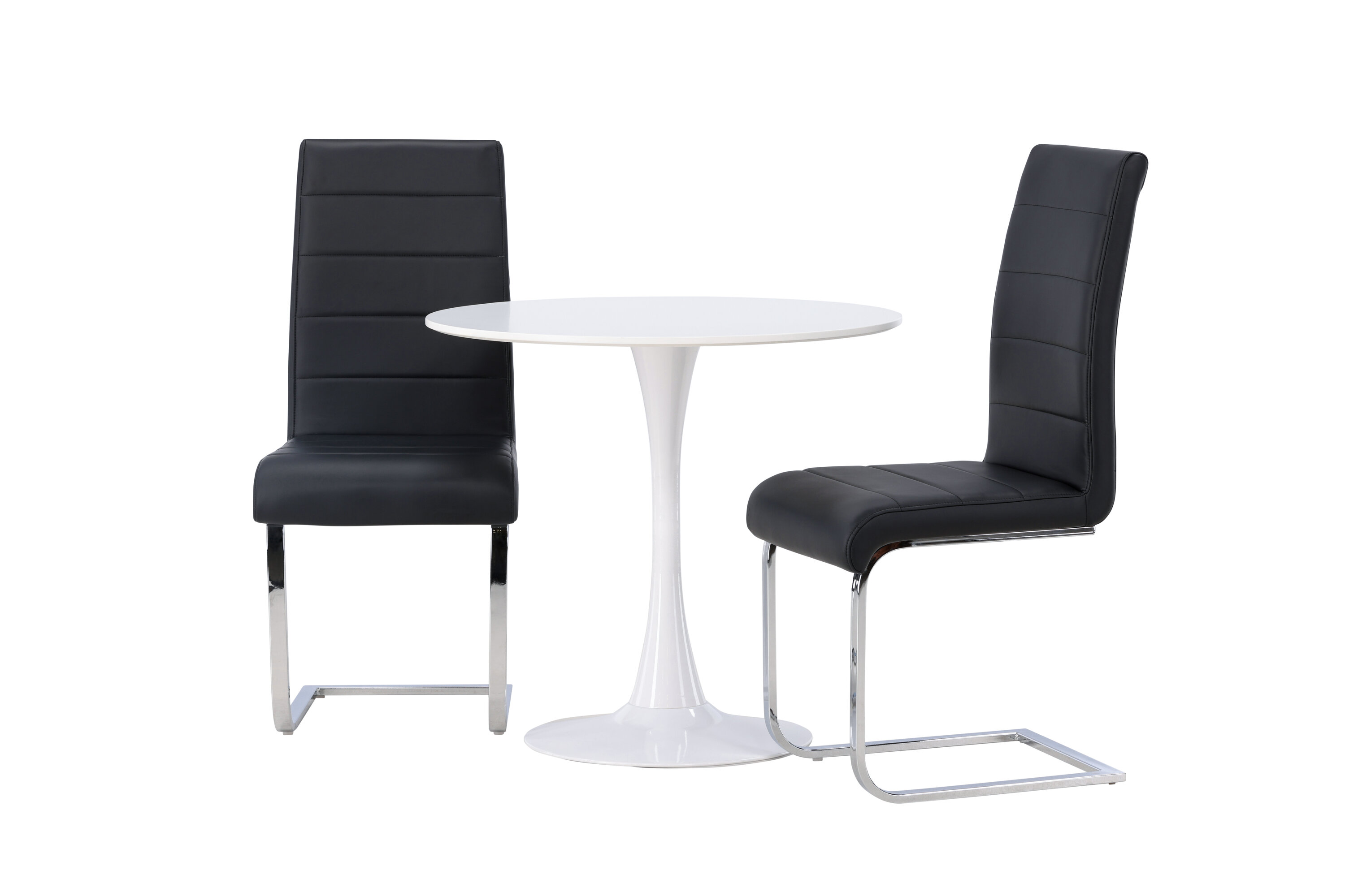 Kena kombinatsioon tööstusdisainist ja kõrgest mugavusest! Ümmargusel söögilaual Hamden on õhuke valgest MDF-plaadist lauaplaat ja stiilne valgest terasest trompetijalg. Siin koos meie suurejooneliste mustade söögitoolidega Tempo sarjast. Toolil on sirge mustast PU-st dekoratiivõmblustega seljatugi ja jalad on kroomitud metallist. Ideaalne seltskond väiksemasse kööki! Laua läbimõõt: 60 cm.