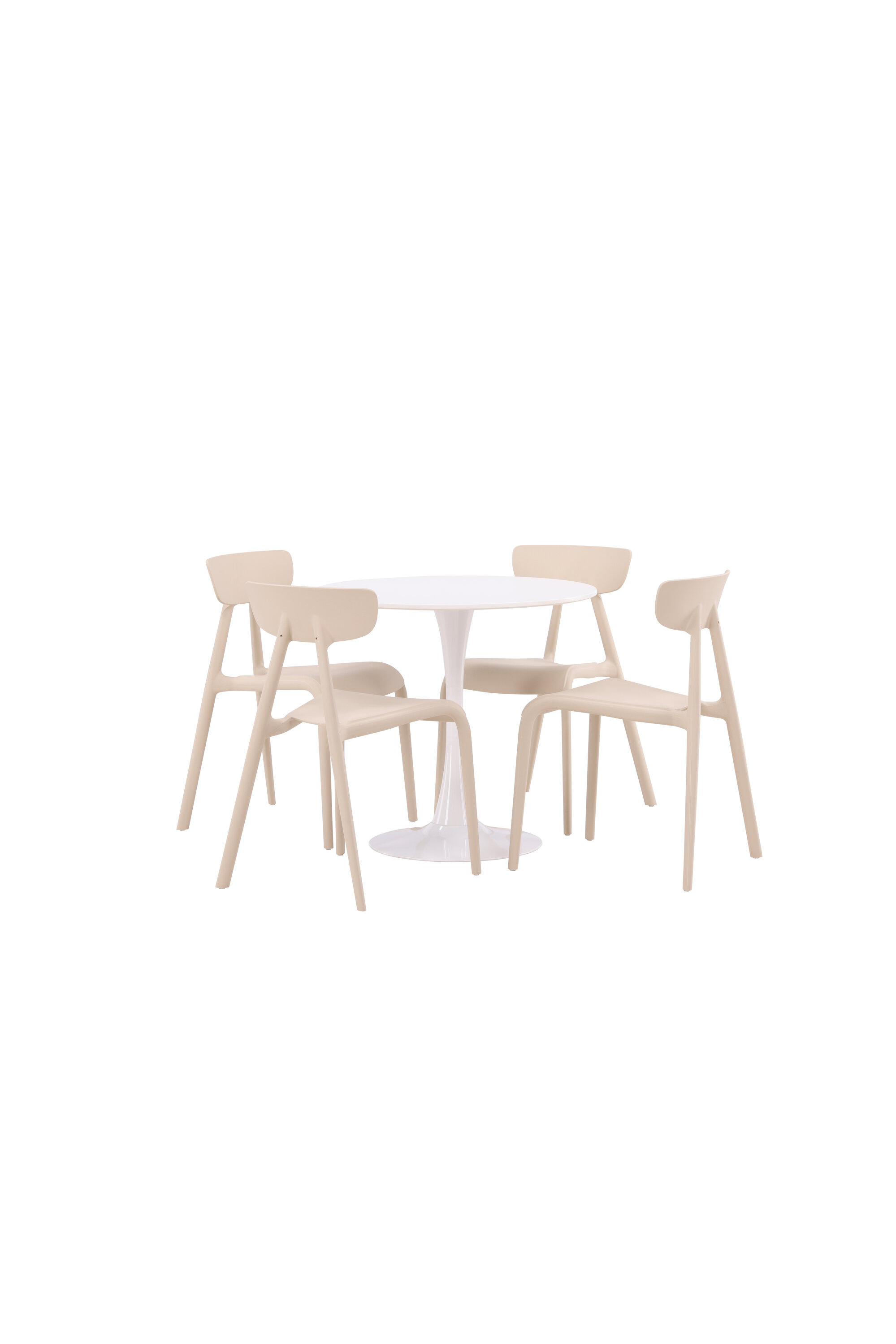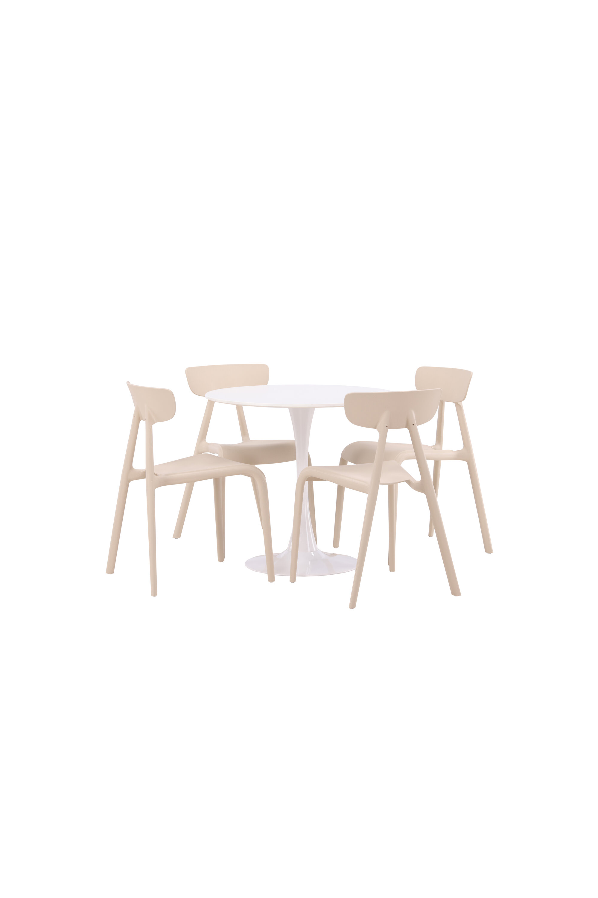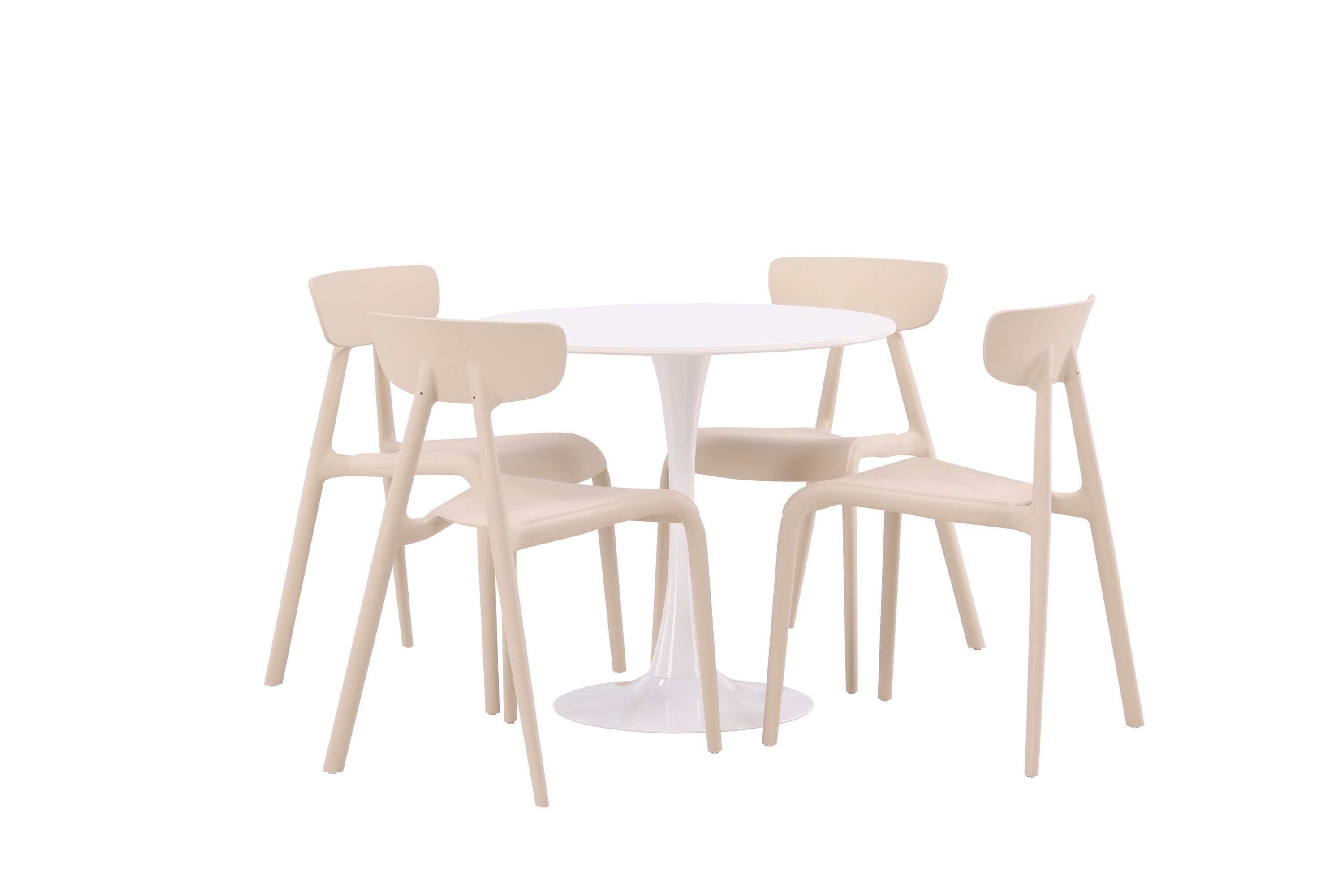 Kogege harmoonilist einestamiskogemust Venture Home’i eksklusiivse söögikomplektiga. See moodne ja stiilne grupp koosneb elegantsest Hamdeni lauast ja neljast mugavast naturaalses värvitoonis Ursholmen toolist. Hamdeni laud loob oma ümmarguse valge lauaga, mille kõrgus on 75 cm ja läbimõõt on 80 cm, ruumis avatud ja helge atmosfääri. Laud on valmistatud MDF-plaadist, mis tagab sileda ja ühtlase pinna.