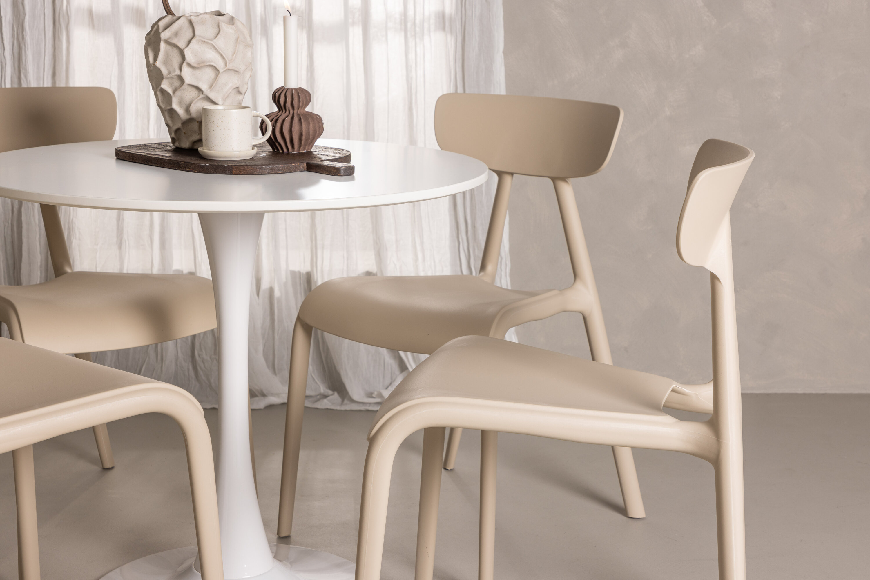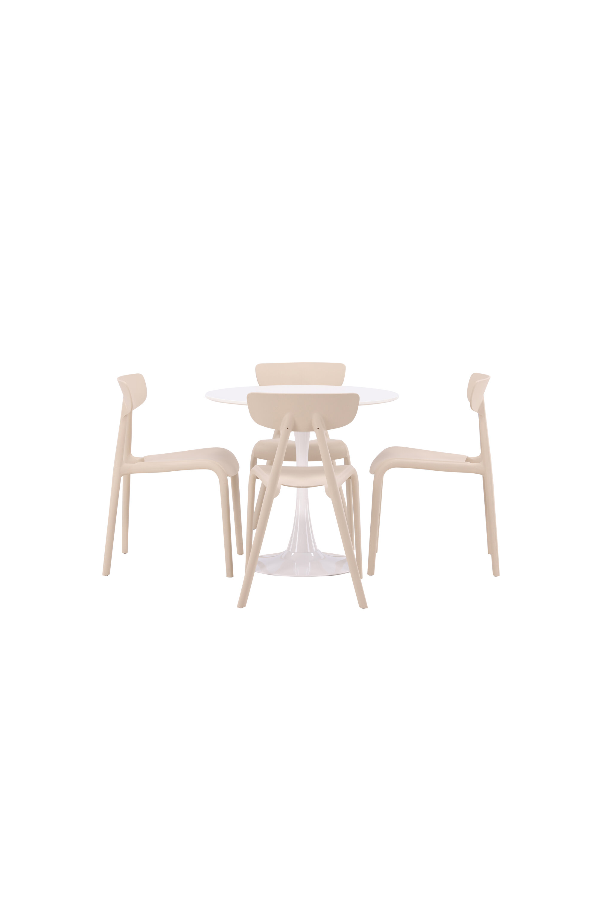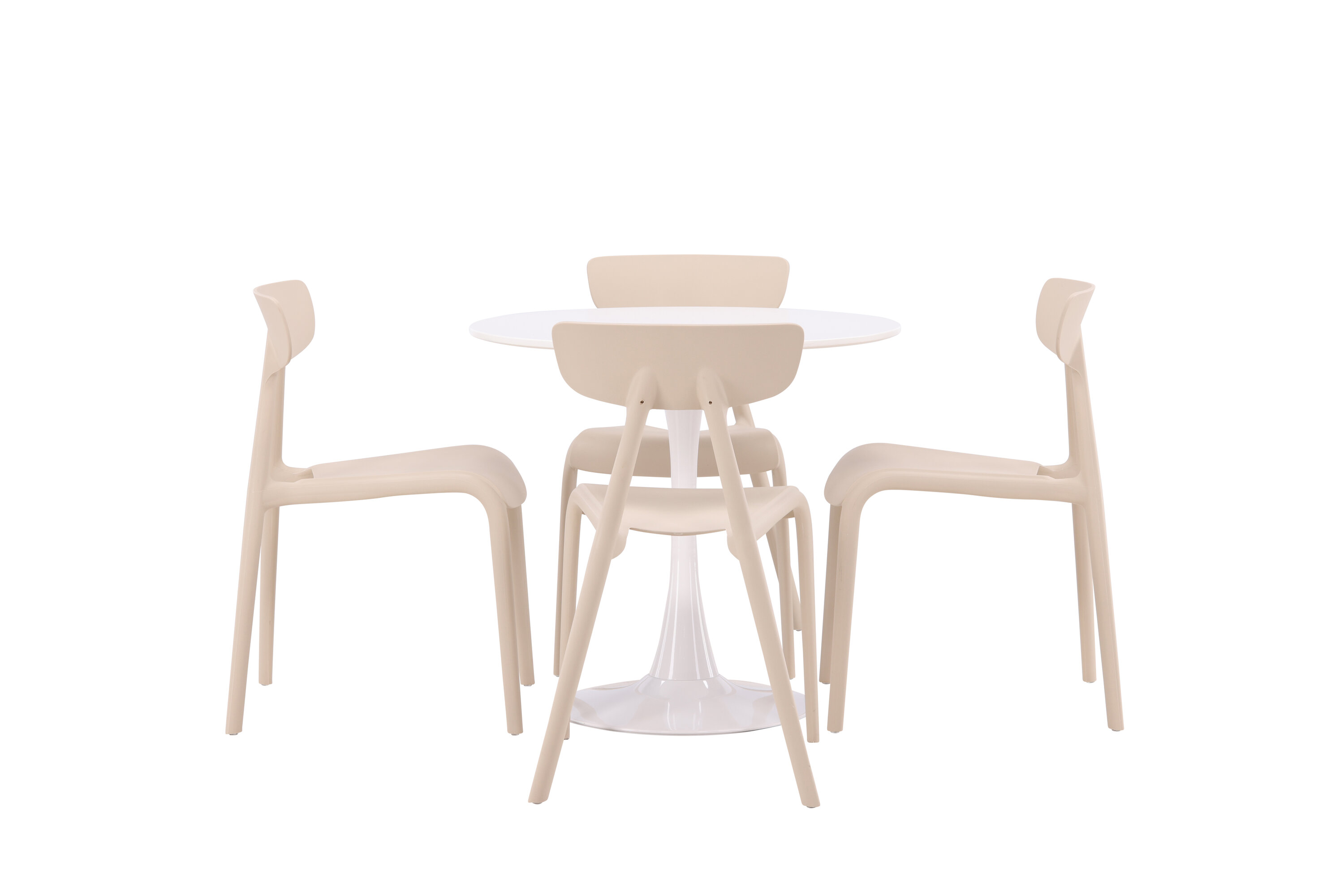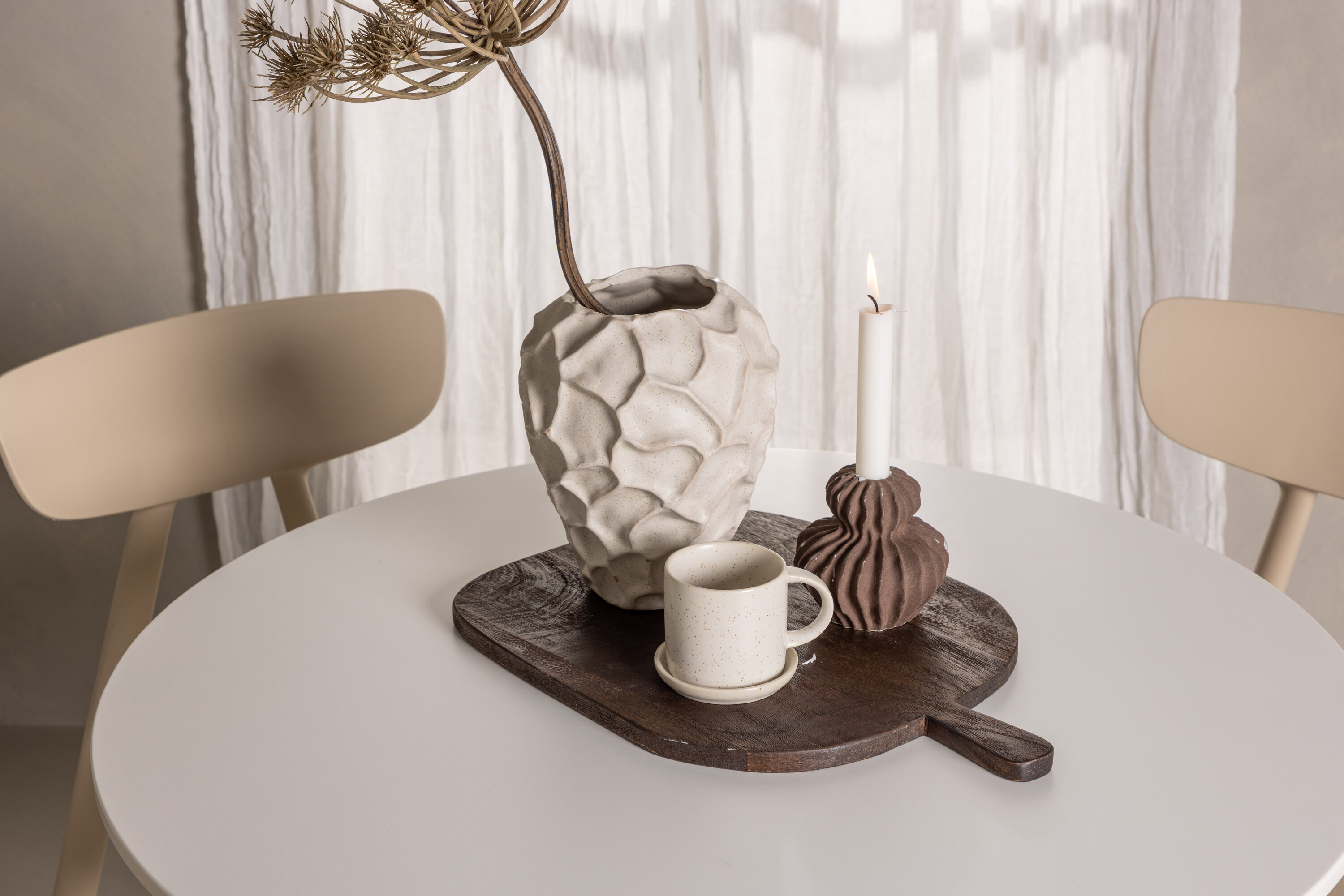 Kogege harmoonilist einestamiskogemust Venture Home’i eksklusiivse söögikomplektiga. See moodne ja stiilne grupp koosneb elegantsest Hamdeni lauast ja neljast mugavast naturaalses värvitoonis Ursholmen toolist. Hamdeni laud loob oma ümmarguse valge lauaga, mille kõrgus on 75 cm ja läbimõõt on 80 cm, ruumis avatud ja helge atmosfääri. Laud on valmistatud MDF-plaadist, mis tagab sileda ja ühtlase pinna.