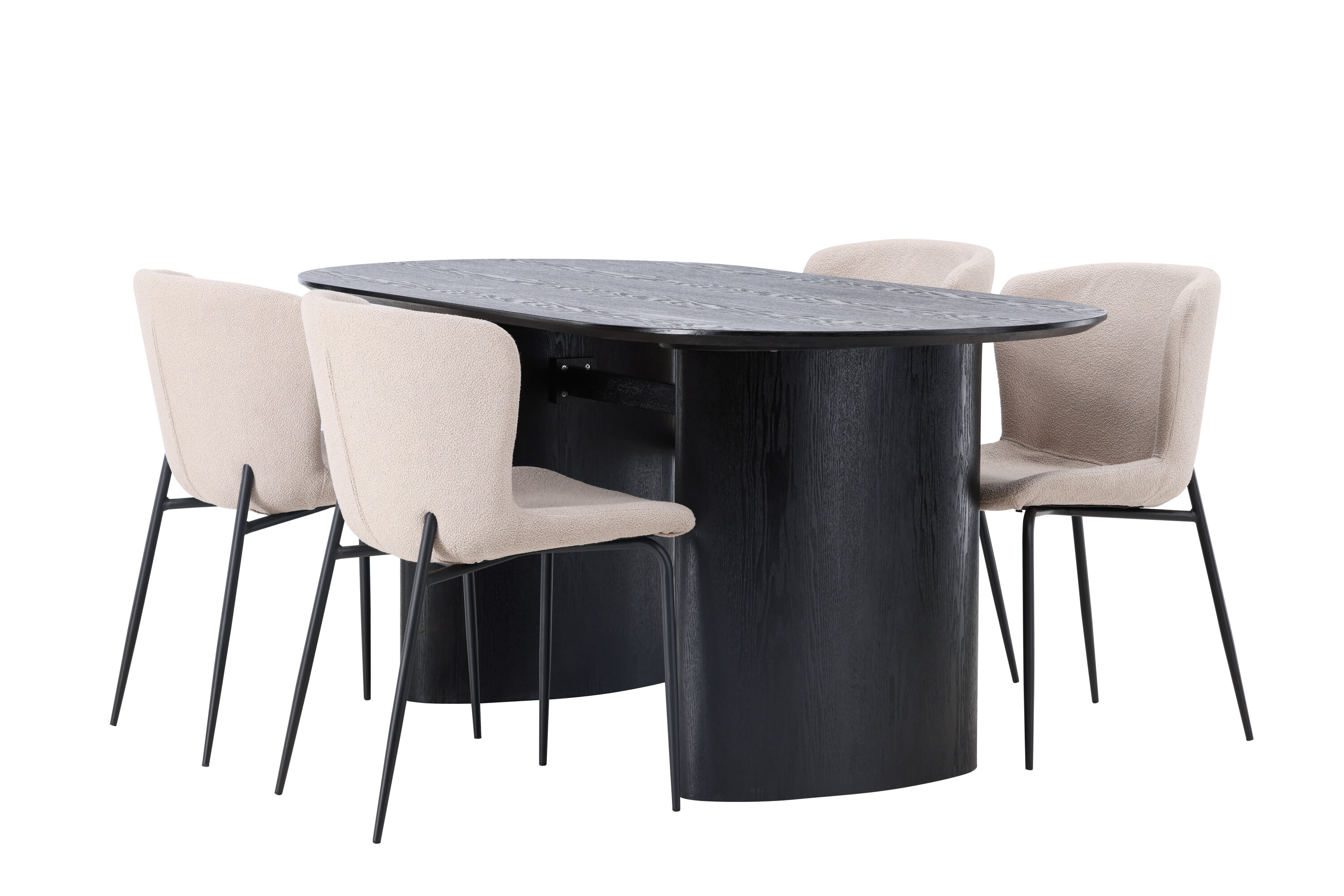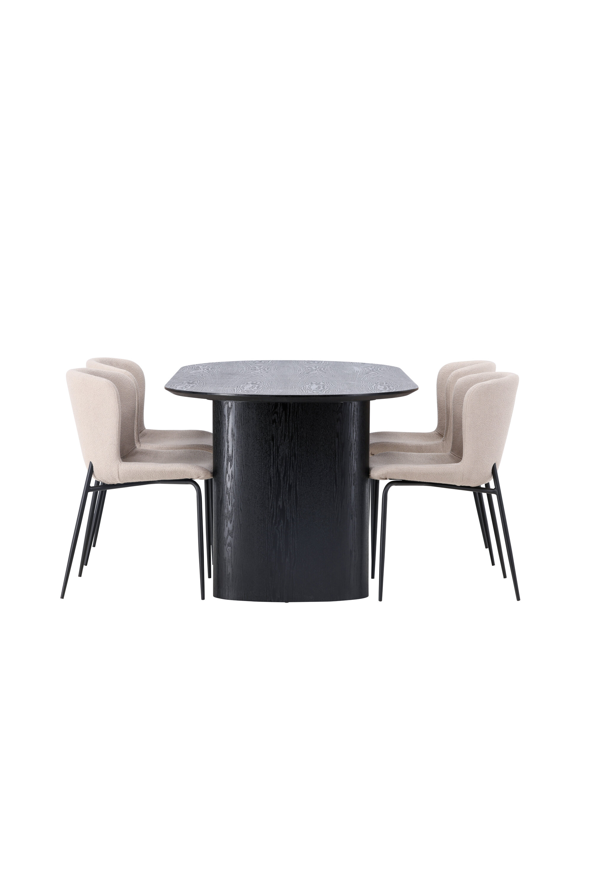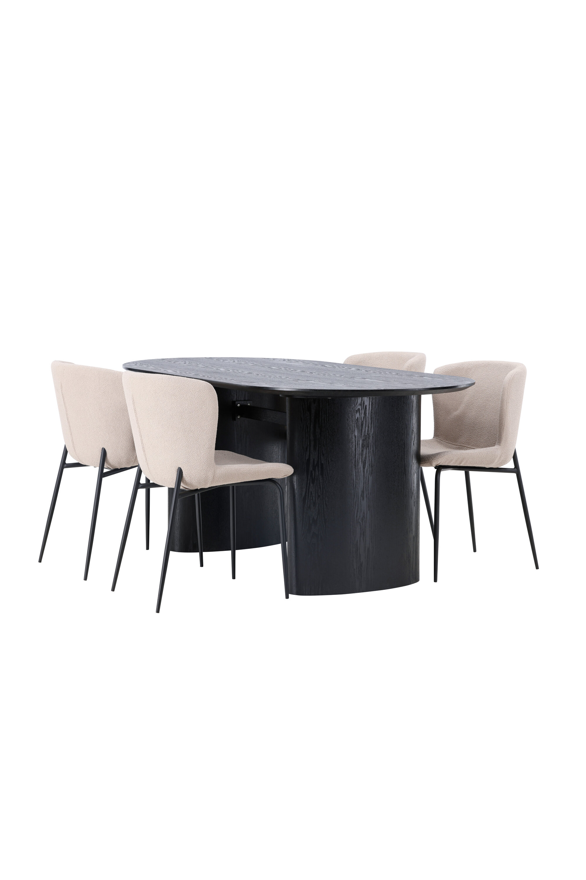 Istu mugavalt ja sisusta kaasaegselt! Musta värvi ovaalne söögilaud Isolde on moodsa disainiga ovaalse MDF-plaadist lauaplaadi ja tugeva raamiga, mis jätab ühtlase mulje. Elav materjal annab pilgupüüdjale armsa liikumise. Siin koos Modesto sarja moeteadlike söögitoolidega. Tool on täielikult polsterdatud beeži karvakangaga ja stiilsed kitsad mustast metallist jalad. Kergelt ümar seljatugi ja polsterdatud istmepadi pakuvad lisamugavust ja pikendavad söögilaua ümber mõnusaid eineid. Laua mõõdud: 180x75cm.