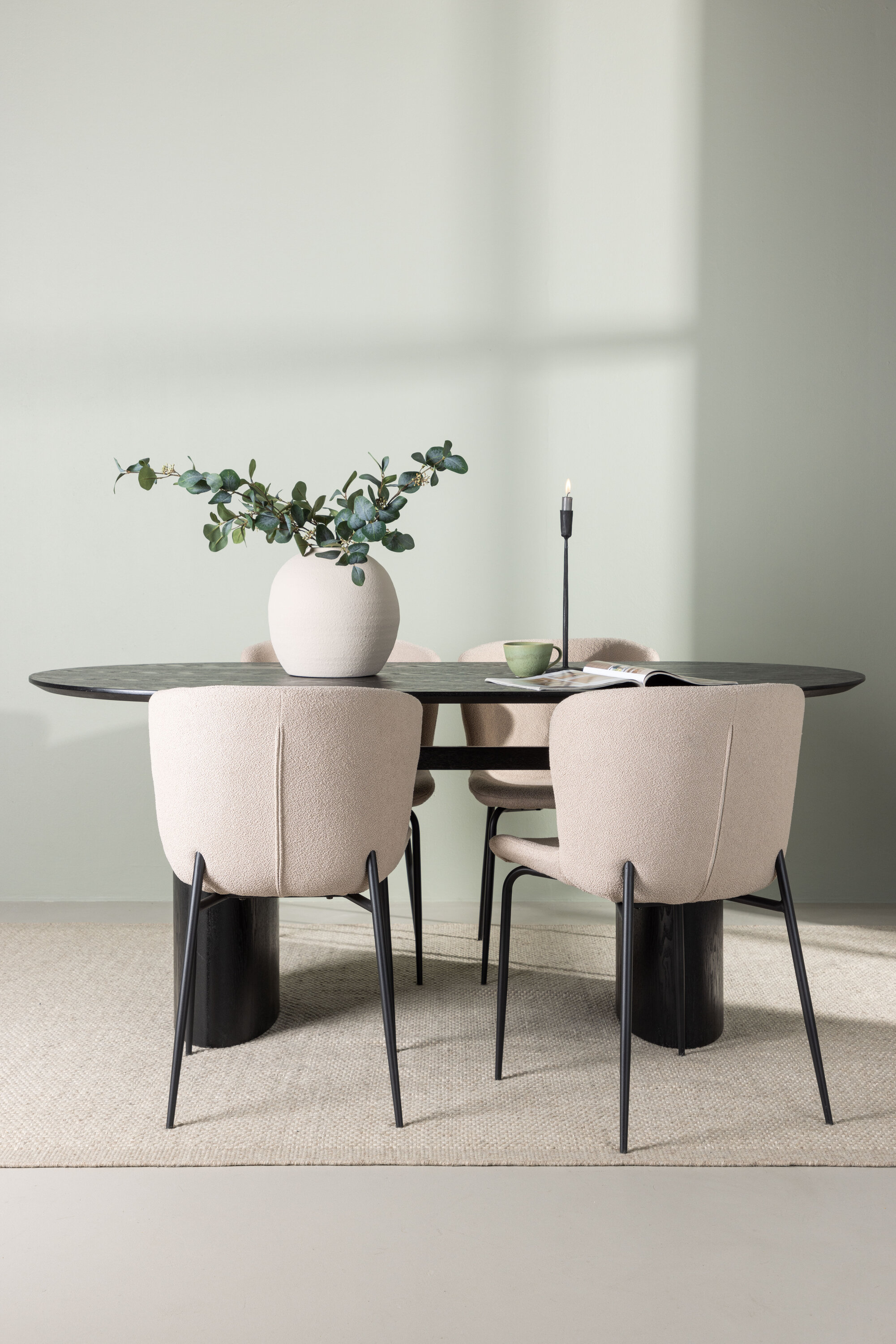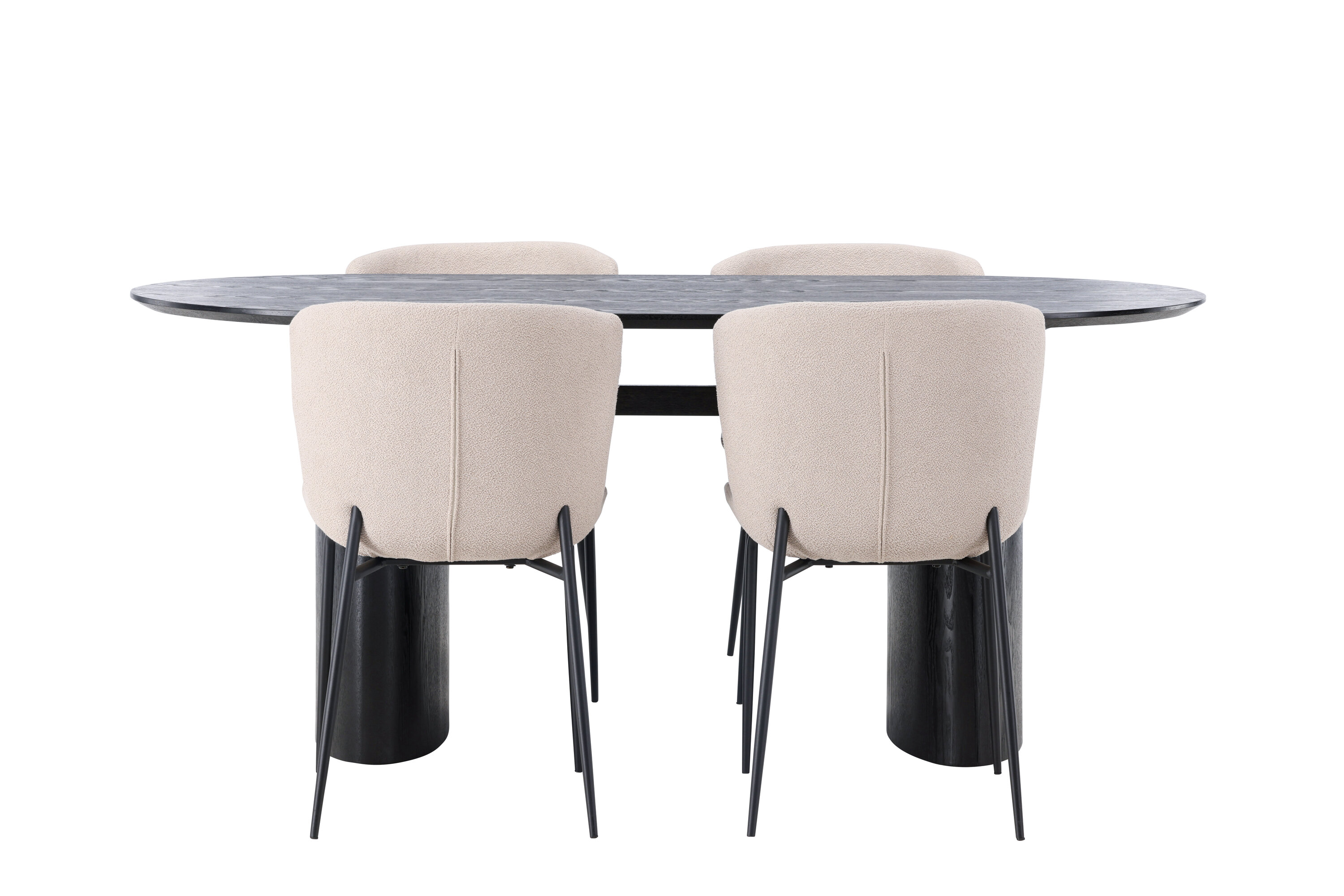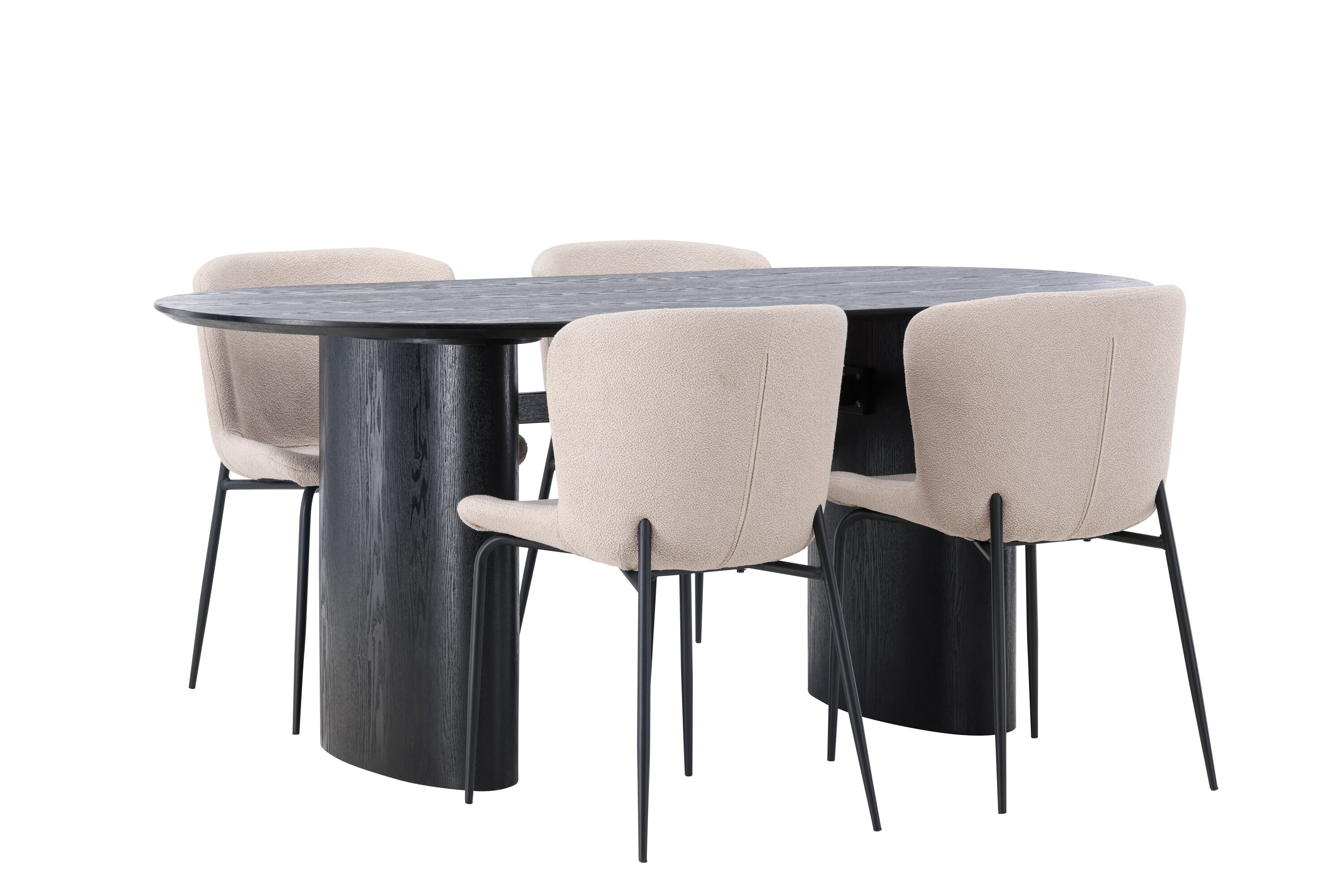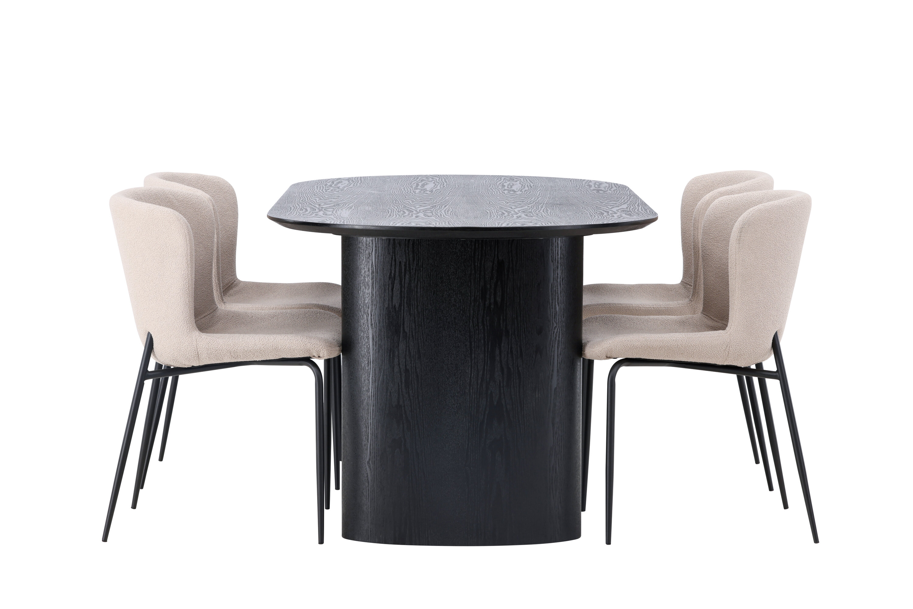 Istu mugavalt ja sisusta kaasaegselt! Musta värvi ovaalne söögilaud Isolde on moodsa disainiga ovaalse MDF-plaadist lauaplaadi ja tugeva raamiga, mis jätab ühtlase mulje. Elav materjal annab pilgupüüdjale armsa liikumise. Siin koos Modesto sarja moeteadlike söögitoolidega. Tool on täielikult polsterdatud beeži karvakangaga ja stiilsed kitsad mustast metallist jalad. Kergelt ümar seljatugi ja polsterdatud istmepadi pakuvad lisamugavust ja pikendavad söögilaua ümber mõnusaid eineid. Laua mõõdud: 180x75cm.