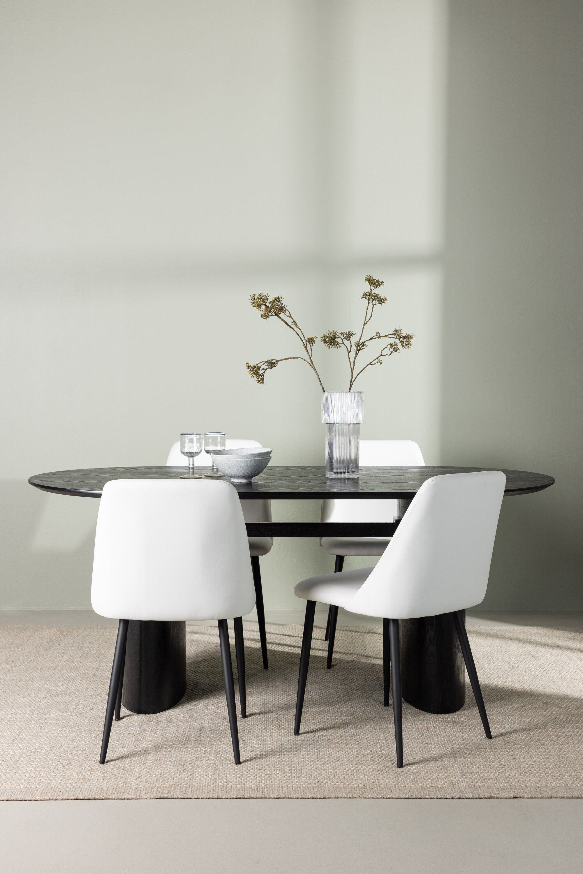 See on matš! Musta värvi ovaalne söögilaud Isolde on moodsa disainiga ovaalse MDF-plaadist lauaplaadi ja tugeva raamiga, mis jätab ühtlase mulje. Elav materjal annab pilgupüüdjale armsa liikumise. Siin stiilses kombinatsioonis valgete söögitoolidega sarjast Night. Toolil on täielikult polsterdatud valge PU-polsteriga iste, mis tundub sama luksuslik kui elegantne, ja jalad on mustast terasest. Iste on täiendava mugavuse tagamiseks polsterdatud. Vältige kompromisse stiili ja mugavuse vahel! Laua mõõdud: 180x75cm.