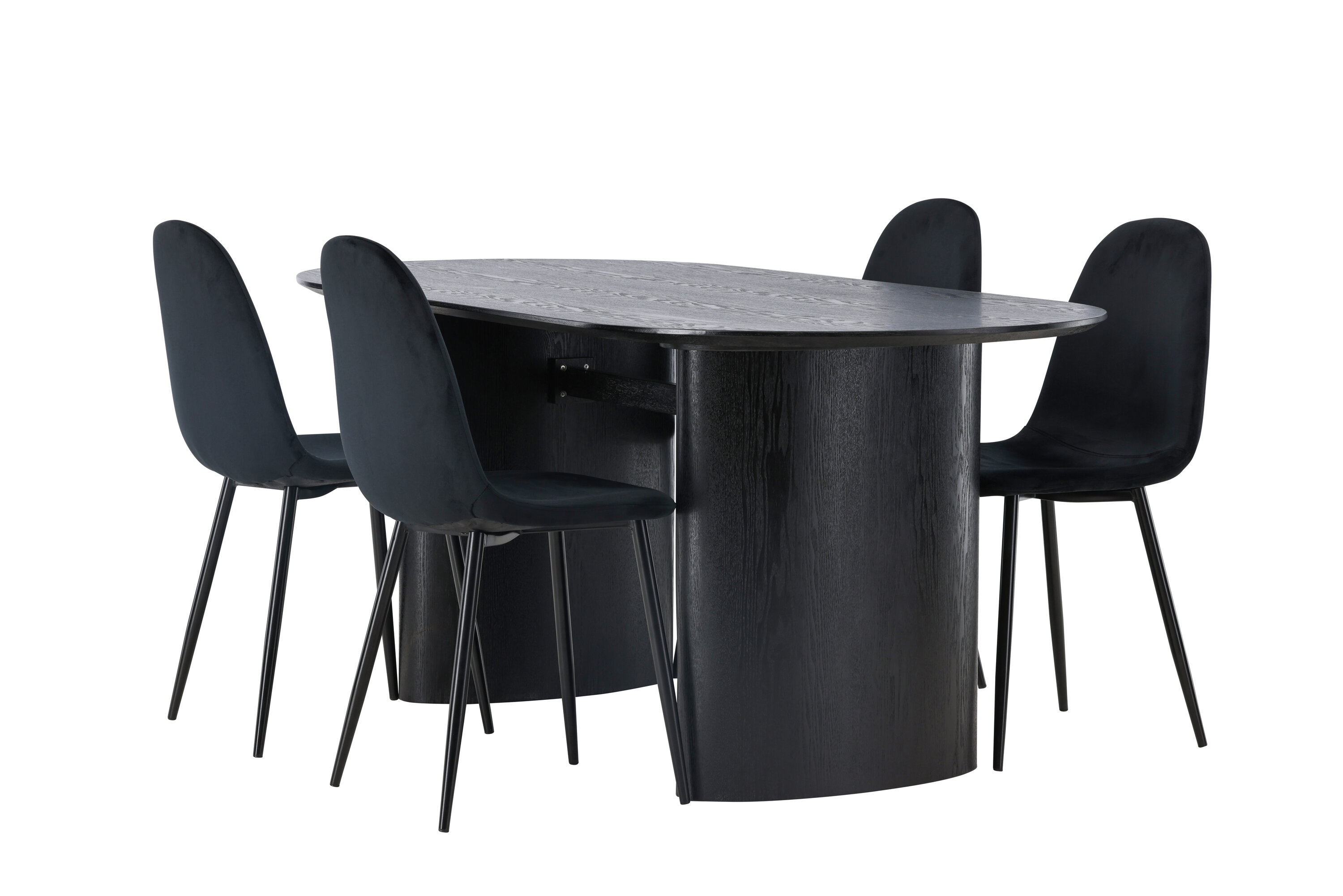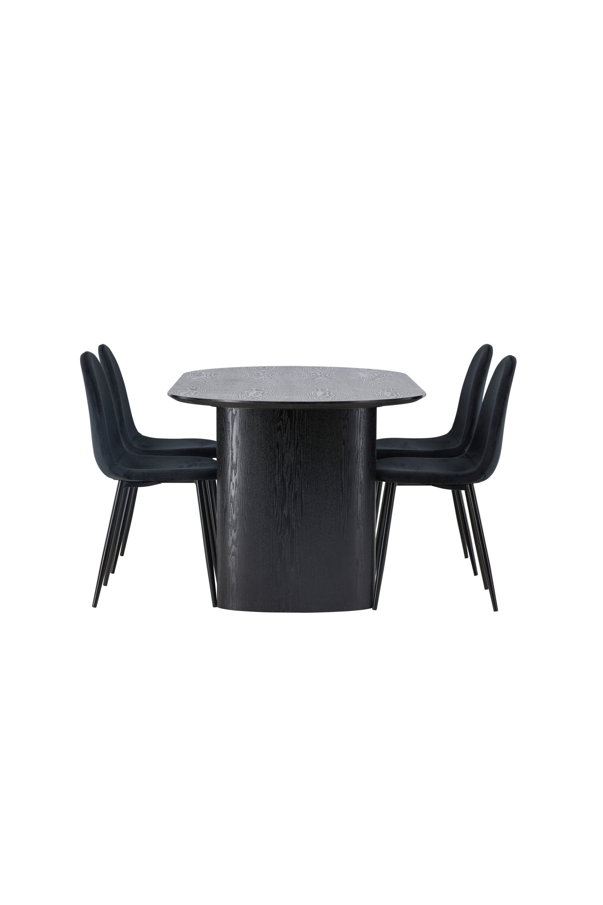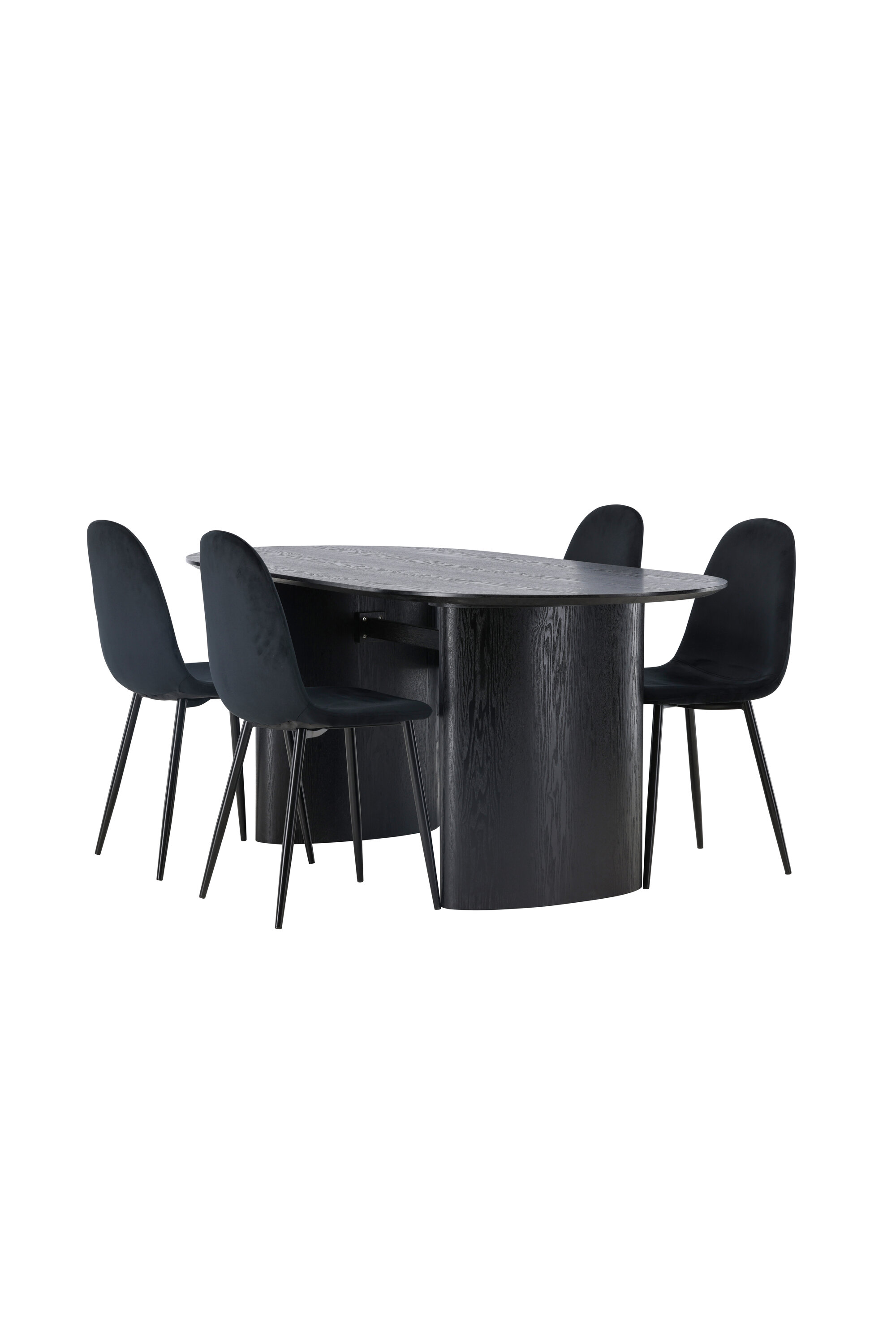 Trendikas musta värvi söögigrupp! Musta värvi ovaalne söögilaud Isolde on moodsa disainiga ovaalse MDF-plaadist lauaplaadi ja tugeva raamiga, mis jätab ühtlase mulje. Elav materjal annab pilgupüüdjale maitseka liikumise. Siin stiilne kombinatsioon Polari sarja mustade söögitoolidega. Toolil on täielikult polsterdatud disain, jalad on mustast pulbervärvitud metallist ning ümar seljatugi ja iste on mustast sametkangast pehme polstriga. See söögigrupp tundub nii isiklik kui ka kutsuv! Laua mõõdud: 180x75cm.