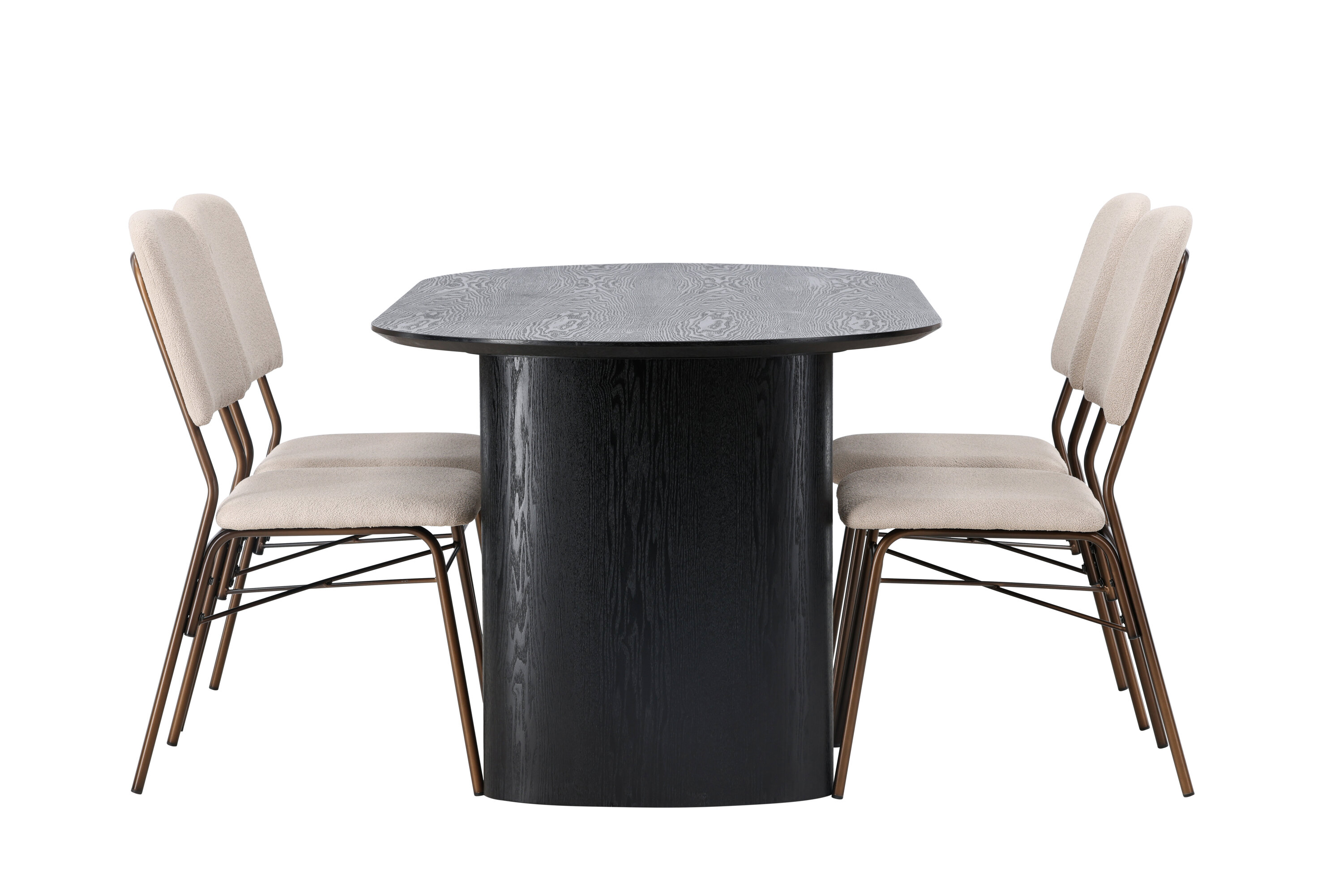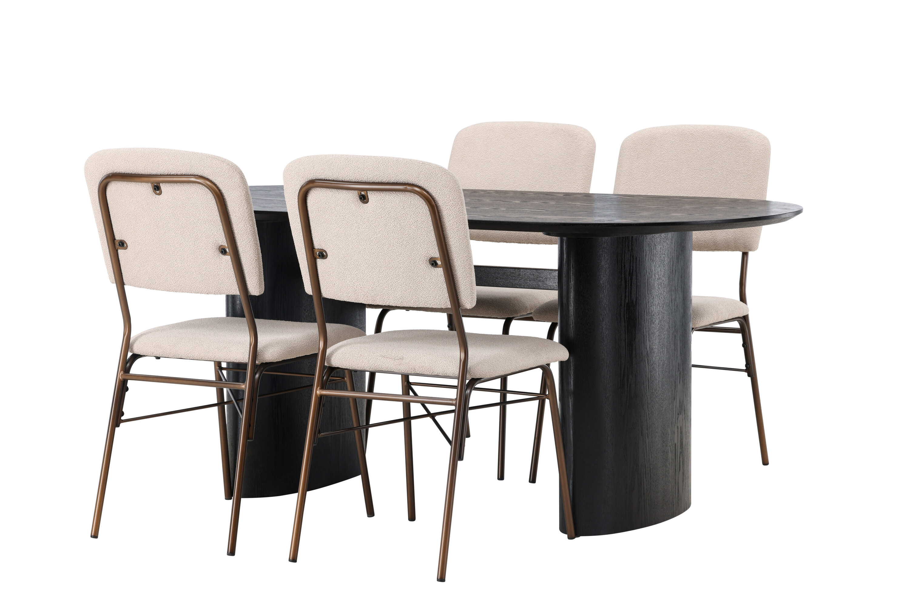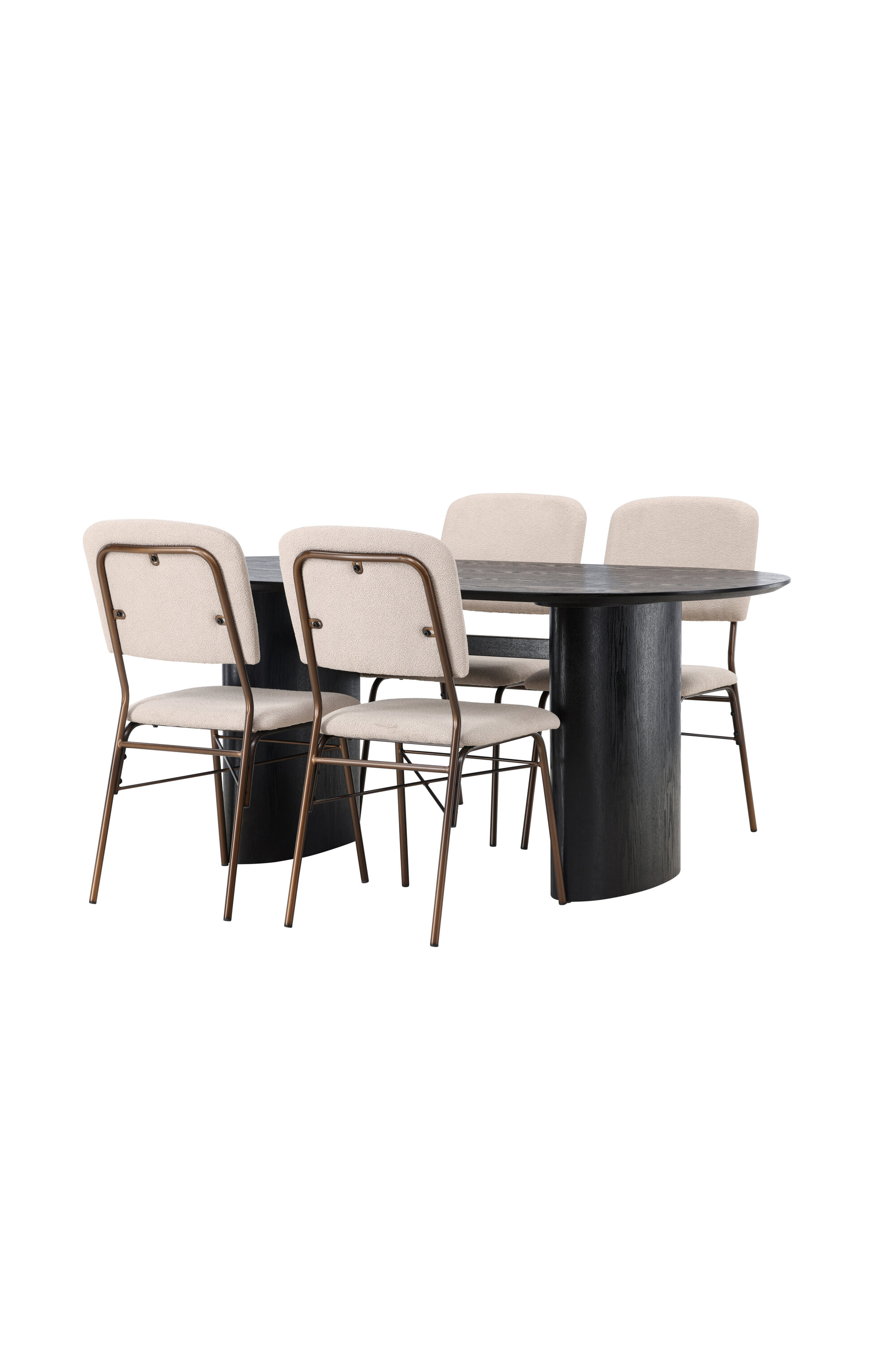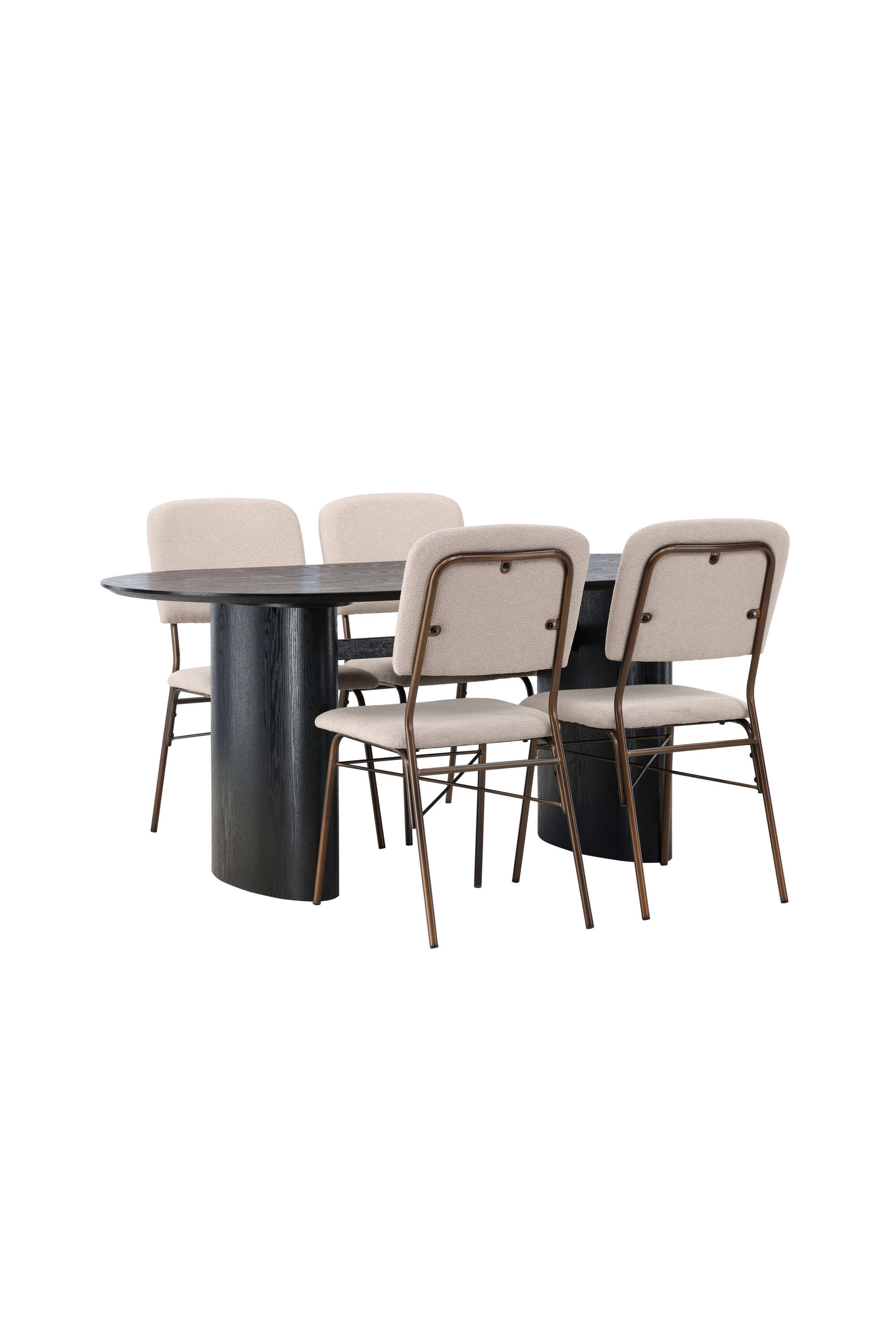 Ühenda kaasaegsed vormid vastupidavate materjalidega! Musta värvi ovaalne söögilaud Isolde on moodsa disainiga ovaalse MDF-plaadist lauaplaadi ja tugeva raamiga, mis jätab ühtlase mulje. Elav materjal annab pilgupüüdjale armsa liikumise. Siin moodsas kombinatsioonis Seda sarja beežide söögitoolidega. Tool on beežist polüesterkangast ja jalad tumepruunist terasest. Sellest paremaks ei lähe! Laua mõõdud: 180x75cm.