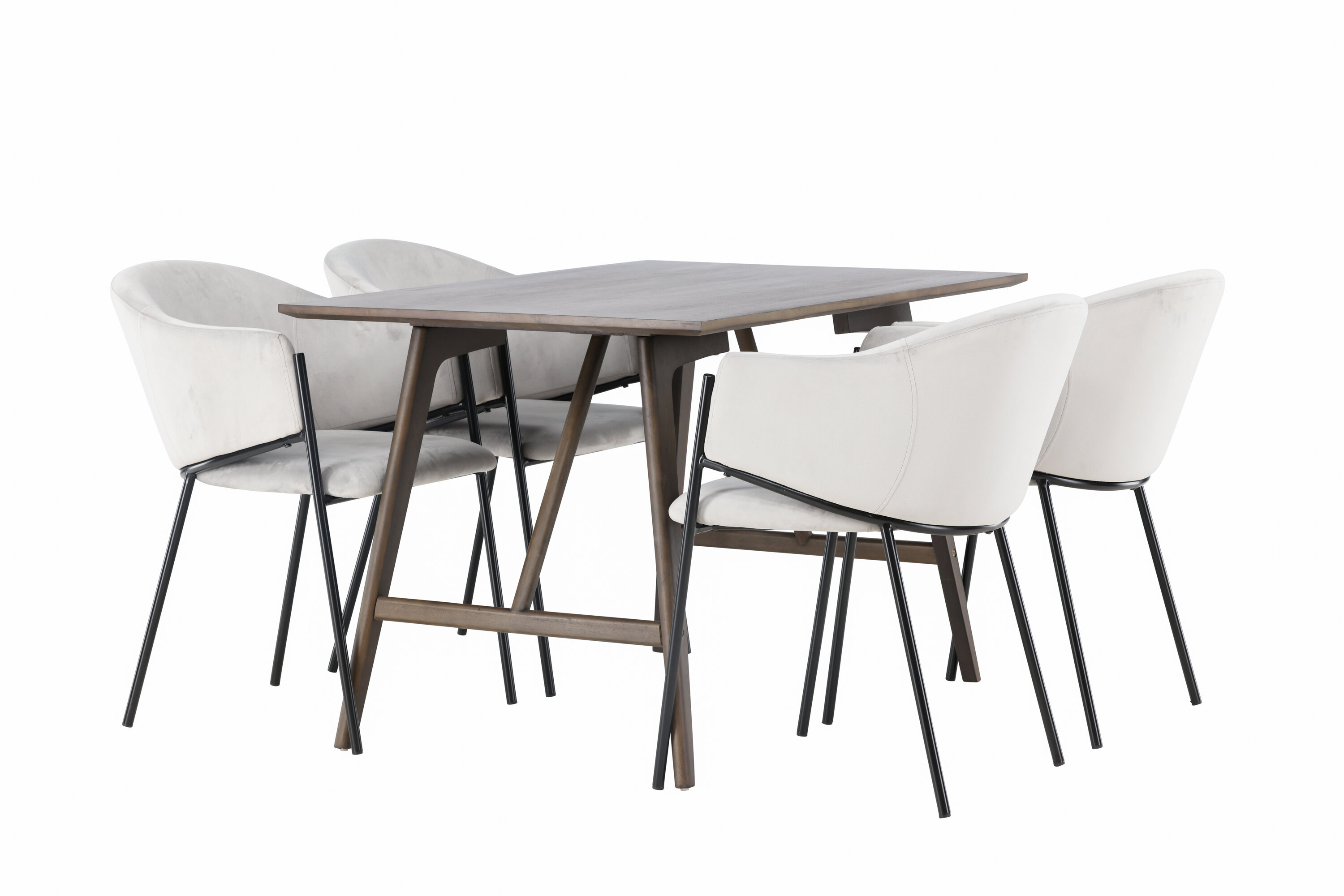 Koos meie moodsate Evelina sarja söögitoolidega loote tervikliku söögikomplekti, mis avaldab muljet. Helehalli sametkangast täielikult polsterdatud iste pakub pehmet ja luksuslikku tunnet. Kumer seljatugi pakub lisamugavust, lisades samal ajal toolile stiilse ilme. Tooli minimalistlik must terasraam loob modernse kontrasti heleda istmega, muutes selle stiilseks fookuspunktiks.