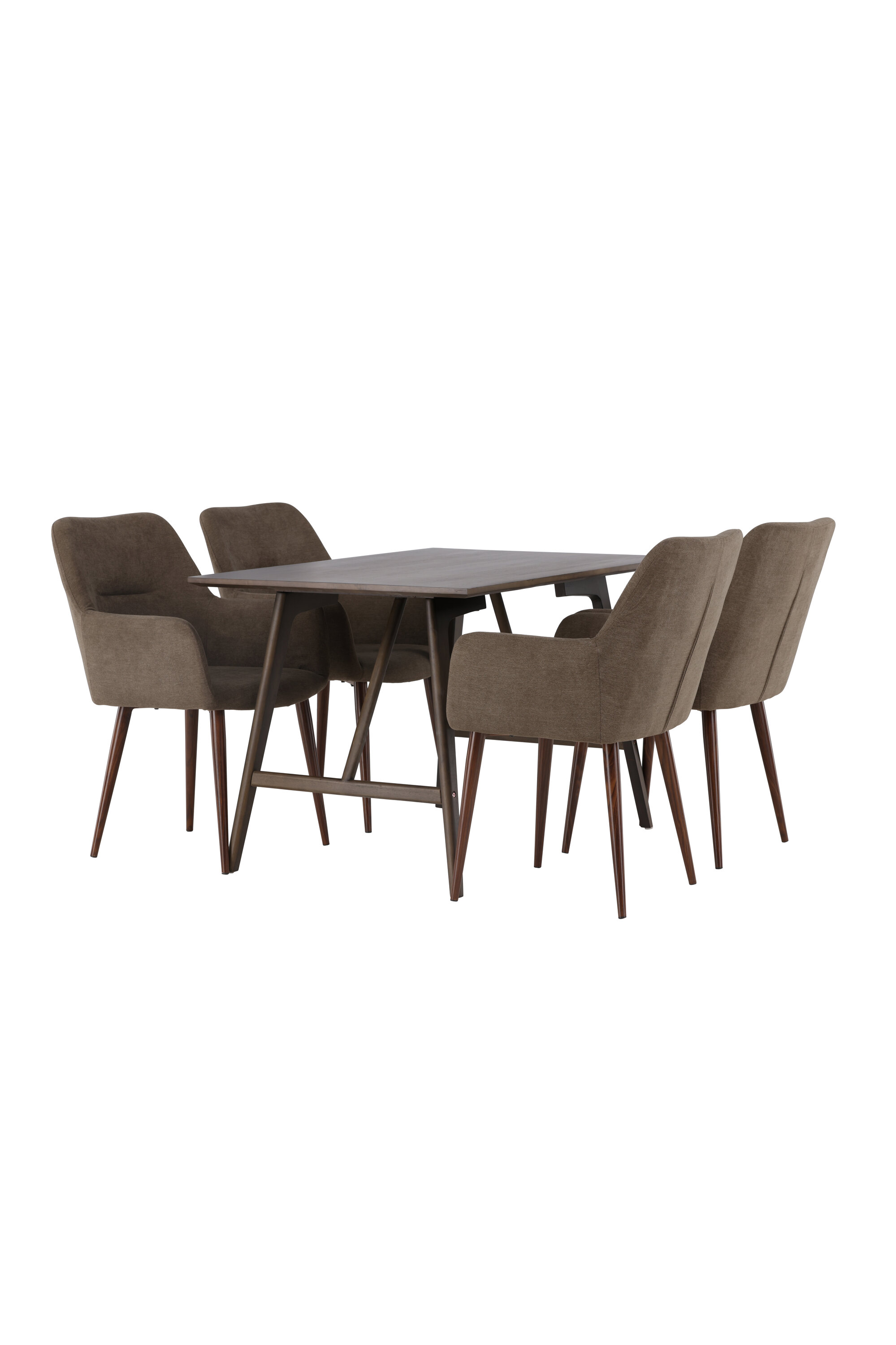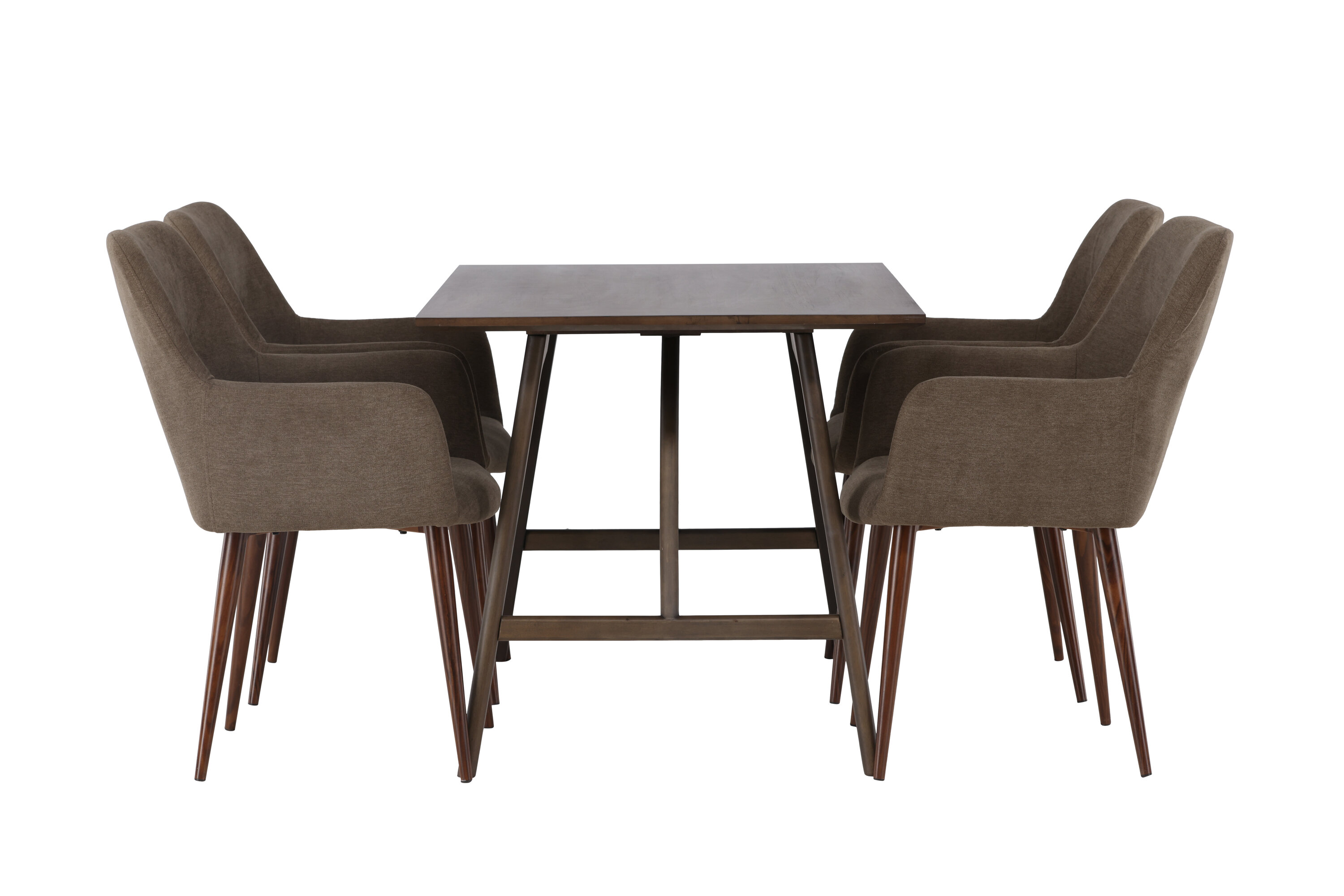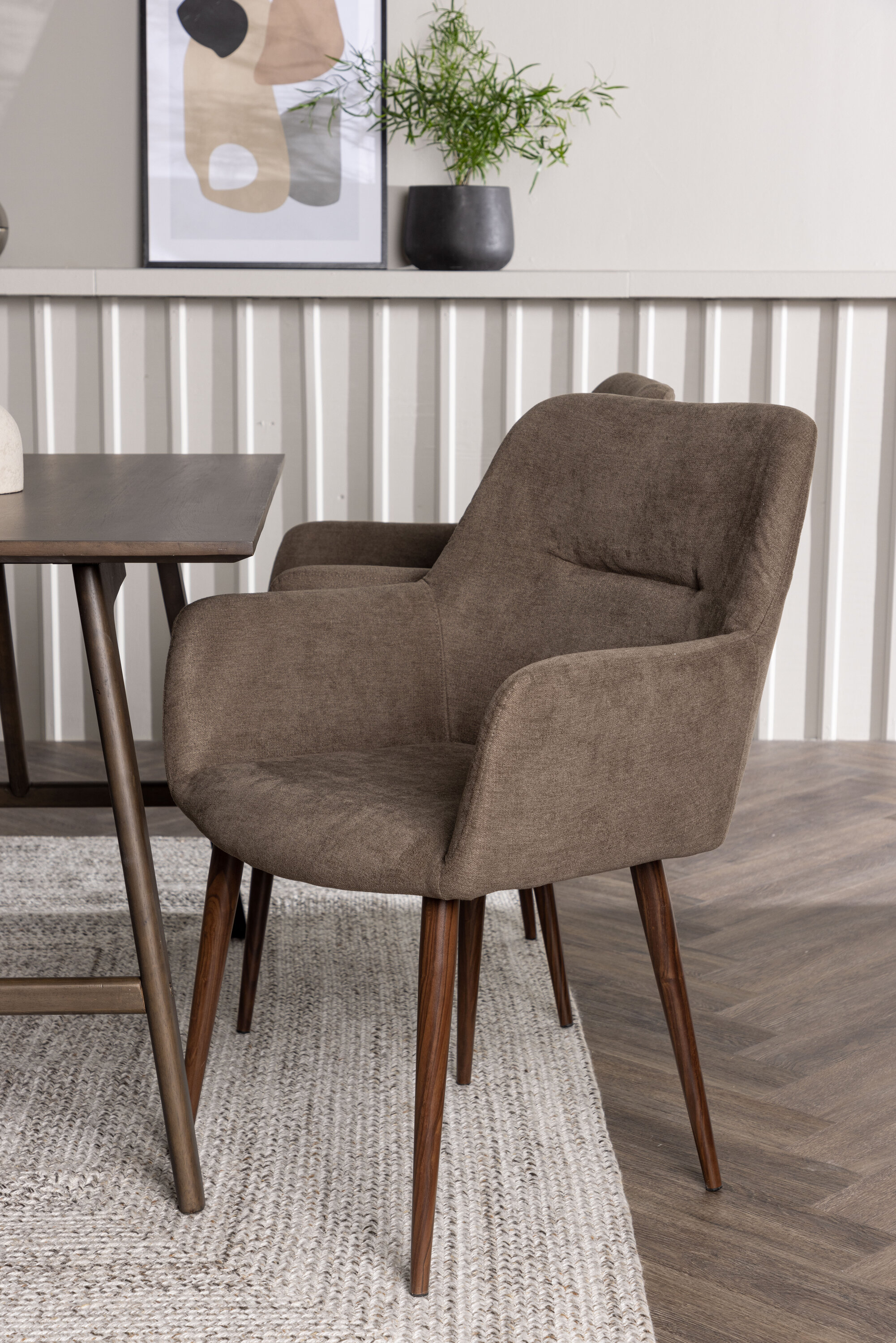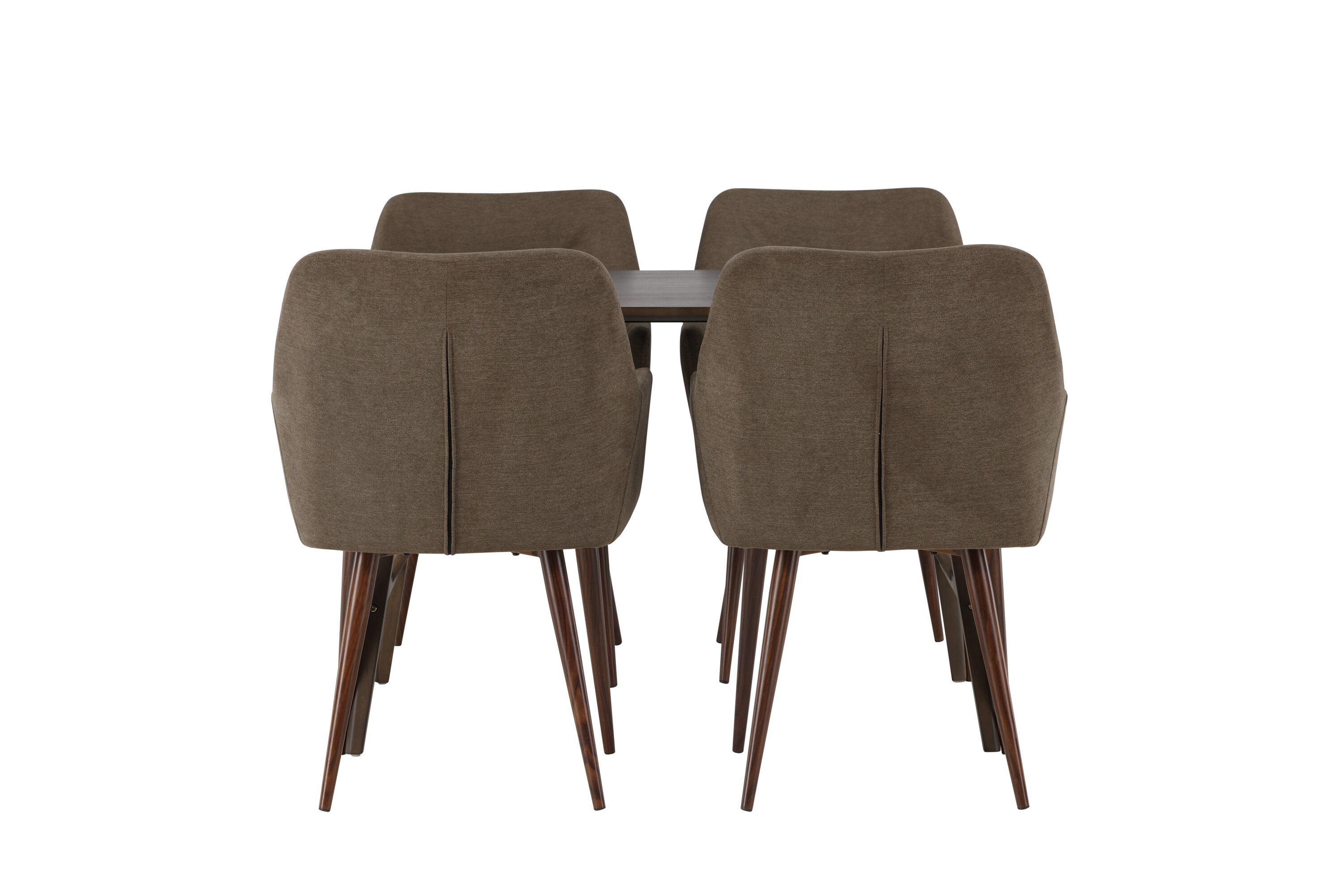 Siin on täiuslikus kombinatsioonis Tomorrow sarja söögitoolid. Tooli täielikult polsterdatud pruunist polüesterkangast iste annab pehme ja luksusliku tunde, integreeritud käetoed aga täiendavat tuge ja mugavust. Moodsas pähklipruunis toonis toolijalad jätkavad laualt harmoonilist esteetikat, luues ühtse terviku.
