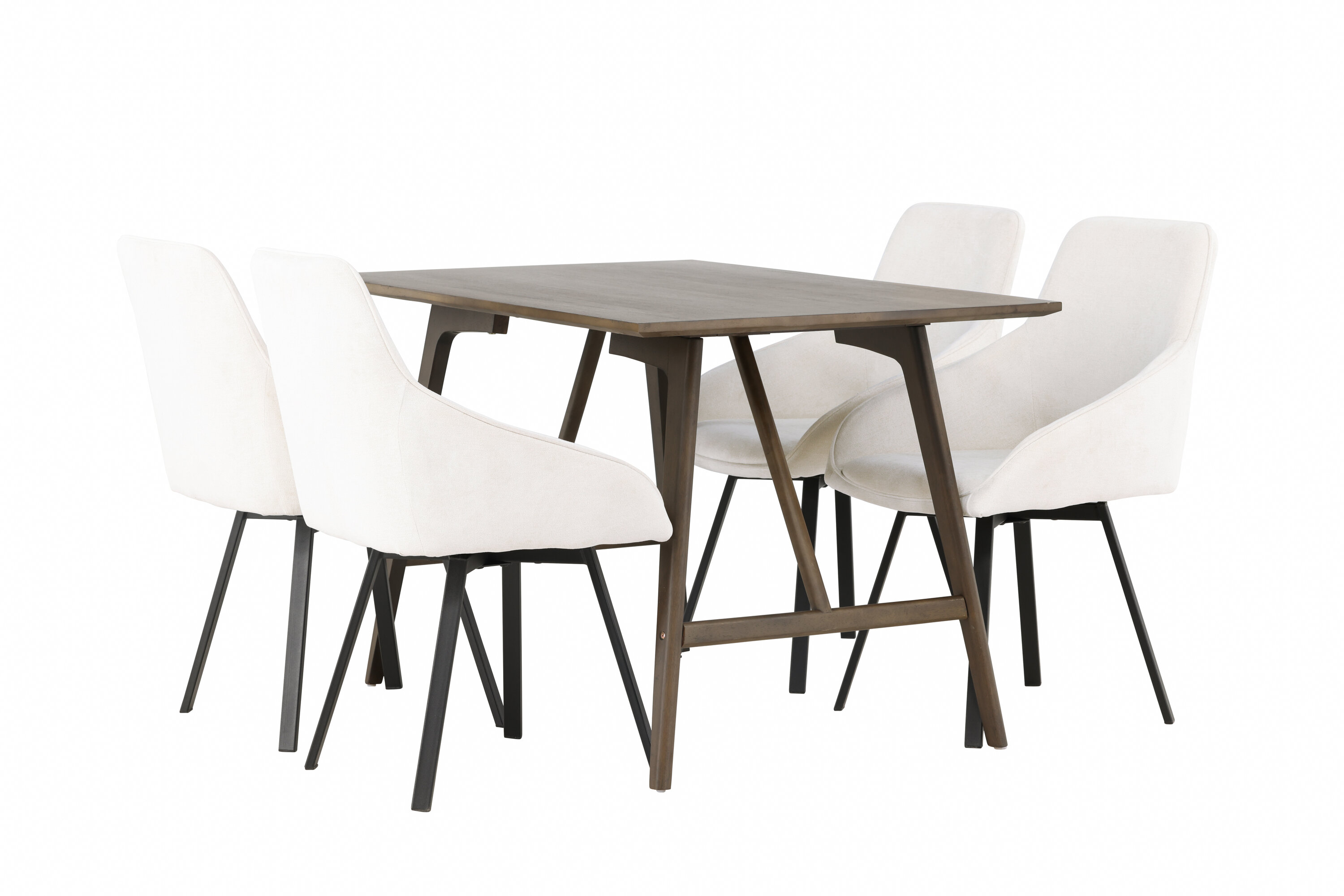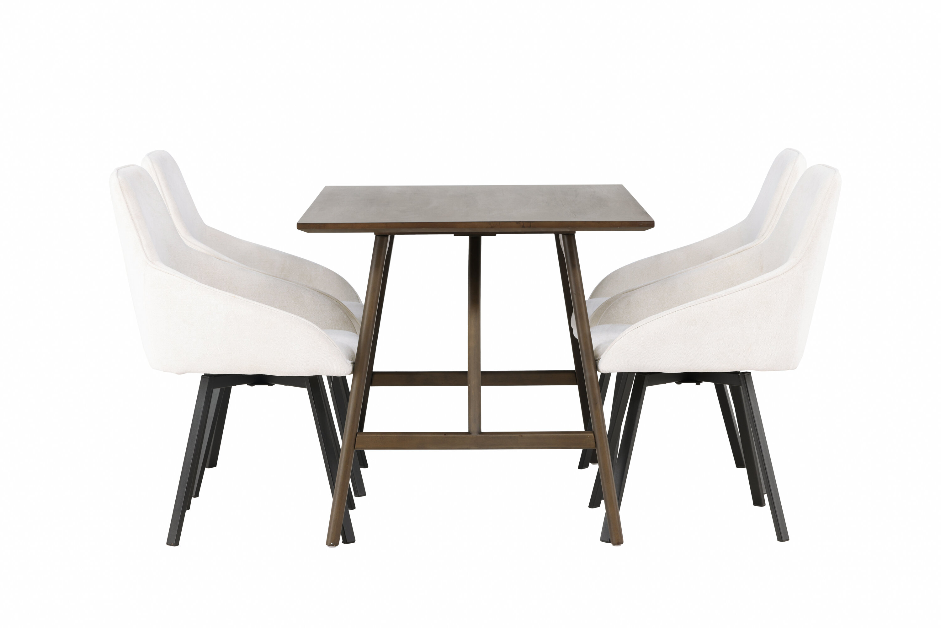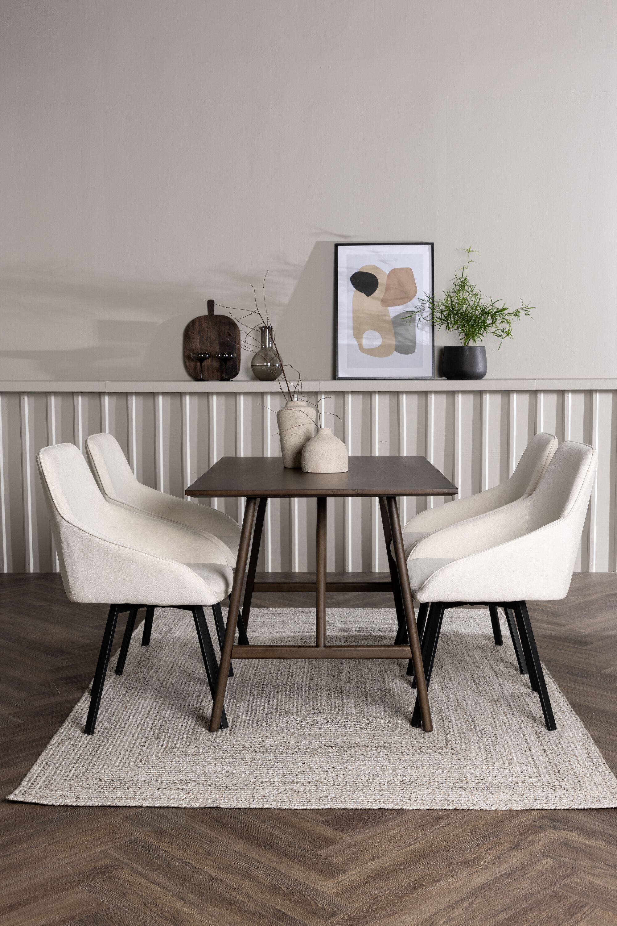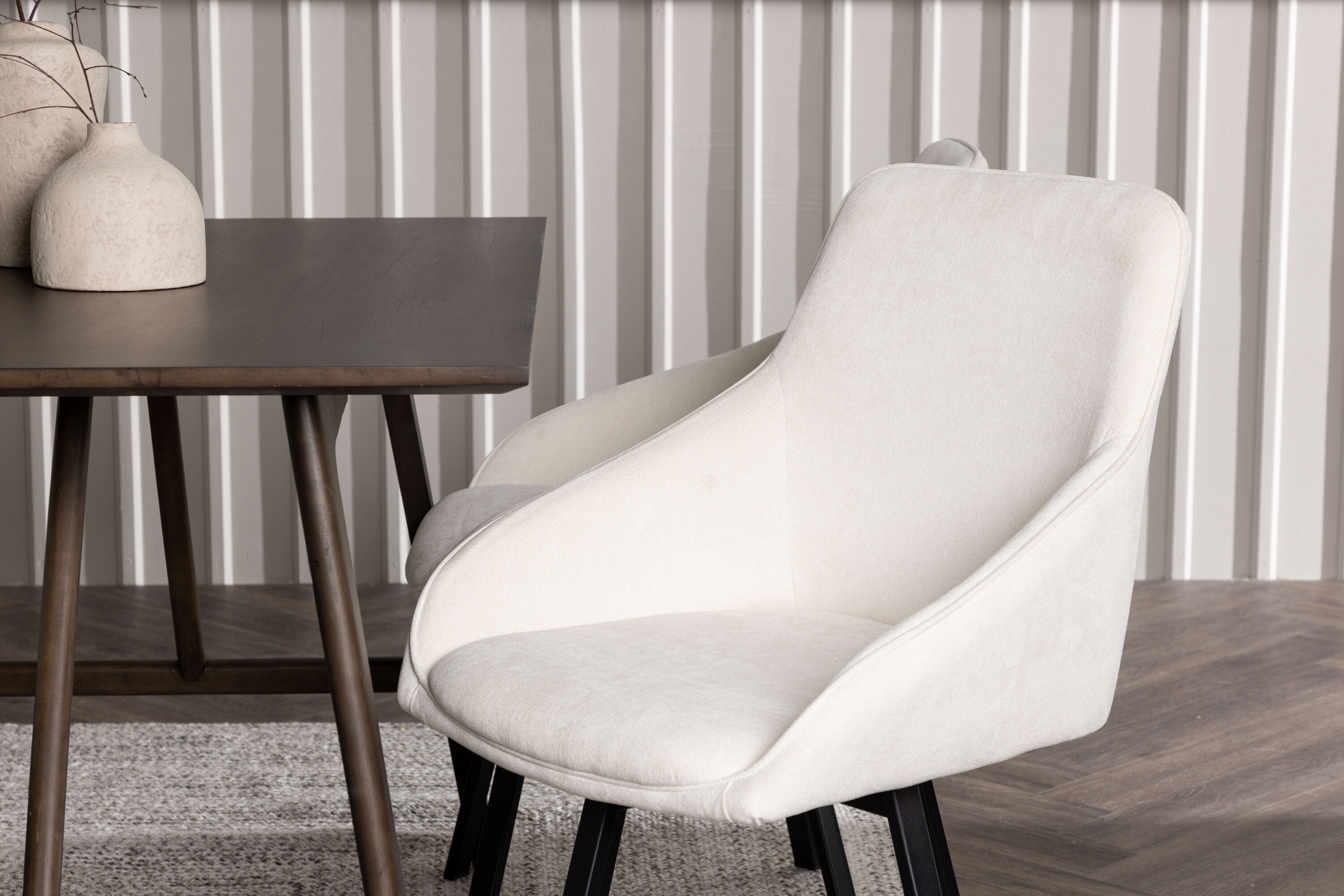 Siin on see stiilselt kombineeritud meie beežide söögitoolidega seeriast Rosie. Toolid pole mitte ainult stiilsed, vaid ka mugavad. Täielikult polsterdatud istmete ja pehmest beežist kangast integreeritud käetugedega Rosie toolid pakuvad maksimaalset mugavust ja tuge. Õrnalt laienevad mustad metallist toolijalad annavad moodsa välimuse, mis täiendab lauda suurepäraselt.
