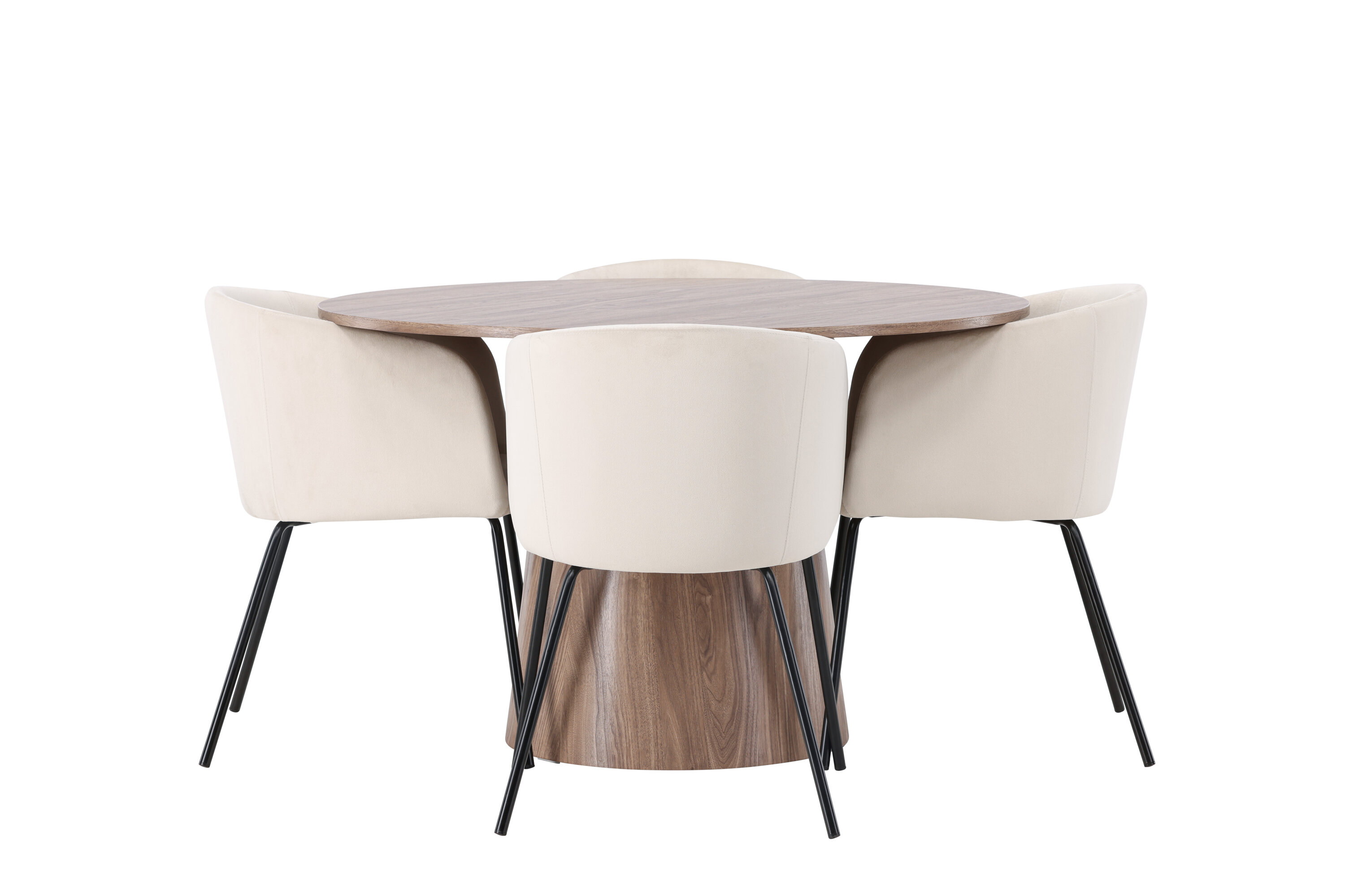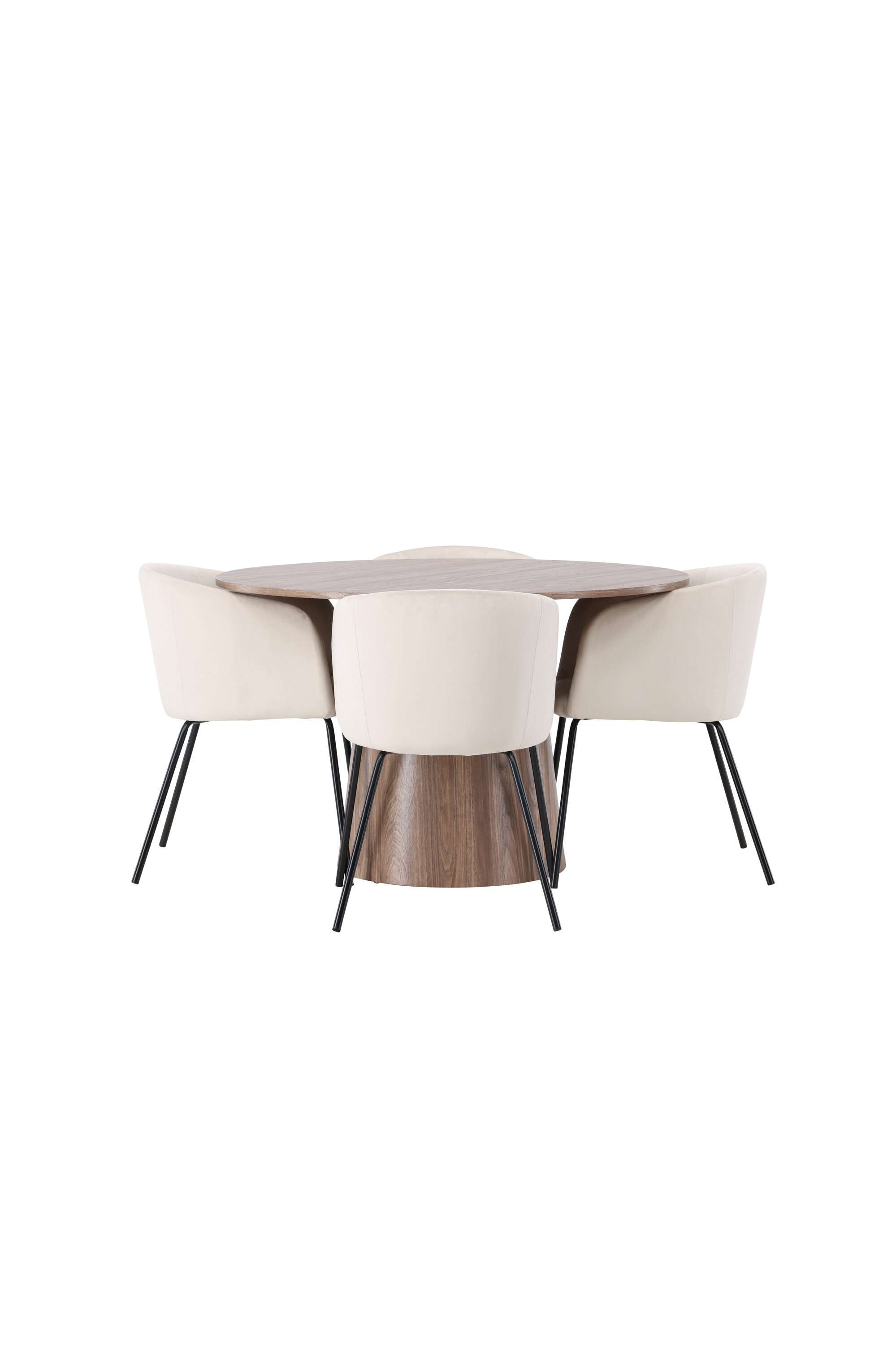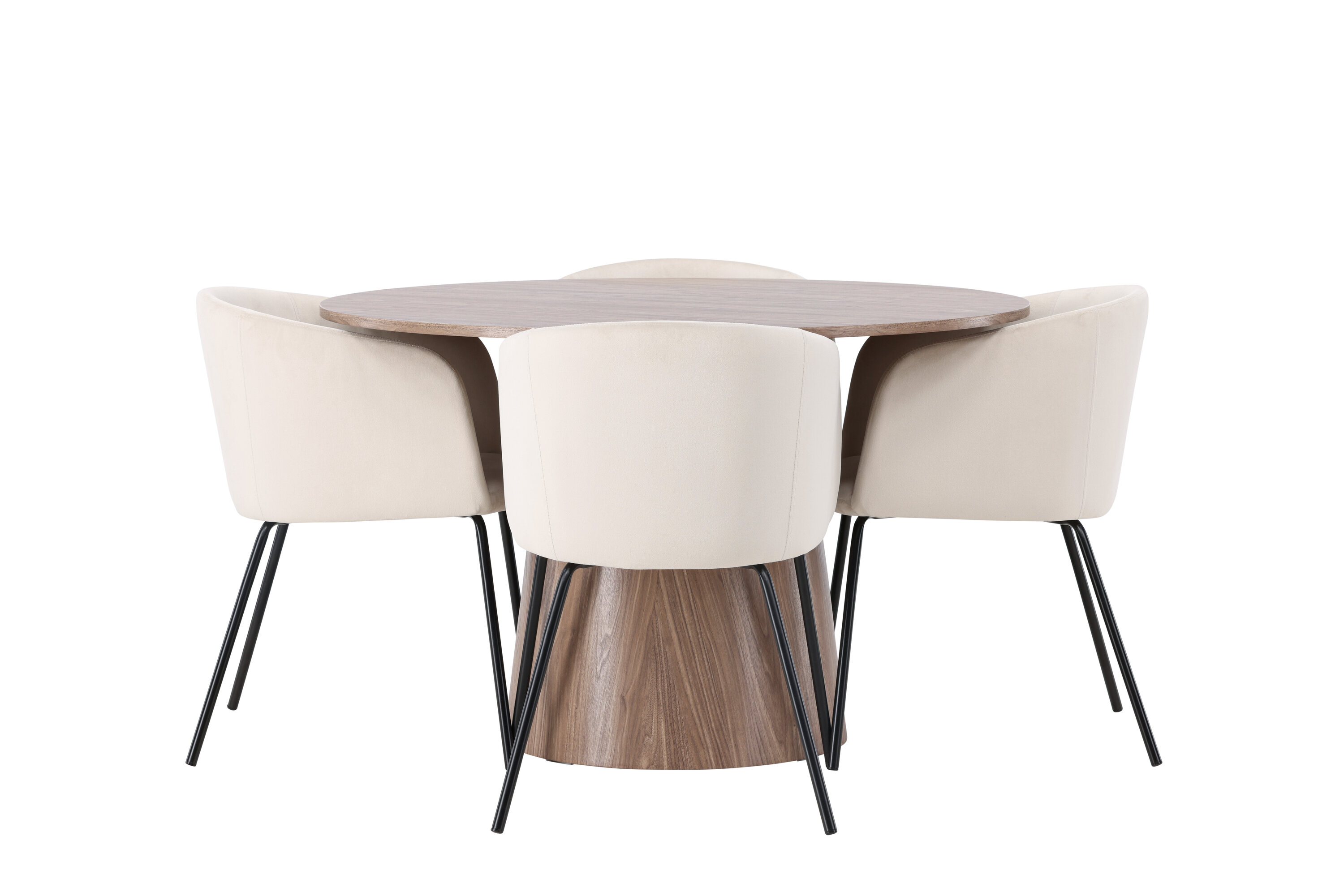 Lemmikkooslus paljudes kaasaegsetes kodudes! Meie imeline ümmargune söögilaud Lanzo on tervikliku MDF-disainiga, õhukese ülaosa ja keerutatud silindrilise raamiga, mis on tsentreeritud laua keskosa alla. Värvus on maalähedane ja teeb materjali mustri nähtavaks. Siin elegantses kombinatsioonis meie mugavate Berit söögitoolidega. Toolil on täielikult polsterdatud disain, millel on veidi ümardatud seljatugi ja iste beežist sametkangast ning kitsad mustast rauast jalad. Häid eineid nautima istudes peaks tunduma luksuslik! Laua läbimõõt: 120 cm.