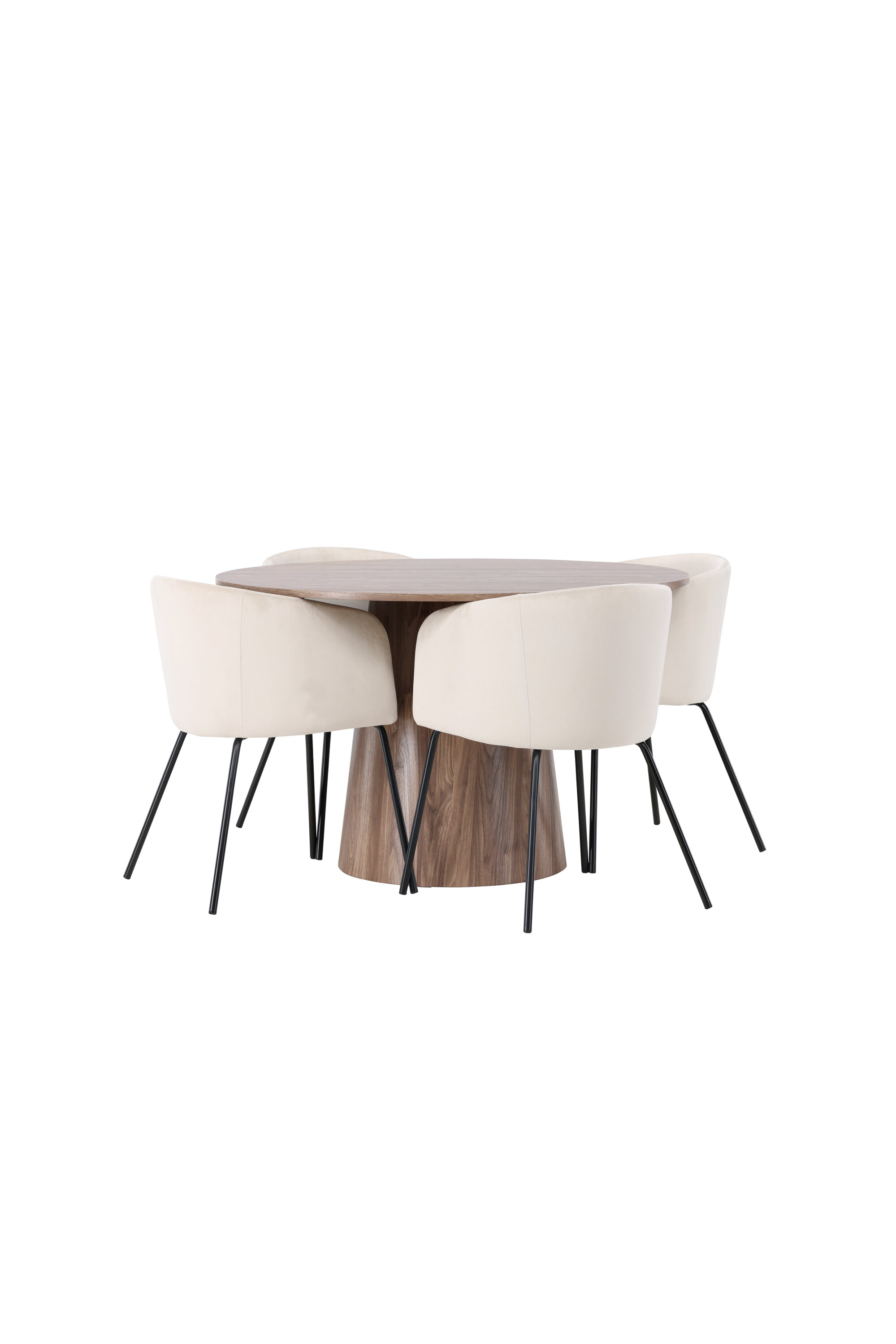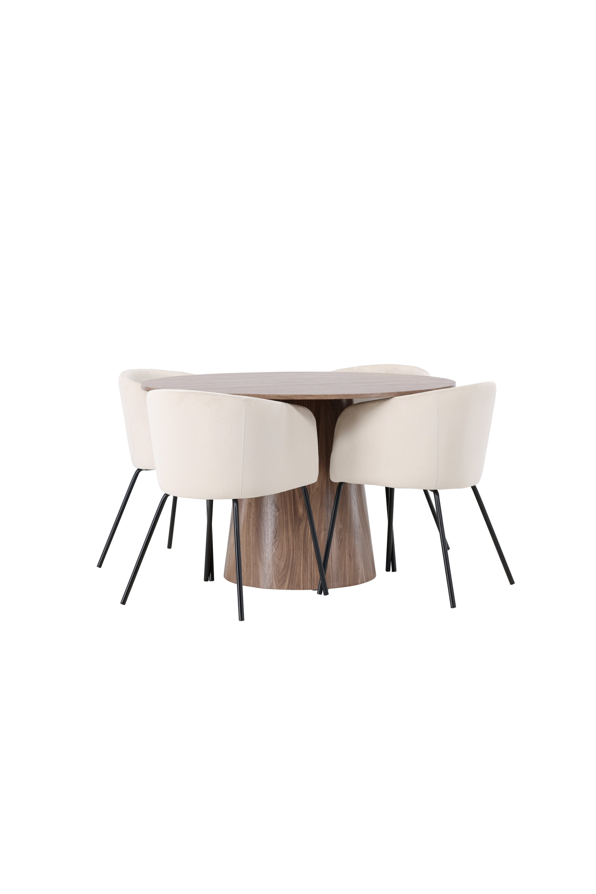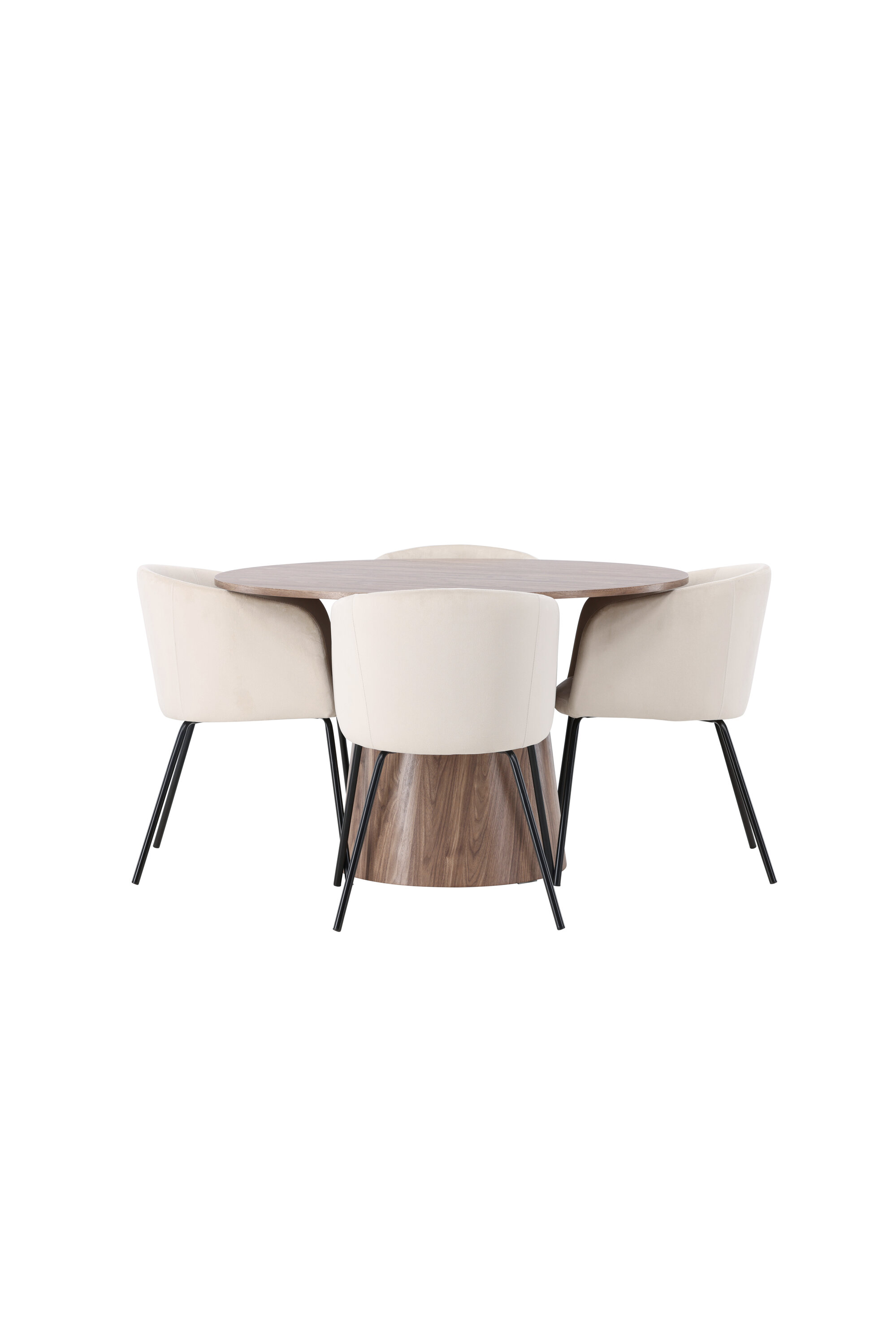 Lemmikkooslus paljudes kaasaegsetes kodudes! Meie imeline ümmargune söögilaud Lanzo on tervikliku MDF-disainiga, õhukese ülaosa ja keerutatud silindrilise raamiga, mis on tsentreeritud laua keskosa alla. Värvus on maalähedane ja teeb materjali mustri nähtavaks. Siin elegantses kombinatsioonis meie mugavate Berit söögitoolidega. Toolil on täielikult polsterdatud disain, millel on veidi ümardatud seljatugi ja iste beežist sametkangast ning kitsad mustast rauast jalad. Häid eineid nautima istudes peaks tunduma luksuslik! Laua läbimõõt: 120 cm.