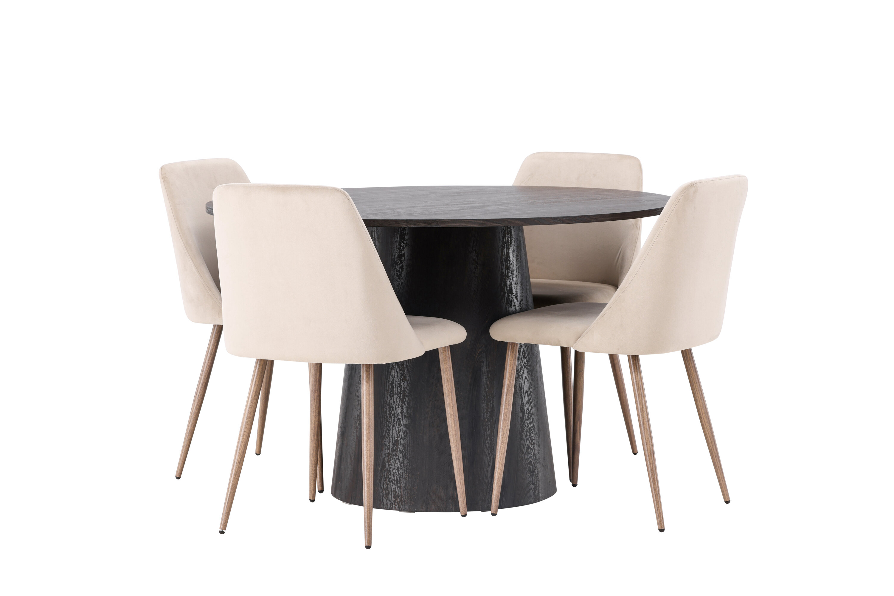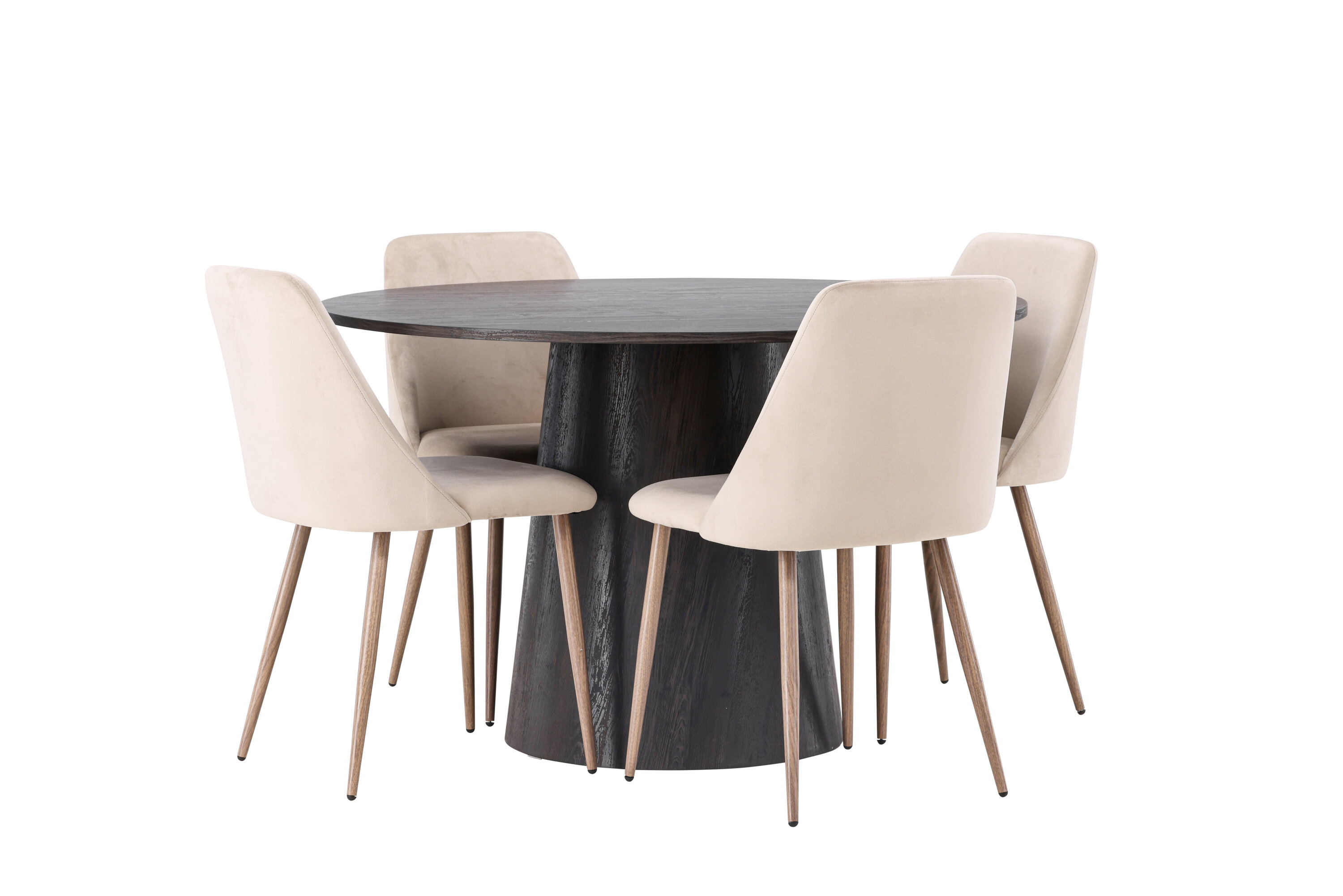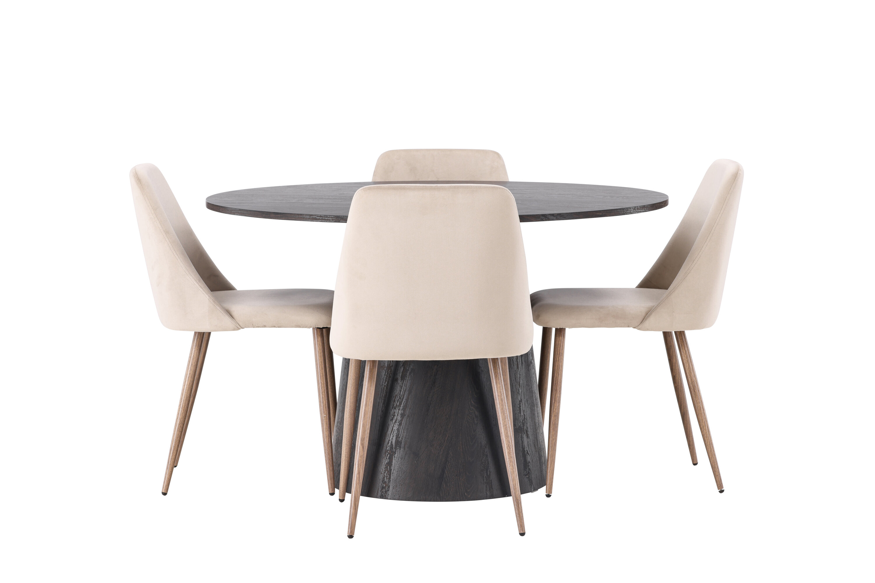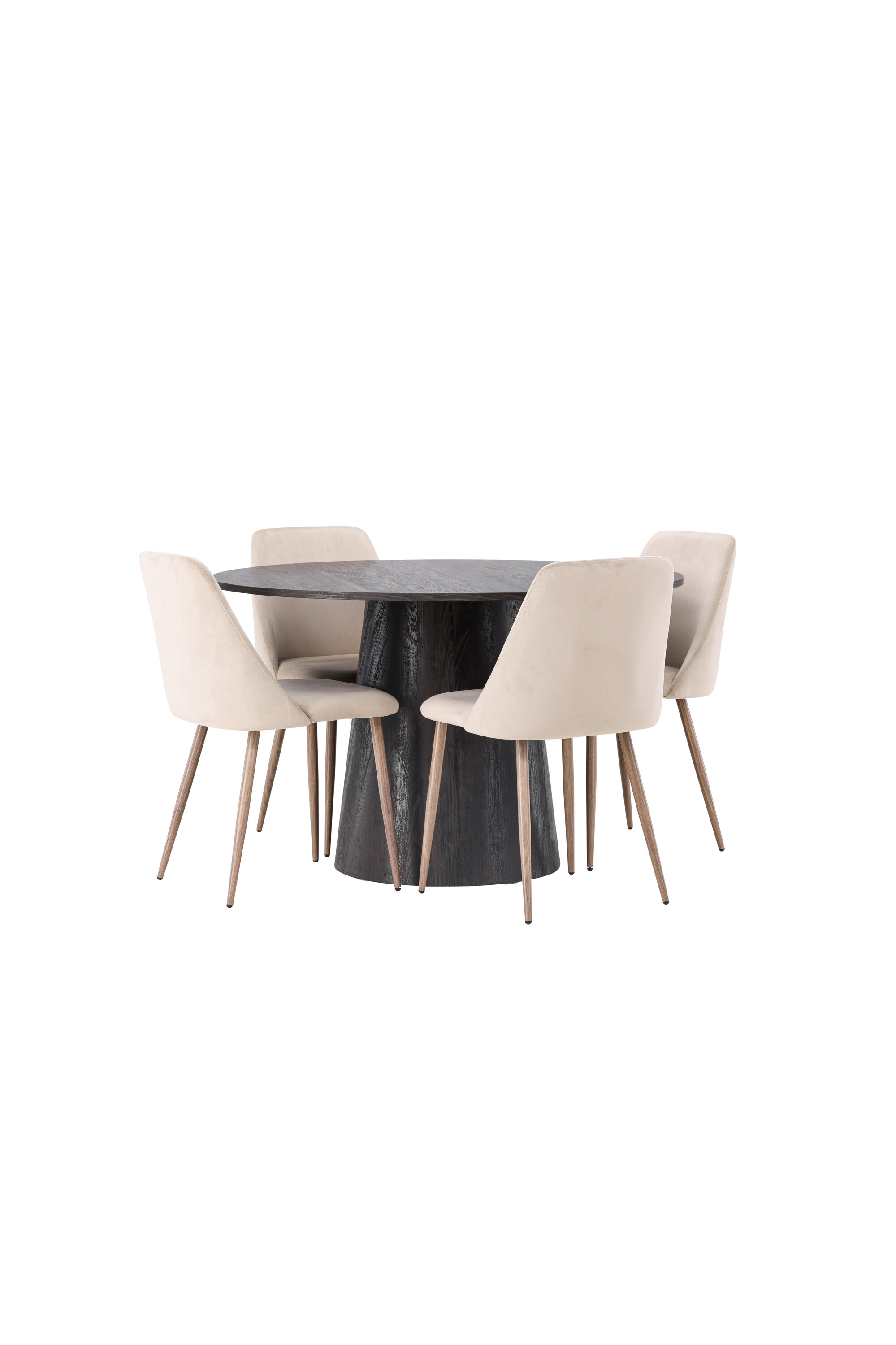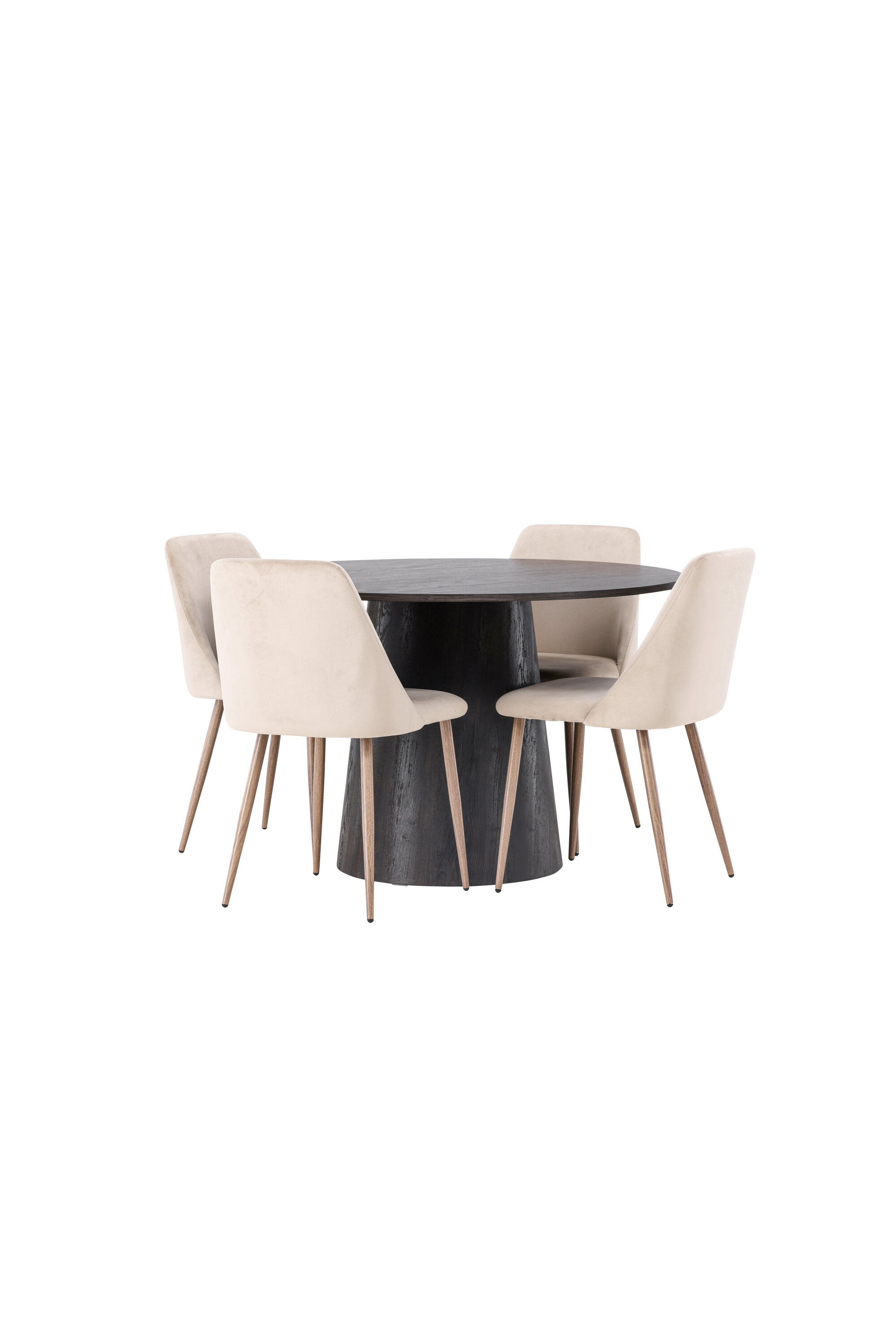 Soojad toonid ja võluv disain! Meie imeline ümmargune söögilaud Lanzo on pruunist MDF-plaadist üldise disainiga, õhukese pealispinnaga ja keeratud silindrilise raamiga, mis asub laua keskosa all. Siin koos meie liivavärvi söögitoolidega sarjast Night. Toolil on täielikult polsterdatud iste pruunist sametkangast ja toolijalad pähklivärvi terasest. Lihtsalt, fantastiline söögigrupp! Laua läbimõõt: 120 cm.