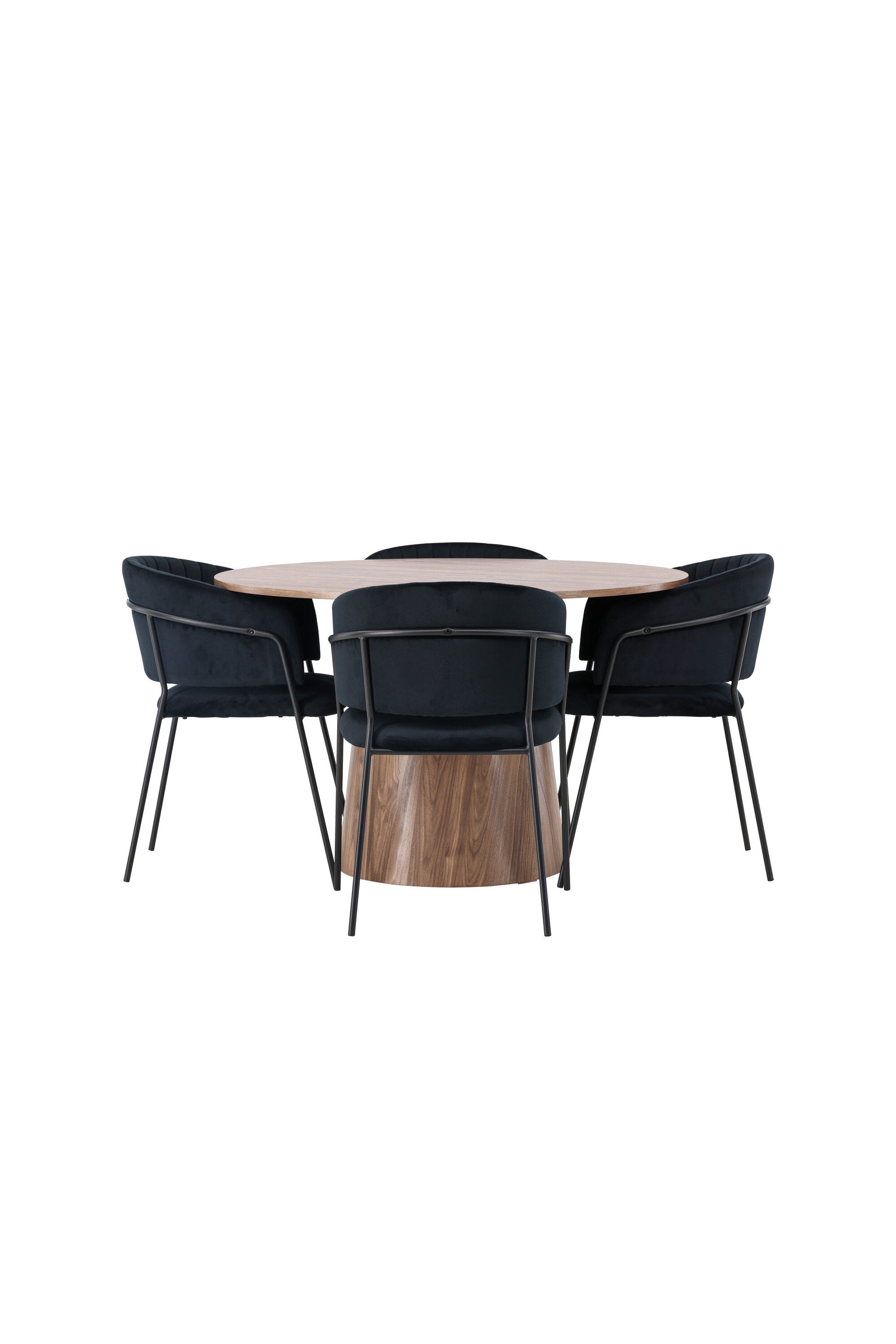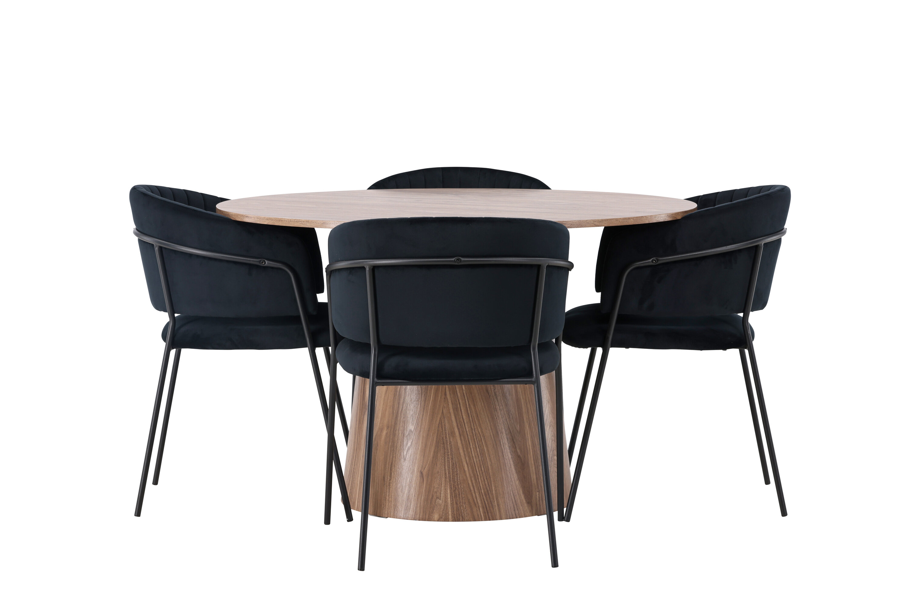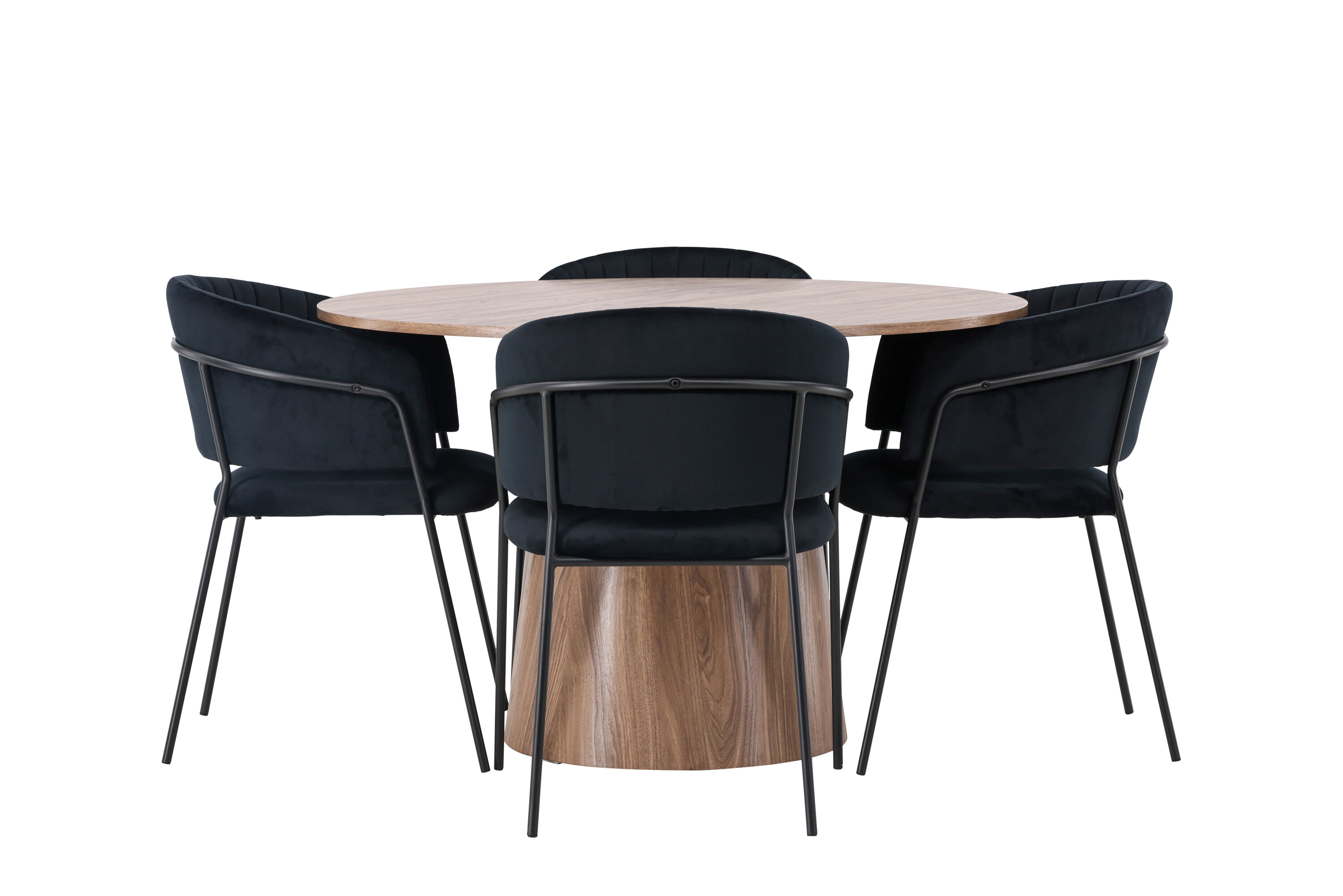 Koos ümmarguse söögilaua Lanzoga pakume oma samettoolid Selma sarjast. Toolide täielikult polsterdatud disain koos ümara seljaosa ja luksusliku sametkangaga istmetel tagab täiusliku mugavuse. Stiilsed dekoratiivsed õmblused lisavad elegantsi ja loovad luksuse tunde. Mustad terasest toolijalad annavad oma panuse maitsekale minimalismile, mis on kaunilt kontrastiks laua vastupidavusega.